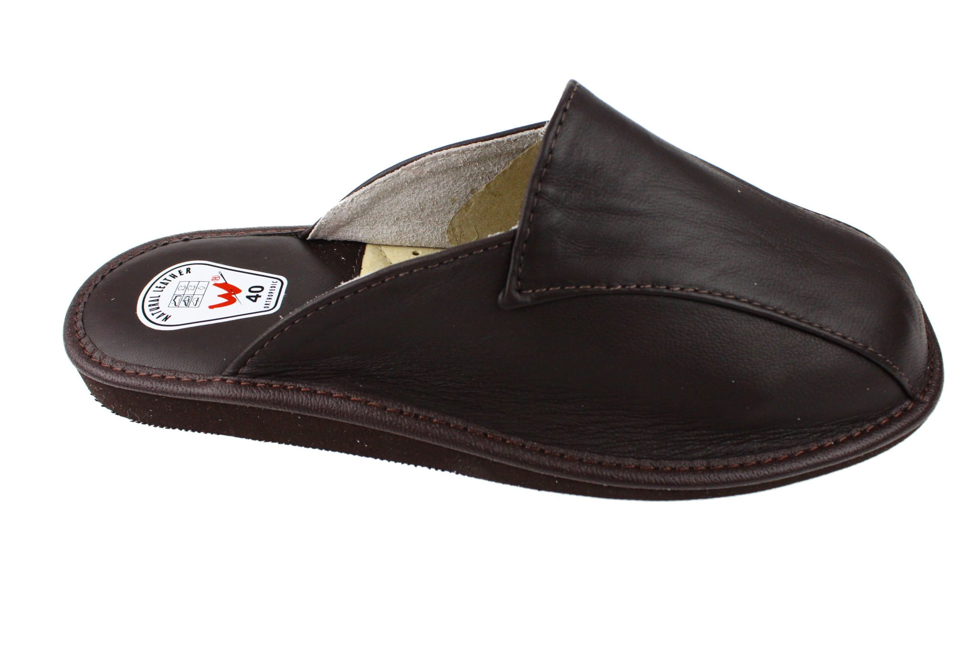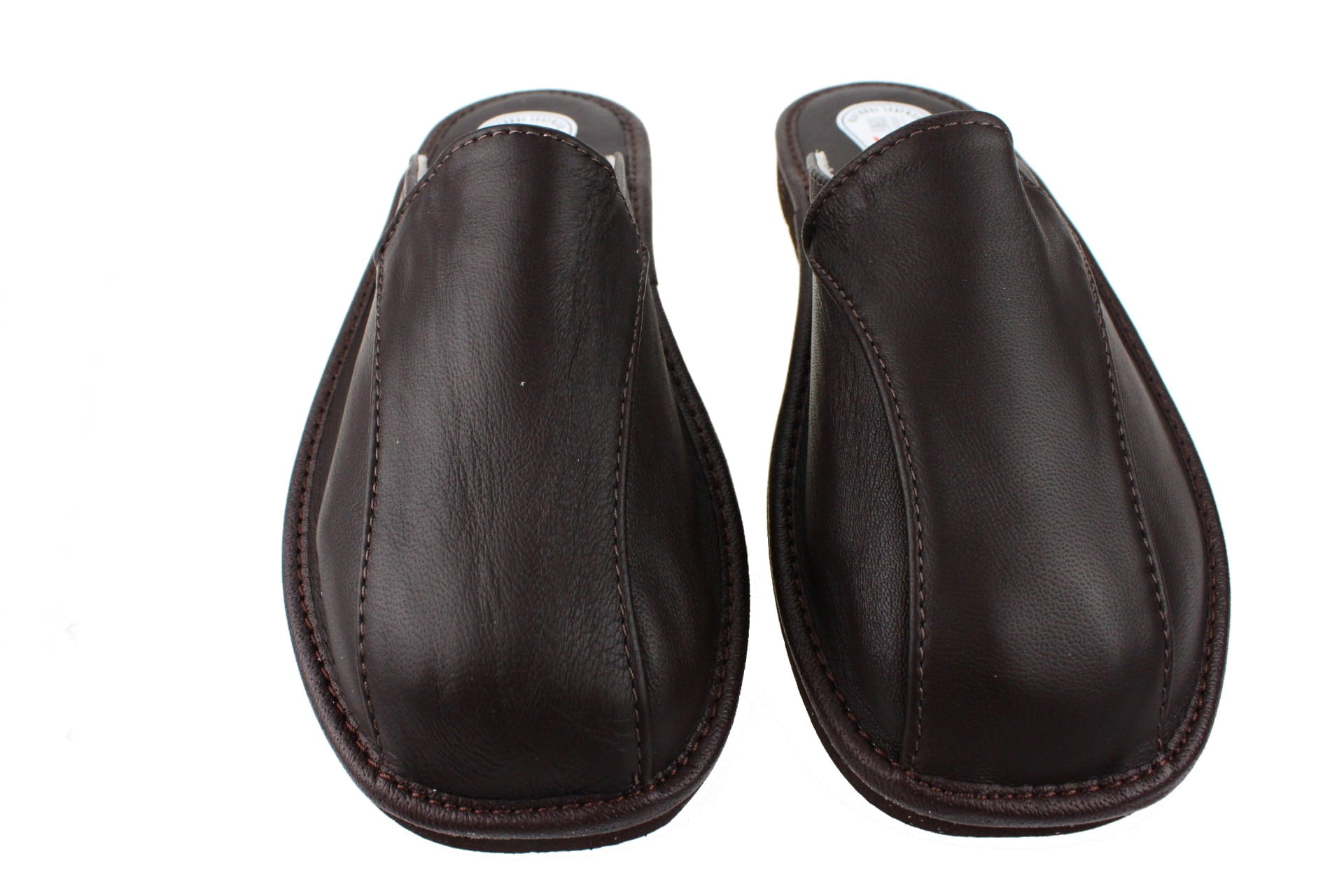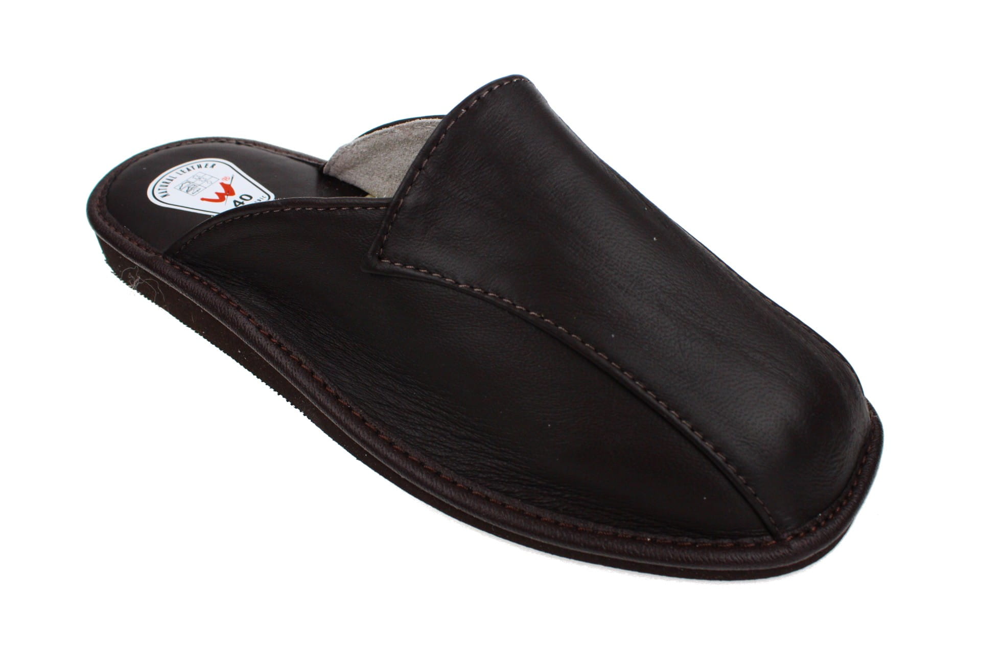 Wykonane z naturalnej skóry cielęcej, pełne w kolorze brązowym. Spód gumowy, antypoślizgowy. Klin o wysokości 2 cm, oblekany skórą. Wkładka skórzana, profilowana, ortopedyczna, dostosowuje się do kształtu stopy, co daje pewność jej prawidłowego ułożenia i przez to maksymalne poczucie komfortu. Dzięki temu nogi nie męczą się, a stawy nie są narażone na dodatkowe obciążenie. Na pięcie wyściełane skórą, umożliwia to lepsza higienę. Prezentowany model posiada klasyczny fason przeznaczony do użytku domowego, są lekkie i wygodne.
