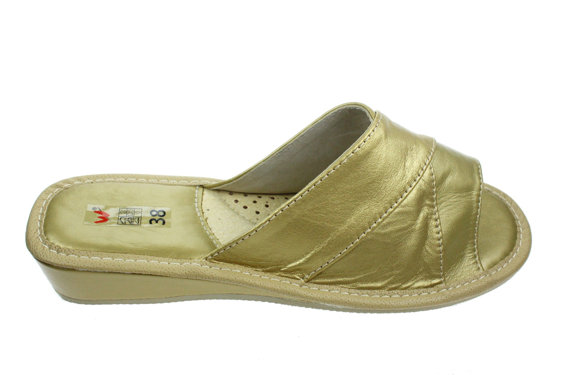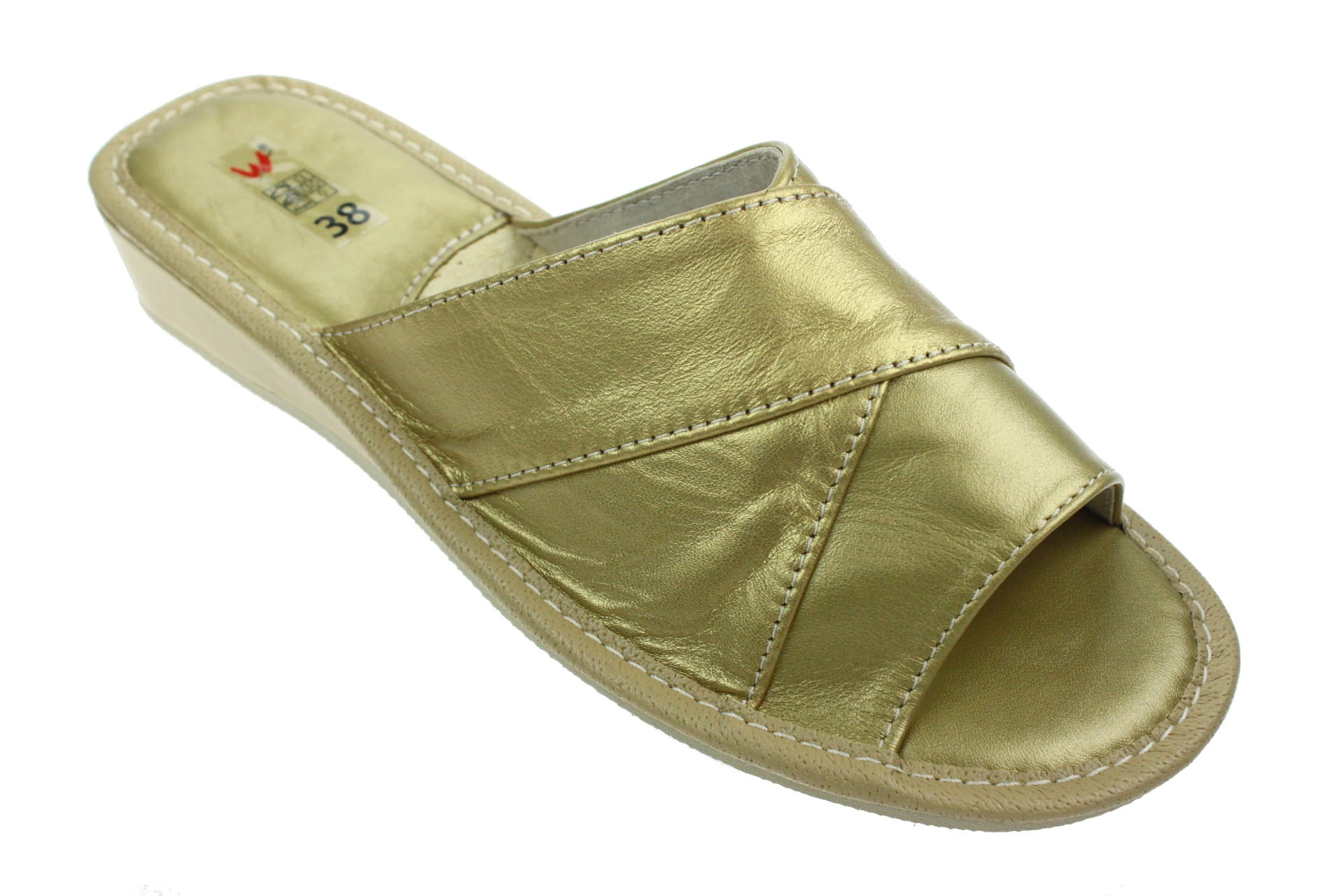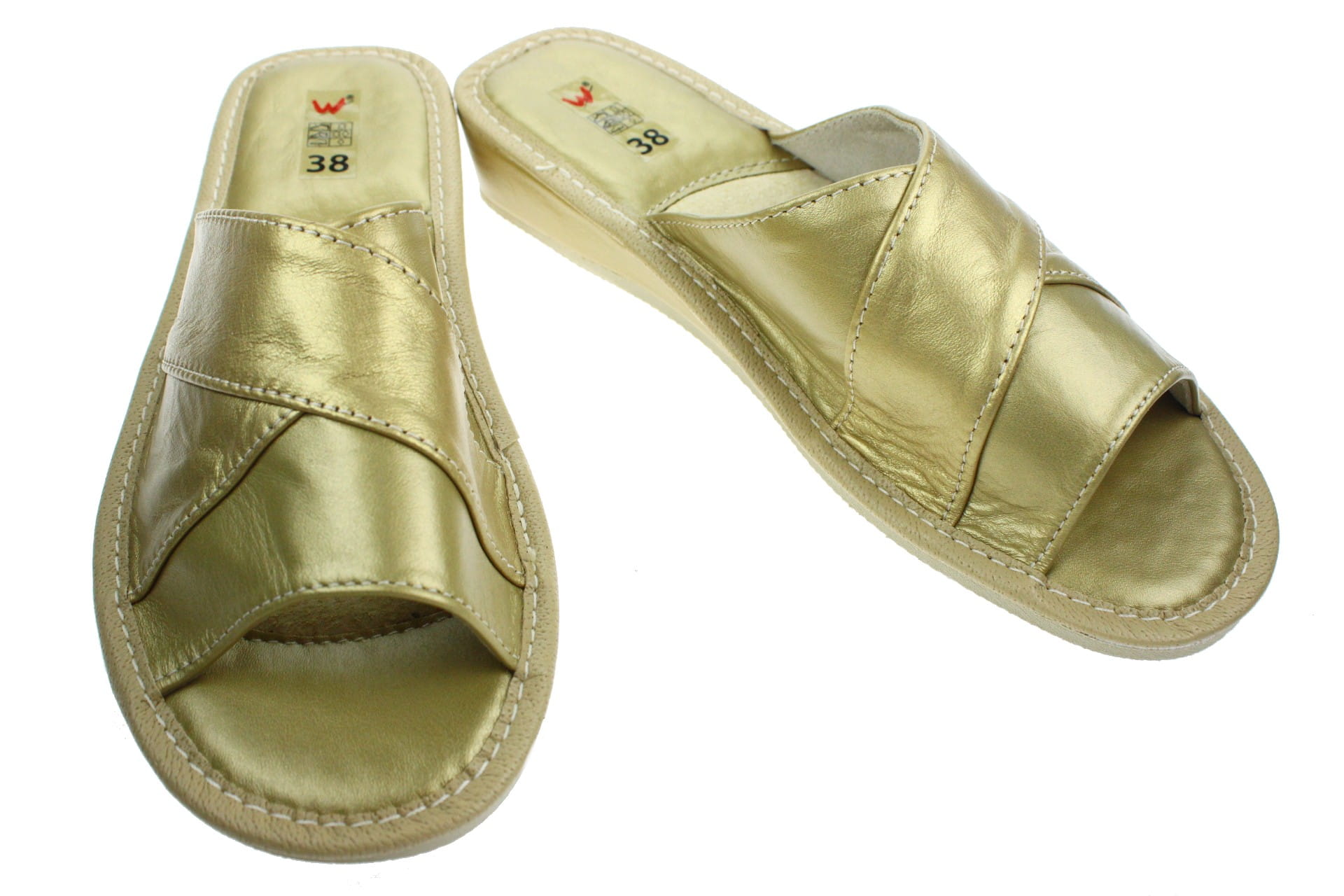 Obuwie, pantofle damskie z otwartym palcem (b/p=bez palcy), wykonane z naturalnej skóry cielęcej. Spód gumowy, antypoślizgowy. Klin o wysokości 3,5 cm, oblekany skórą. Wkładka skórzana, profilowana, ortopedyczna, dostosowuje się do kształtu stopy, co daje pewność jej prawidłowego ułożenia i przez to maksymalne poczucie komfortu. Dzięki temu nogi nie męczą się, a stawy nie są narażone na dodatkowe obciążenie. Prezentowany model posiada uniwersalny, klasyczny fason przeznaczony do użytku domowego. Wierzch fantazyjnie przeplatany. Piętka i palce wykładane skórą licową - łatwiejsze w utrzymaniu w czystości.