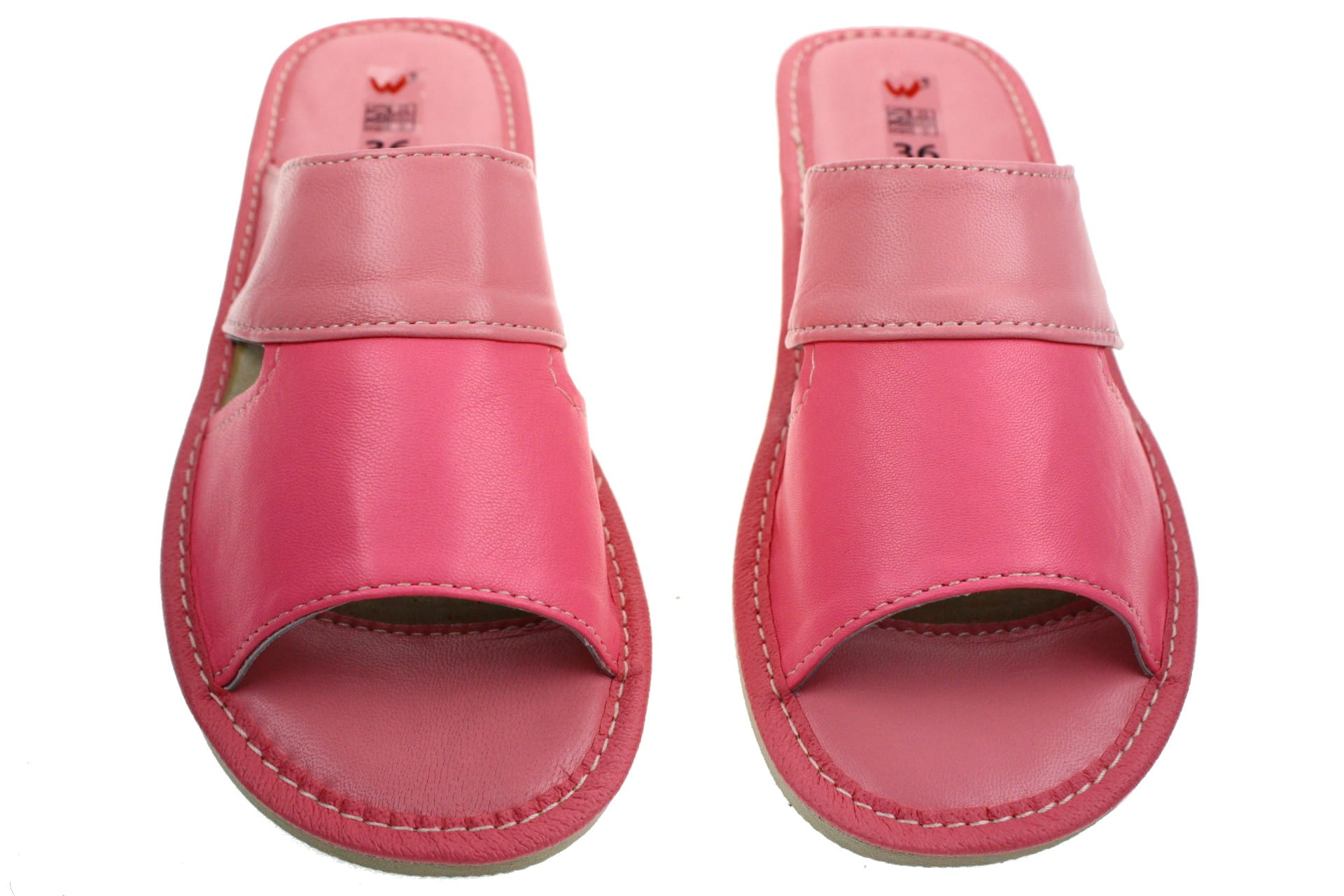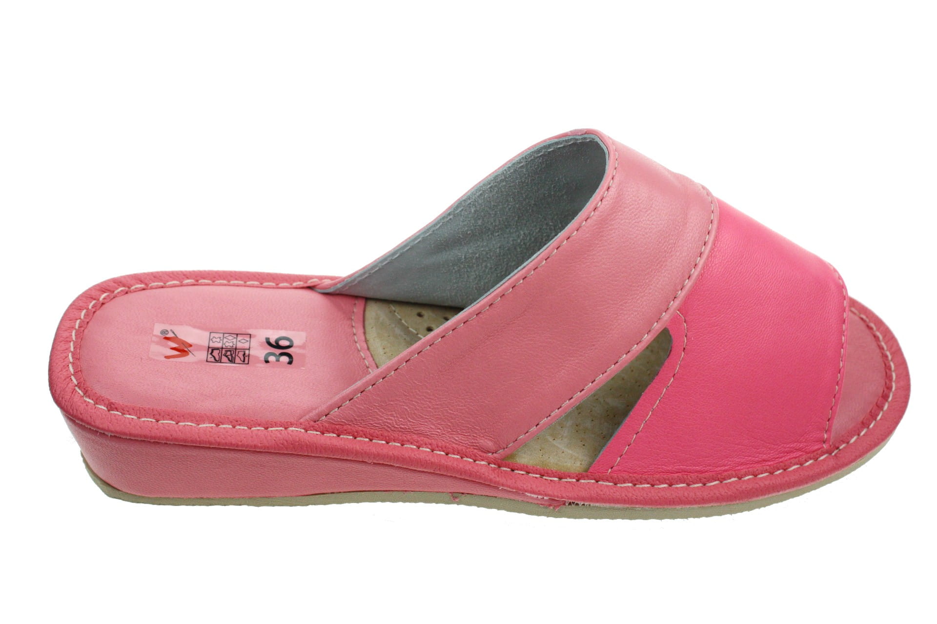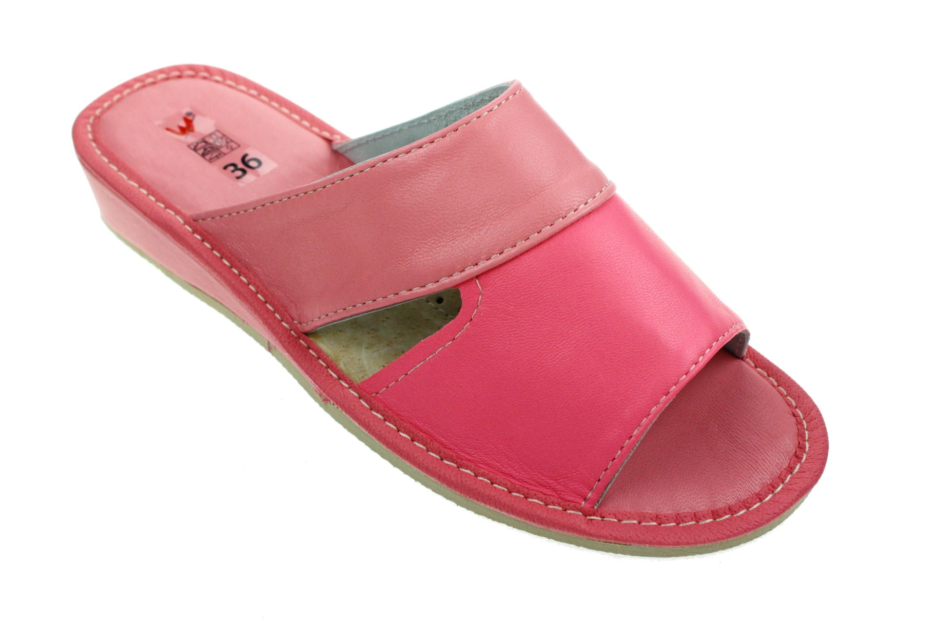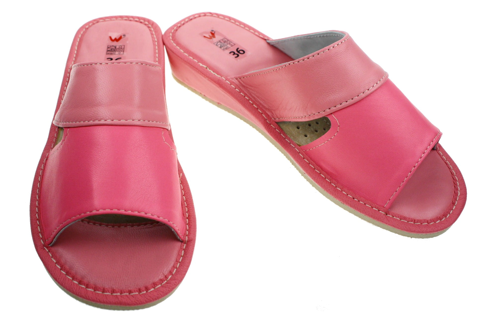 Obuwie, pantofle damskie z otwartym palcem (b/p=bez palcy), wykonane z naturalnej skóry cielęcej. Spód gumowy, antypoślizgowy. Klin o wysokości 3,5 cm, oblekany skórą. Wkładka skórzana, profilowana, ortopedyczna, dostosowuje się do kształtu stopy, co daje pewność jej prawidłowego ułożenia i przez to maksymalne poczucie komfortu. Dzięki temu nogi nie męczą się a stawy nie są narażone na dodatkowe obciążenie. Prezentowany model posiada uniwersalny, klasyczny fason przeznaczony do użytku domowego. Wierzch dwukolorowy, po bokach otwory ułatwiające wyntylację stopy. Piętka i palce wykładane skórą licową - łatwiejsze w utrzymaniu w czystości.