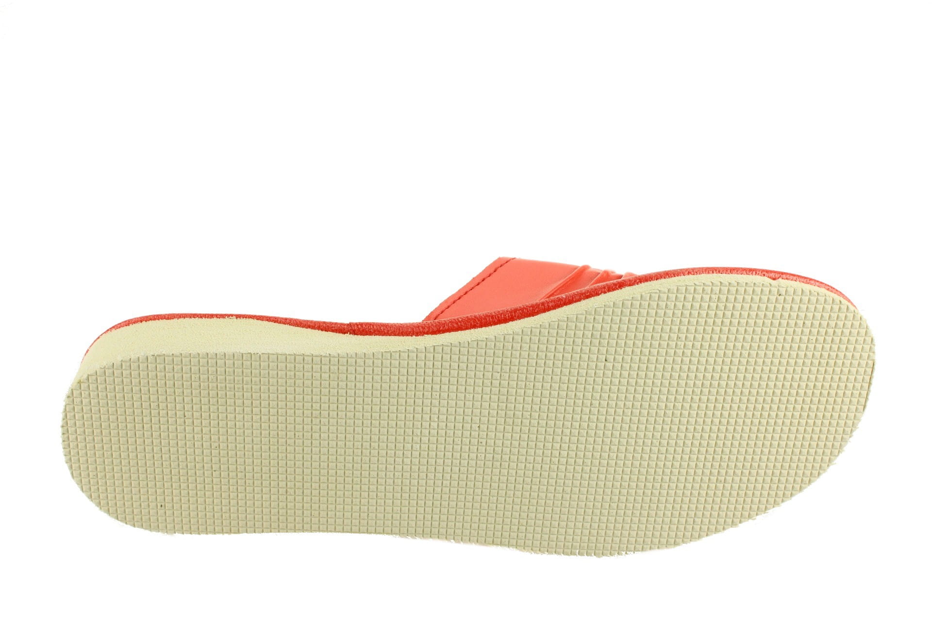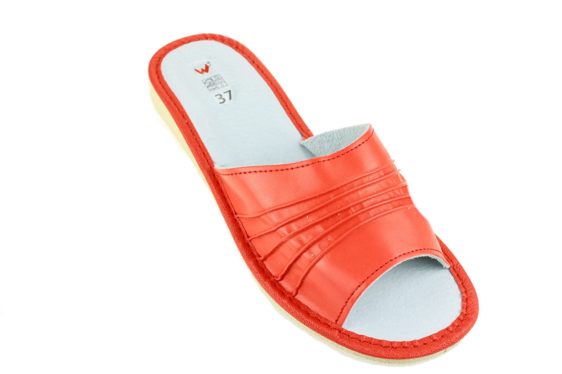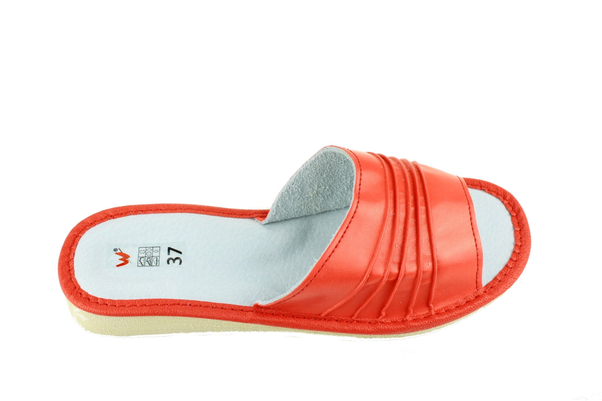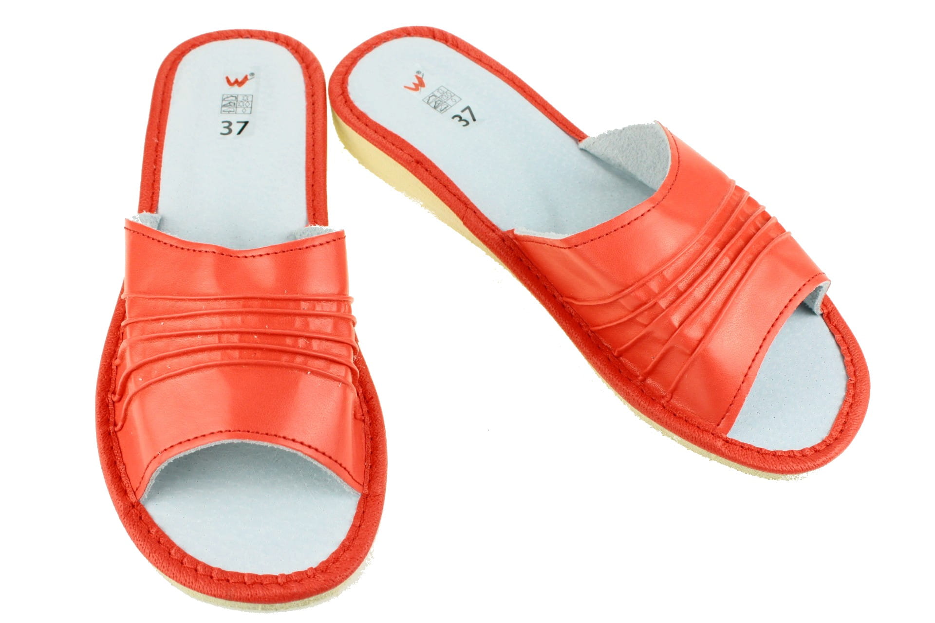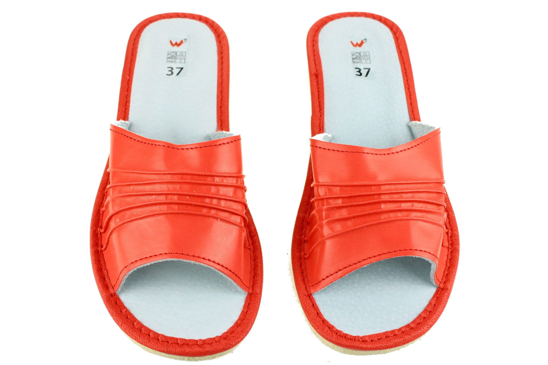 Pantofle damskie z otwartym palcem (b/p=bez palcy), wykonane z naturalnej skóry.