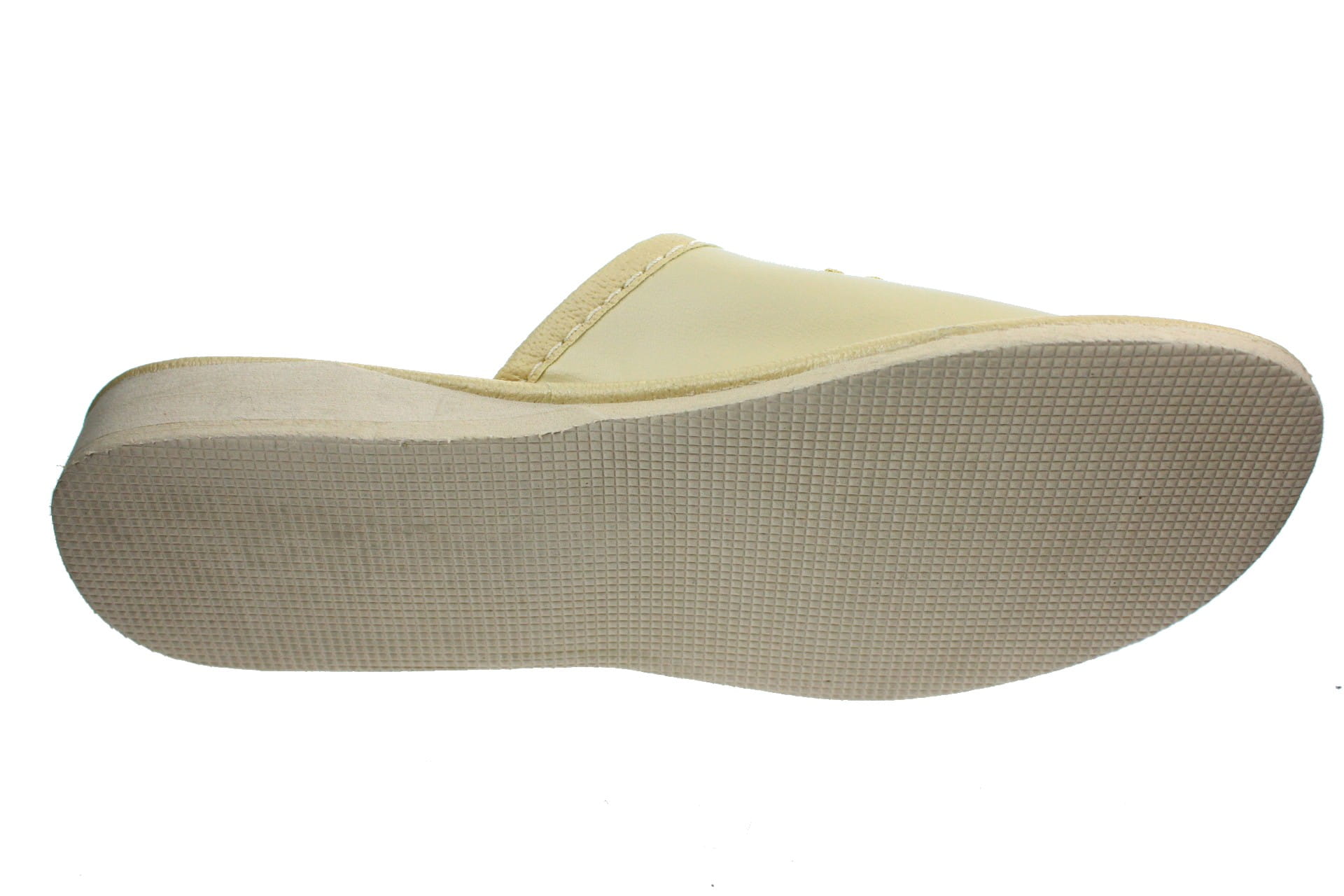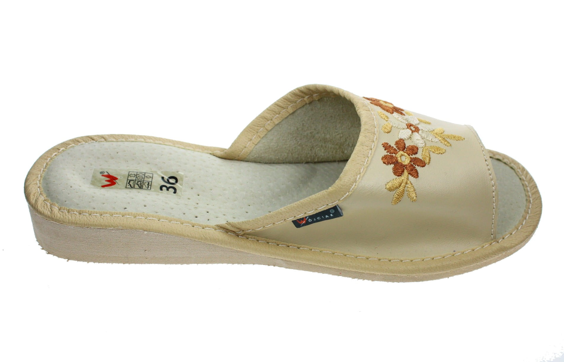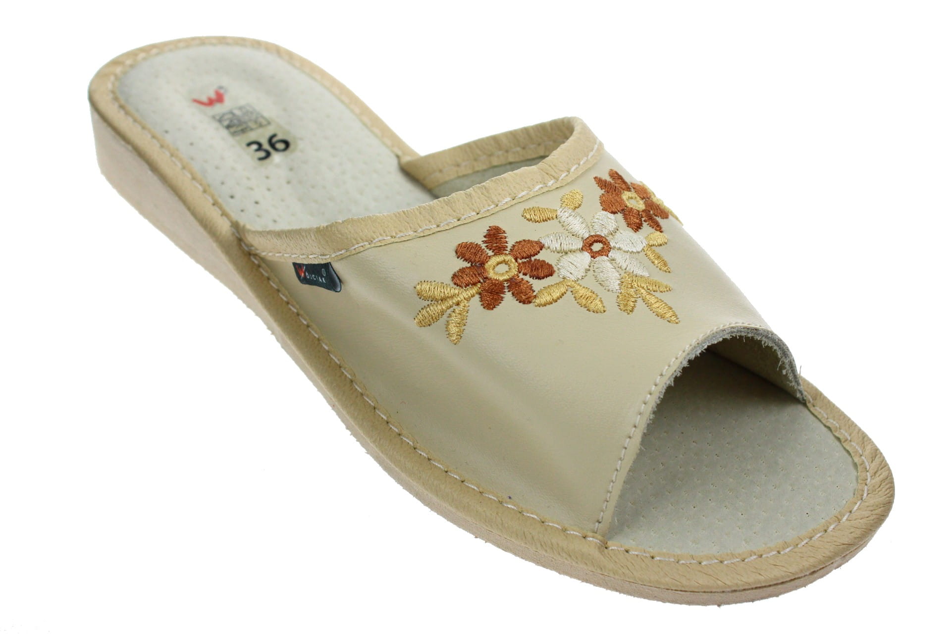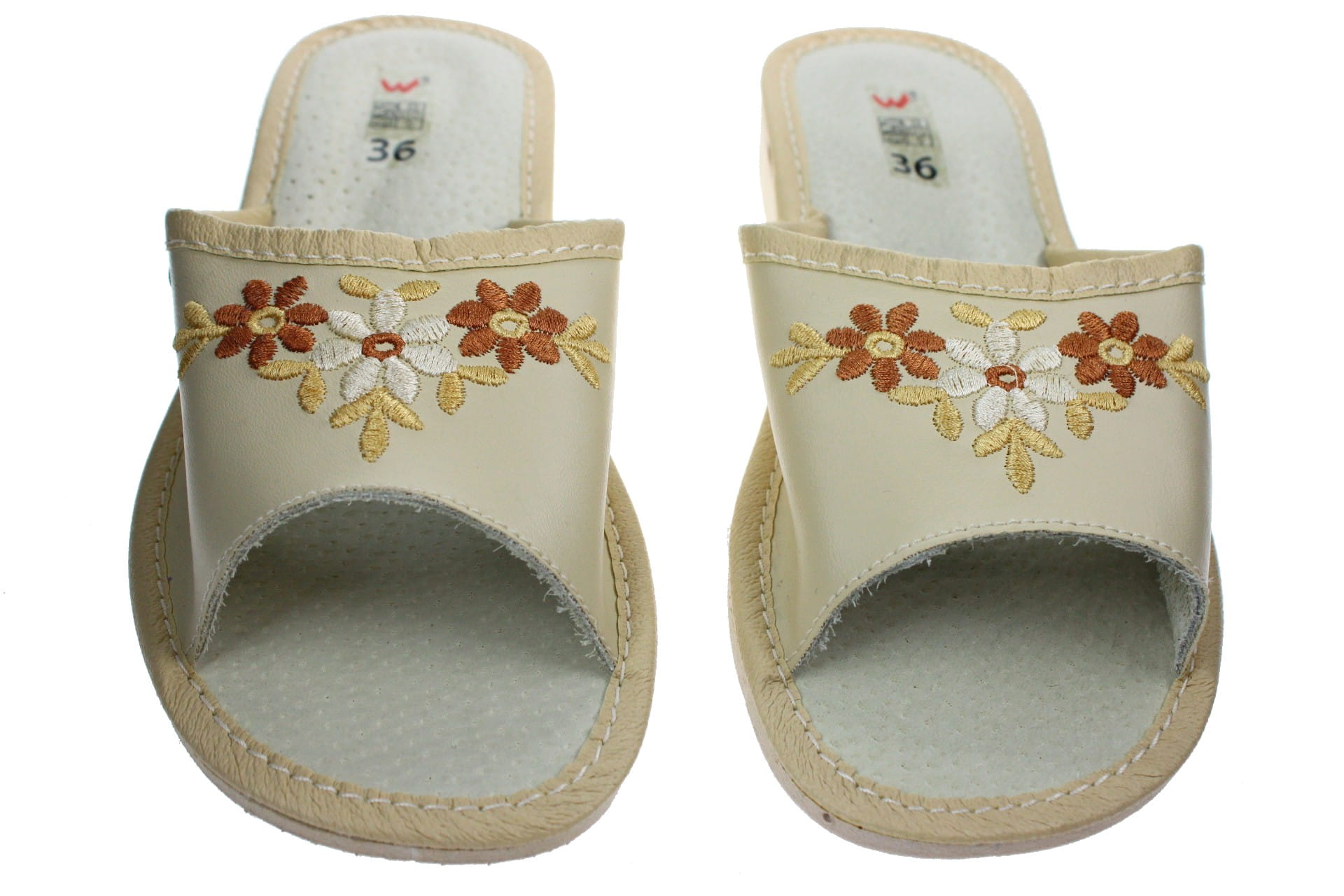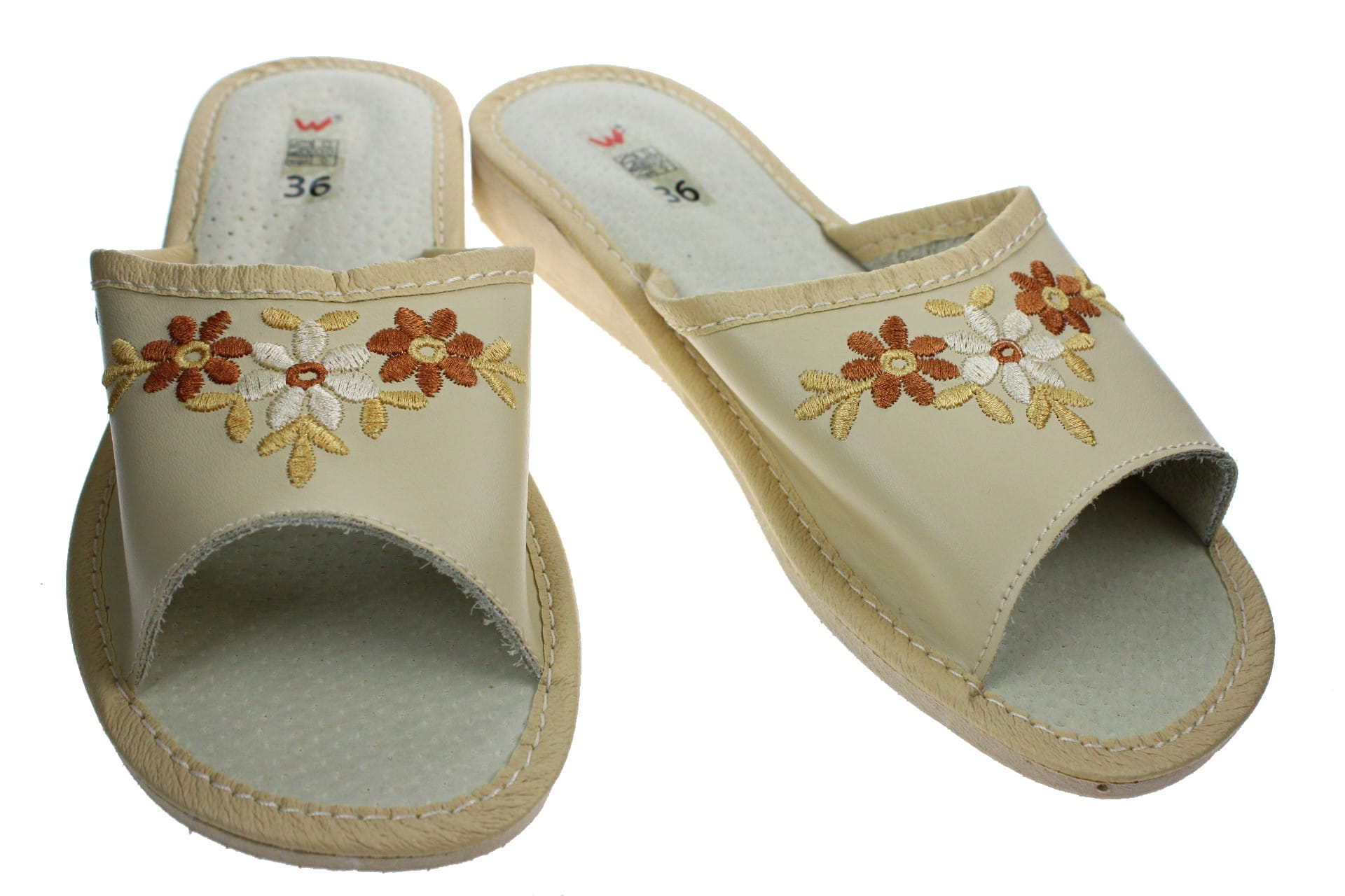 Pantofle damskie z otwartym palcem (b/p=bez palcy), wykonane z naturalnej skóry.