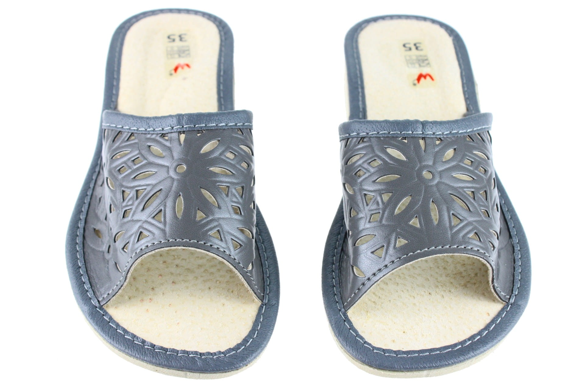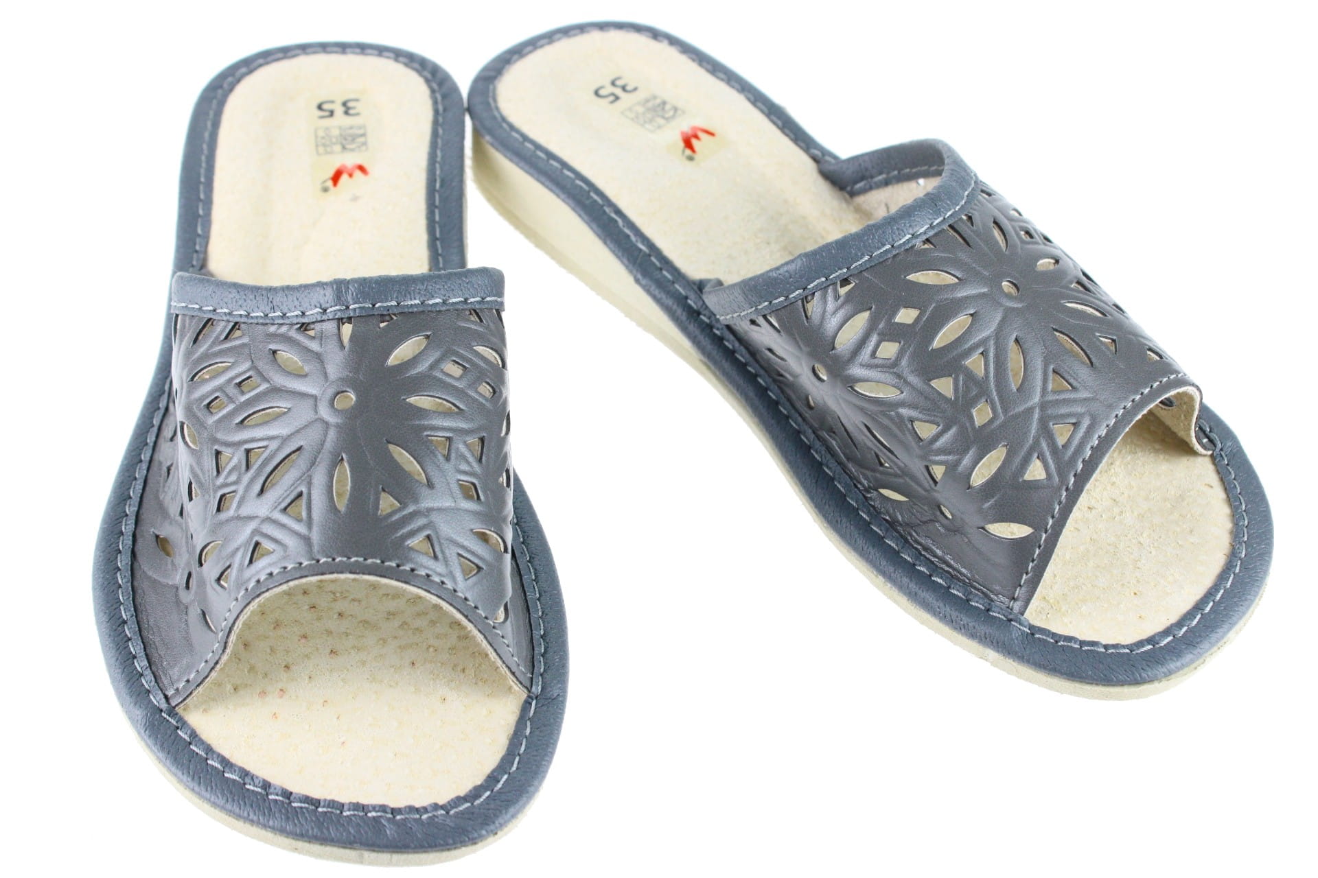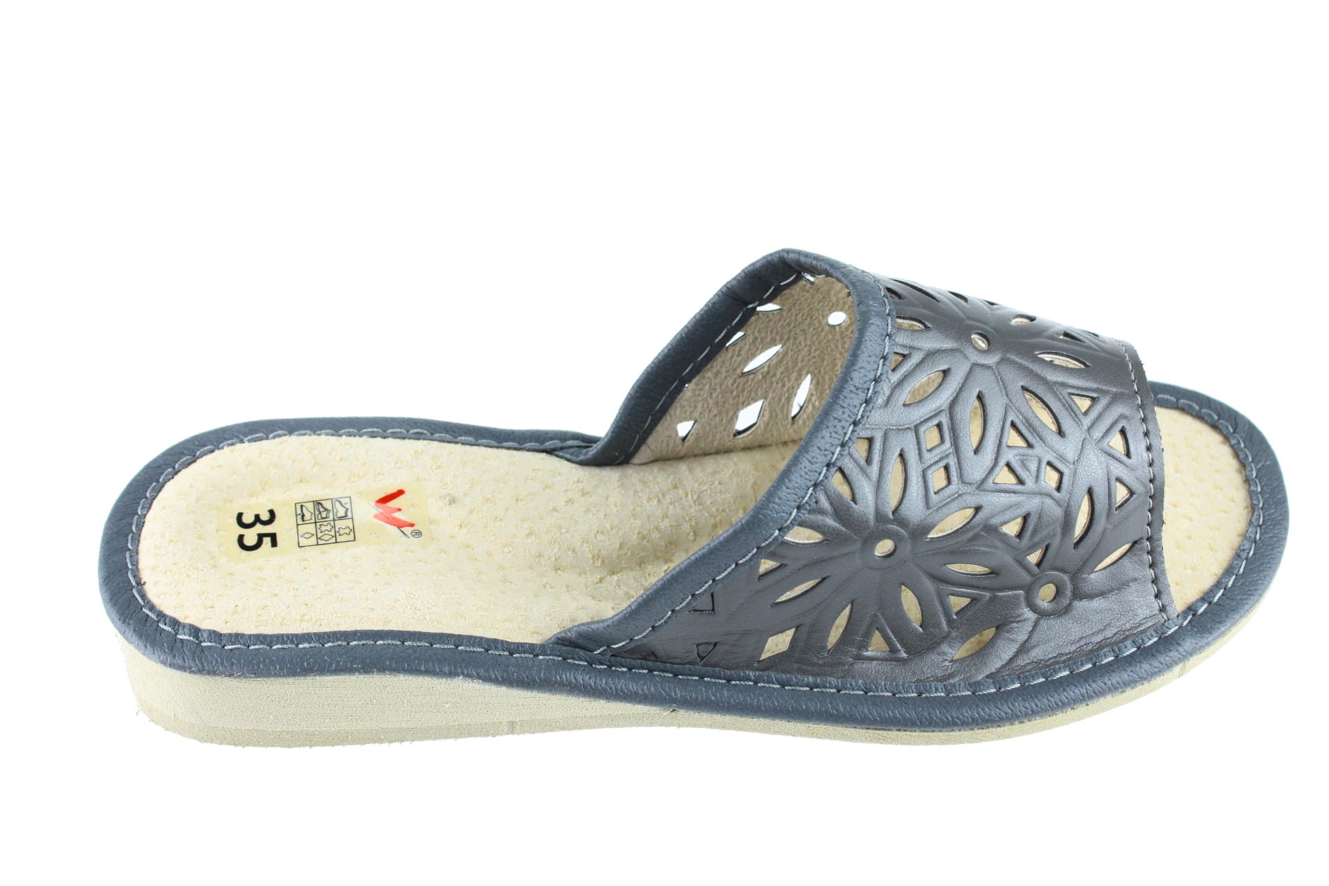 Pantofle damskie z otwartym palcem (b/p=bez palcy), wykonane z naturalnej skóry. Spód gumowy, antypoślizgowy. Klin o wysokości 2 cm. Wkładka skórzana, profilowana, ortopedyczna, dostosowuje się do kształtu stopy, co daje pewność jej prawidłowego ułożenia i przez to maksymalne poczucie komfortu. Dzięki temu nogi nie męczą się, a stawy nie są narażone na dodatkowe obciążenie. Prezentowany model posiada na wierzchu wytłaczane wzorki. Lekkie i wygodne, przeznaczone do użytku domowego.