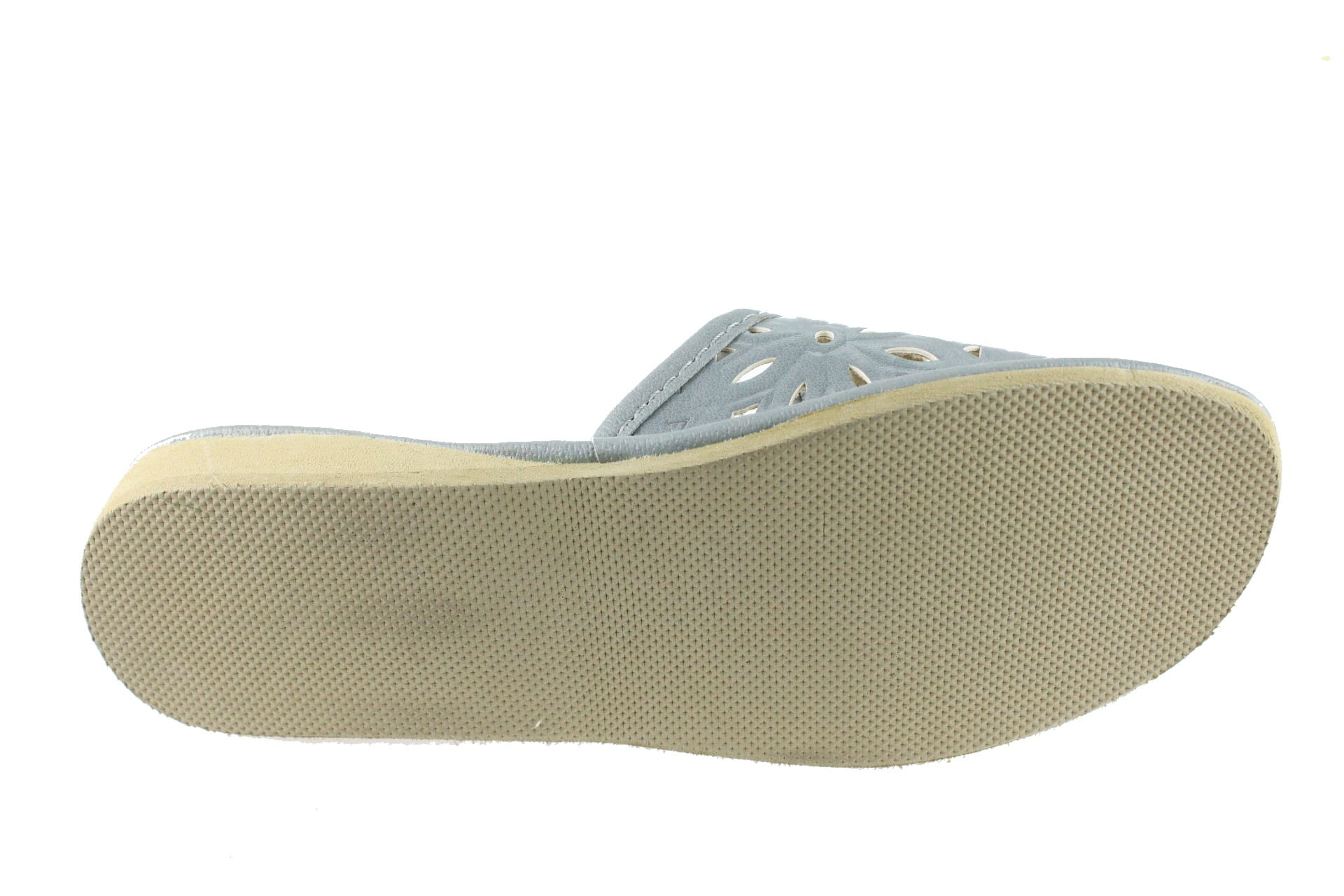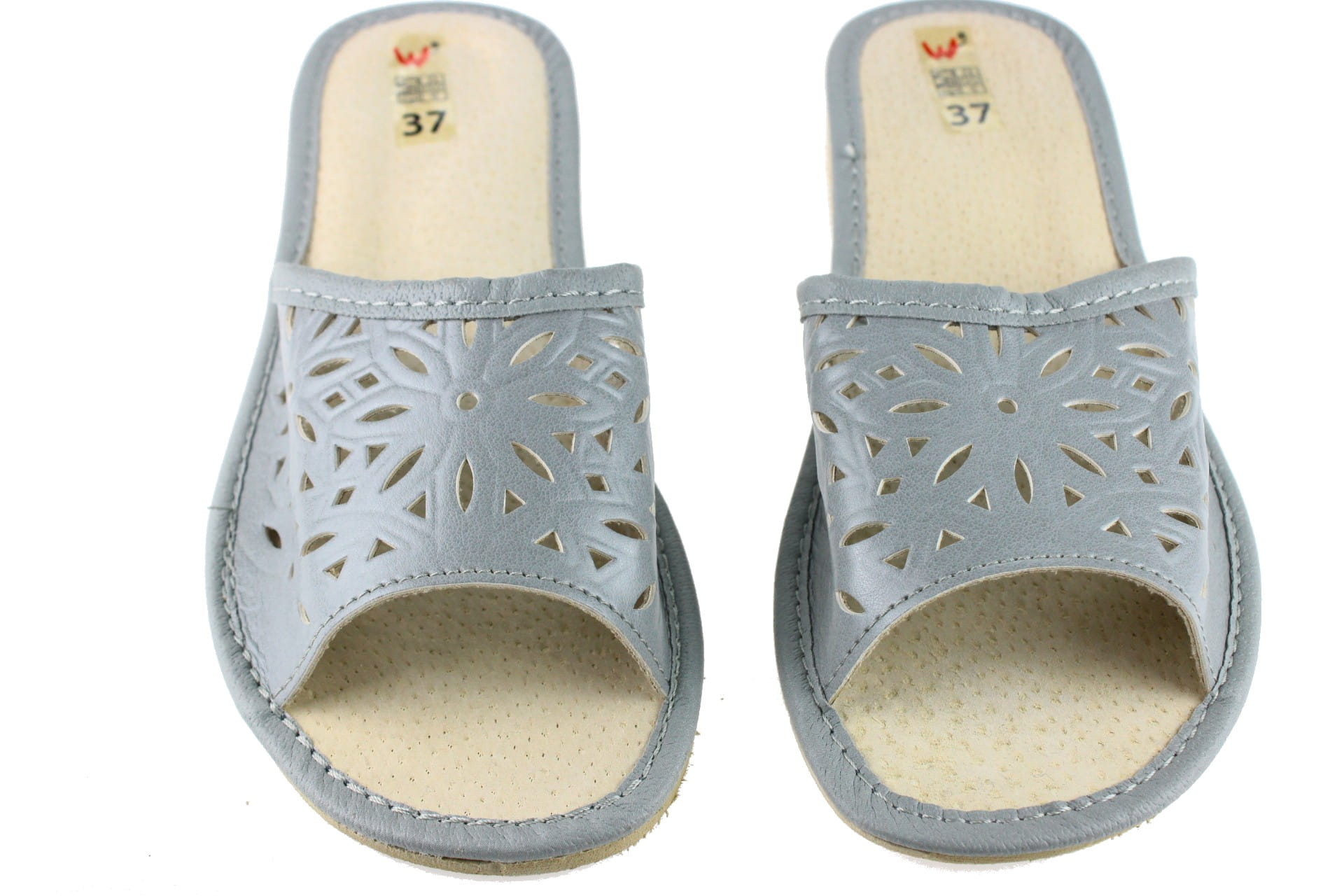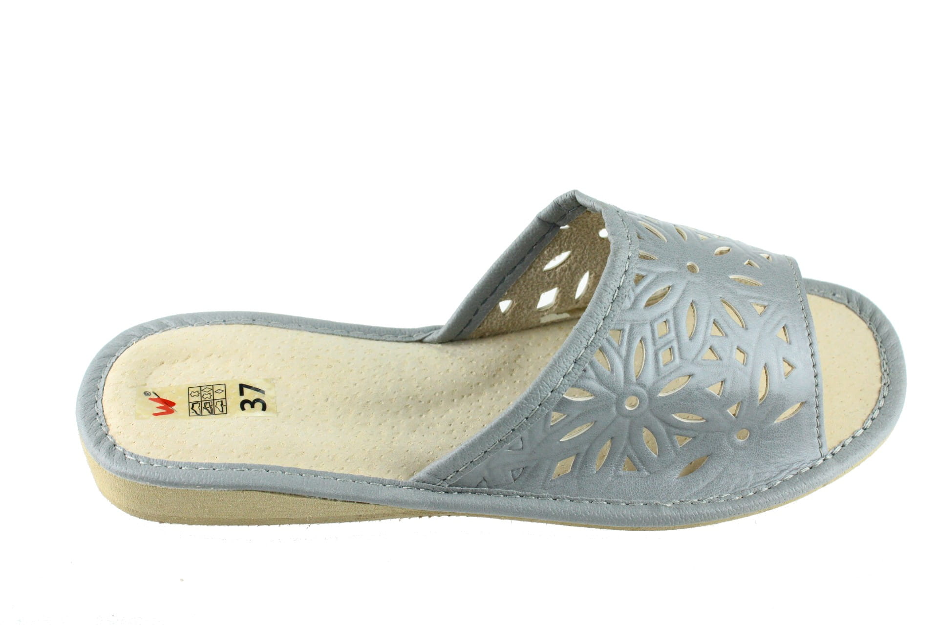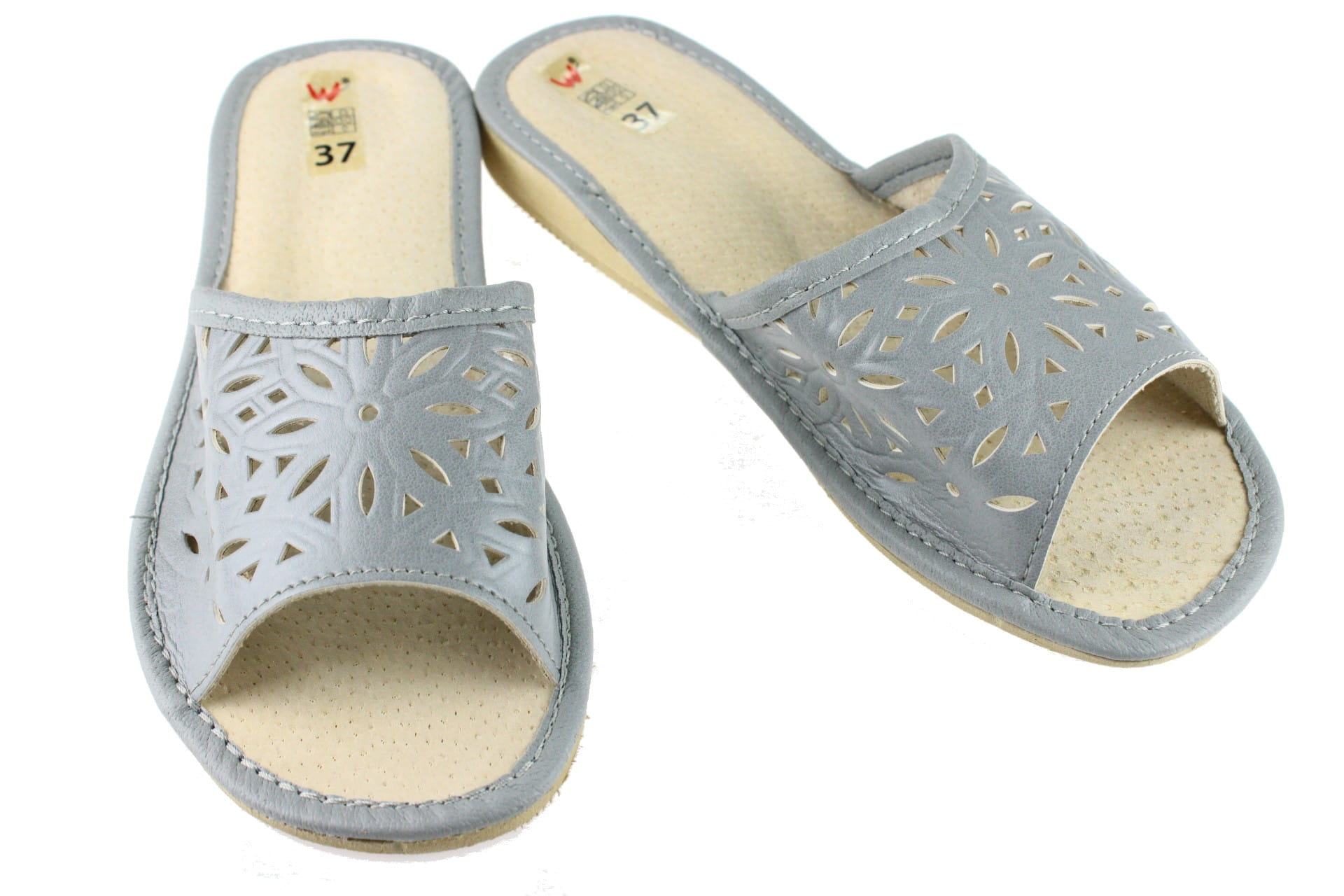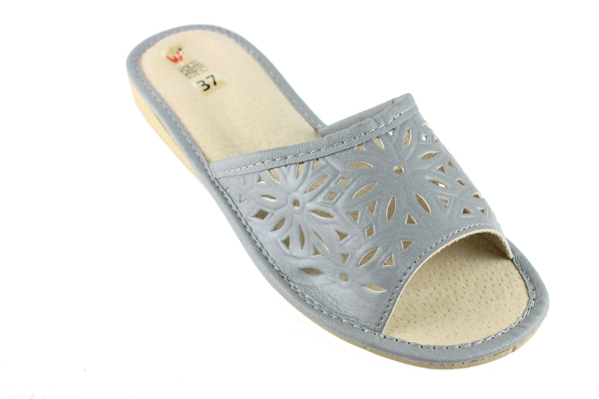 Pantofle damskie z otwartym palcem (b/p=bez palcy), wykonane z naturalnej skóry. Spód gumowy, antypoślizgowy. Klin o wysokości 2 cm. Wkładka skórzana, profilowana, ortopedyczna, dostosowuje się do kształtu stopy, co daje pewność jej prawidłowego ułożenia i przez to maksymalne poczucie komfortu. Dzięki temu nogi nie męczą się, a stawy nie są narażone na dodatkowe obciążenie. Prezentowany model posiada na wierzchu wytłaczane wzorki. Lekkie i wygodne, przeznaczone do użytku domowego.