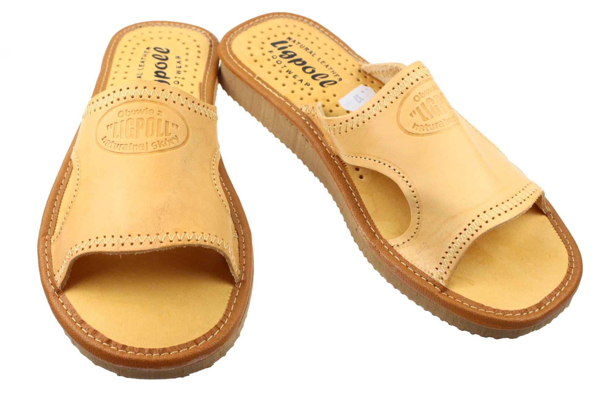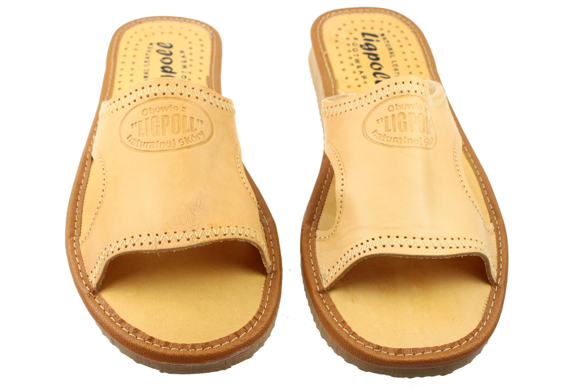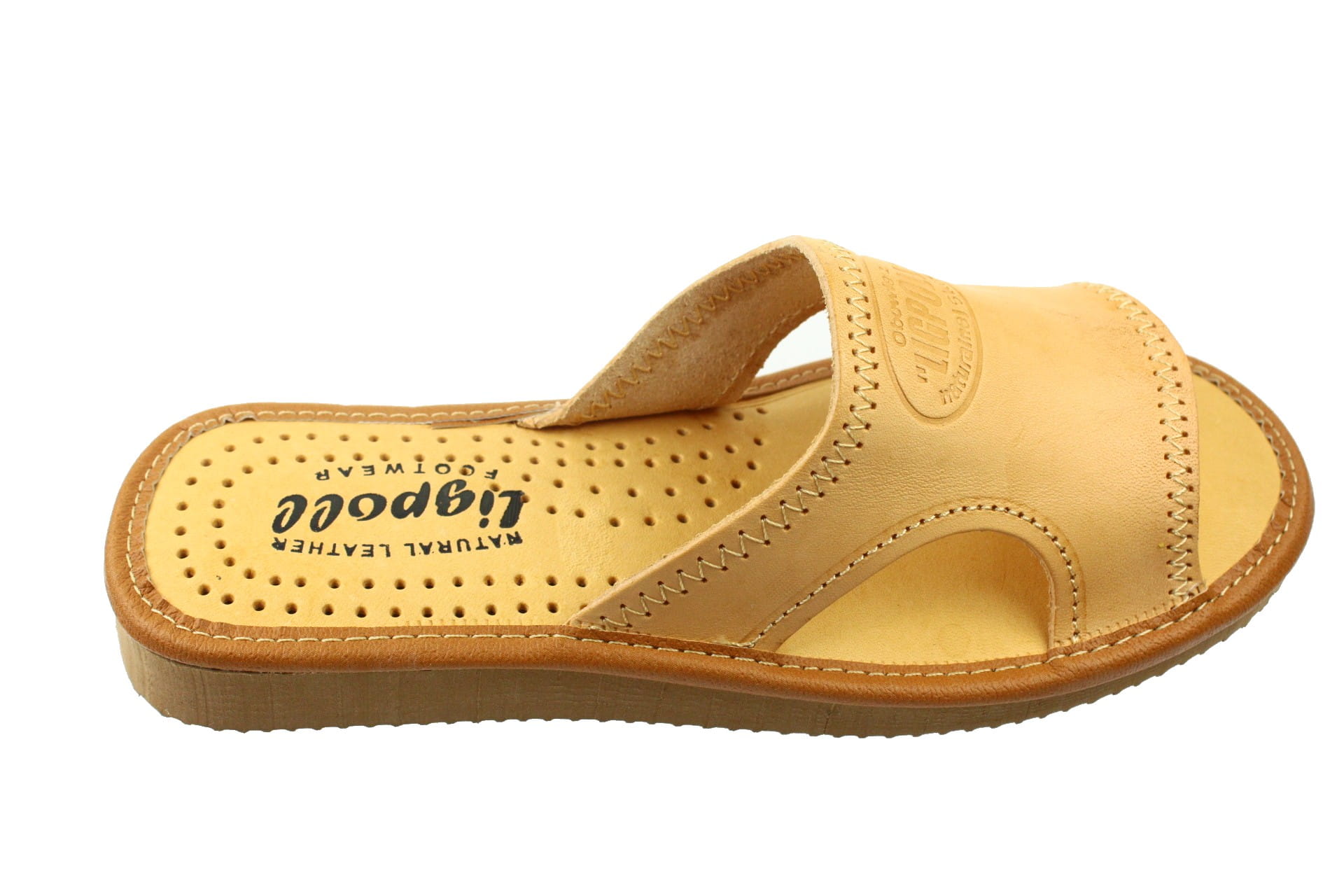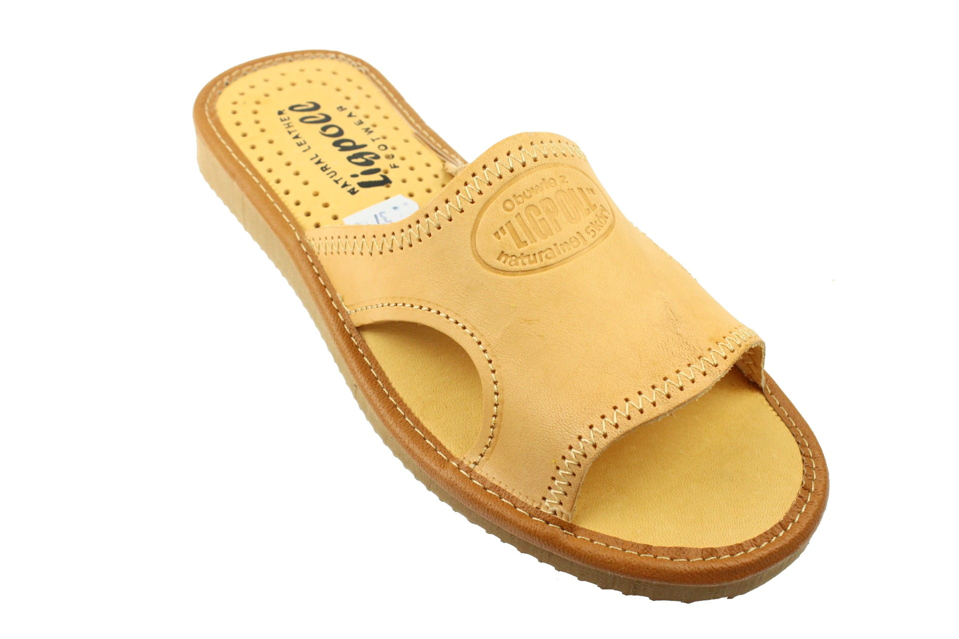 Laczki damskie z otwartym palcem (b/p=bez palcy), wykonane z najważszej jakości bydlęcej skóry. Wkładka skórzana, profilowana, Spód ze styrogumu (guma utwardzana), antypoślizgowy. Po bokach otwory wentylacyjne ułatwiające lepszą wentylację, stopy się nie pocą. Na wierzchu wytłaczane logo producenta " Ligpoll". Laczki są bardzo mocne i z "wyższej półki".