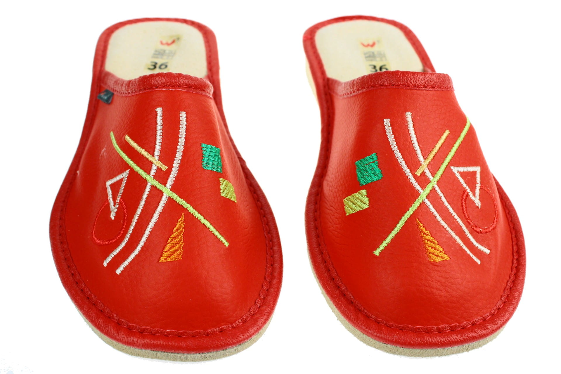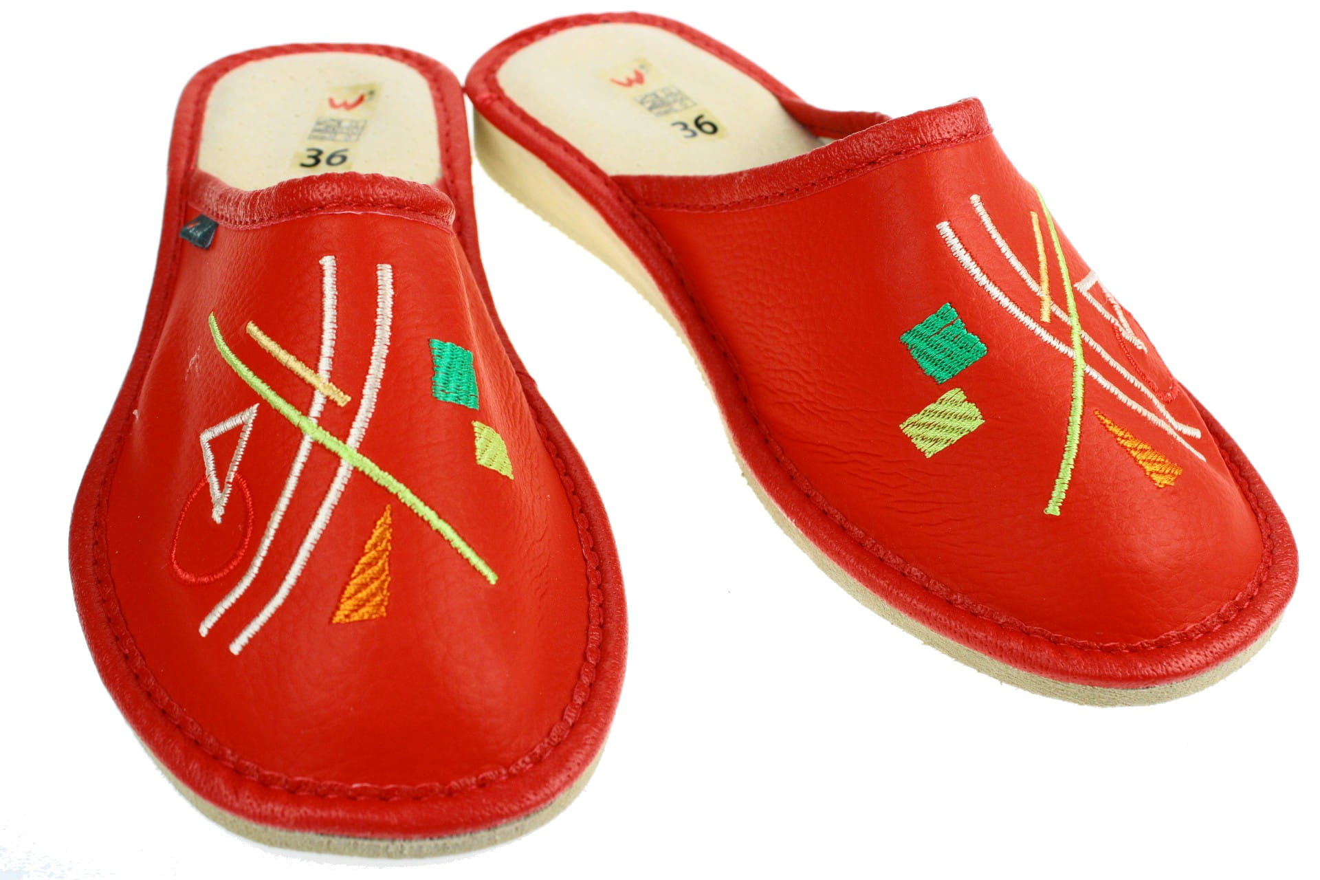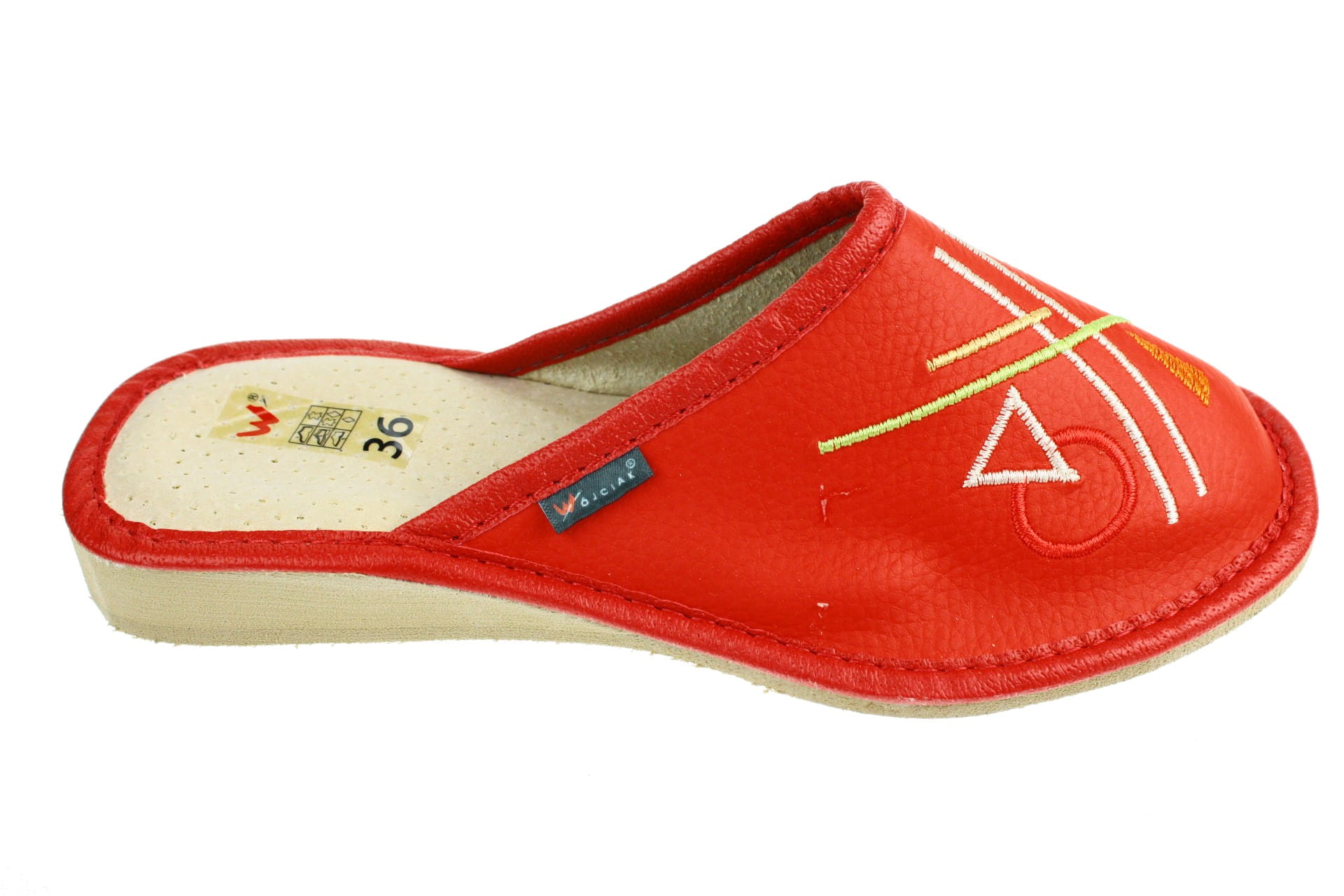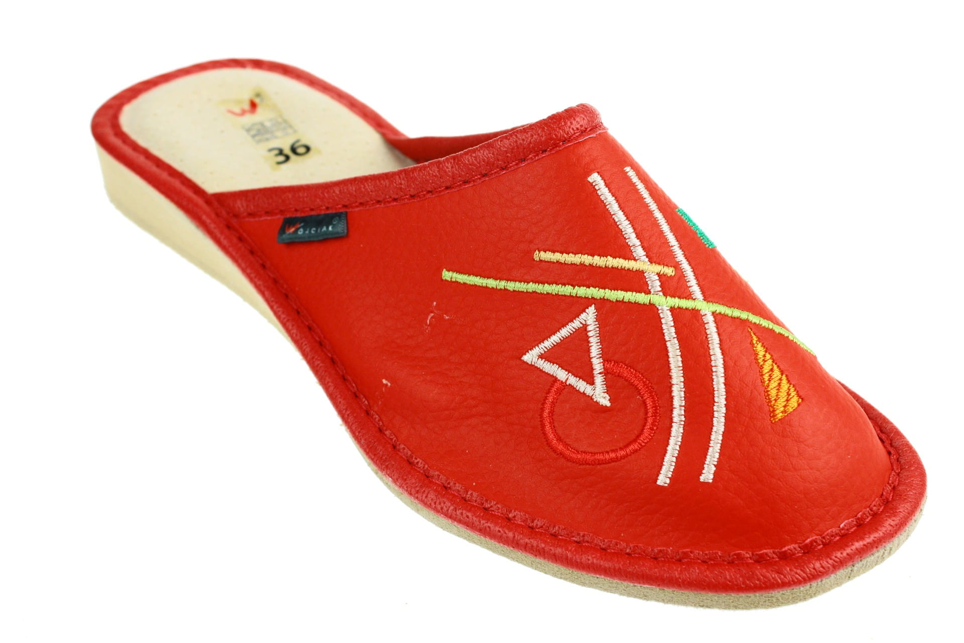 Laczki damskie z krytym palcem wykonane z naturalnej skóry, z fantazyjnym kwiatowym haftem. Wewnętrzna część cholewki wyłożona jest skórą, dzięki której stopa się nie poci. Wkładka skórzana, profilowana, ortopedyczna, dostosowuje się do kształtu stopy, co daje pewność jej prawidłowego ułożenia i przez to maksymalne poczucie komfortu. Dzięki temu nogi nie męczą się, a stawy nie są narażone na dodatkowe obciążenie. Podeszwa gumowa, antypoślizgowa, klin o wysokości 2,5 cm. Przeznaczone do użytku domowego, są lekkie i wygodne.