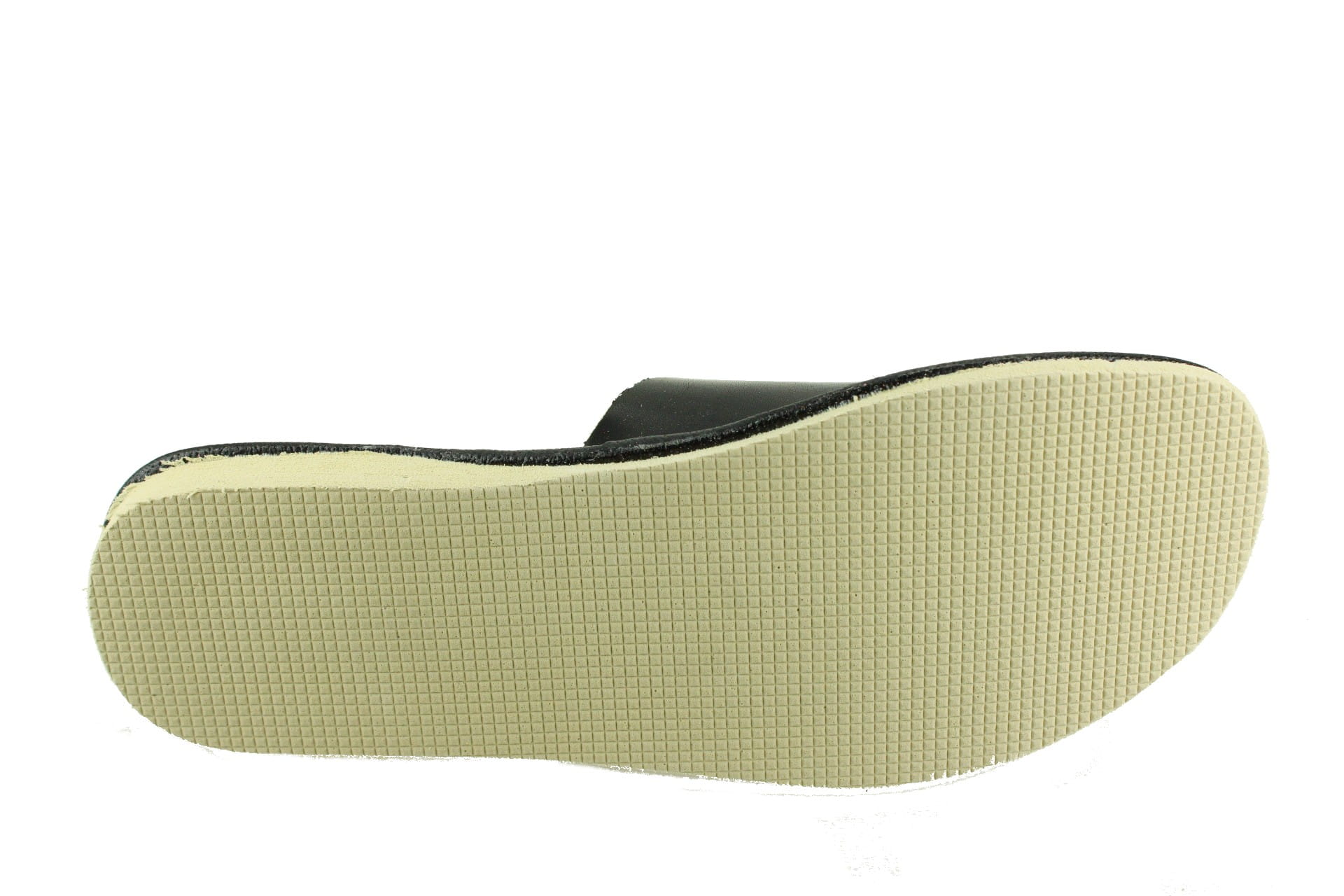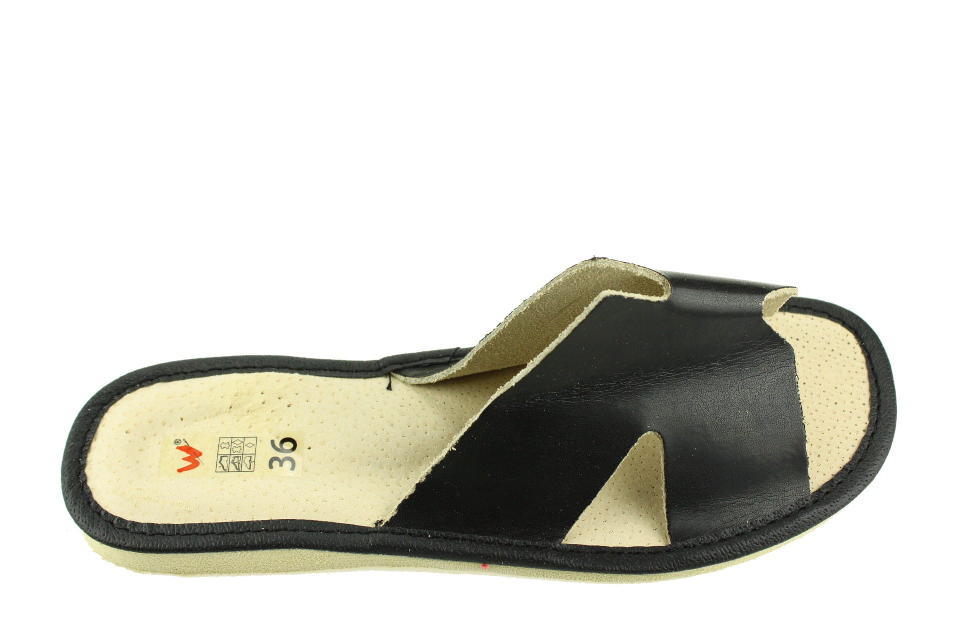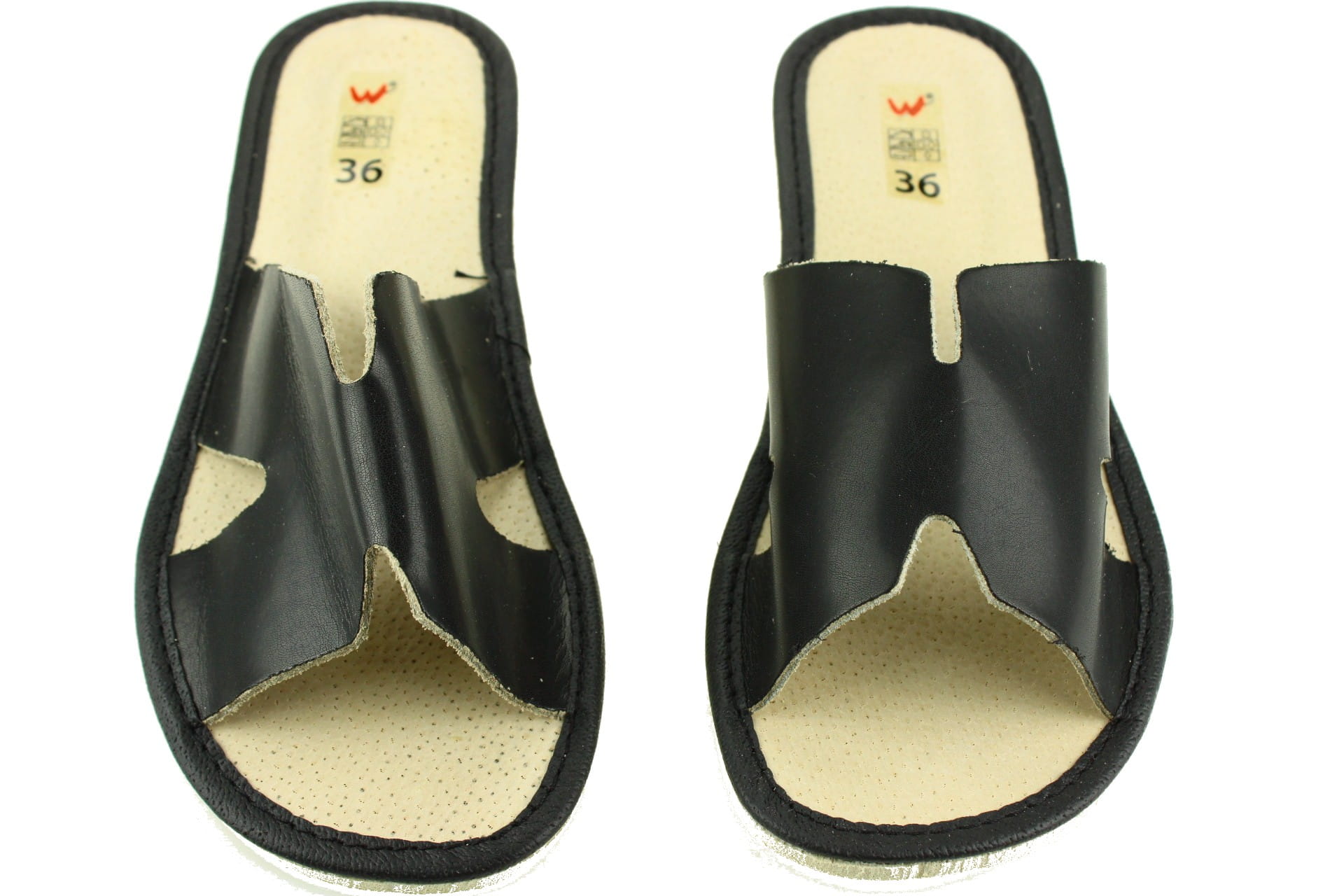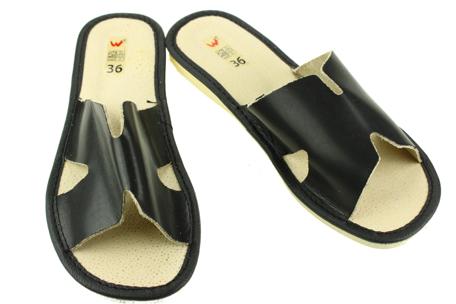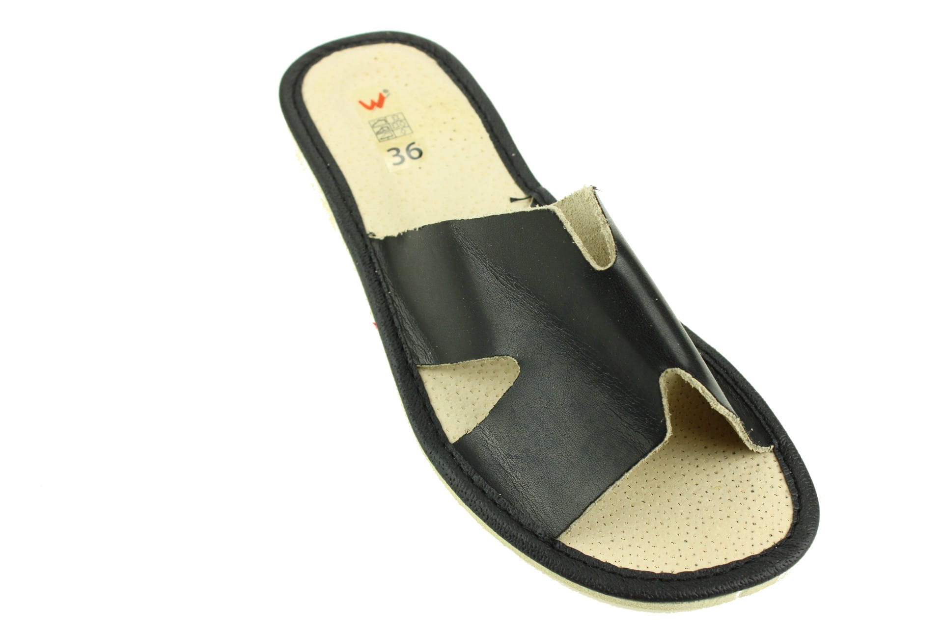 Pantofle damskie z otwartym palcem (b/p=bez palcy), wykonane z naturalnej skóry.