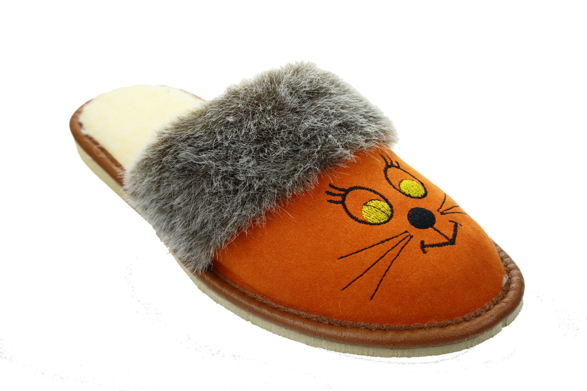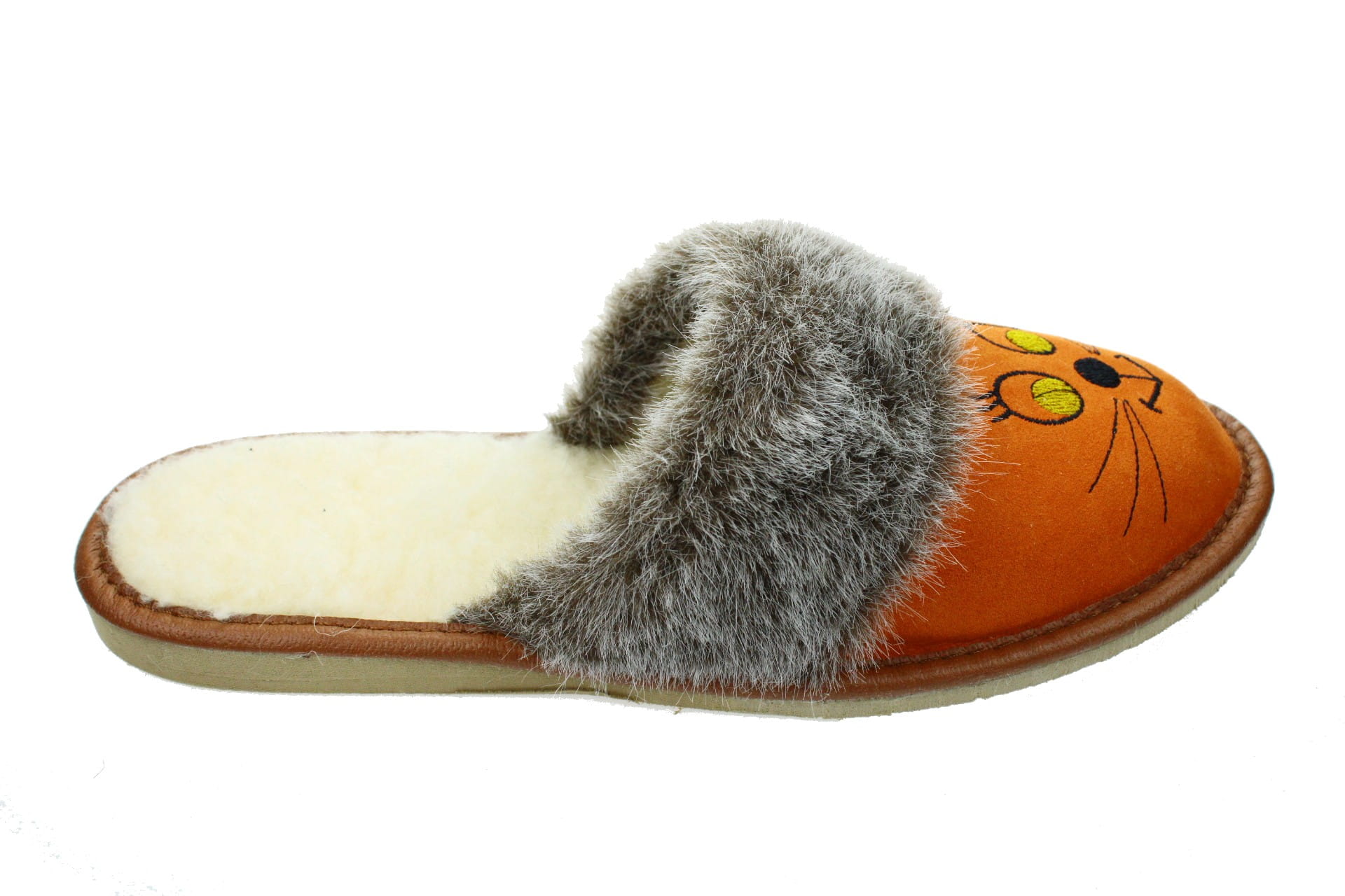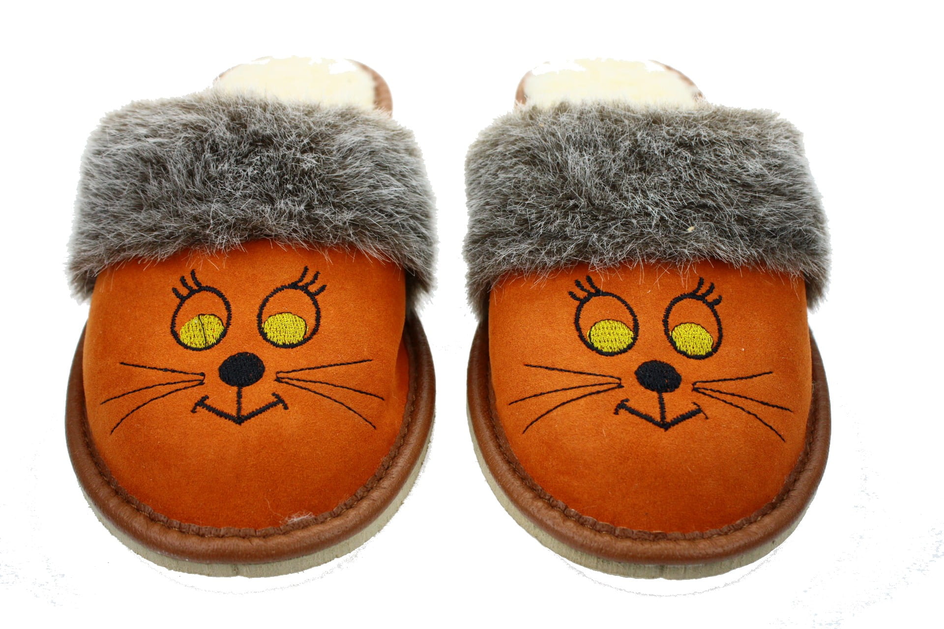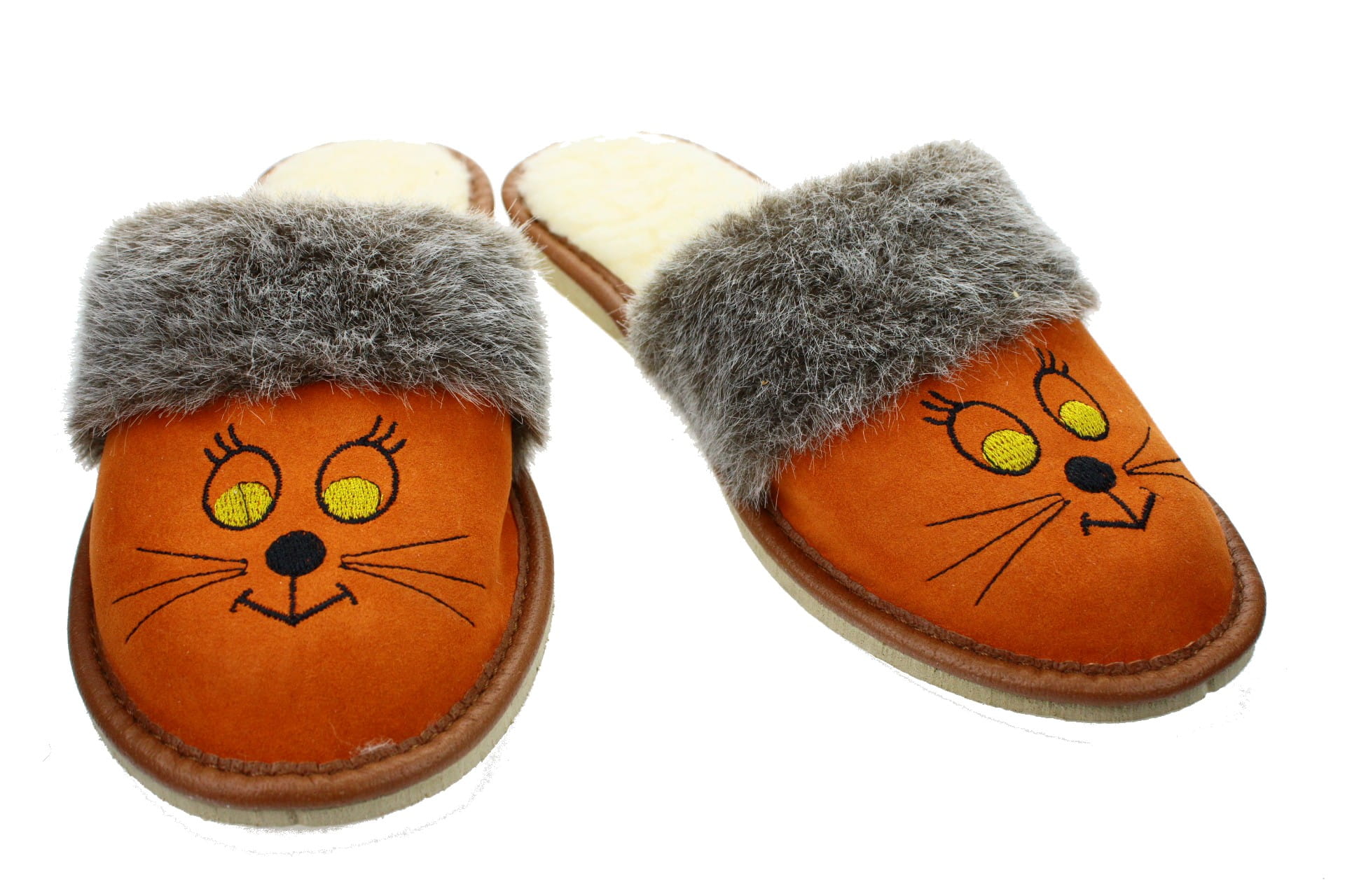 Pantofle damskie wykonane w modnym design - aplikacja - kotek.