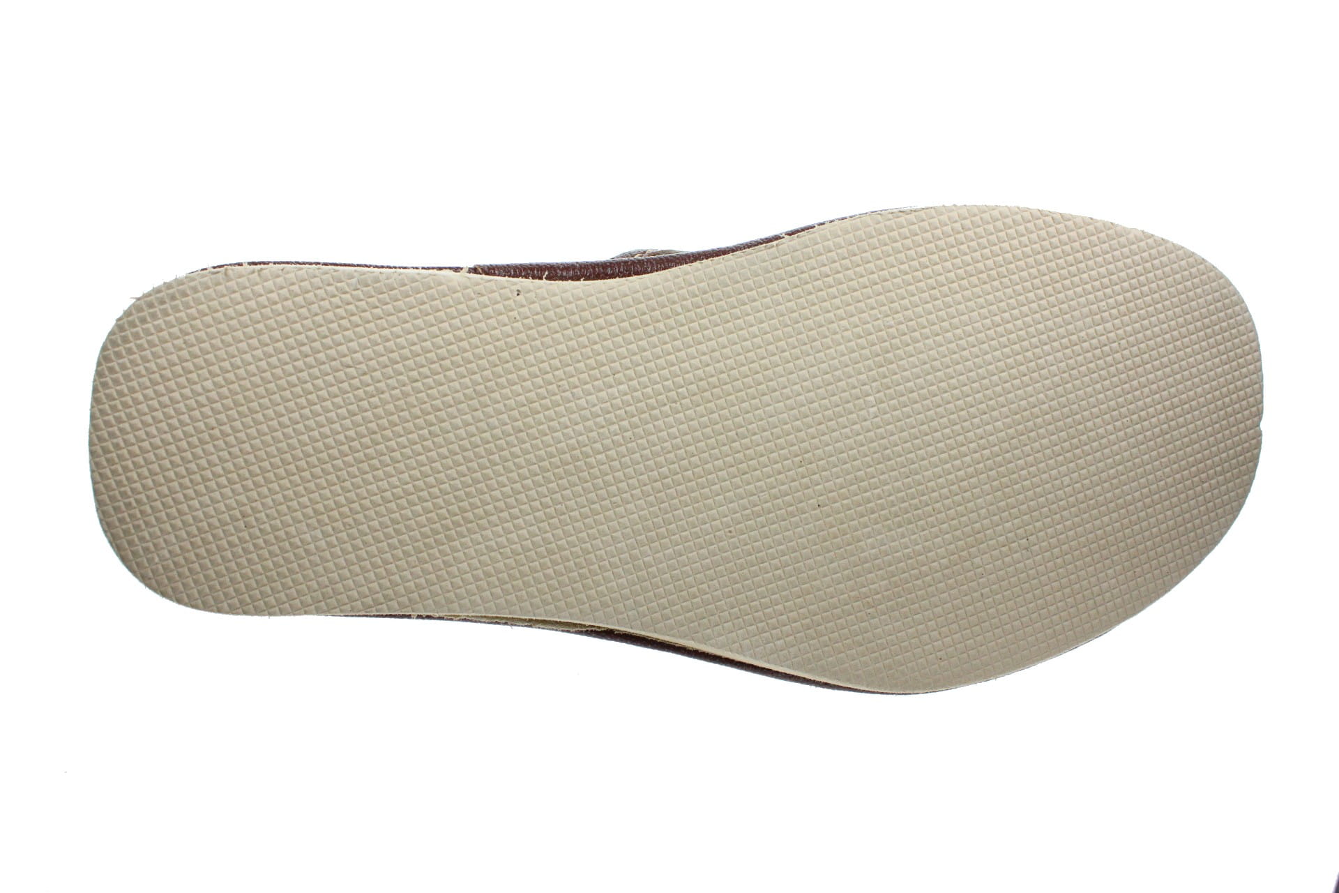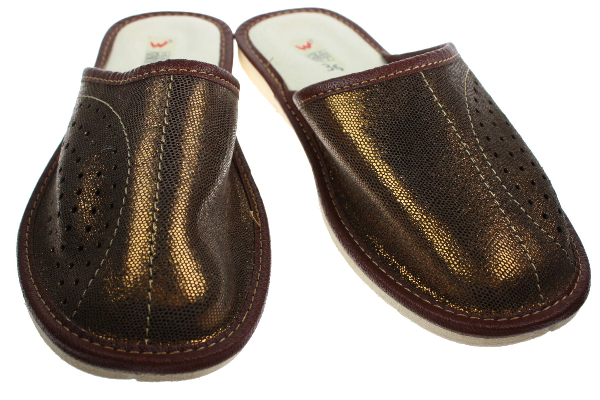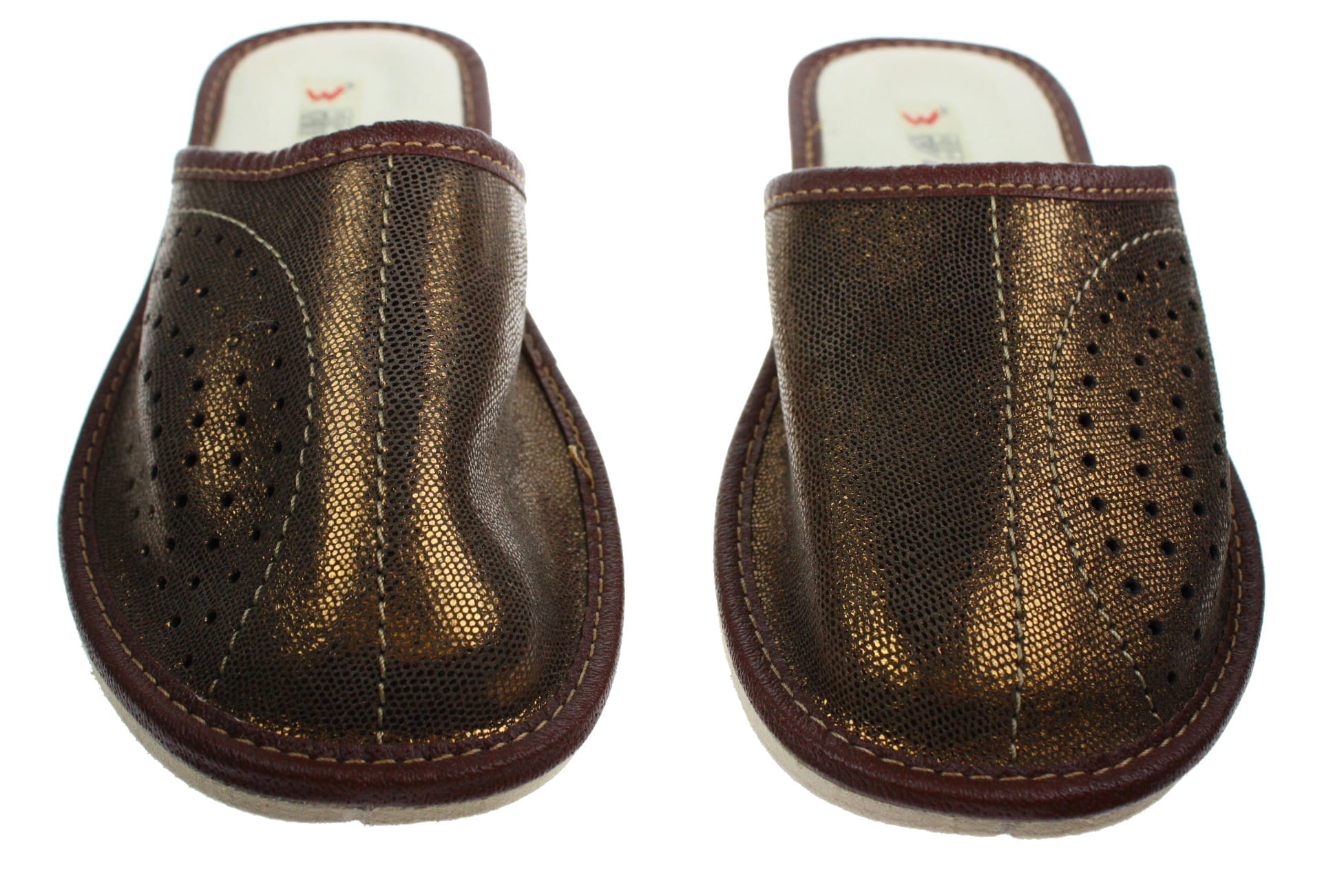 Pantofle damskie pełne, wykonane z naturalnej skóry . Spód gumowy, antypoślizgowy. Klin o wysokości 1 cm. Wkładka skórzana, profilowana, dostosowuje się do kształtu stopy, co daje pewność jej prawidłowego ułożenia i przez to maksymalne poczucie komfortu. Dzięki temu nogi nie męczą się, a stawy nie są narażone na dodatkowe obciążenie. Prezentowany model posiada uniwersalny, klasyczny fason i ładny miedziany kolor. Przeznaczony do użytku domowego.