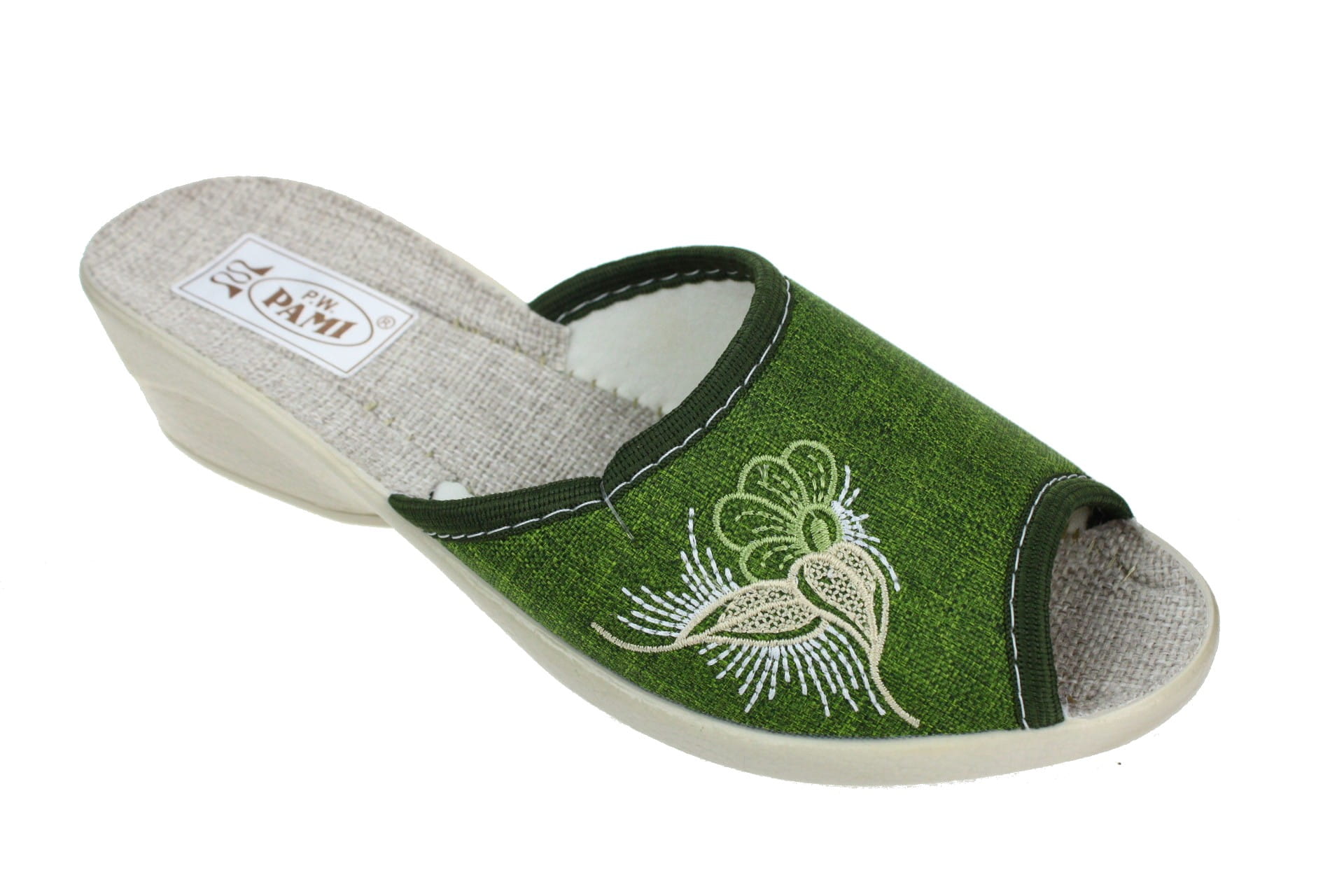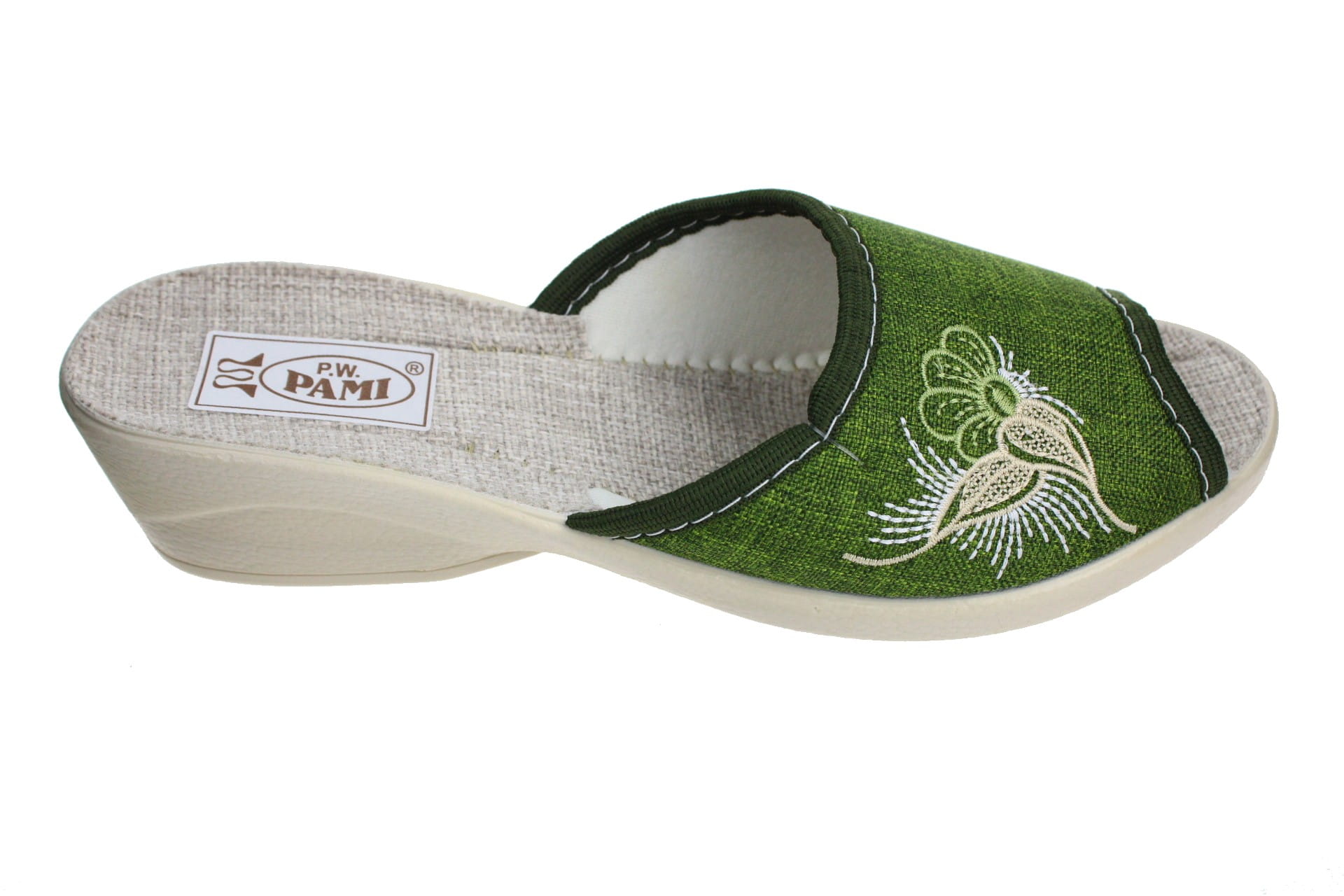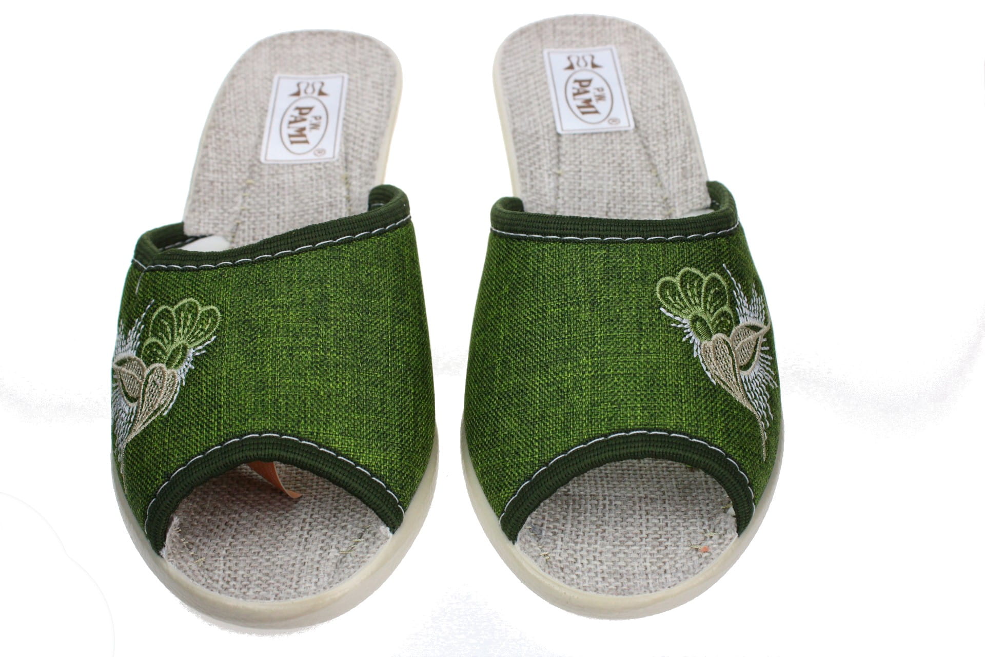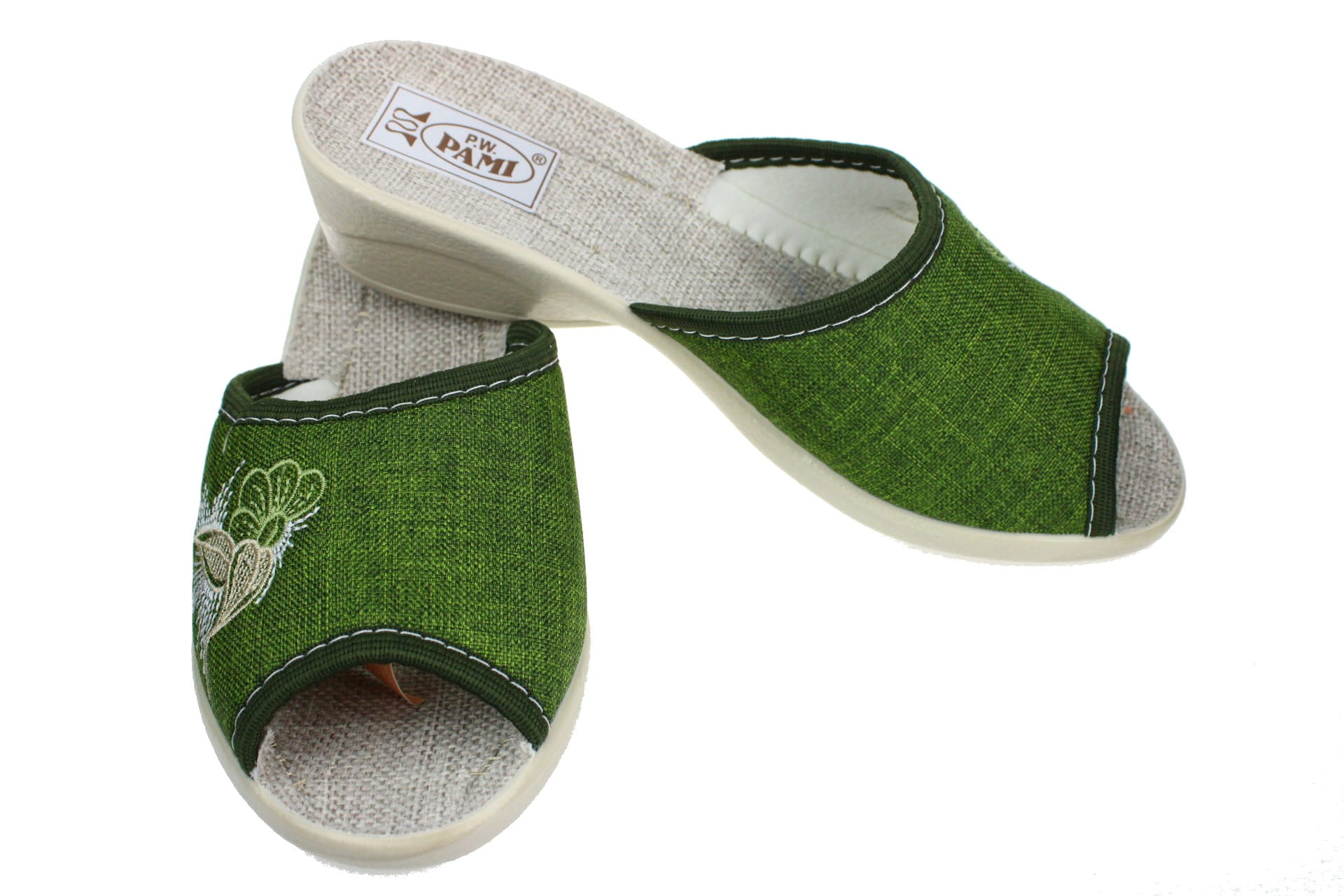 116-D. Laczki damskie otwarte Pami lniane kolorowe wysoki odlew TOP-2 oliwka melanż