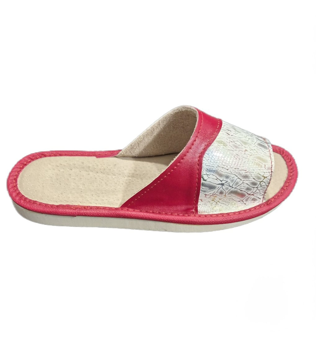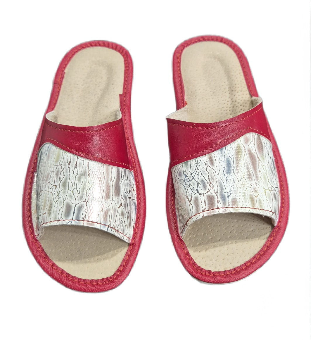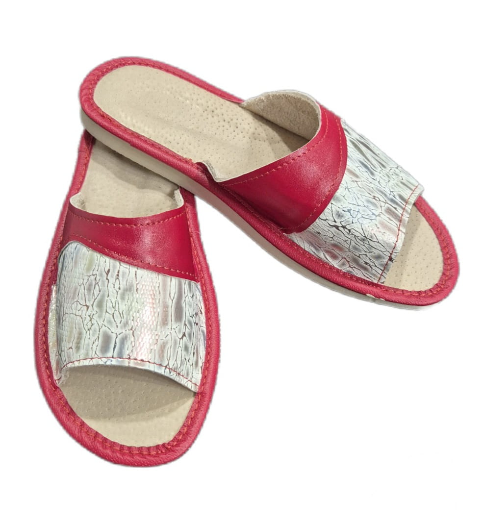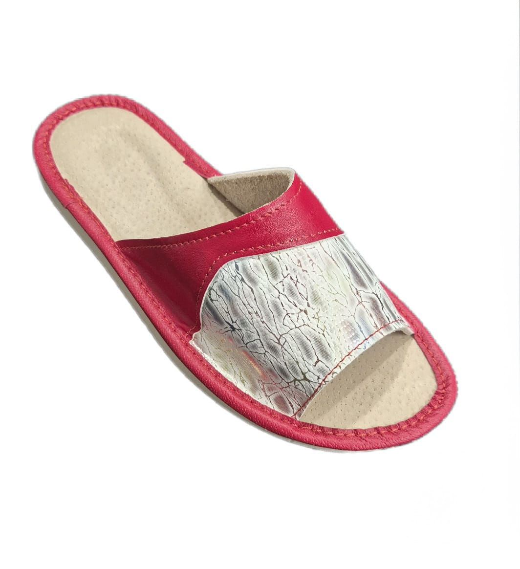 Pantofle damskie z otwartym palcem (b/p=bez palcy), wykonane z naturalnej skóry.