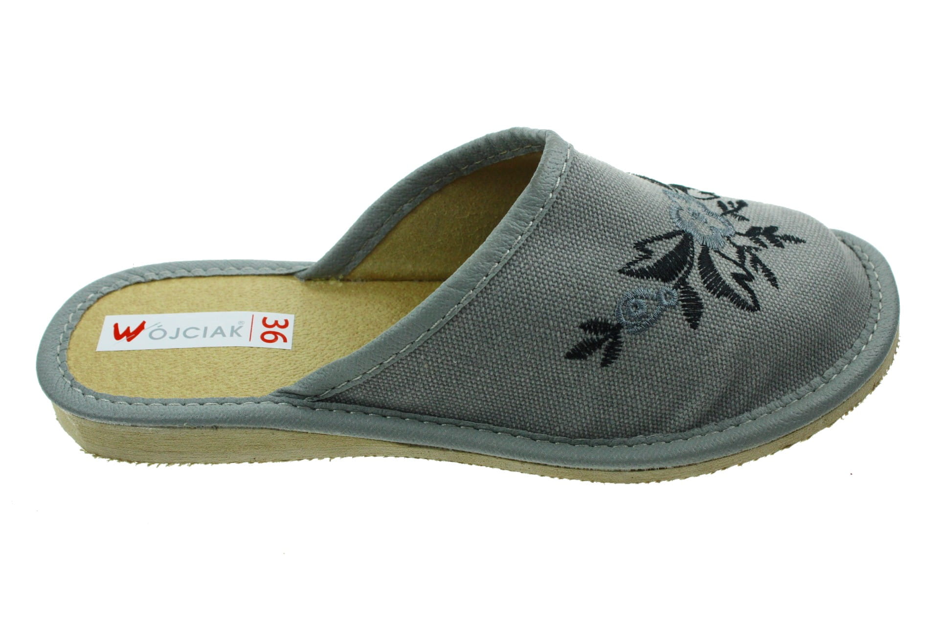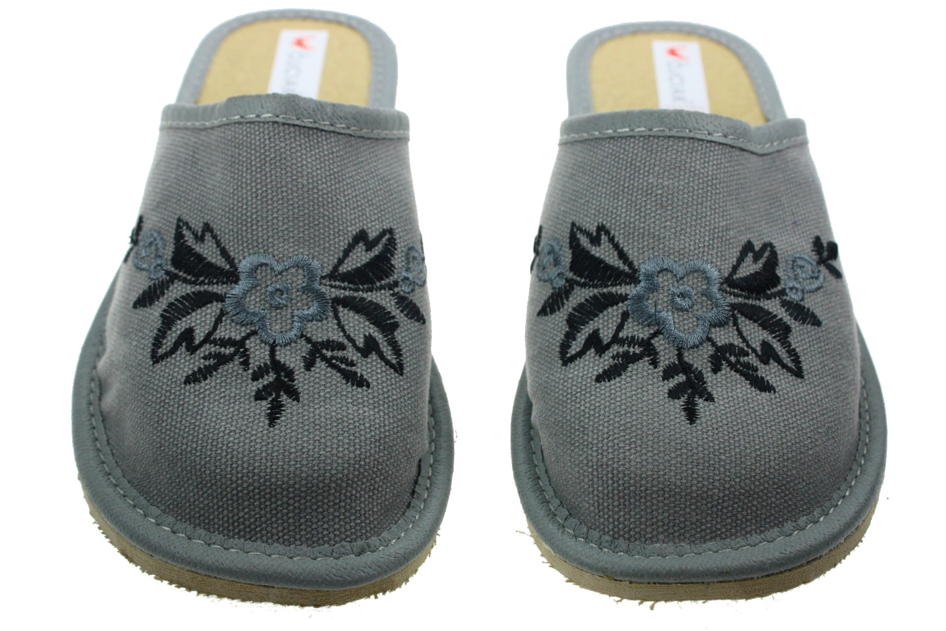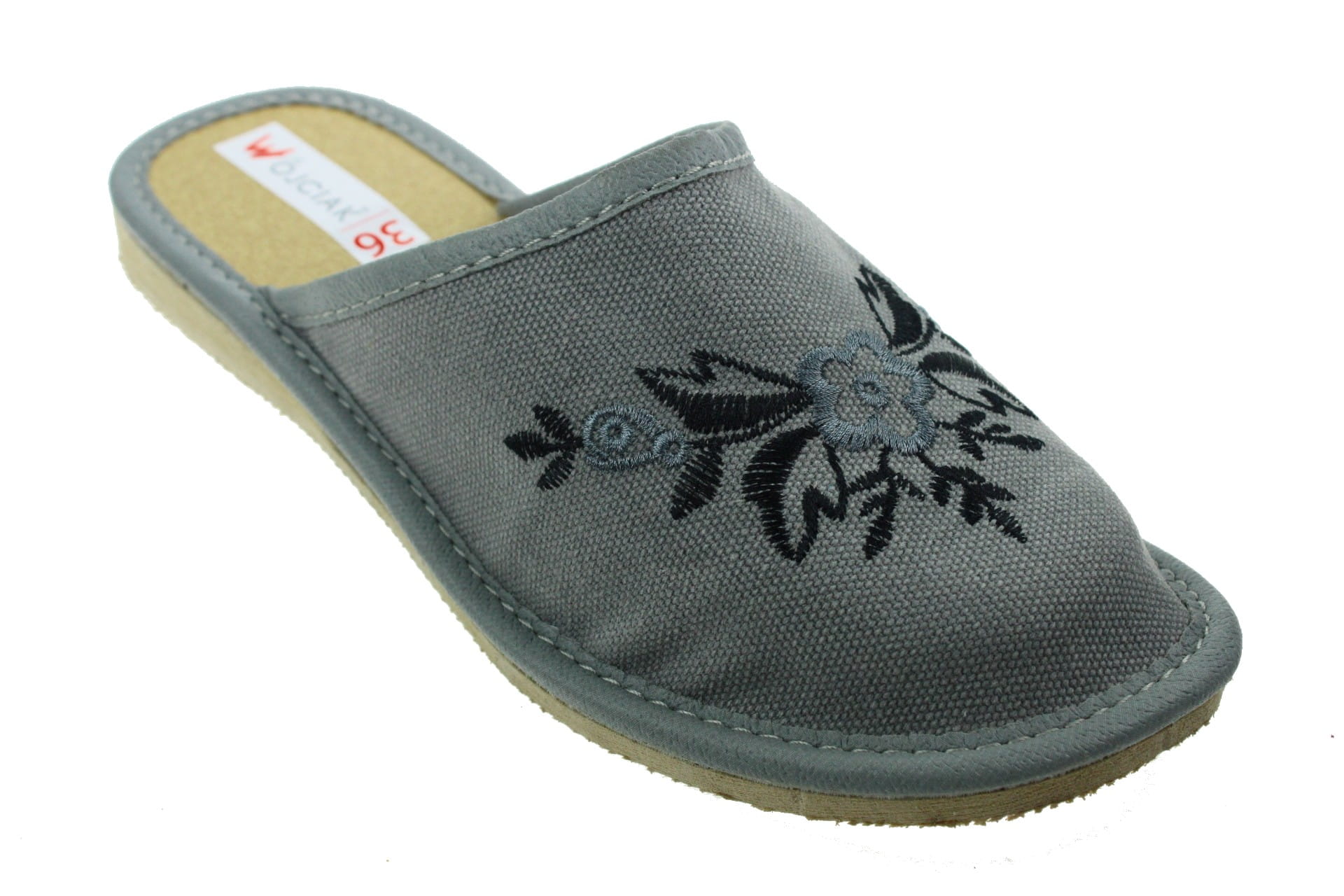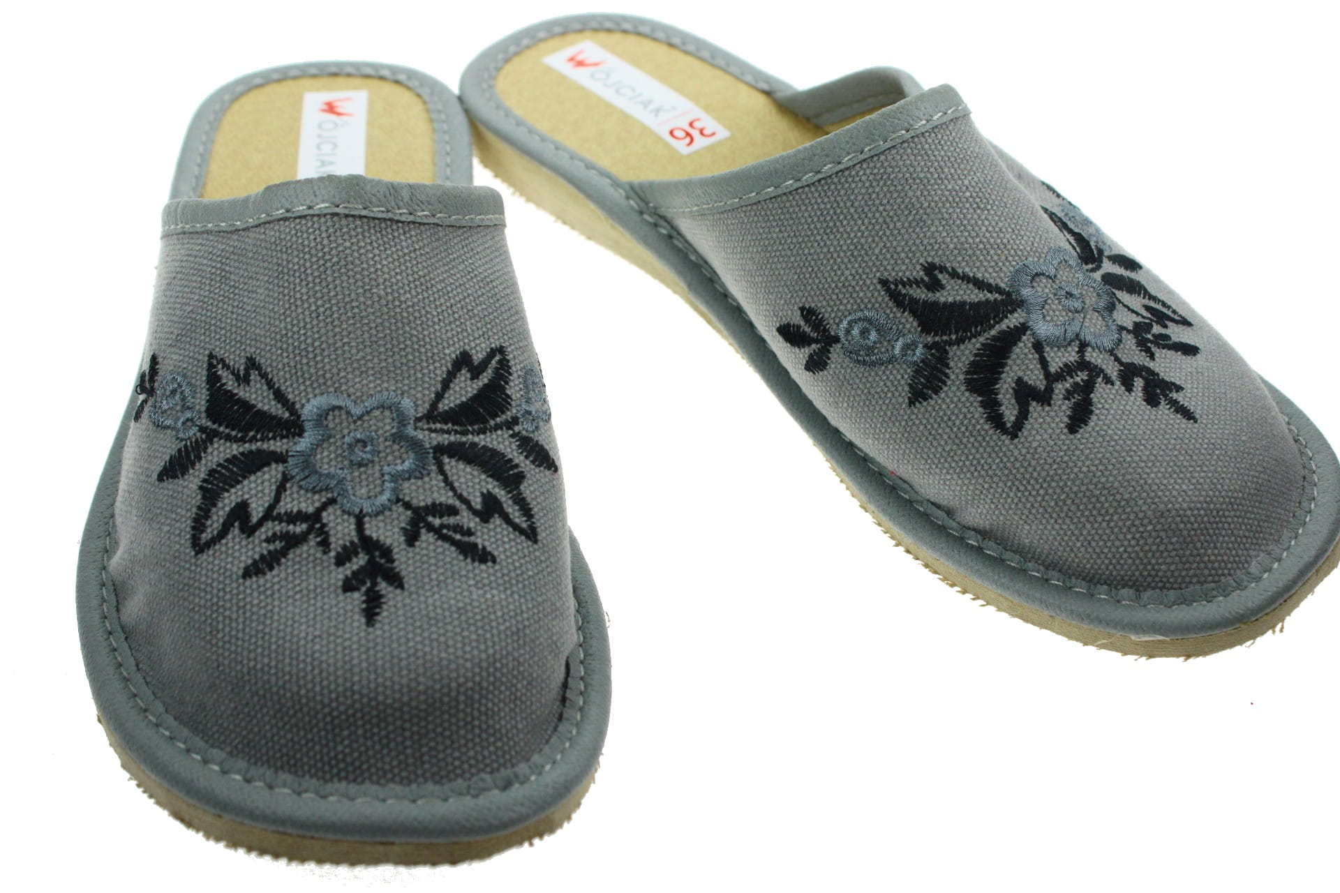 Laczki damskie wykonane z lnu, pełne. Pantofle są lekkie i wygodne co daje duży komfort podczas użytkowania. Podeszwa gumowa, antypoślizgowa, klin o wysokości 2,5 cm. Przeznaczone do użytku domowego.