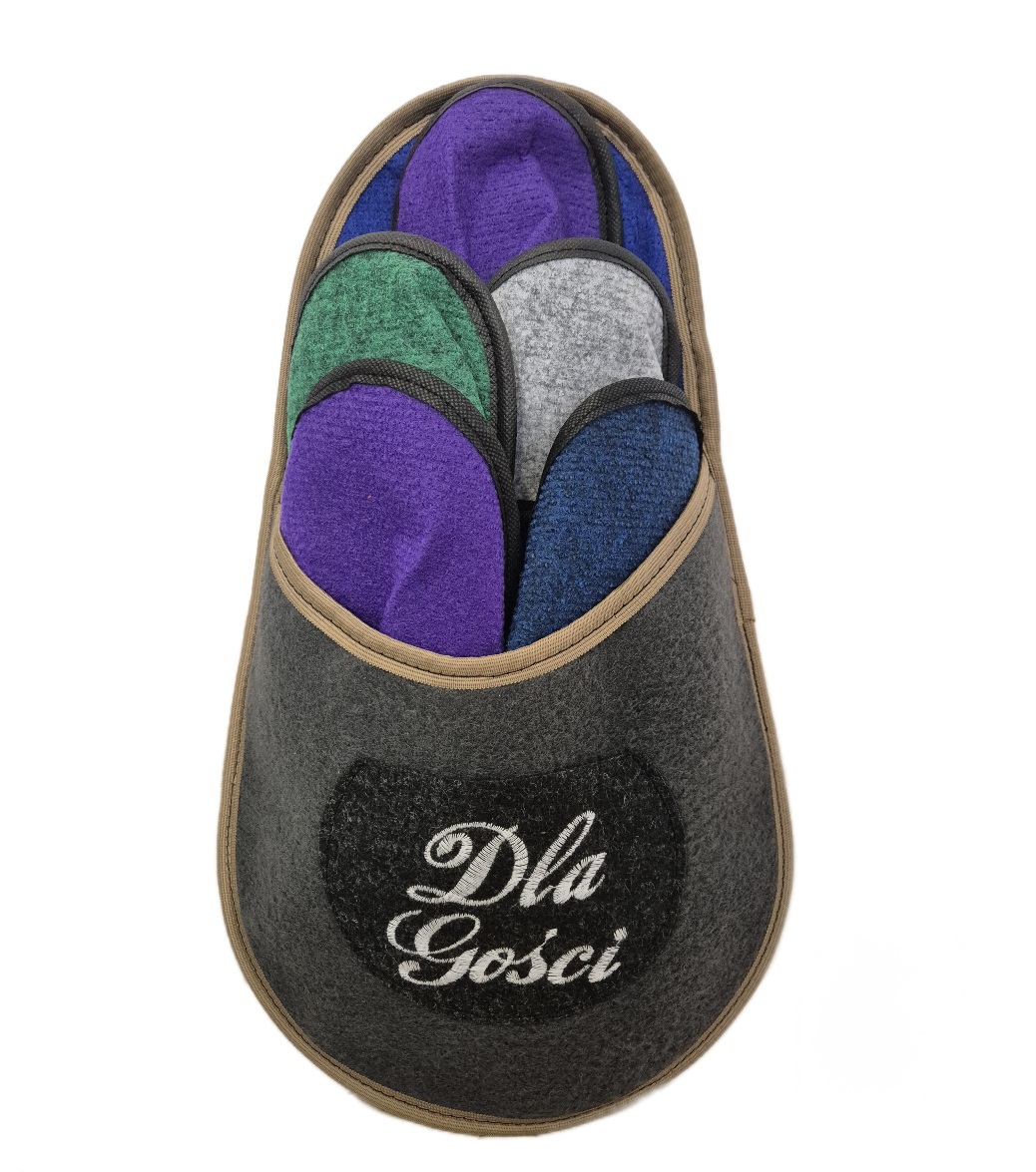 W skład kompletu kapci gościnnych wchodzi 5 par o zróżnicowanej rozmiarówce (rozmiary damskie i męskie