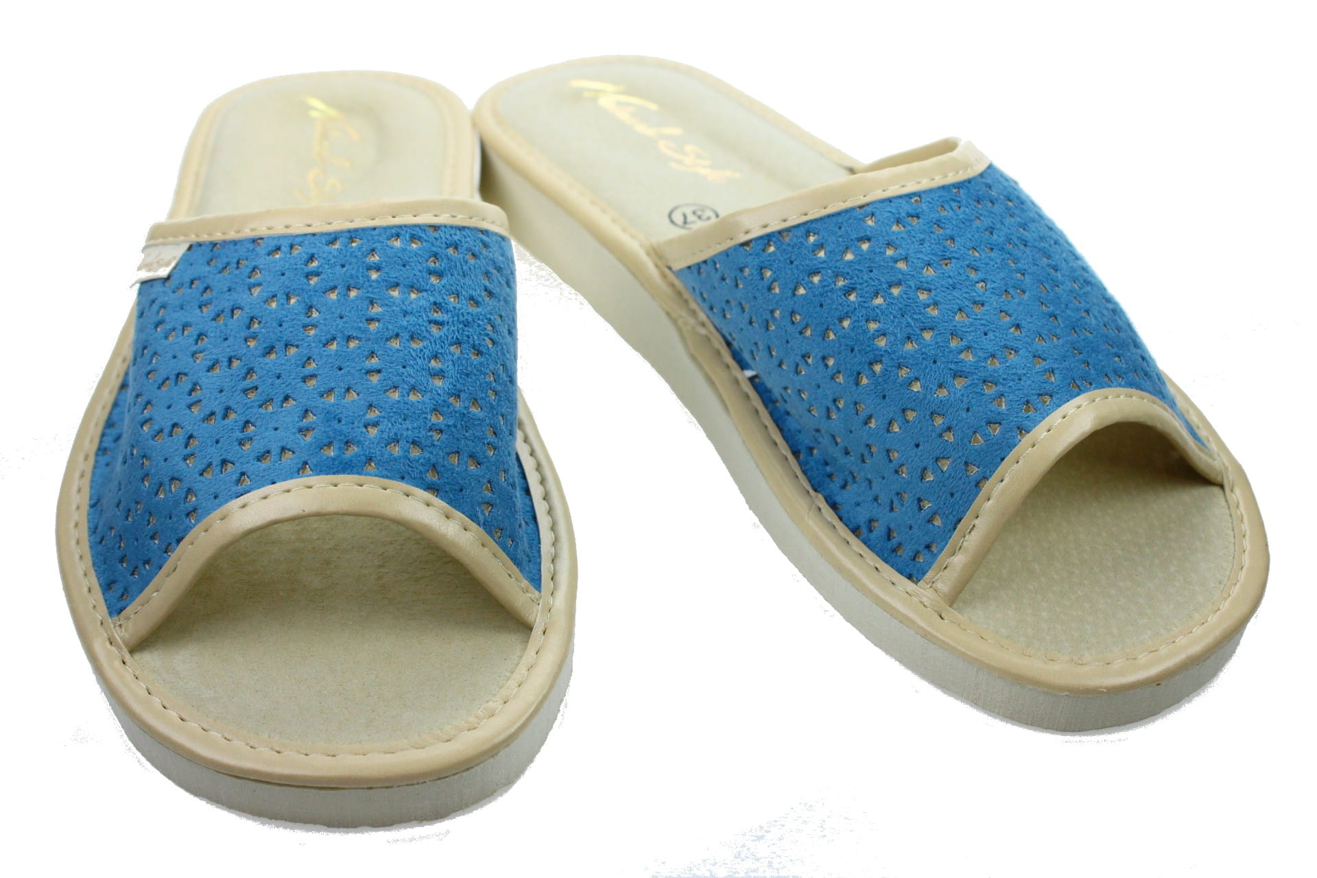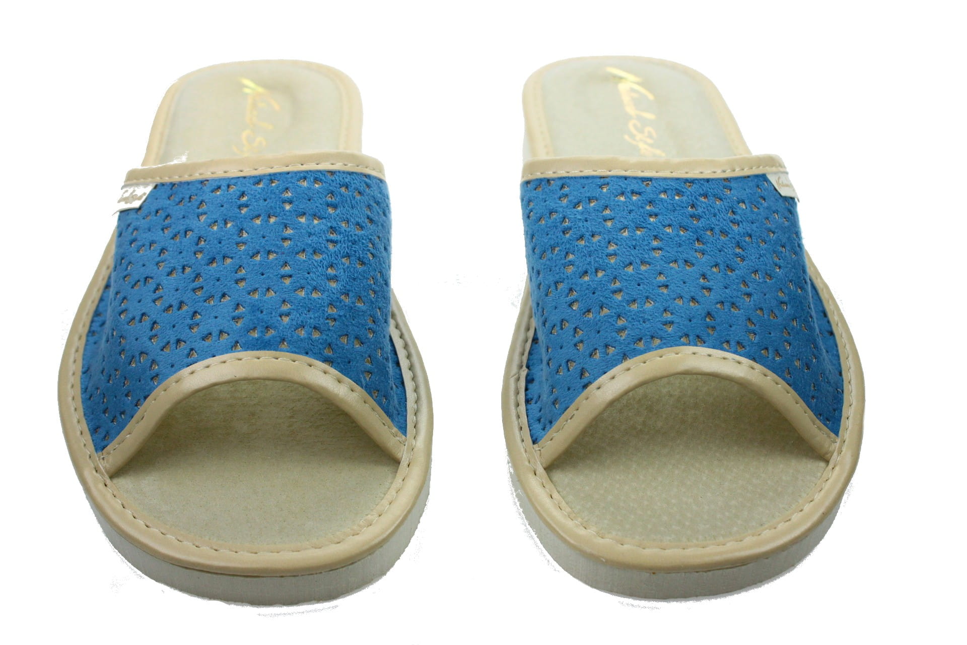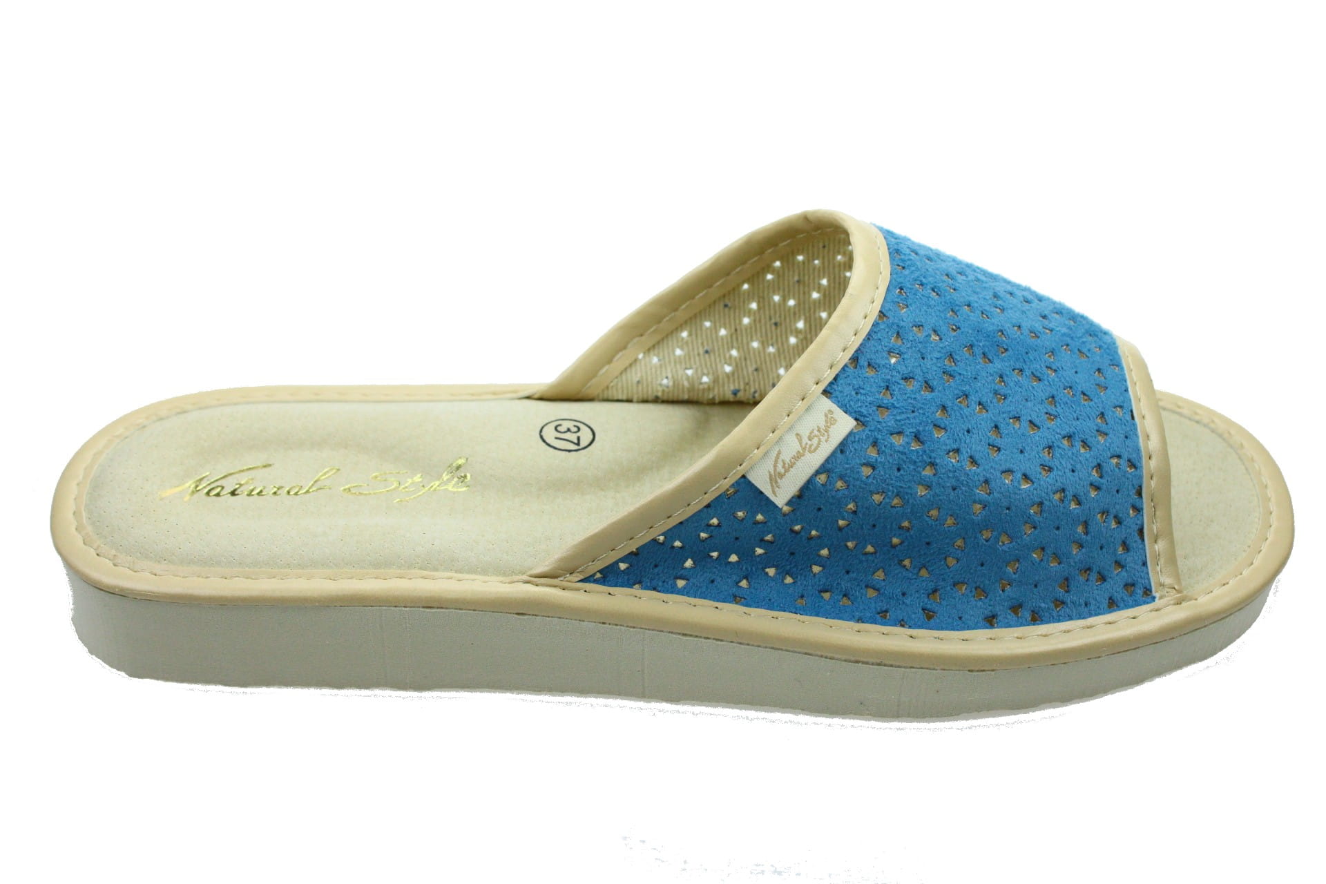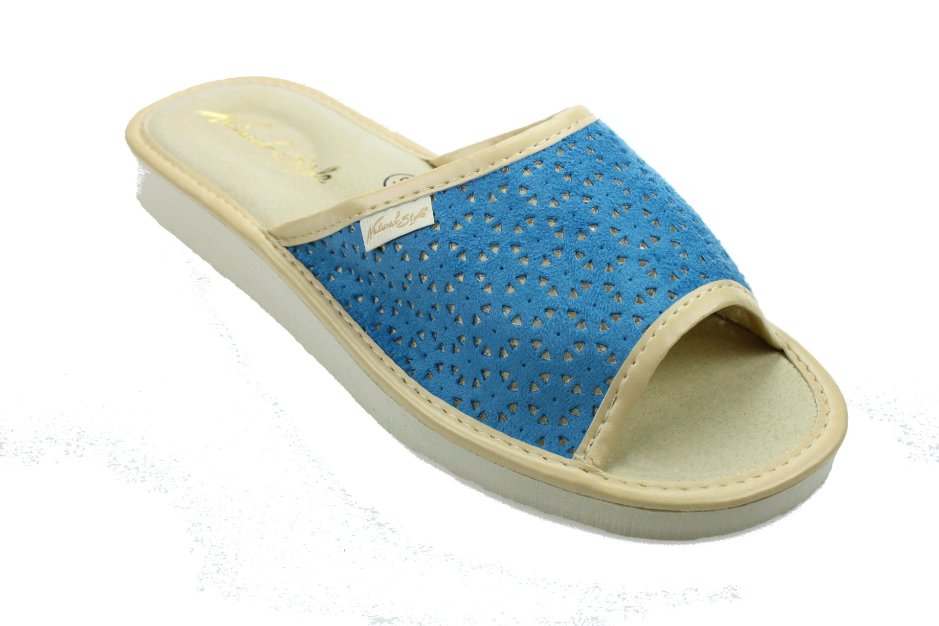 Laczki damskie otwarte,  cholewka  wykonane z tkaniny bawełnianej. Wkładka skórzana.  Spód piankowy - EVA, bardzo lekkie i wygodne, klin o wysokości 2 cm, przeznaczone do użytku domowego.