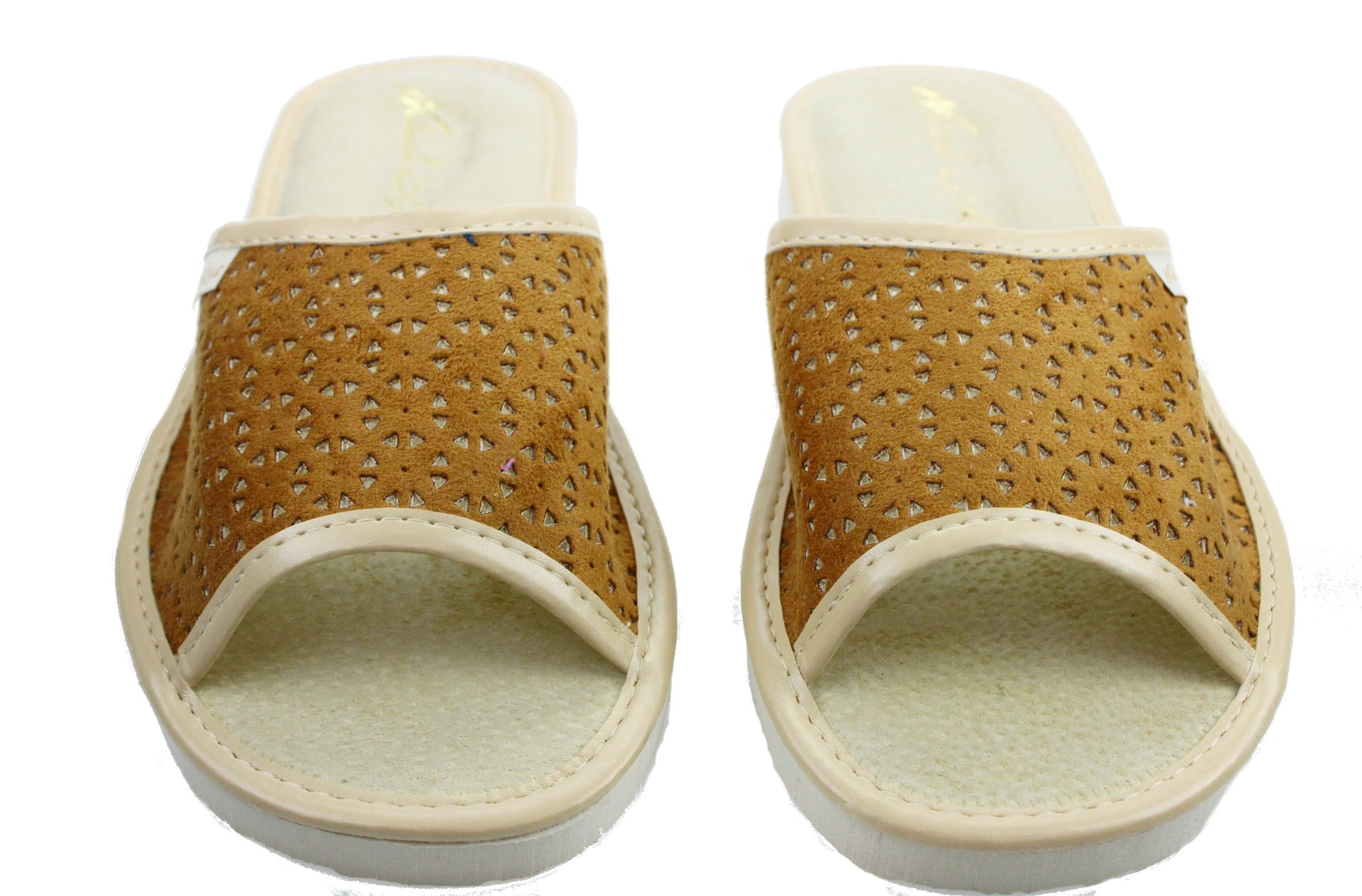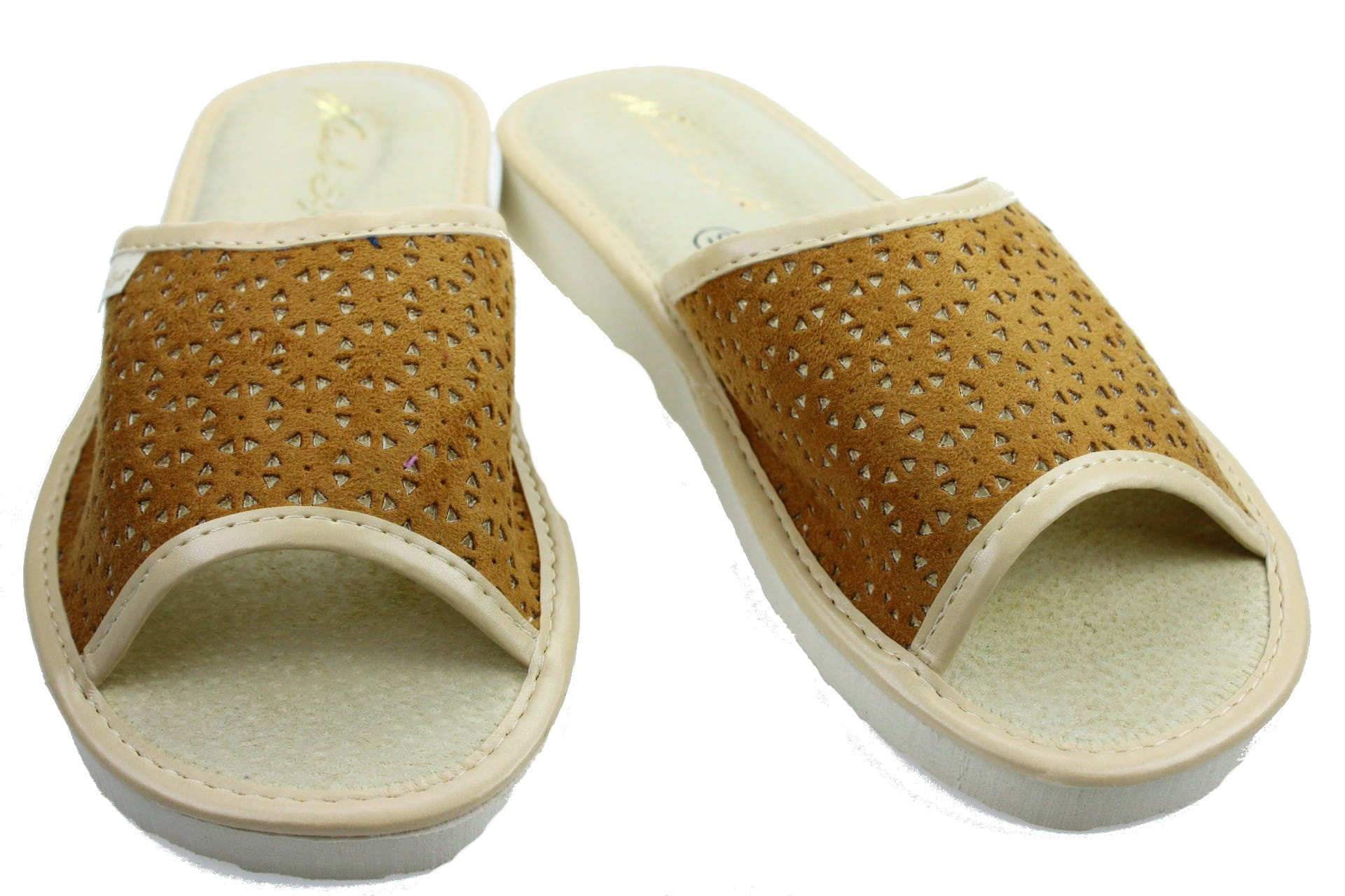 Laczki damskie otwarte, cholewka wykonane z tkaniny bawełnianej. Wkładka skórzana. Spód piankowy - EVA, bardzo lekkie i wygodne, klin o wysokości 2 cm, przeznaczone do użytku domowego