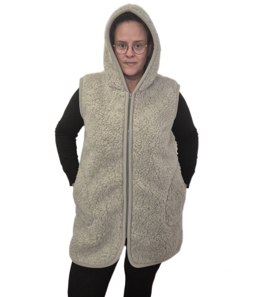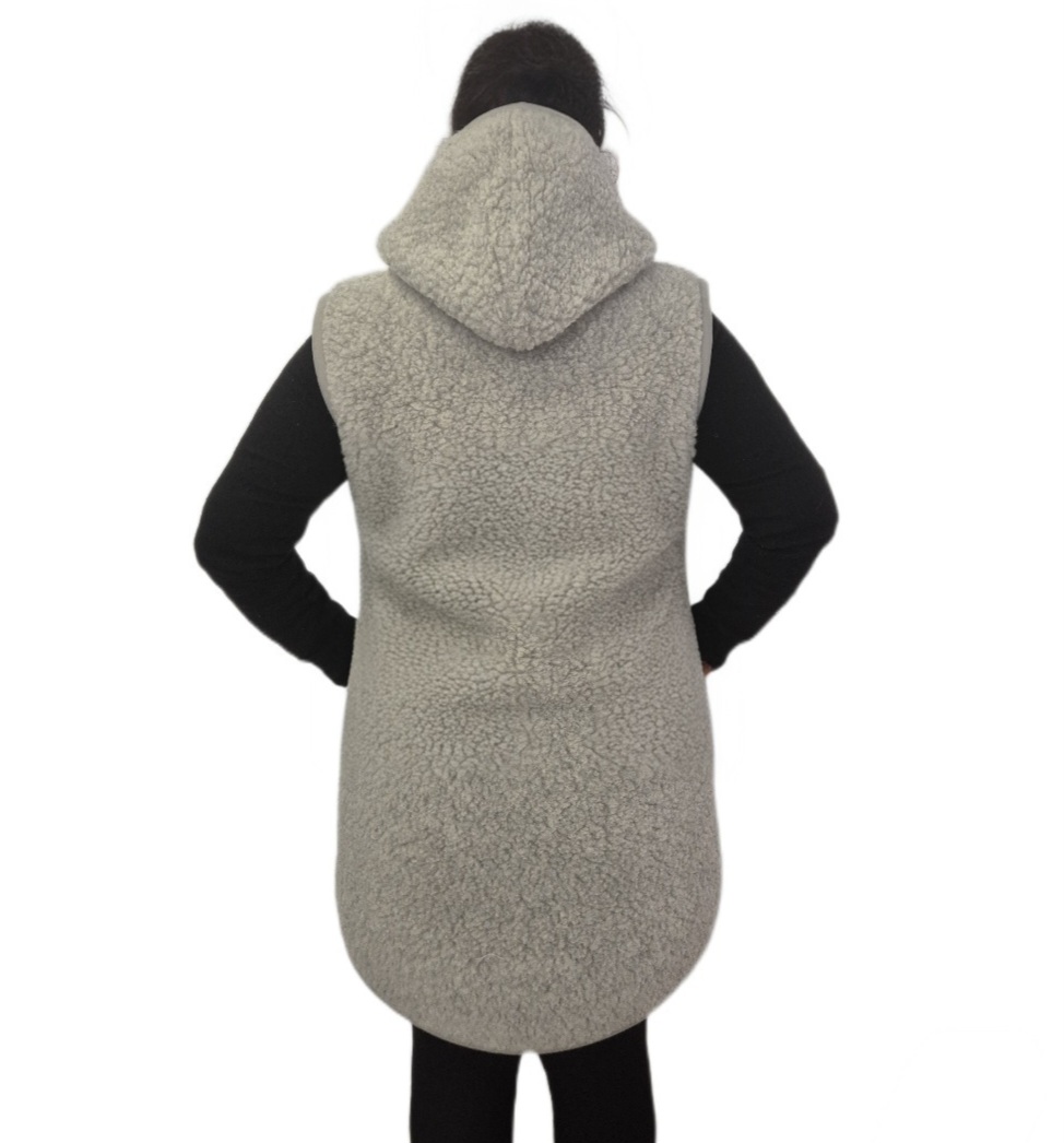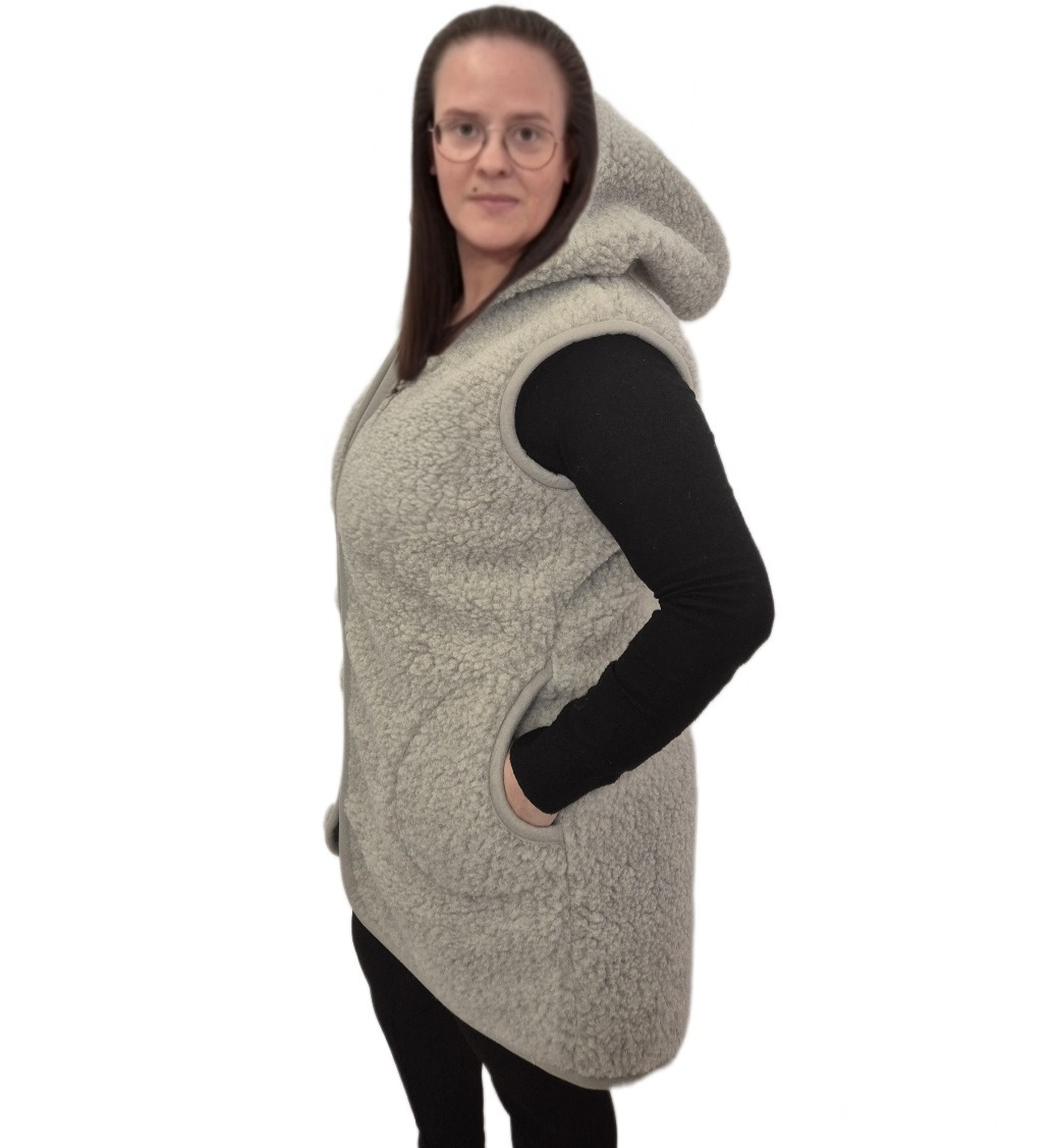 1373-A. Kamizelka damska - zamek wełna owcza popielata z kapturem długa
