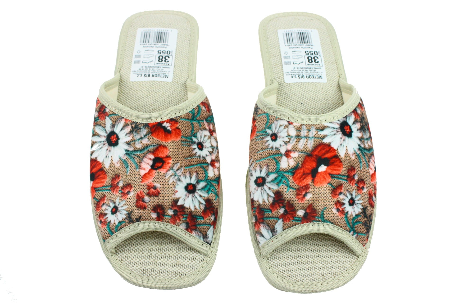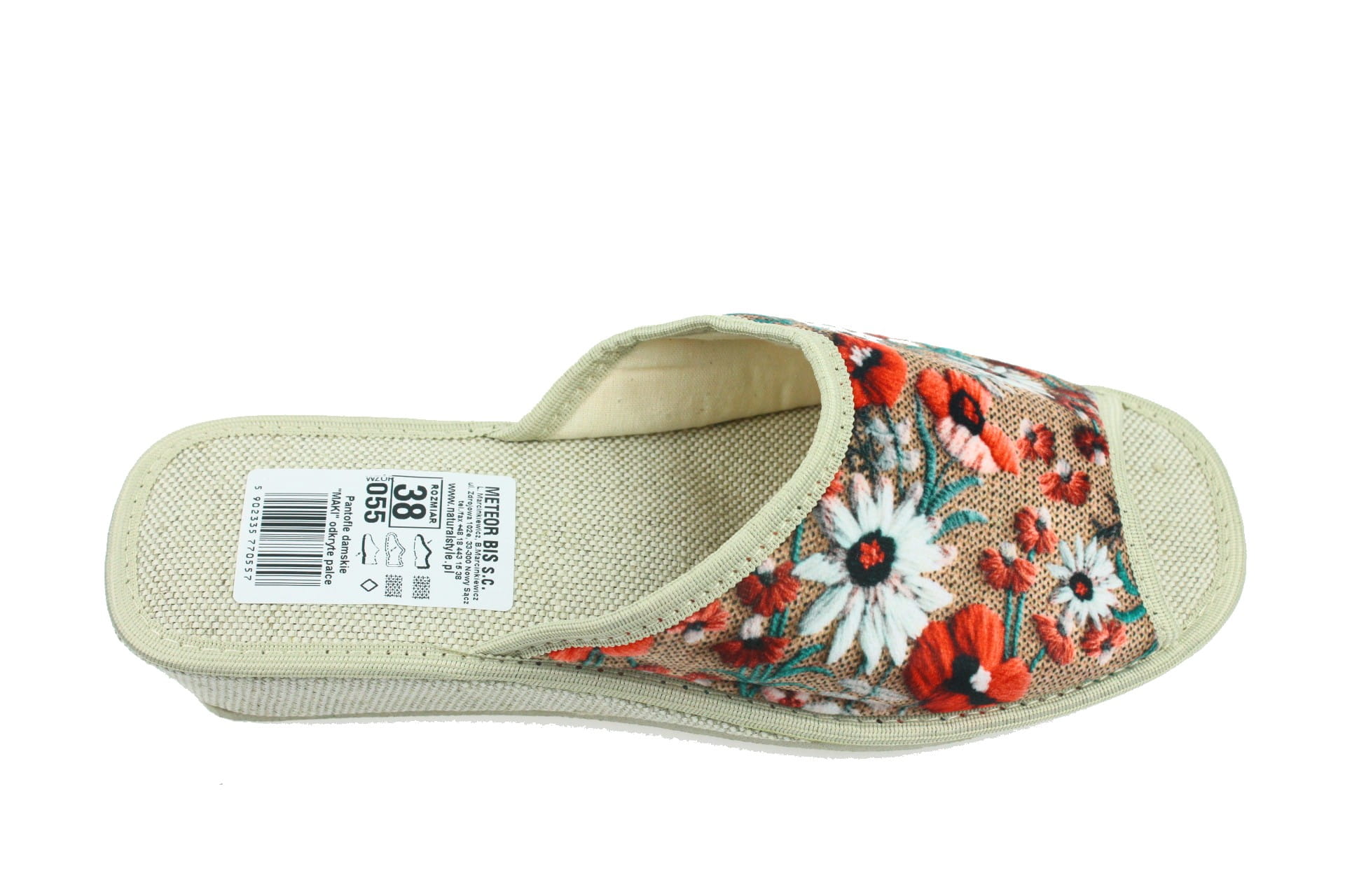 Laczki damskie bez palcy (otwarte), cholewka wykonana z tkaniny bawełnianej. Wkładka bawełniana dzięki której stopy oddychają i nie pocą się. Podeszwa gumowa, antypoślizgowa, klin o wysokości 3,5 cm. Pantofle idealne na szersze i podwyższone przegubie, są lekkie i wygodne, przeznaczone do użytku domowego.