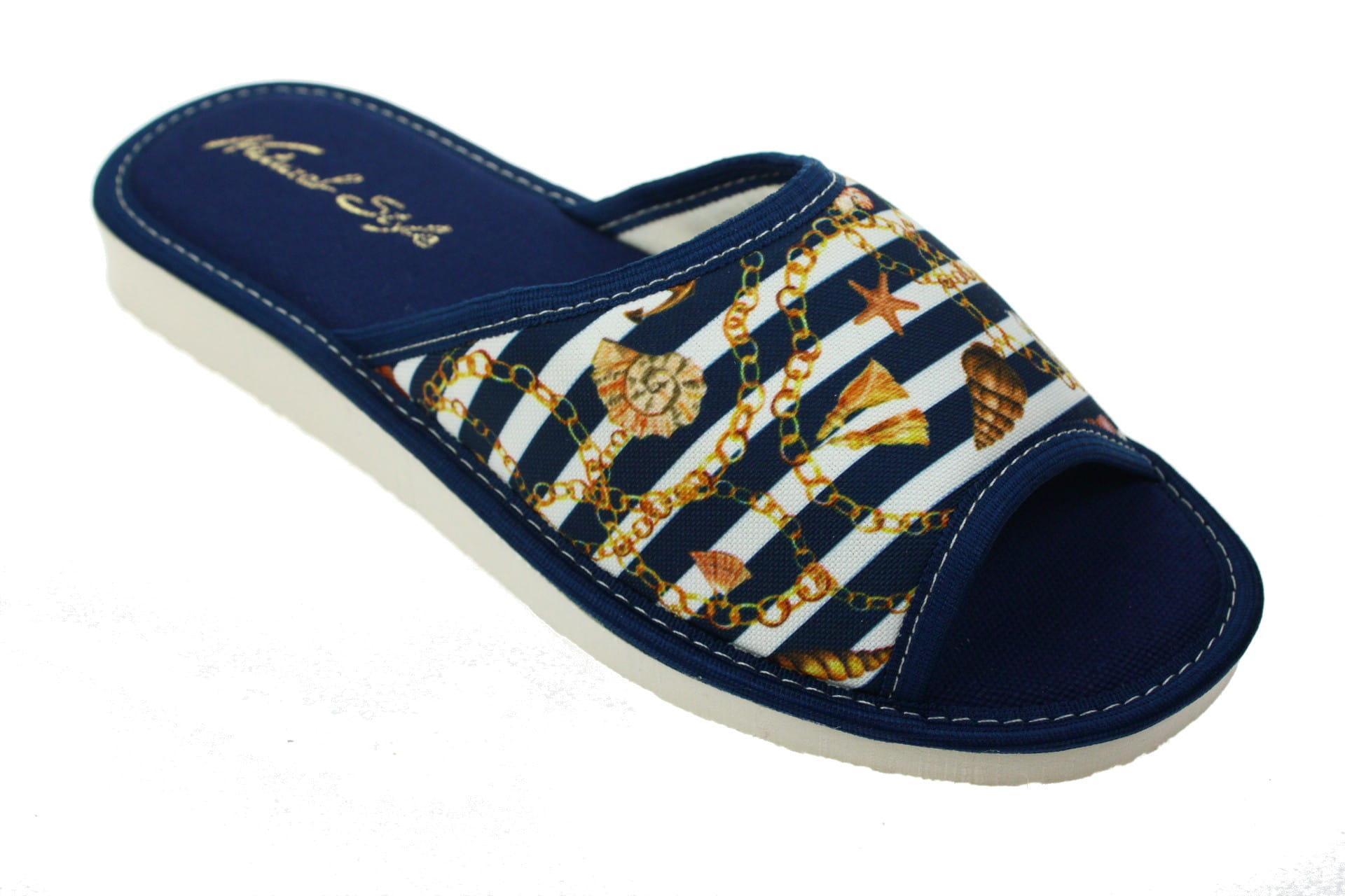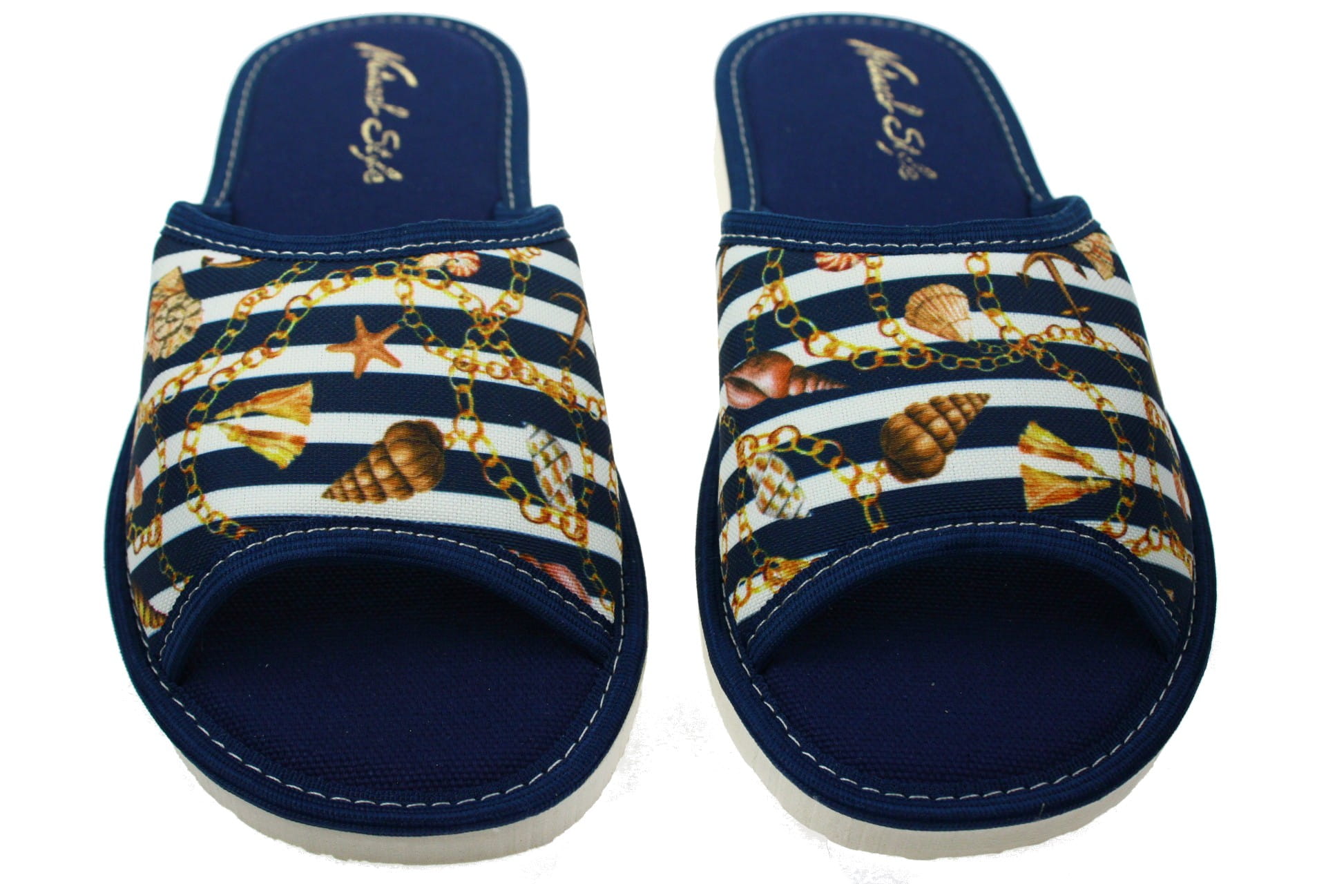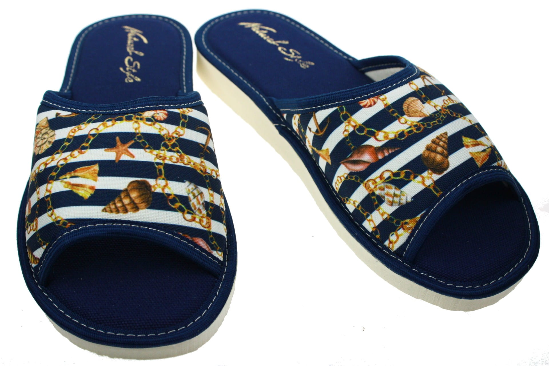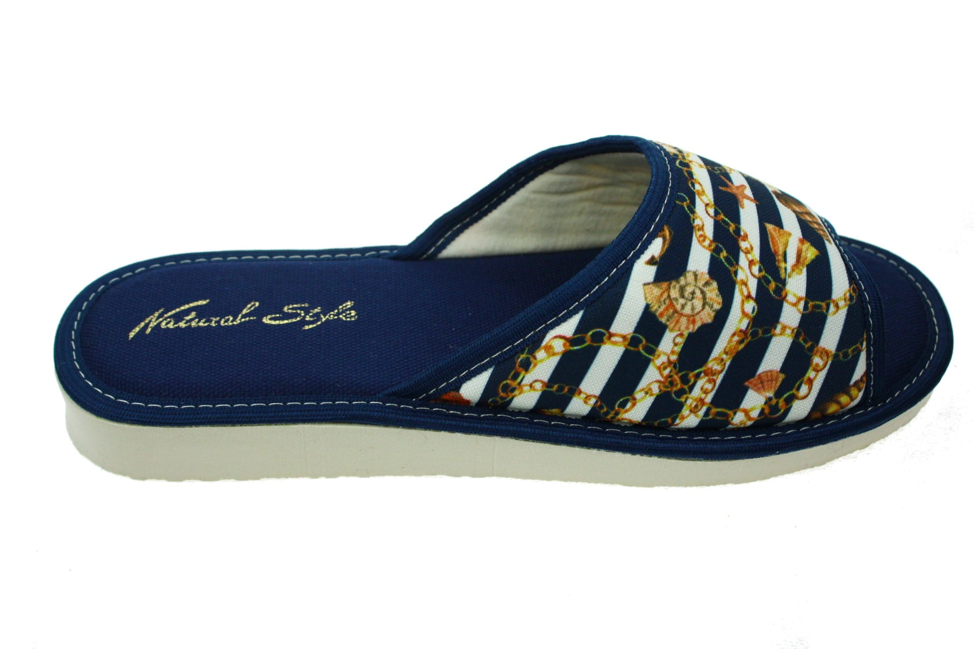 Laczki damskie otwarte, cholewka i wkładka wykonane z tkaniny bawełnianej , dzięki, której stopy oddychają i nie pocą się. Spód piankowy - EVA, bardzo lekkie i wygodne, klin o wysokości 2 cm, przeznaczone do użytku domowego.