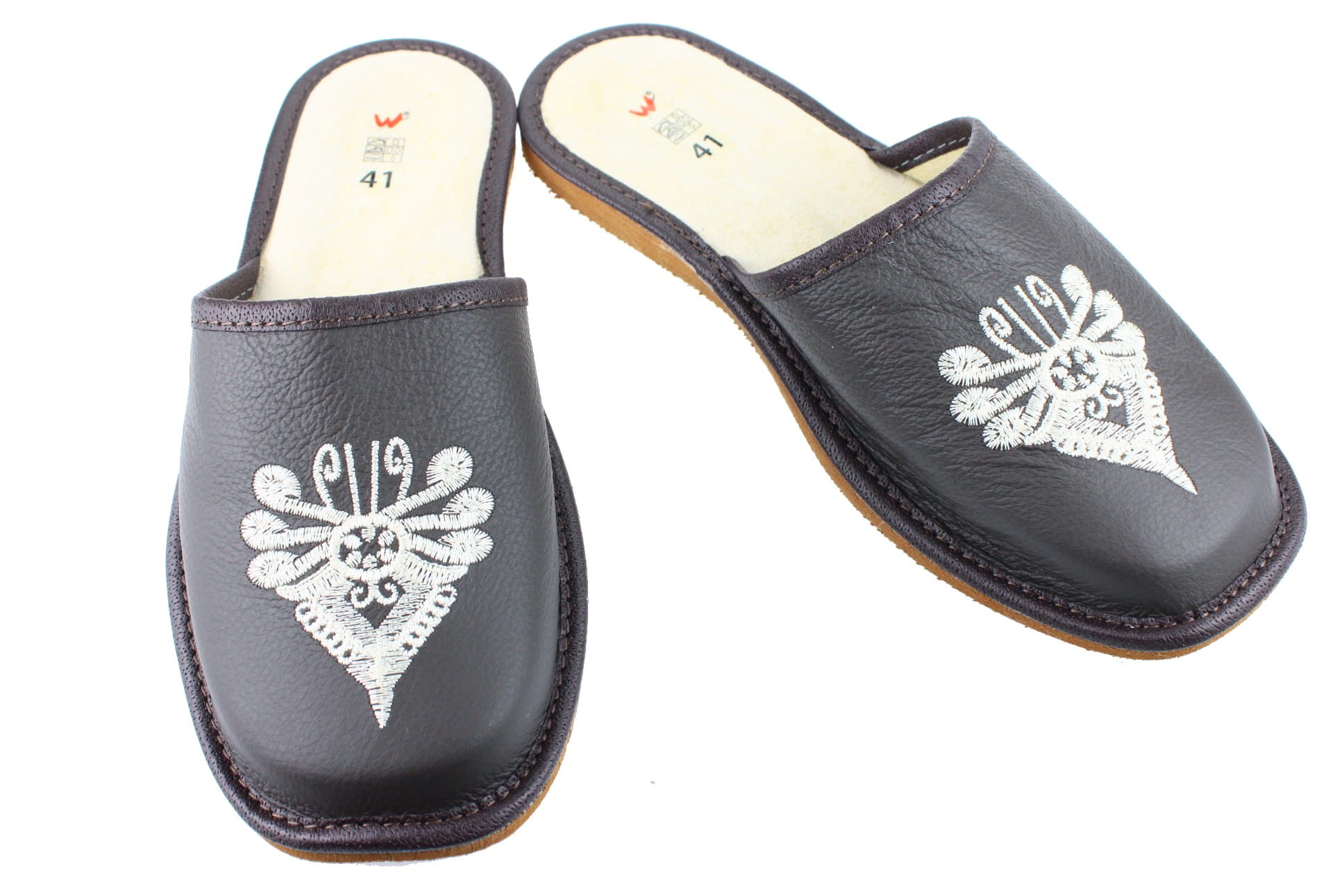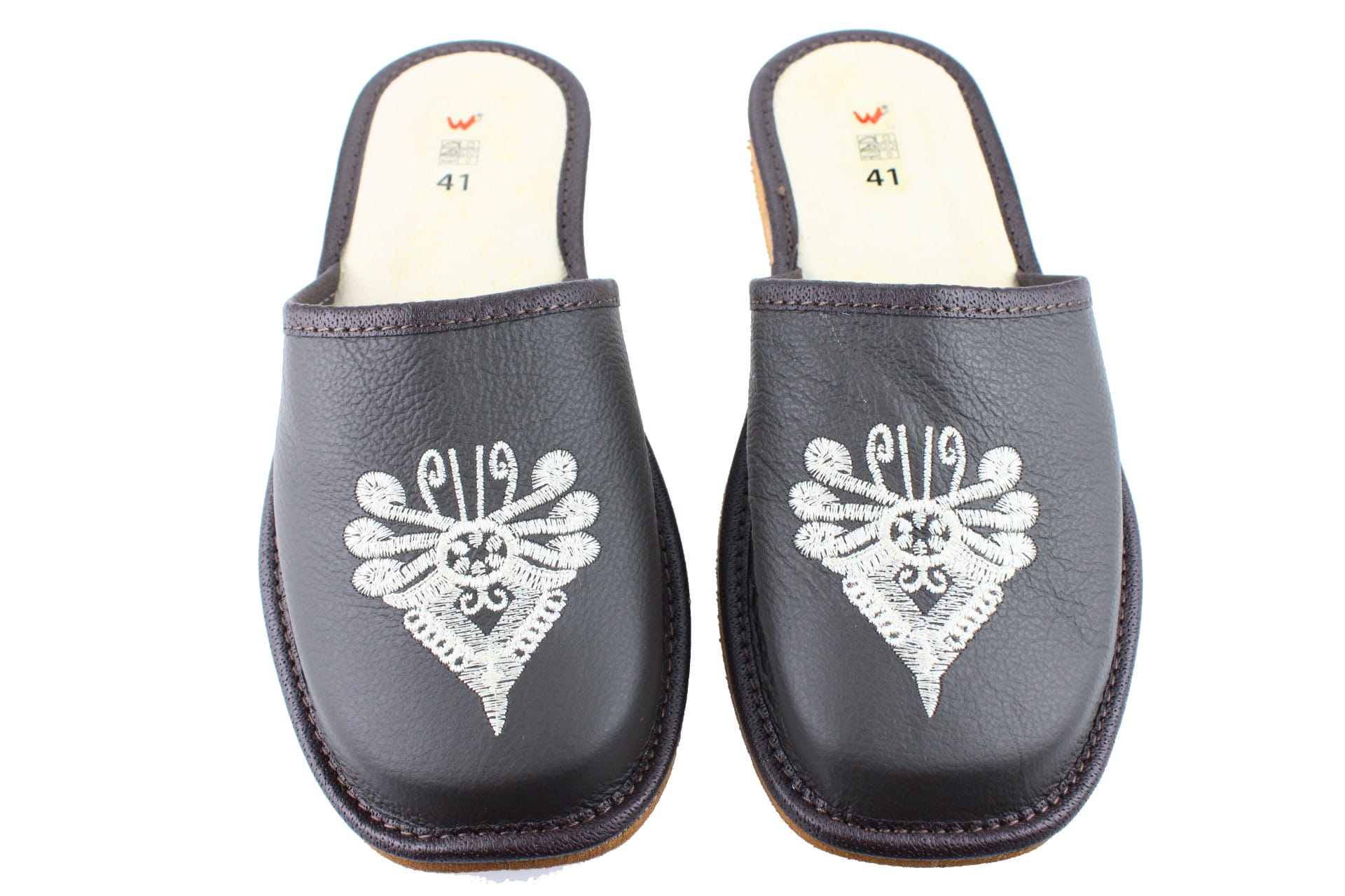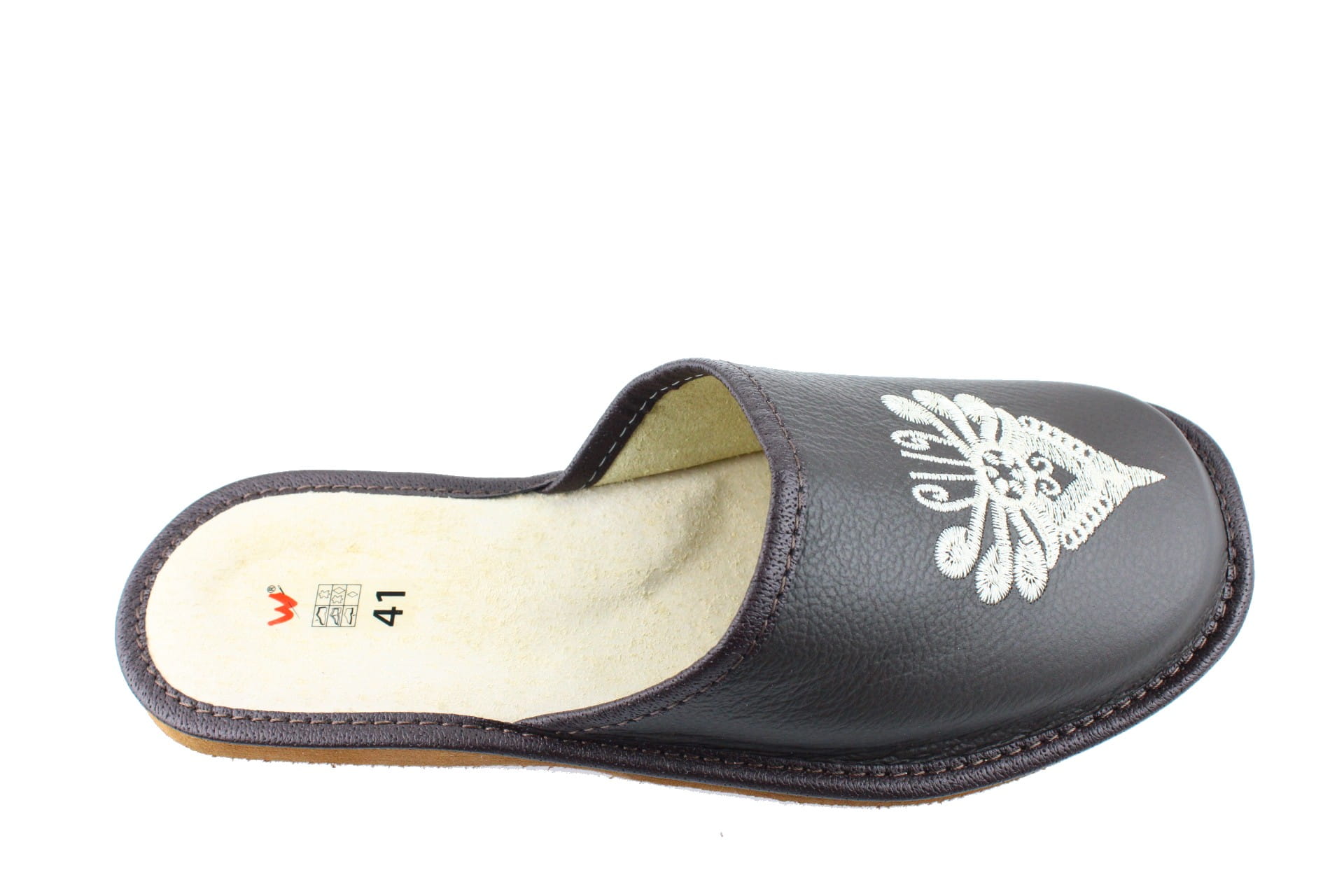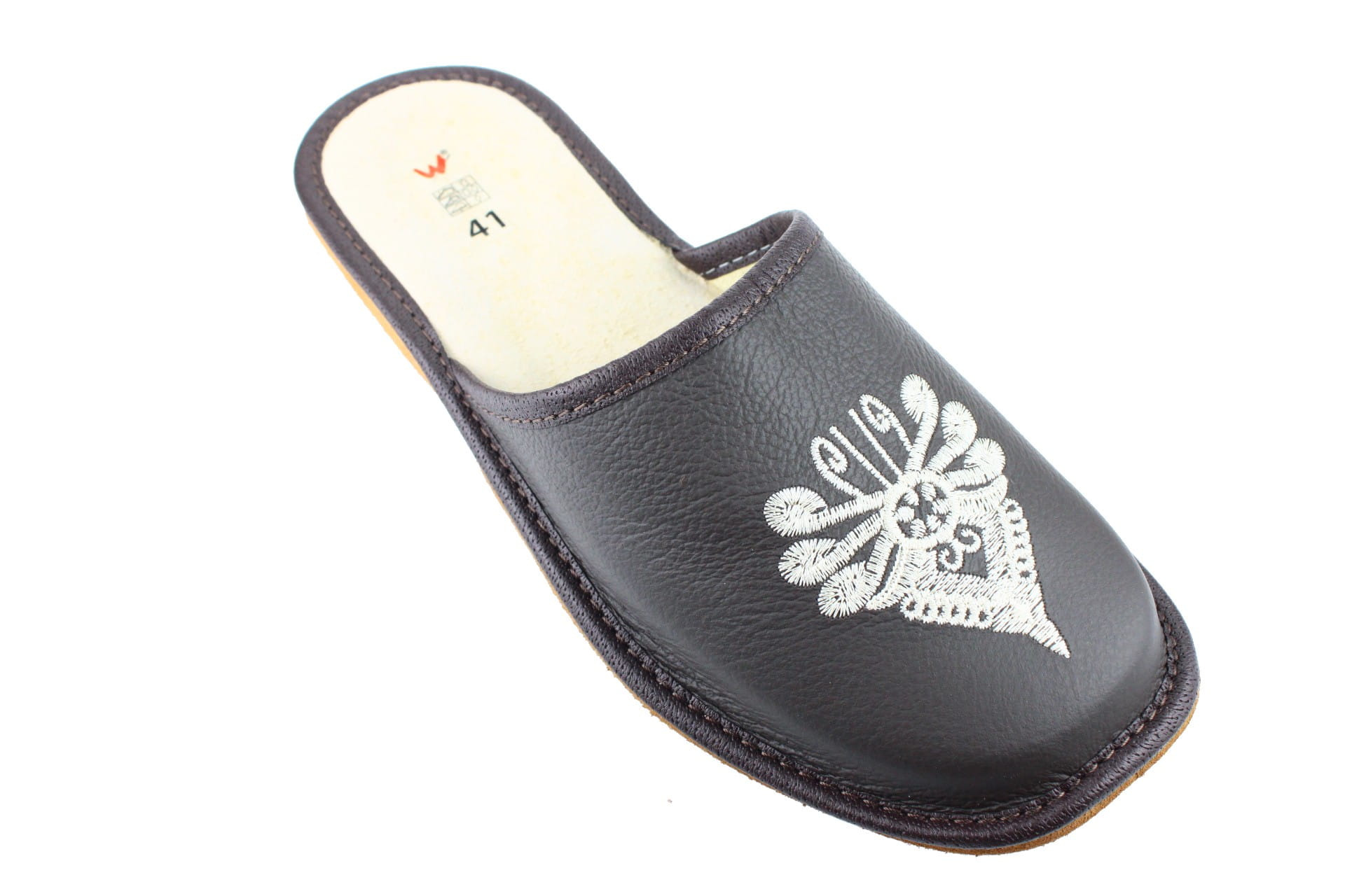 Wykonane z naturalnej skóry w kolorze brązowym. Wkładka skórzana, profilowana. Spód gumowy, antypoślizgowy. Przeznaczone są dla osób, które mają podwyższone przegubie.Są lekkie i wygodne, przeznaczone do użytku domowego. Dzięki temu, że są szerokie, poprawiają komfort chodzenia. Solidne i wytrzymałe.