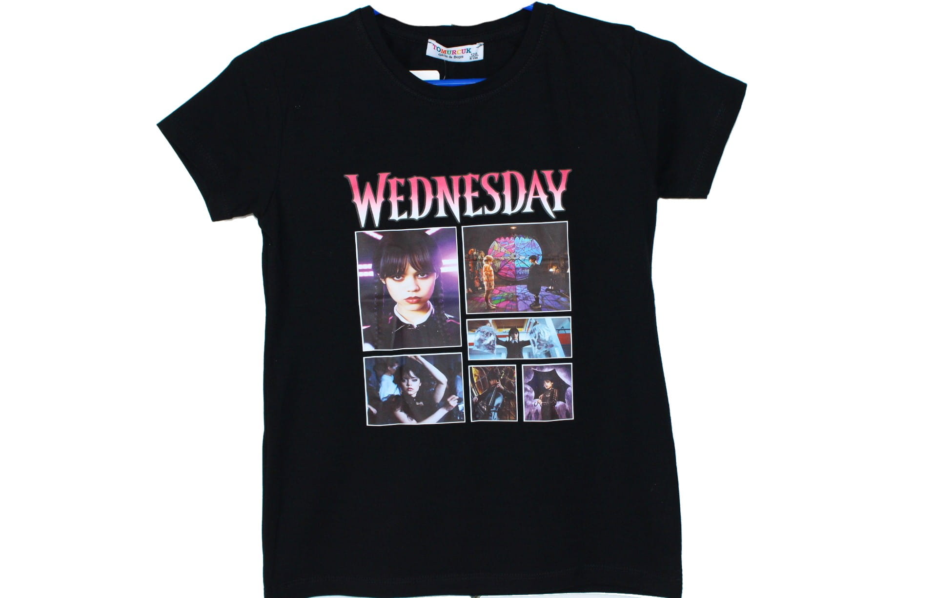 Bluzka z aplikacją Wednesday, bohaterką popularnego serialu.