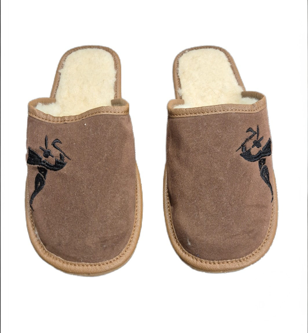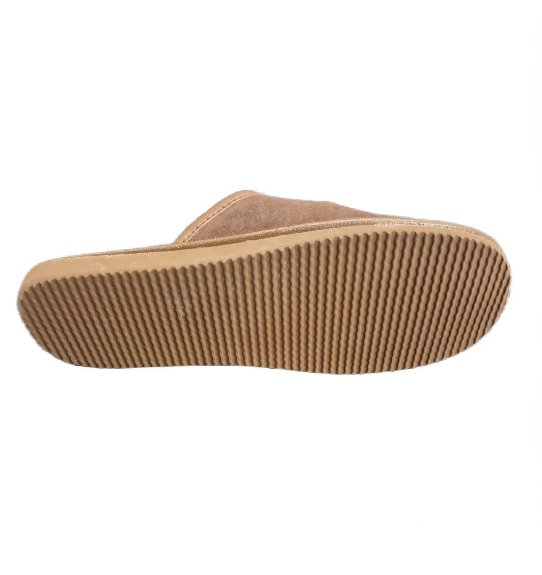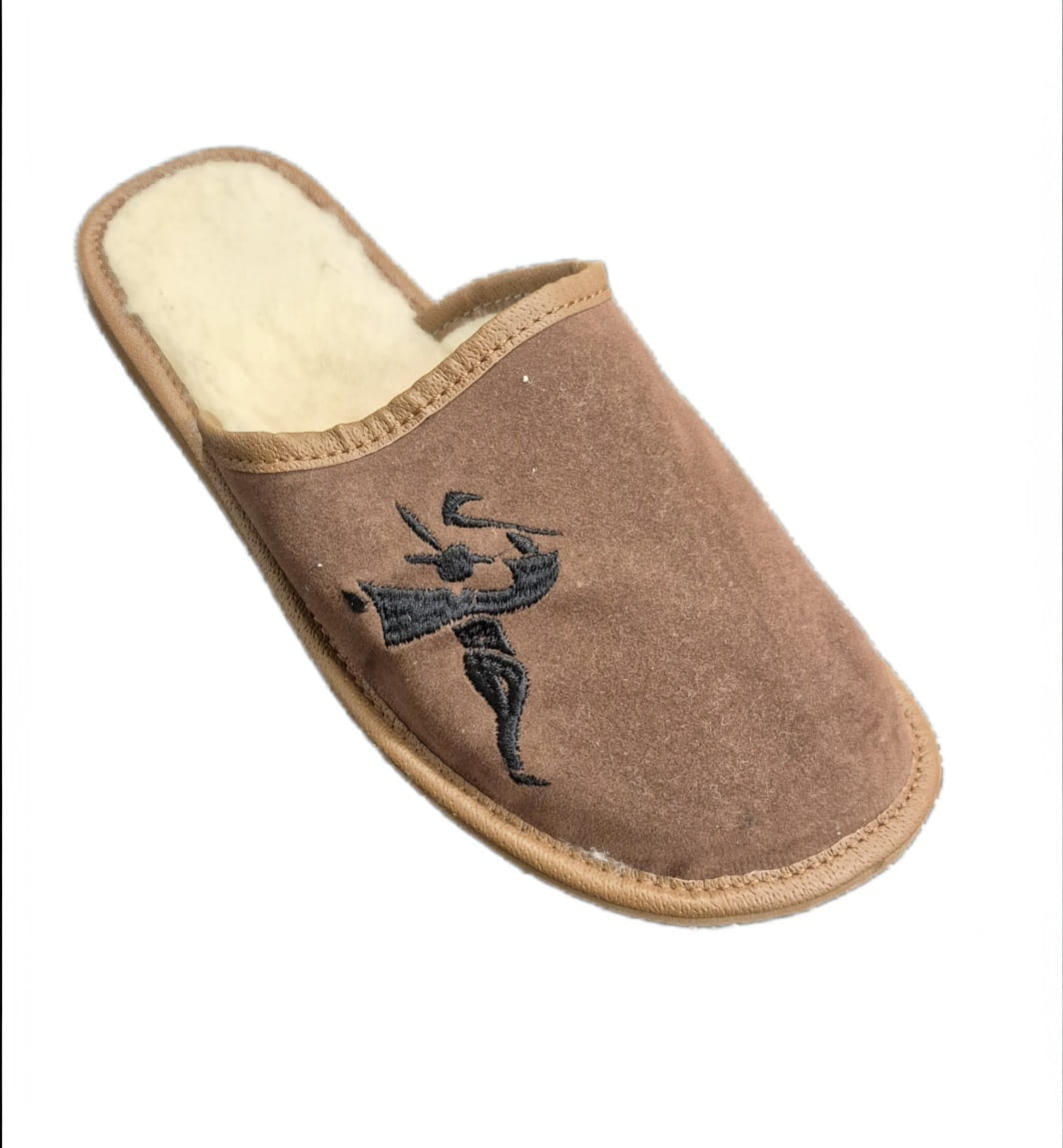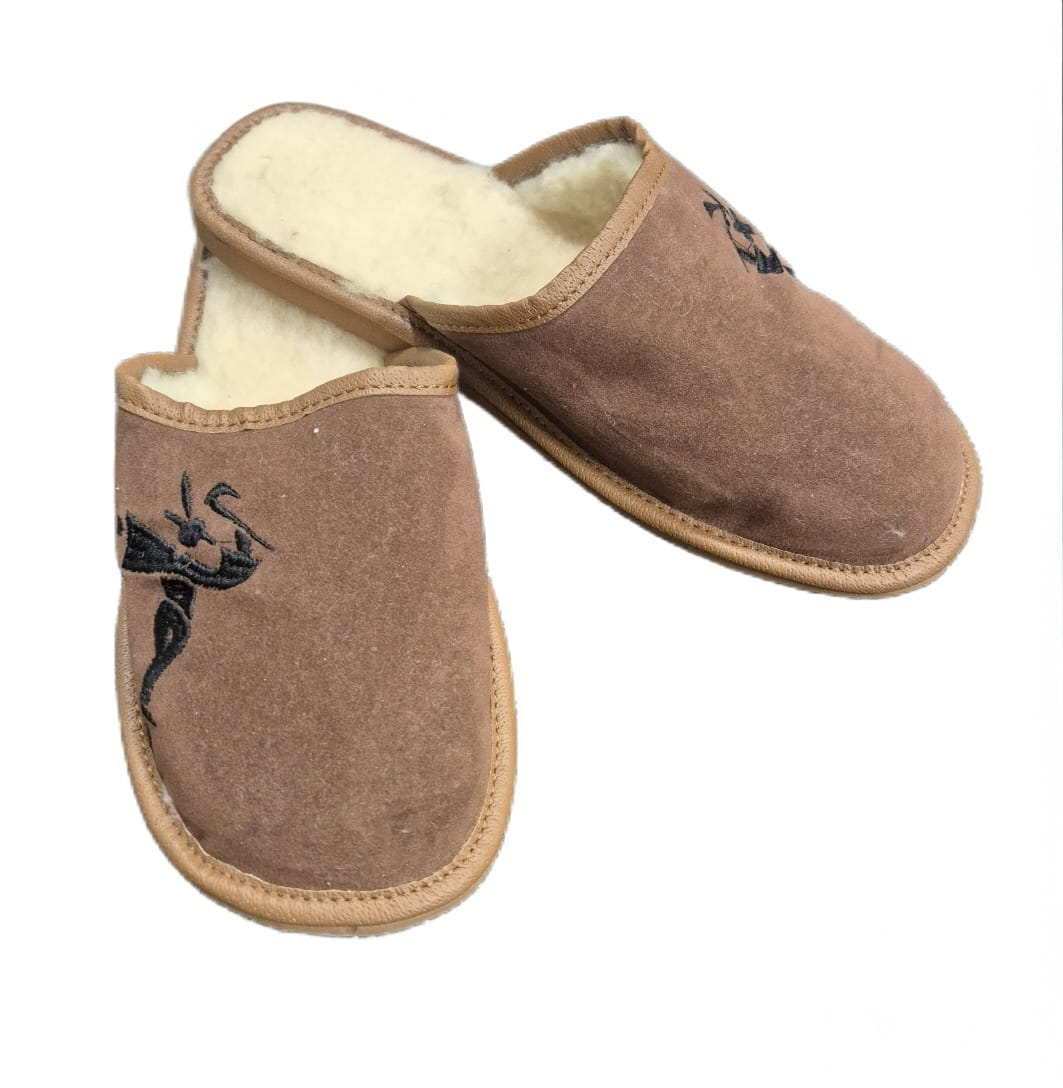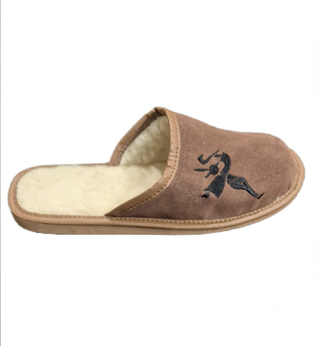 Pantofle męskie, pełne, wykonane ze skóry zamszowej.