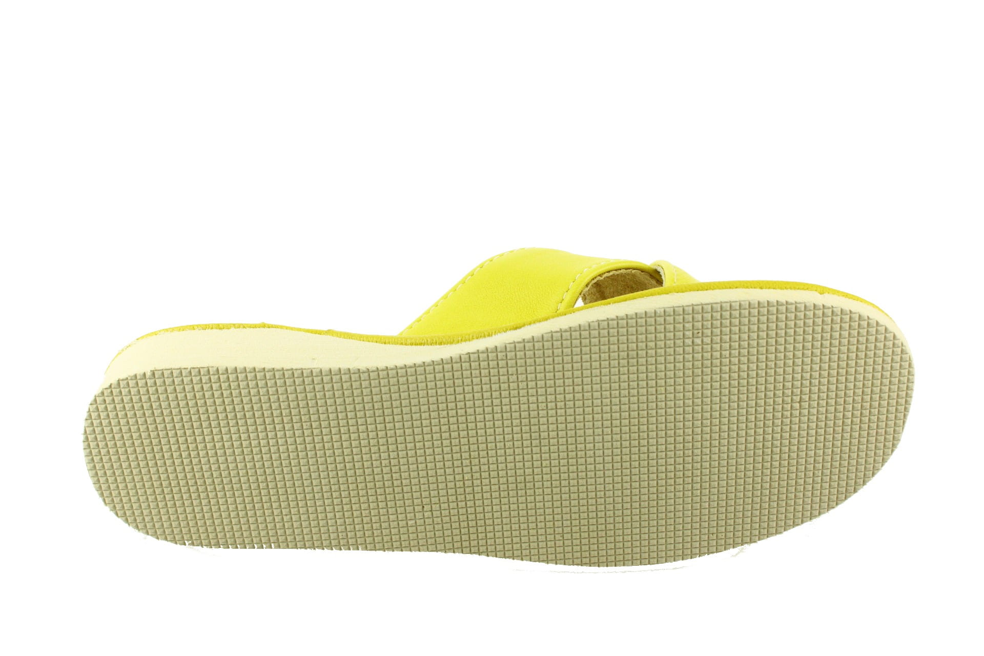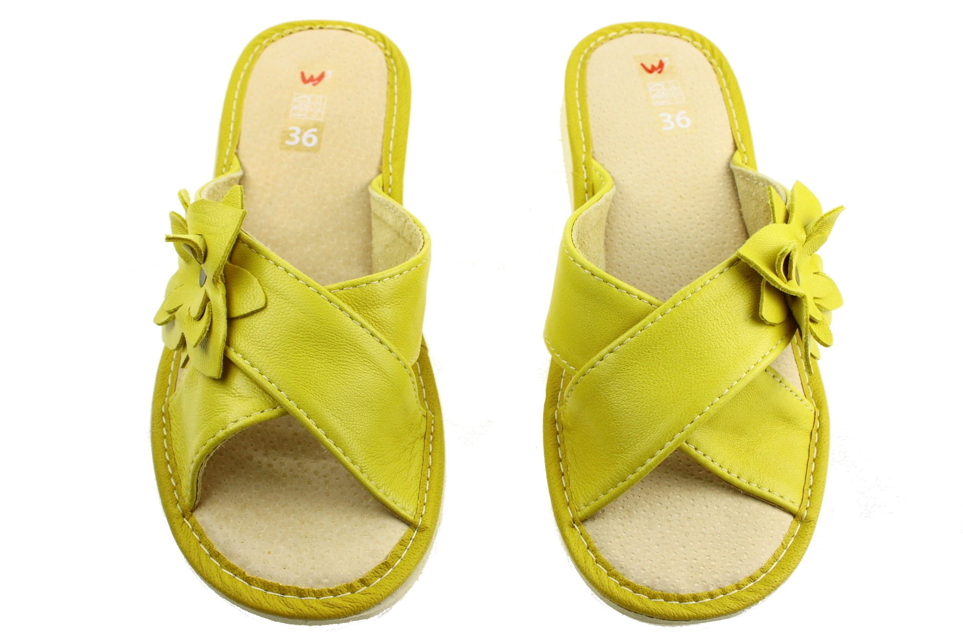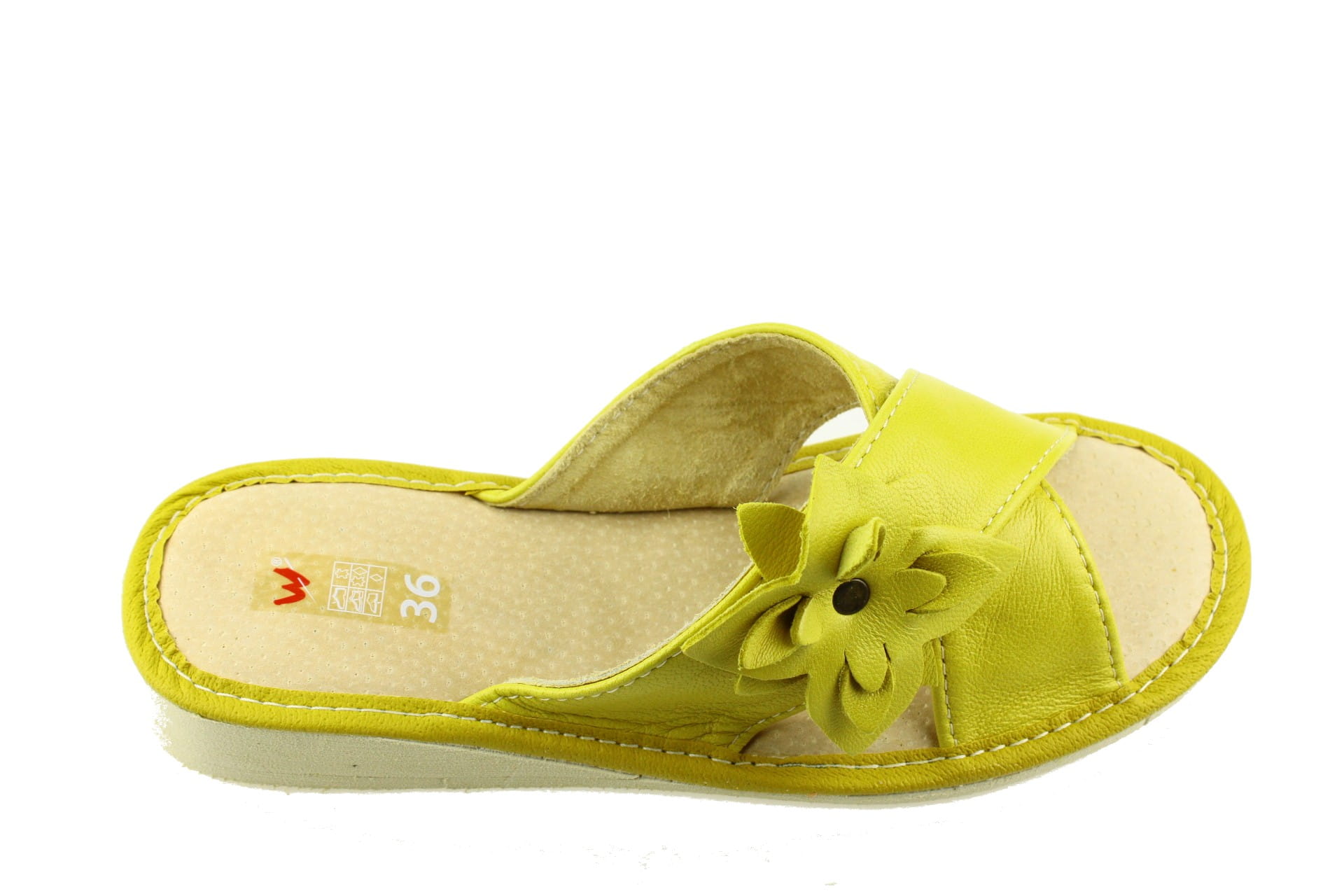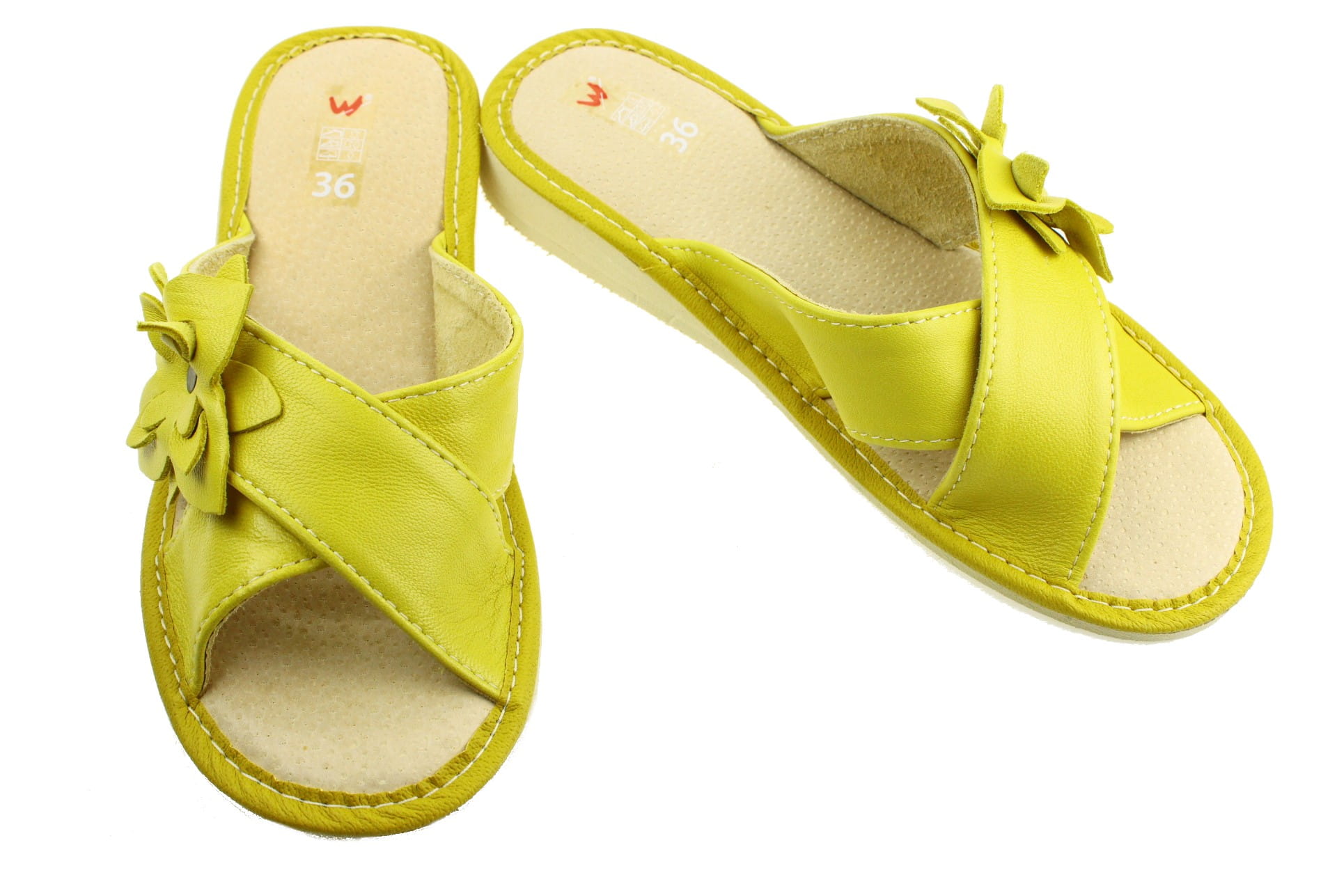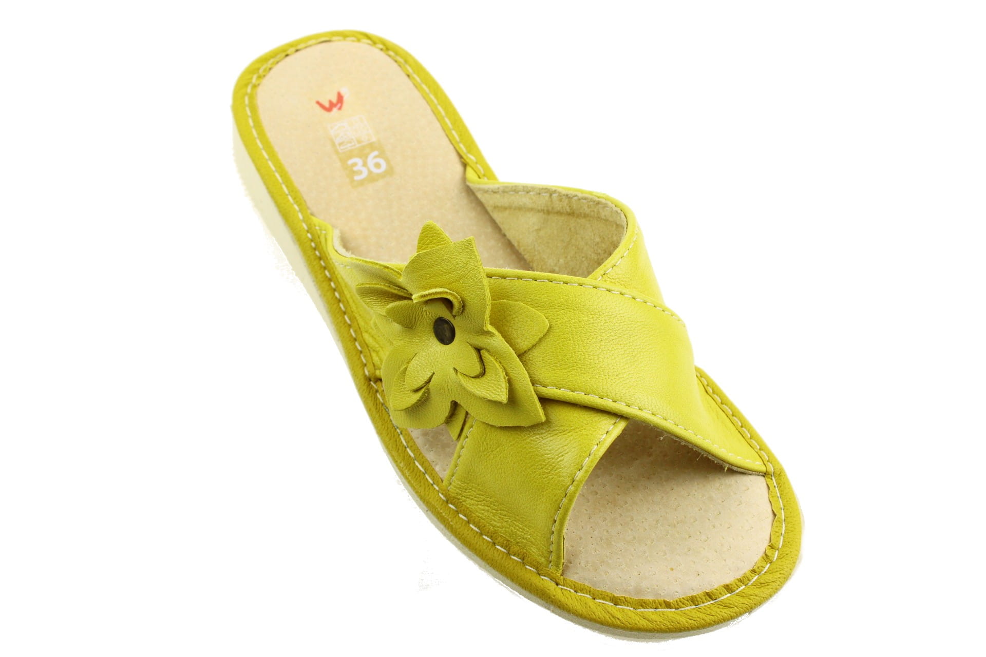 Pantofle damskie z otwartym palcem (b/p=bez palcy), wykonane z naturalnej skóry.