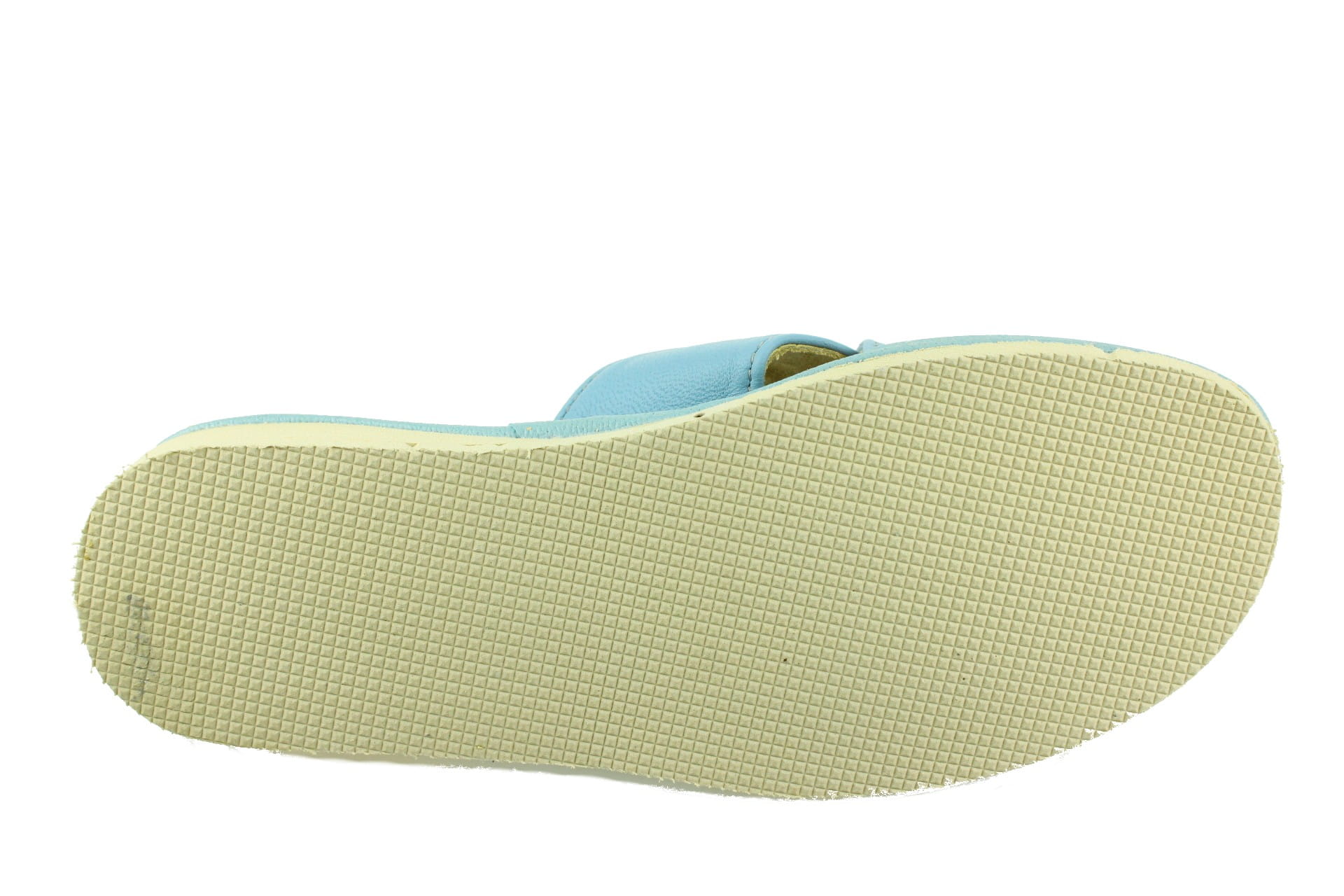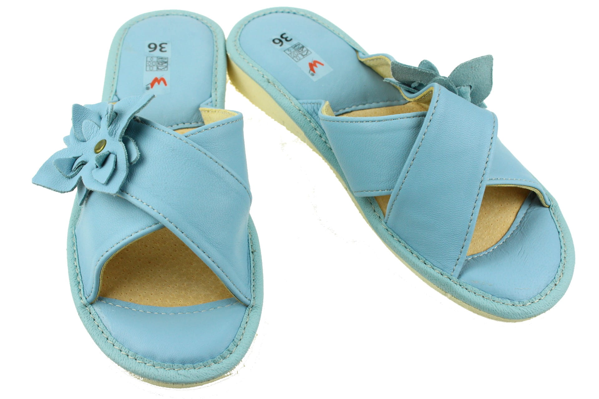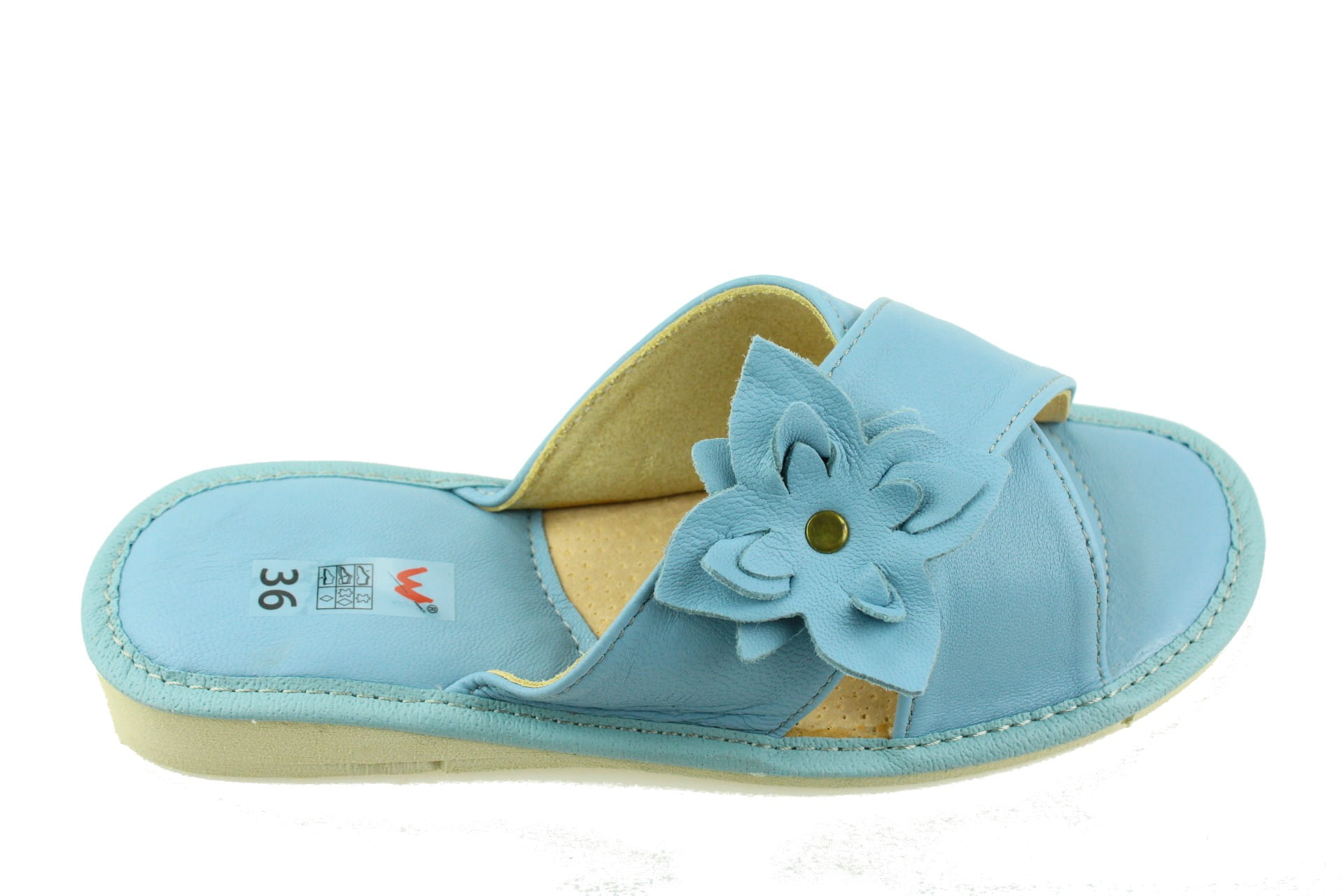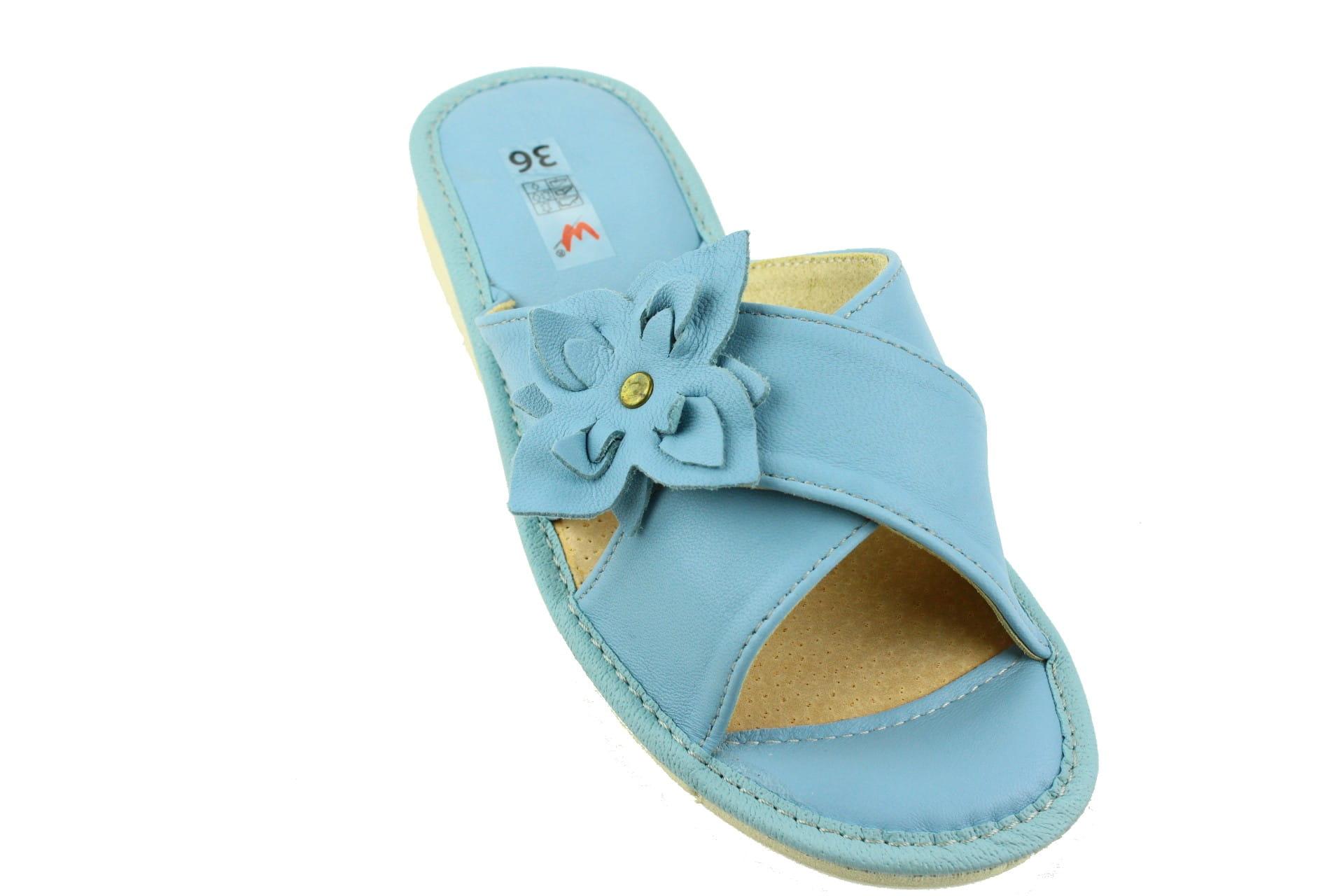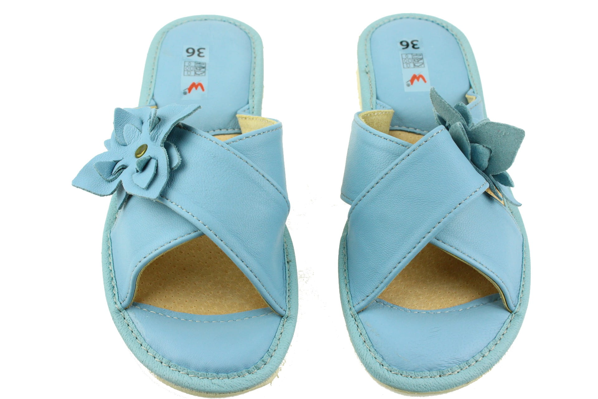 Pantofle damskie z otwartym palcem (b/p=bez palcy), wykonane z naturalnej skóry.