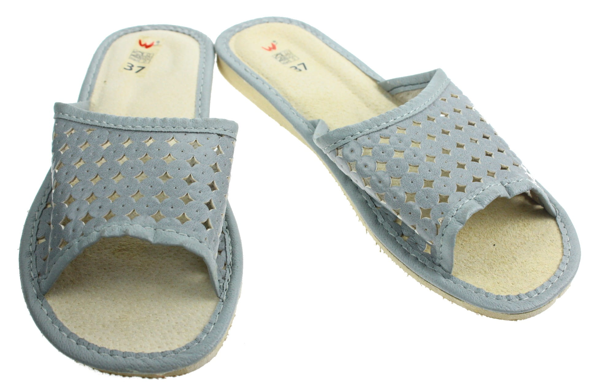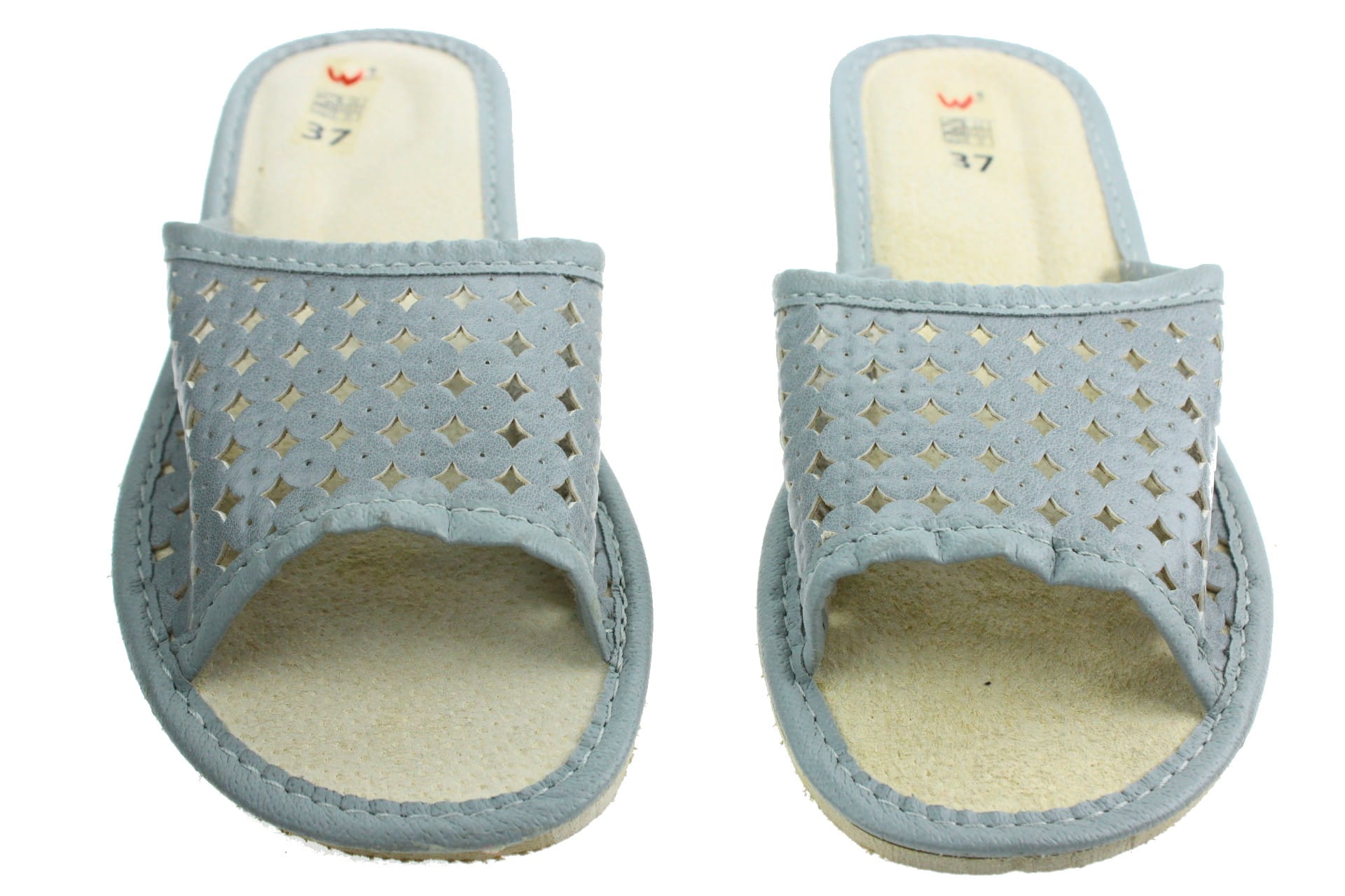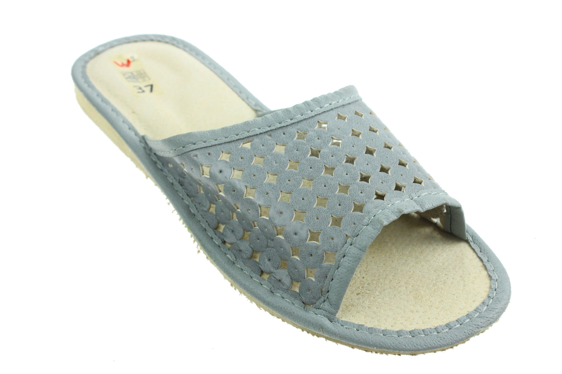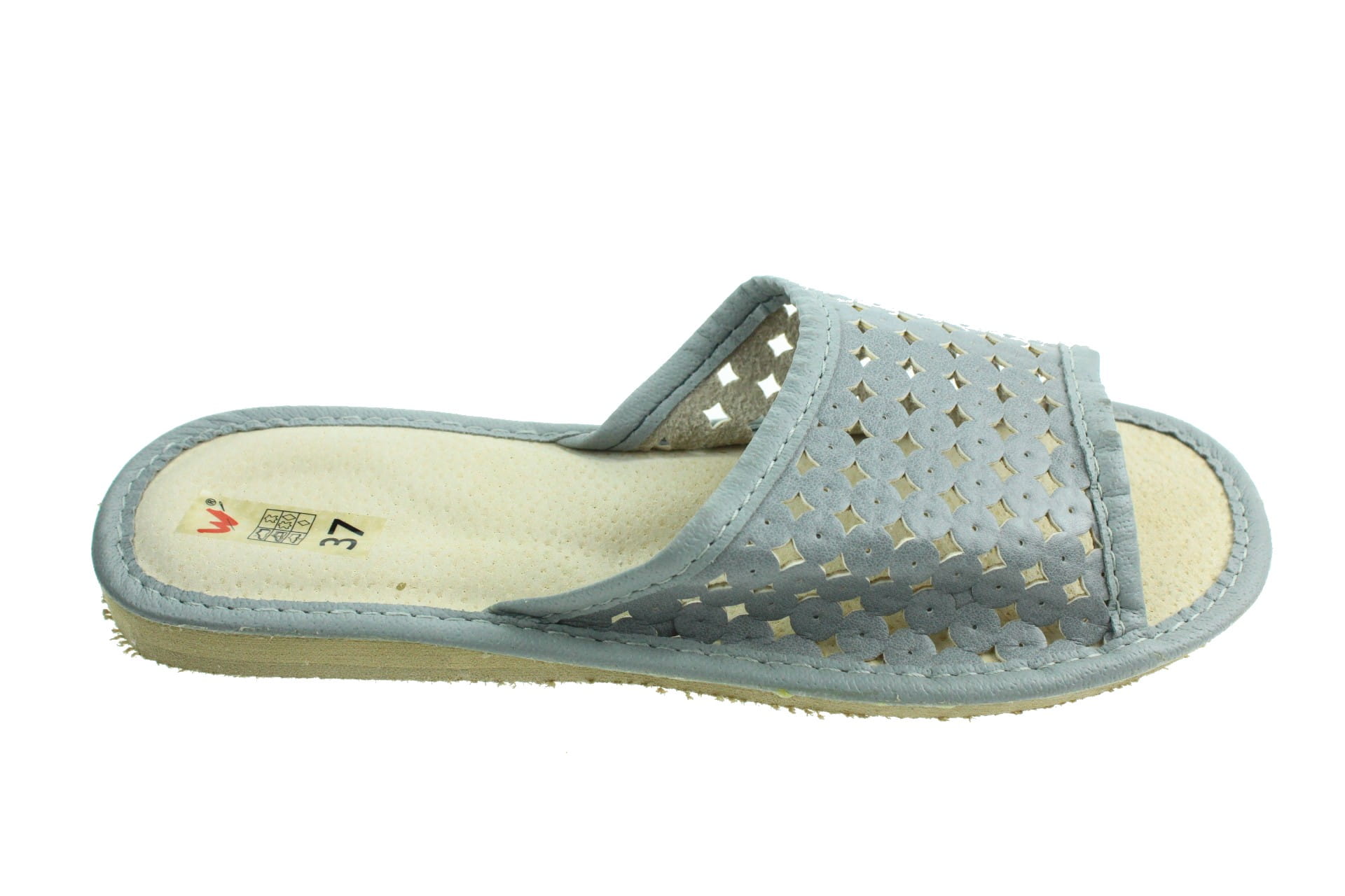 Pantofle damskie z otwartym palcem (b/p=bez palcy), wykonane z naturalnej skóry. Spód gumowy, antypoślizgowy. Klin o wysokości 1 cm. Wkładka skórzana, profilowana, ortopedyczna, dostosowuje się do kształtu stopy, co daje pewność jej prawidłowego ułożenia i przez to maksymalne poczucie komfortu. Dzięki temu nogi nie męczą się, a stawy nie są narażone na dodatkowe obciążenie. Prezentowany model posiada na wierzchu wytłaczane wzorki. Lekkie i wygodne, przeznaczone do użytku domowego.