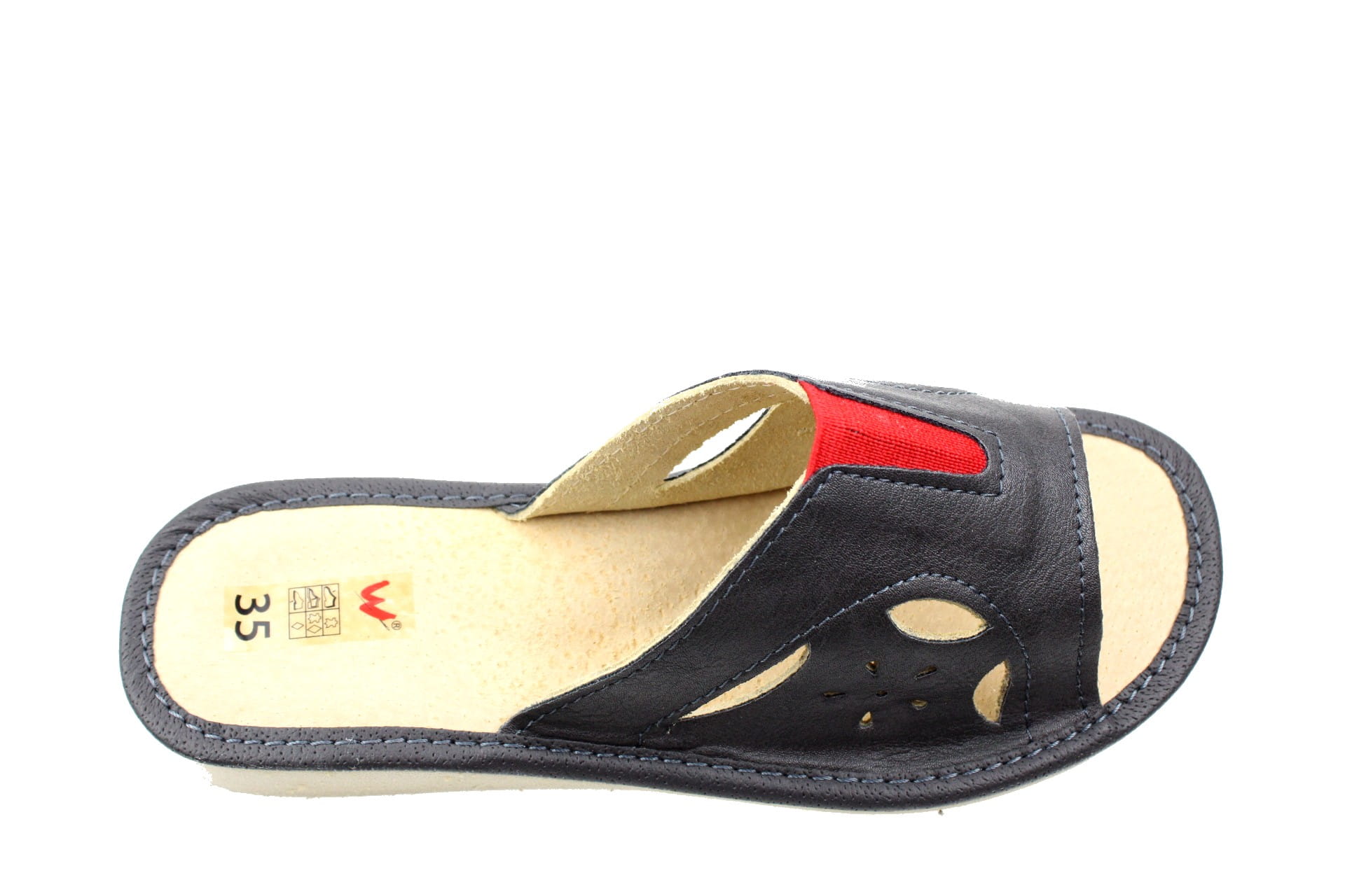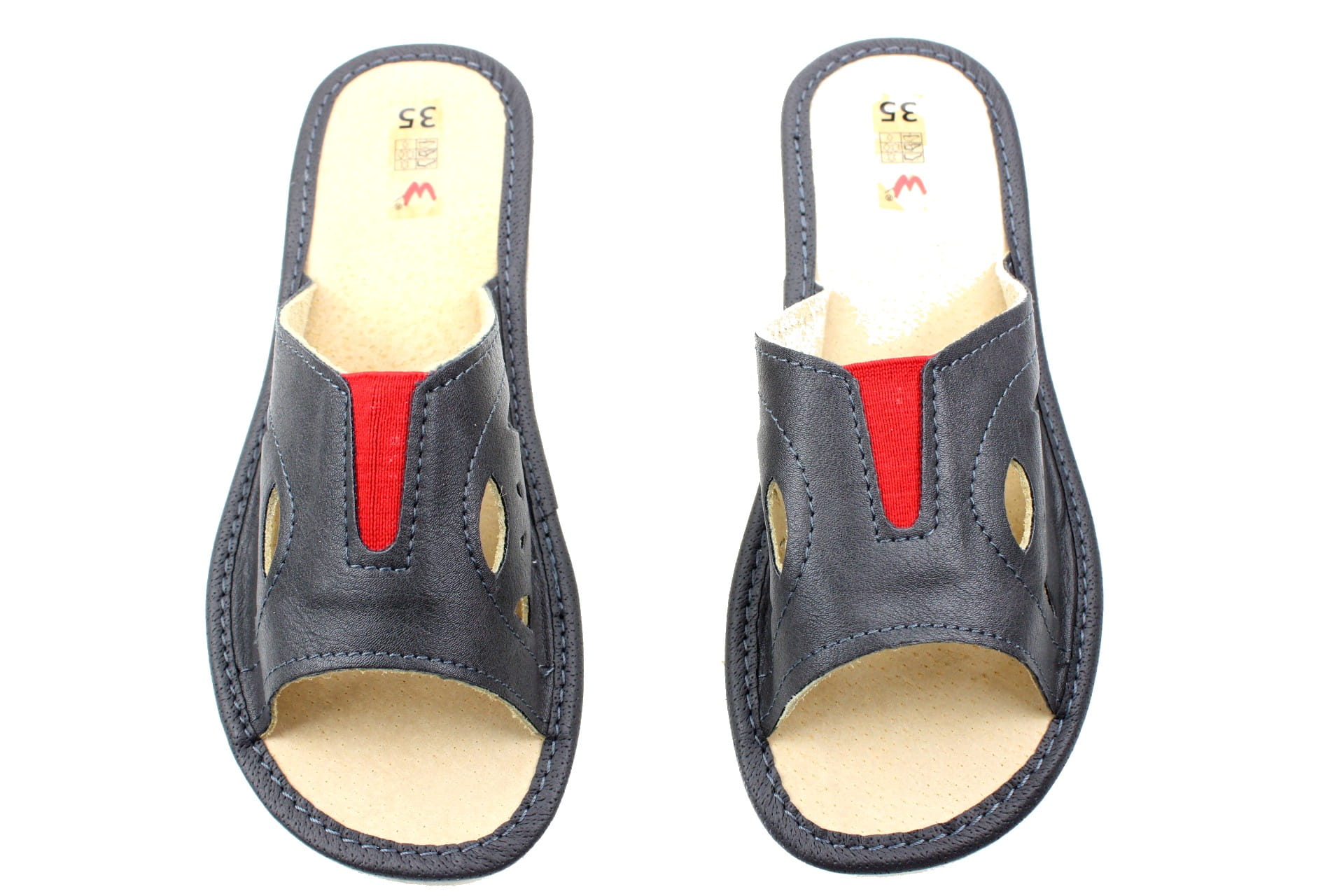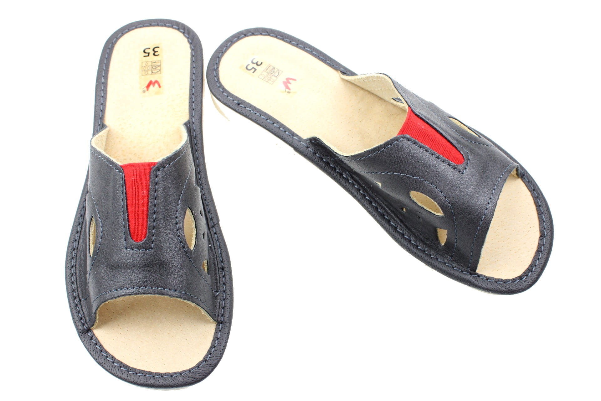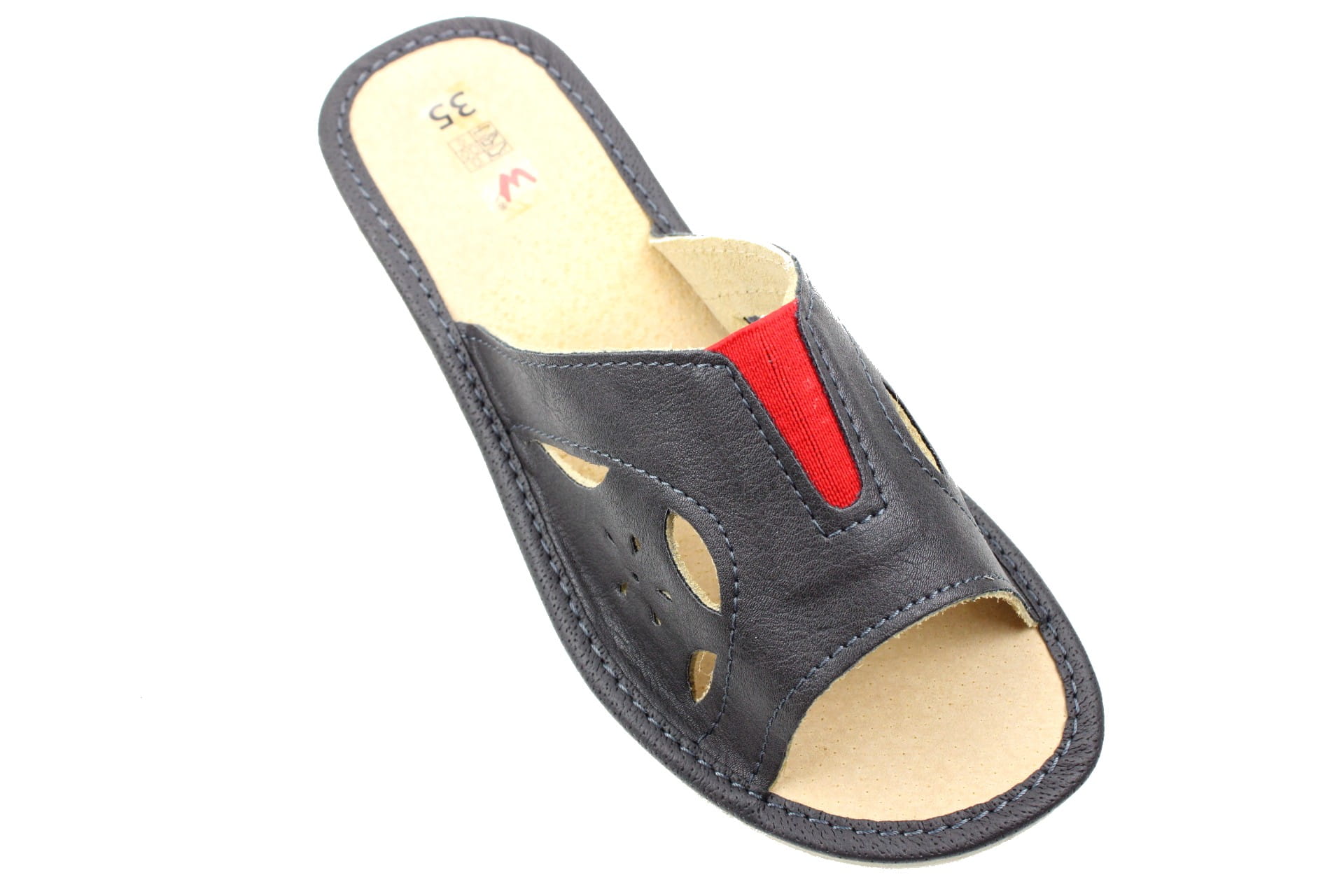 Pantofle damskie z otwartym palcem (b/p=bez palcy), wykonane z naturalnej skóry.