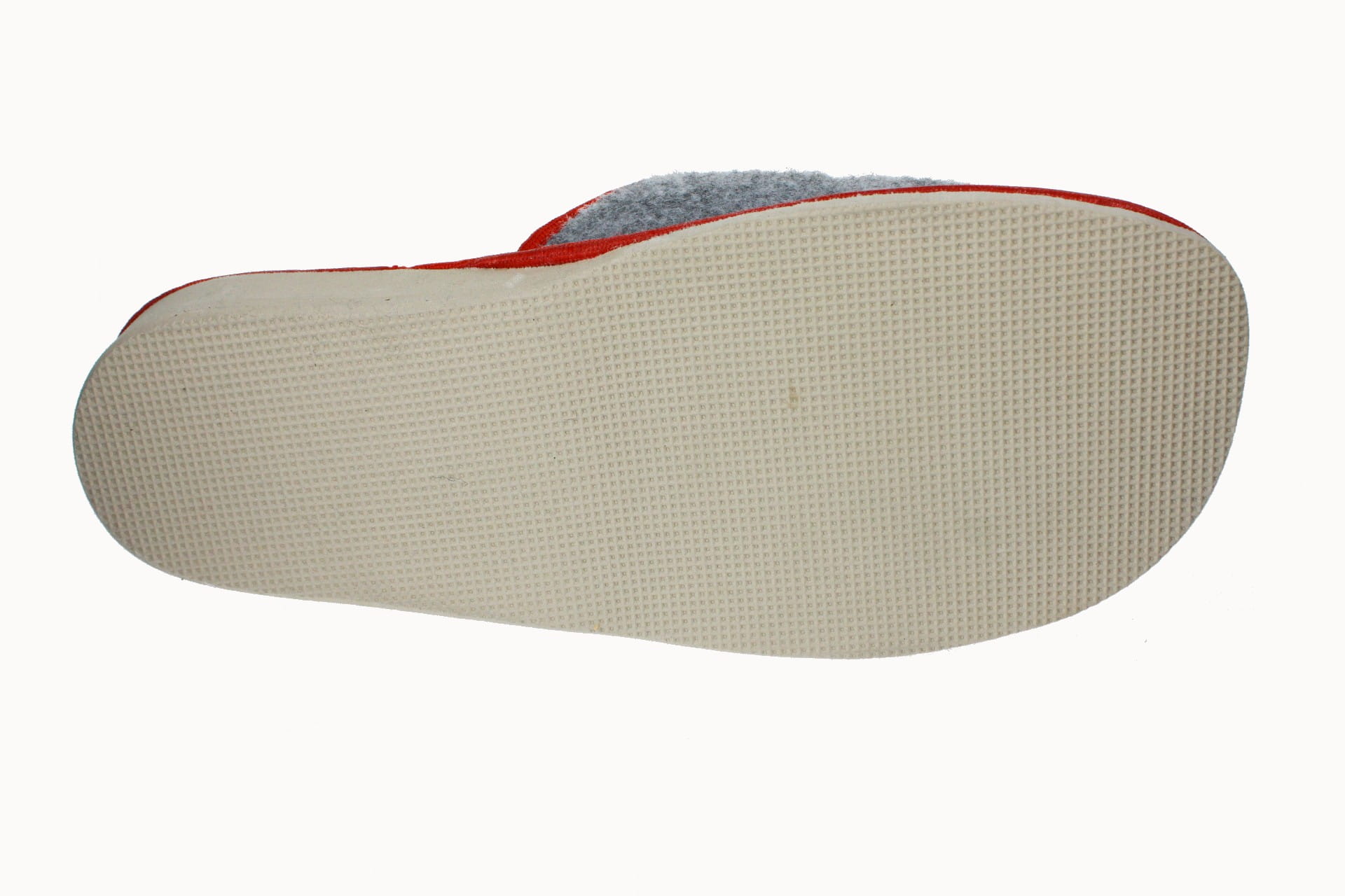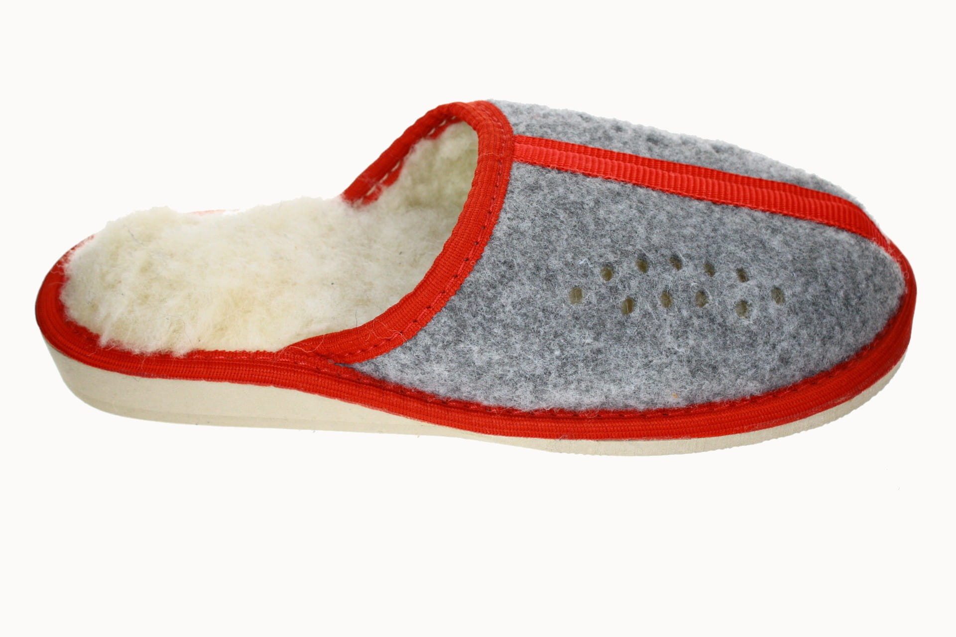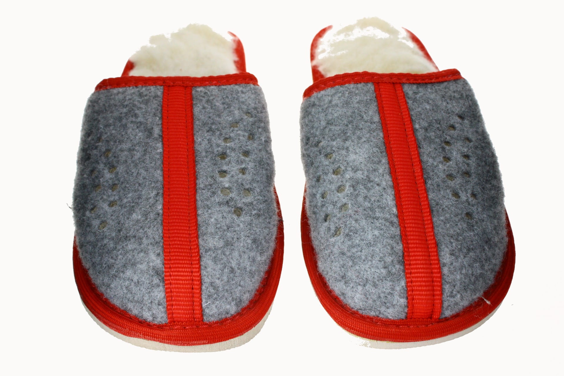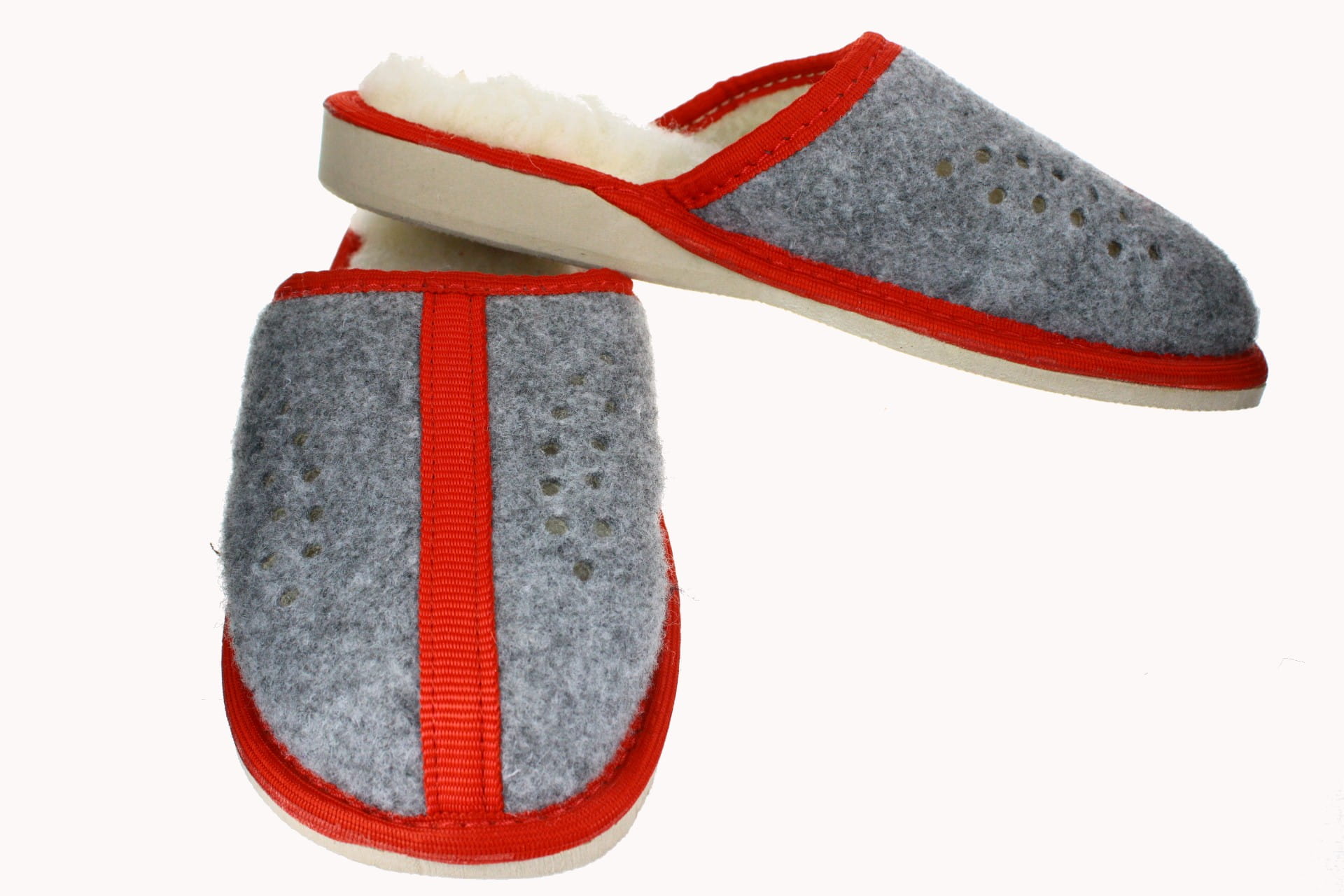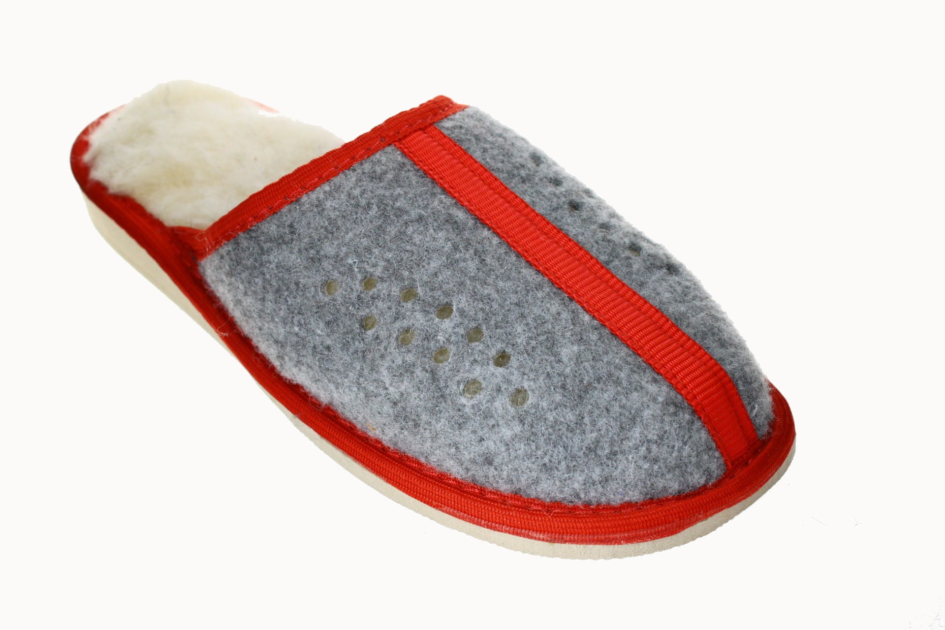 Pantofle damskie, pełne, wykonane z naturalnego filcu. Cholewka od wewnątrz i wkładka wyściełane naturalną, owczą wełną, która pozwala utrzymać stałą temperaturę ciała nie powodując przy tym zwiększenia potliwości skóry. Wykończenie lamówką. Podeszwa gumowa, antypoślizgowa. Laczki są bardzo lekkie, ciepłe i wygodne. Przeznaczone do użytku domowego.