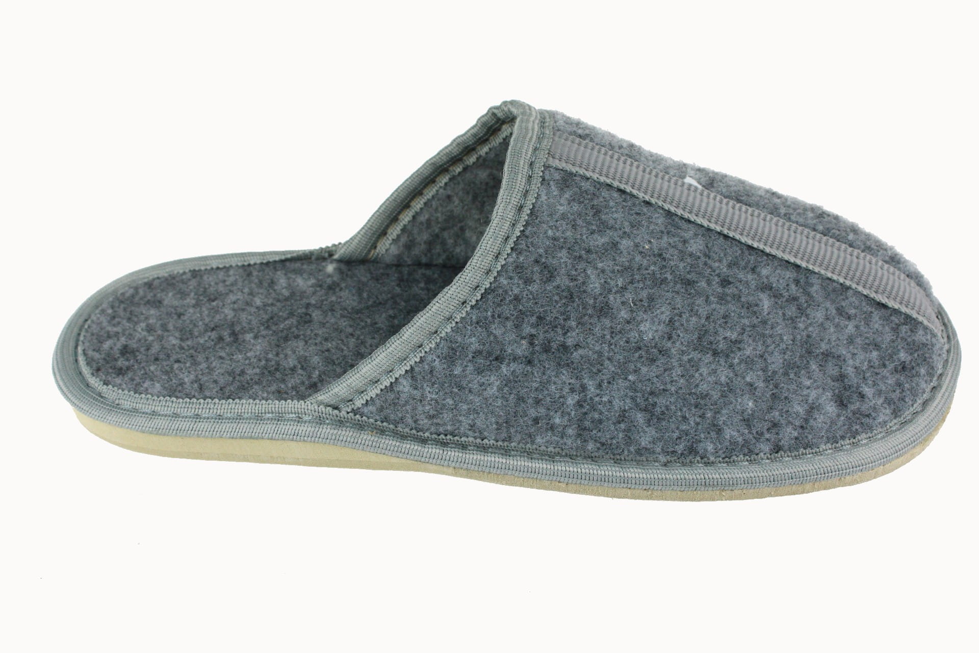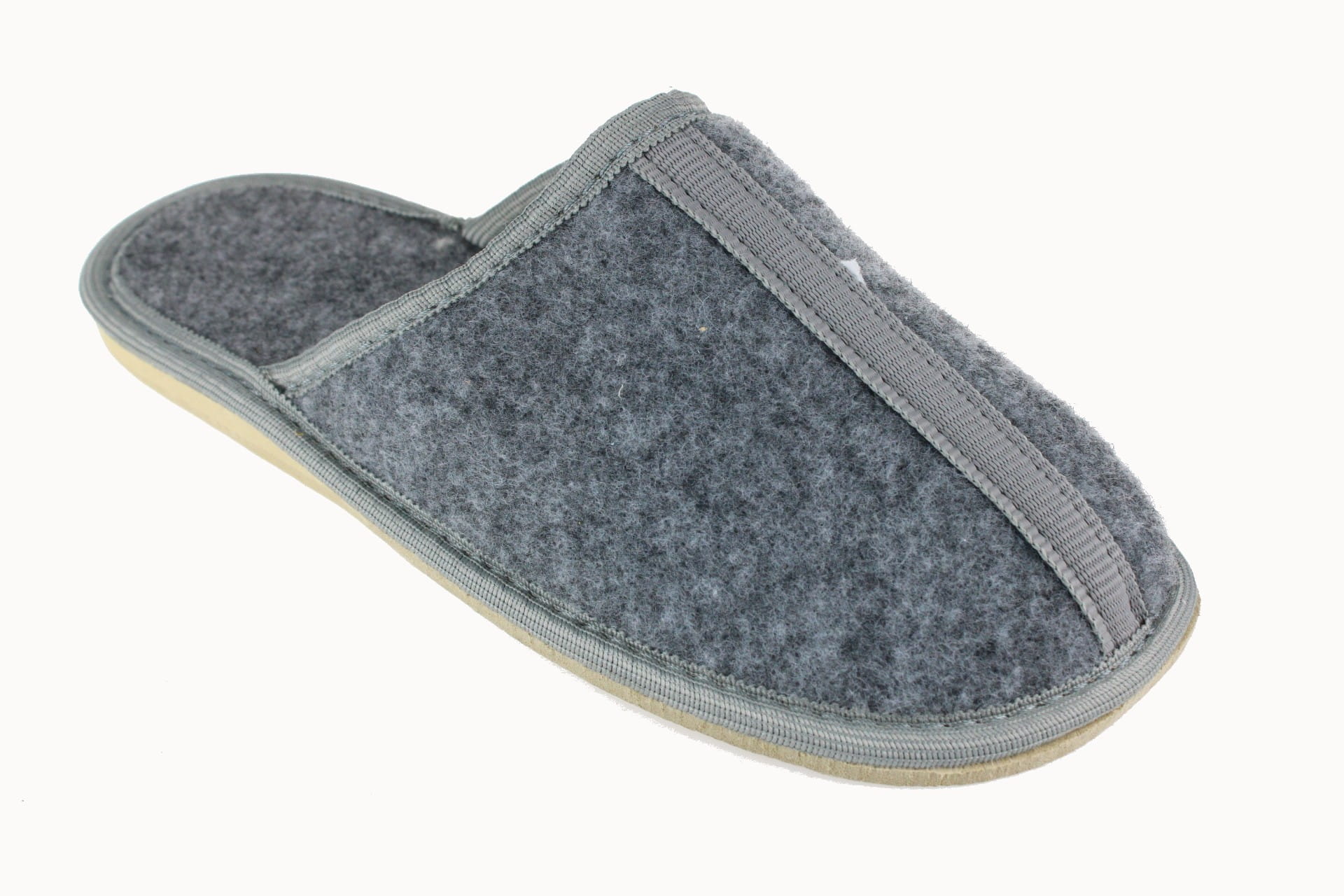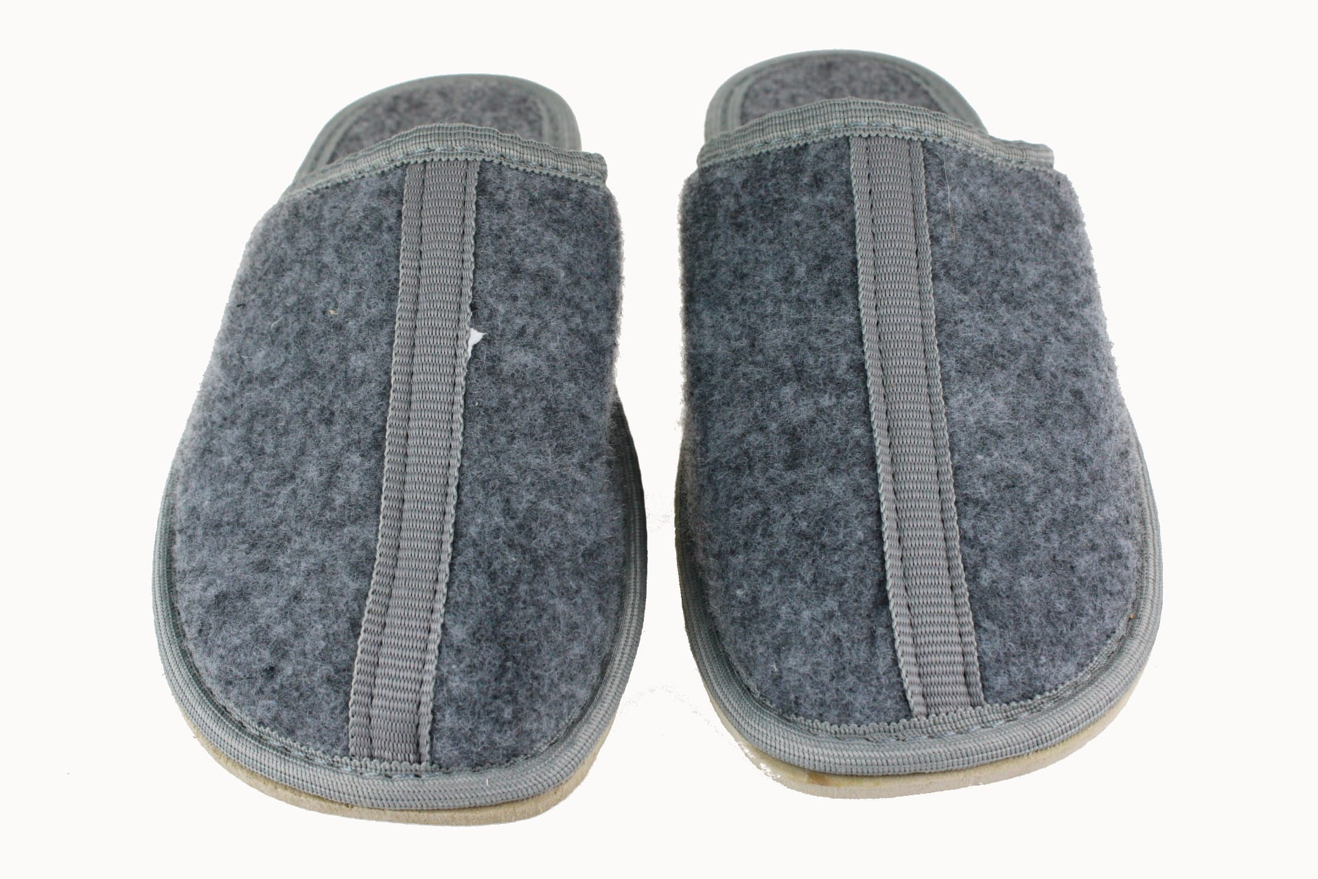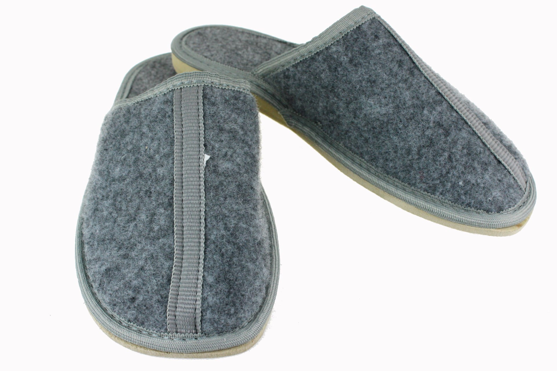 Pantofle damskie, pełne, wykonane z naturalnego filcu. Wykończenie lamówką. Podeszwa gumowa, antypoślizgowa. Laczki są bardzo lekkie, ciepłe i wygodne. Przeznaczone do użytku domowego.Klin 1cm