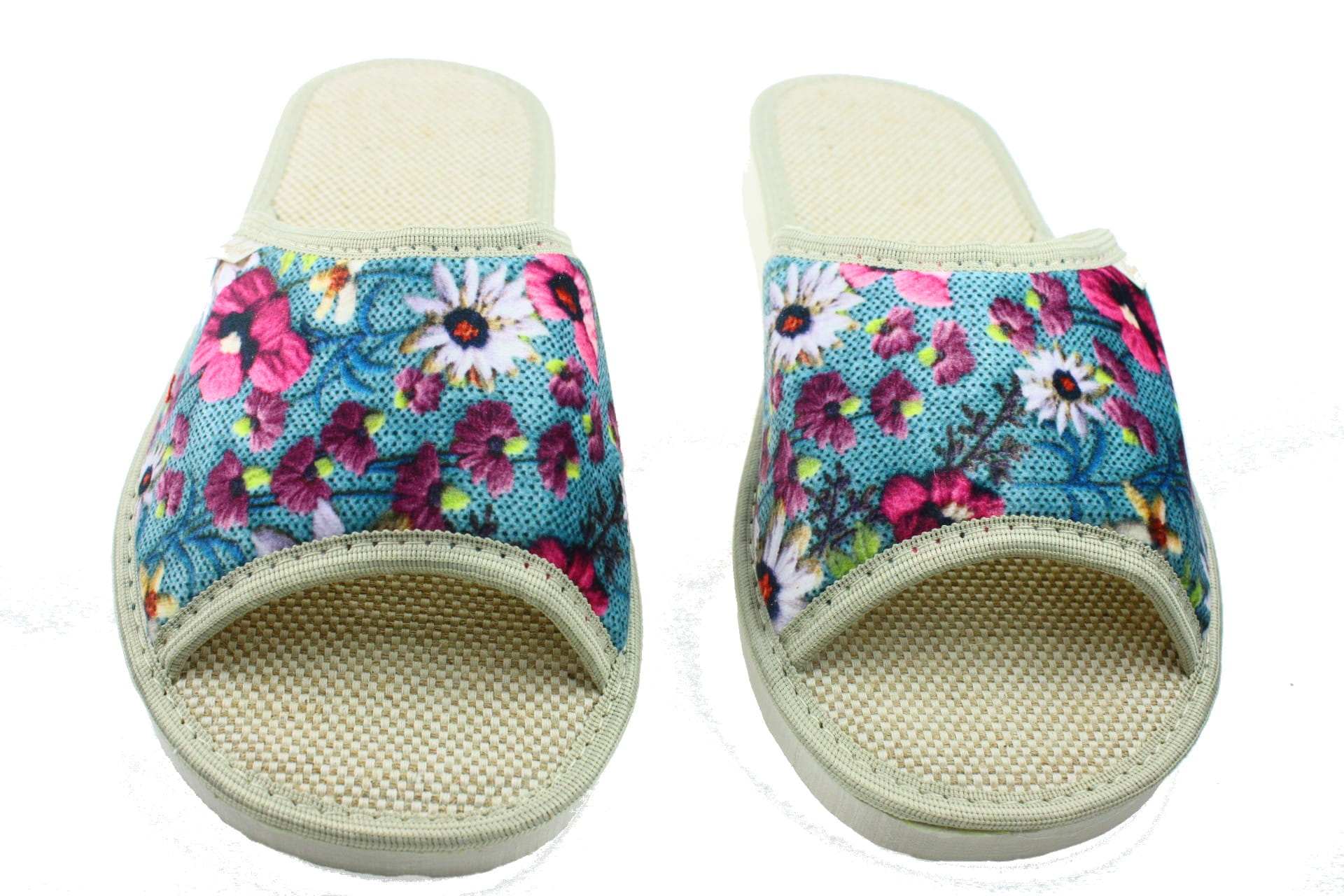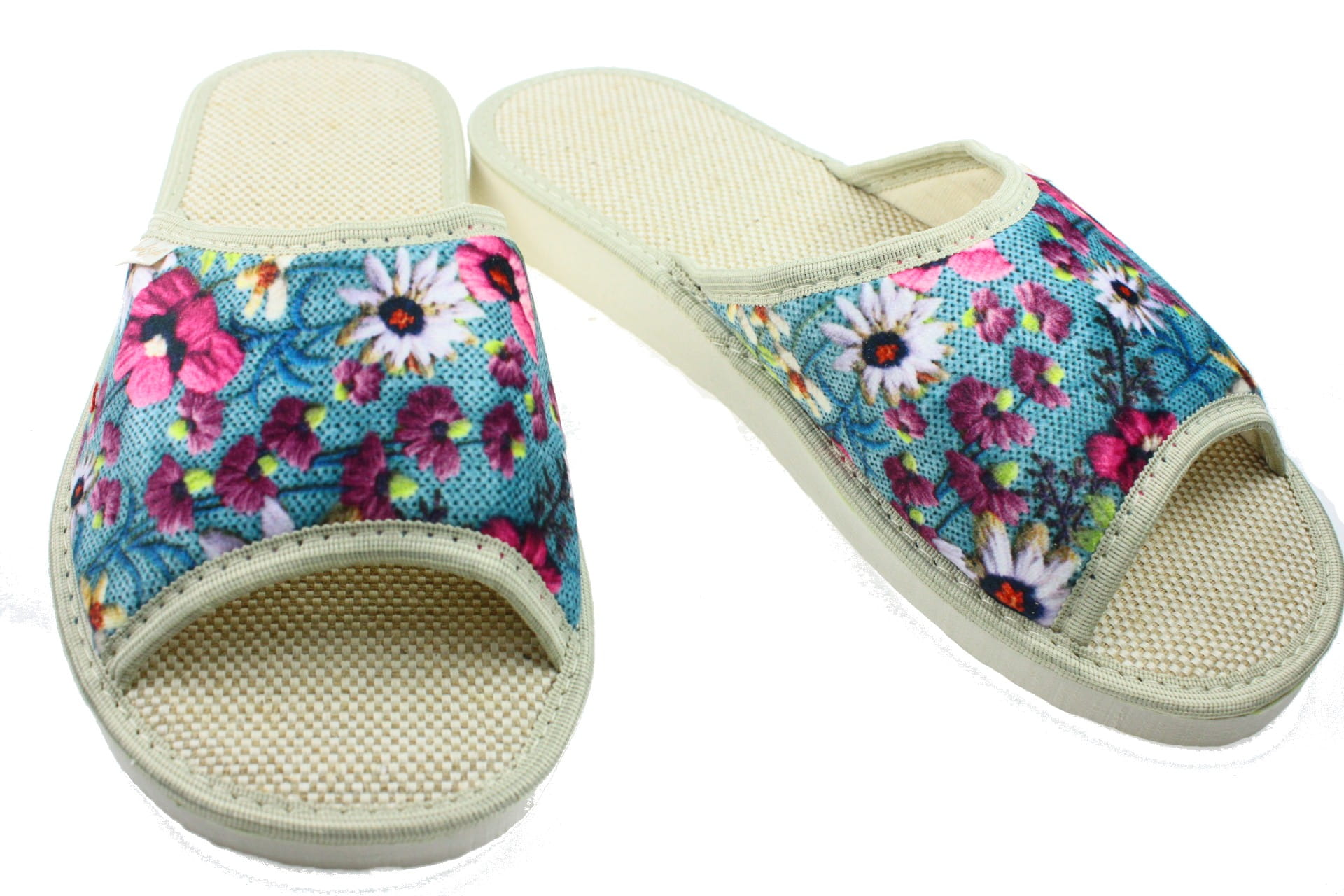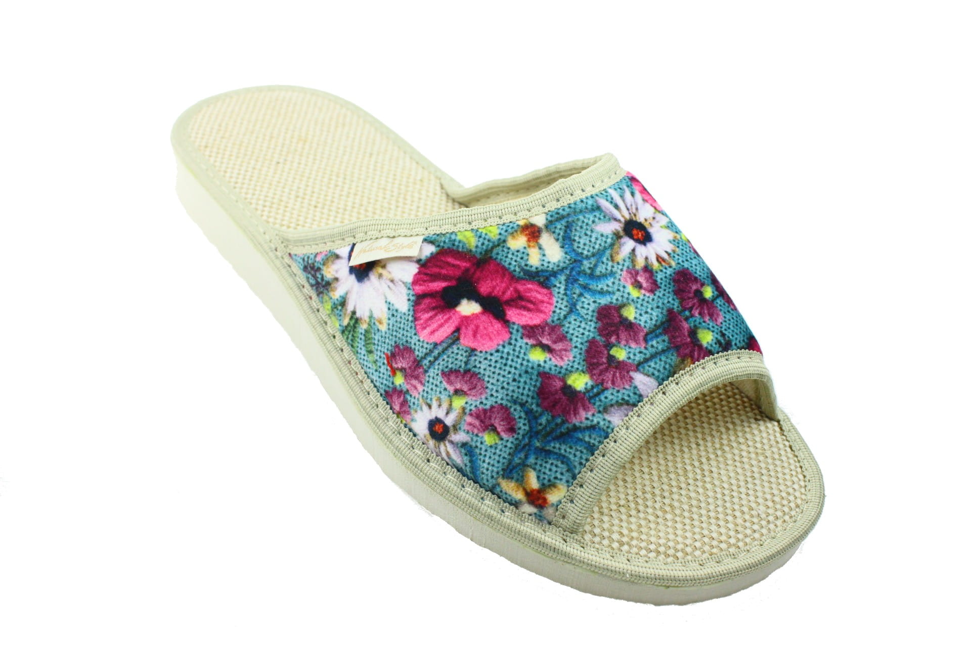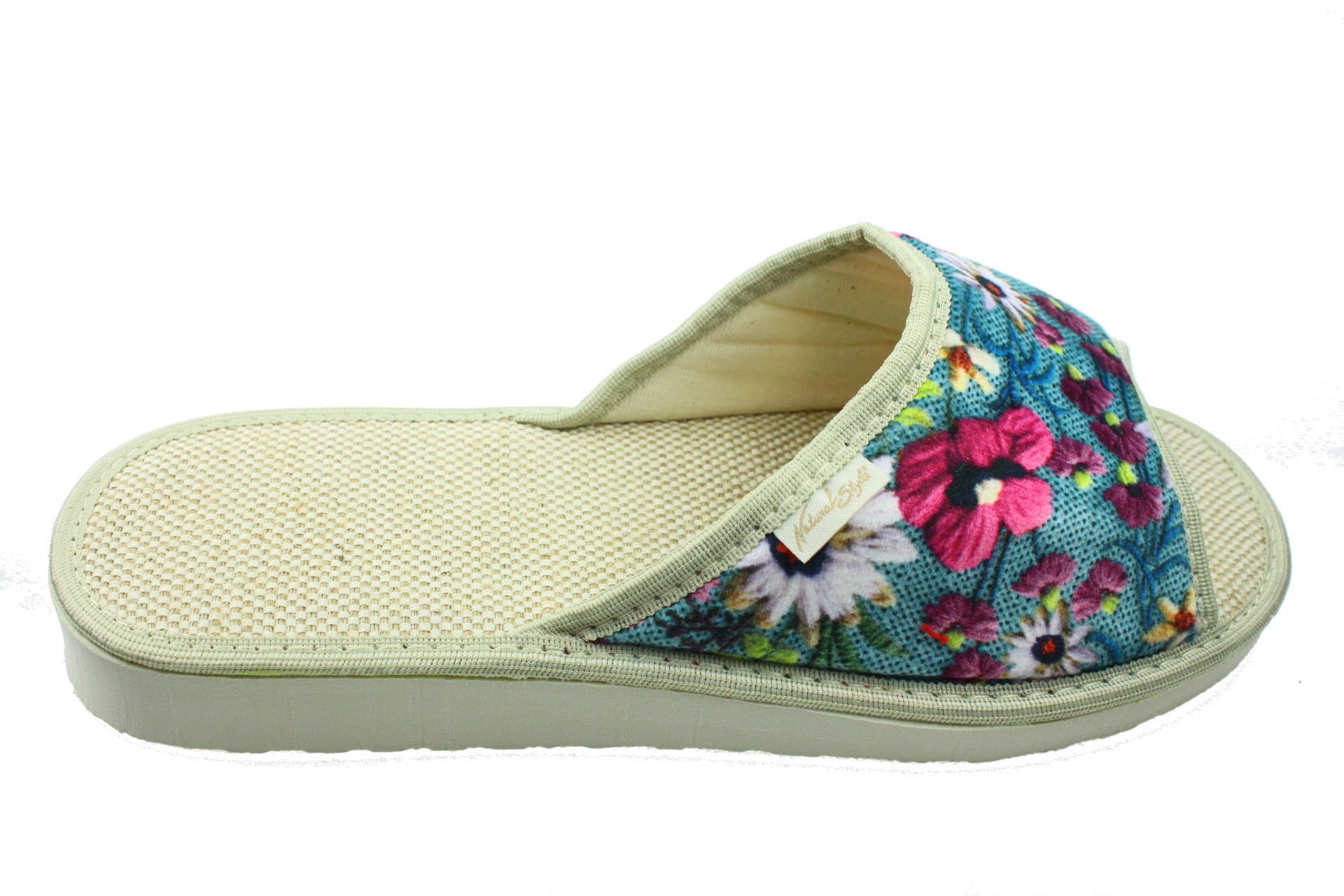 Laczki damskie otwarte, cholewka i wkładka wykonane z tkaniny bawełnianej , dzięki, której stopy oddychają i nie pocą się. Spód piankowy - EVA, bardzo lekkie i wygodne, klin o wysokości 2 cm, przeznaczone do użytku domowego.