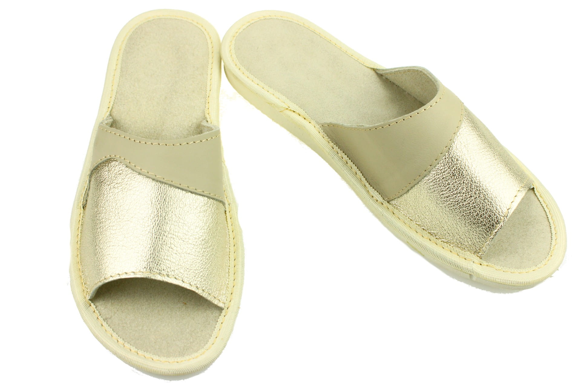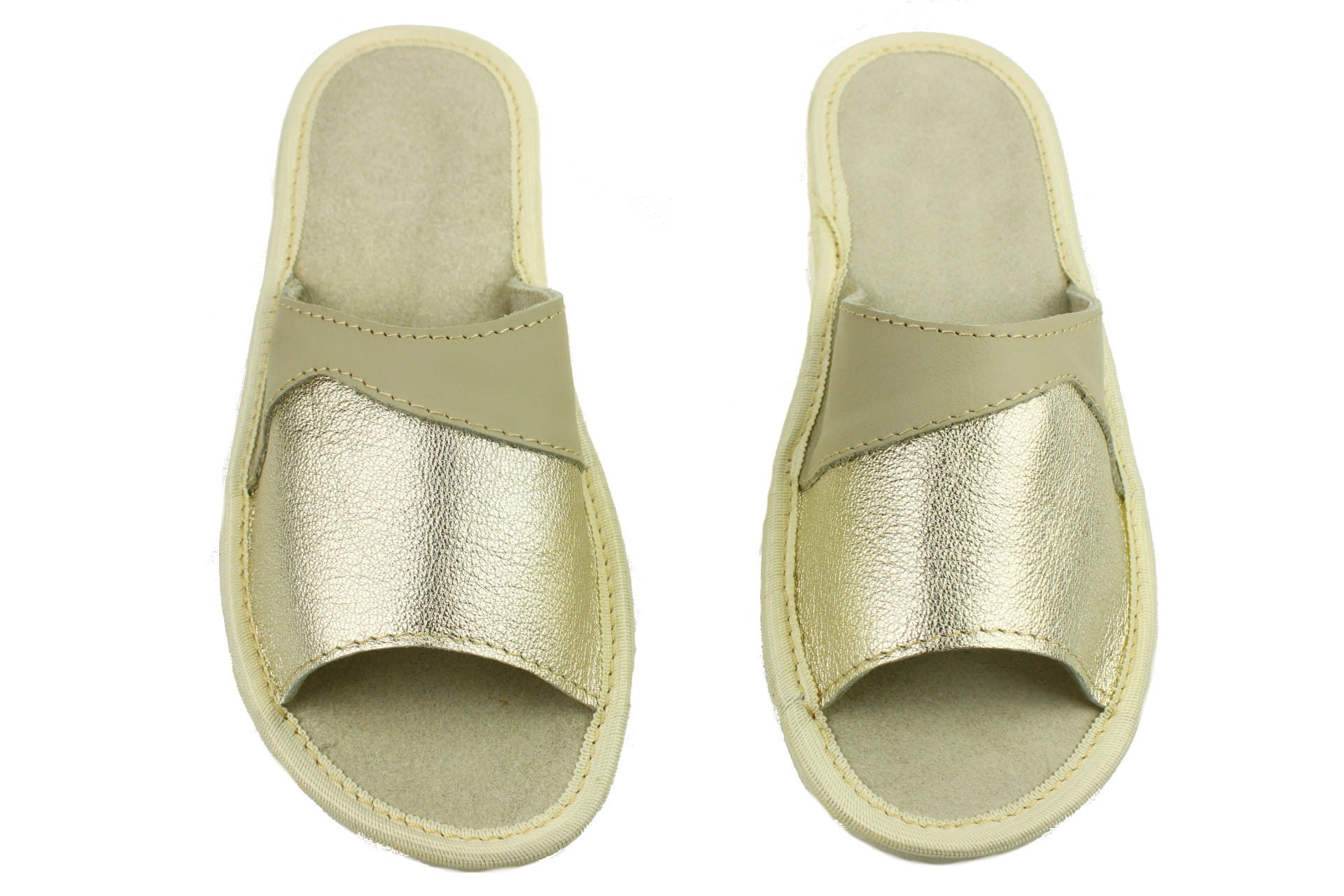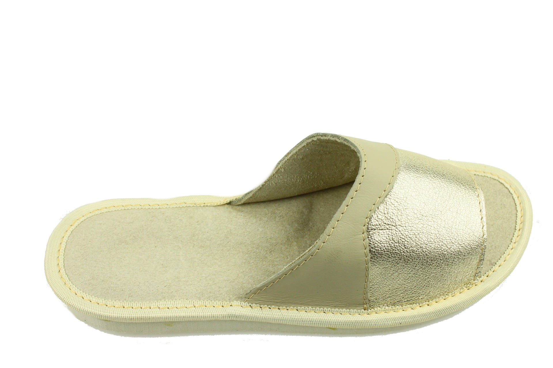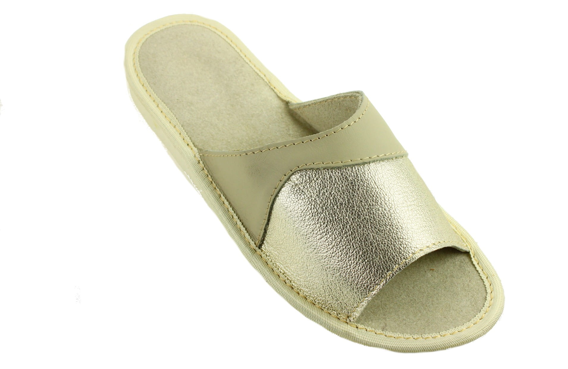 Pantofle damskie z otwartym palcem (b/p=bez palcy), wykonane z naturalnej skóry.