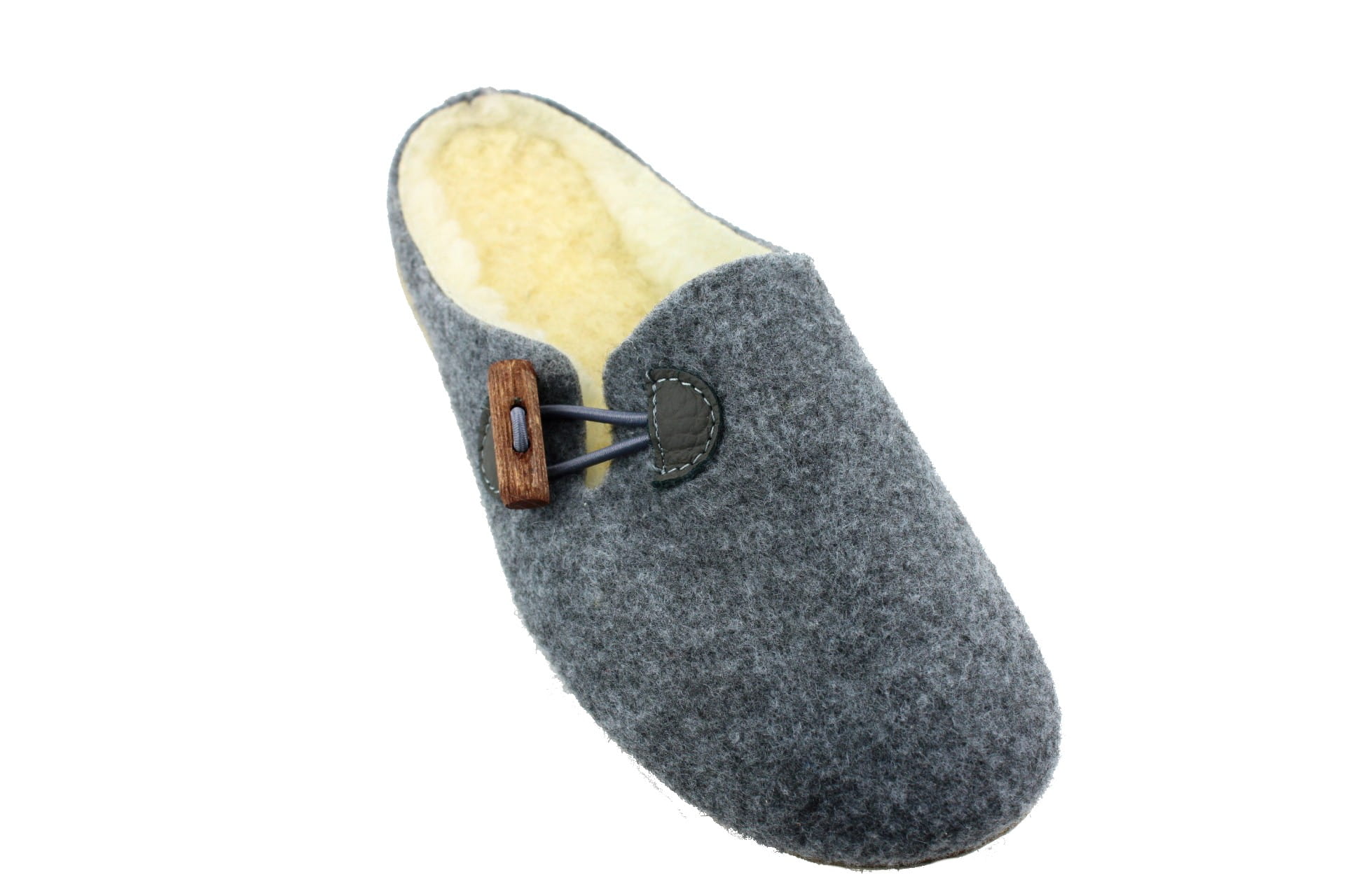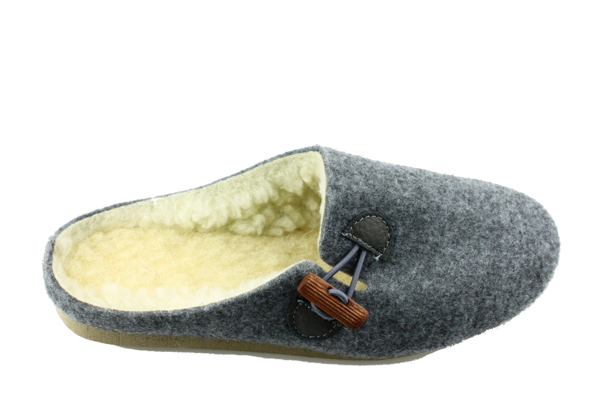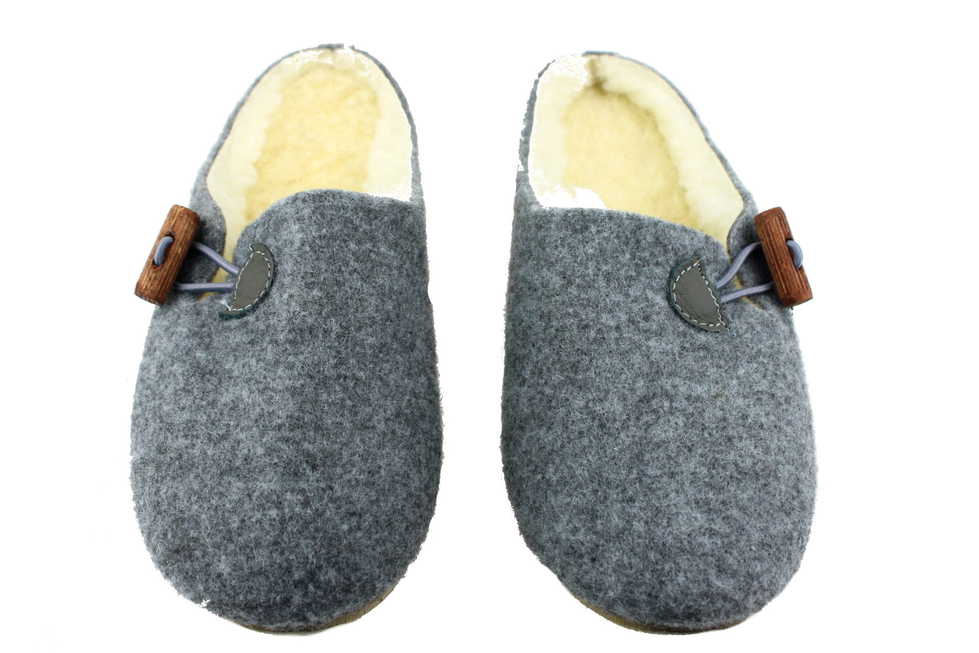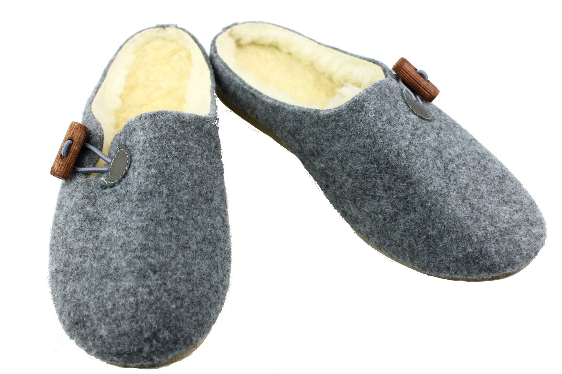 Pantofle wykonane z tkaniny filcowej, zapinane na ozdobny, drewniany kołek.