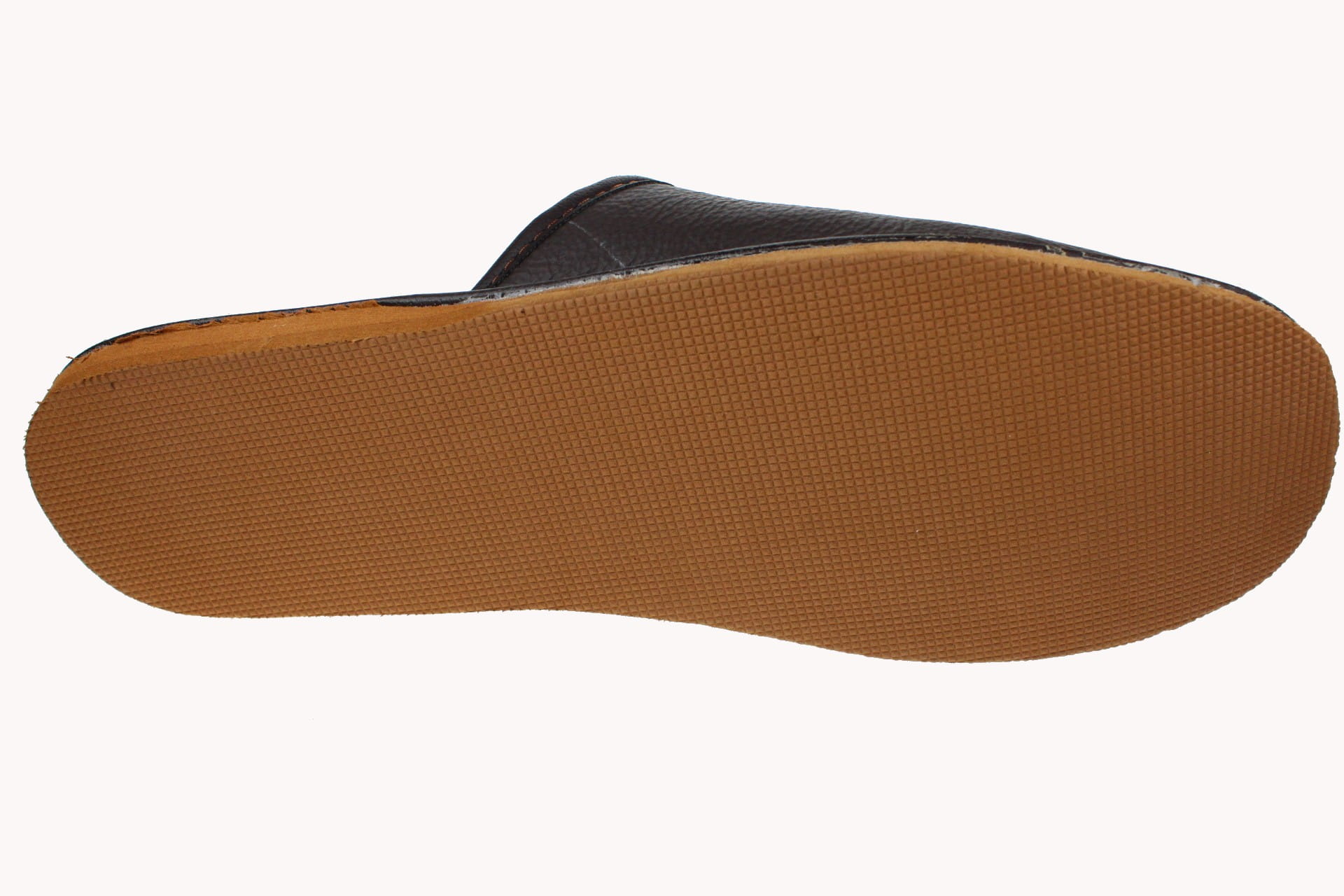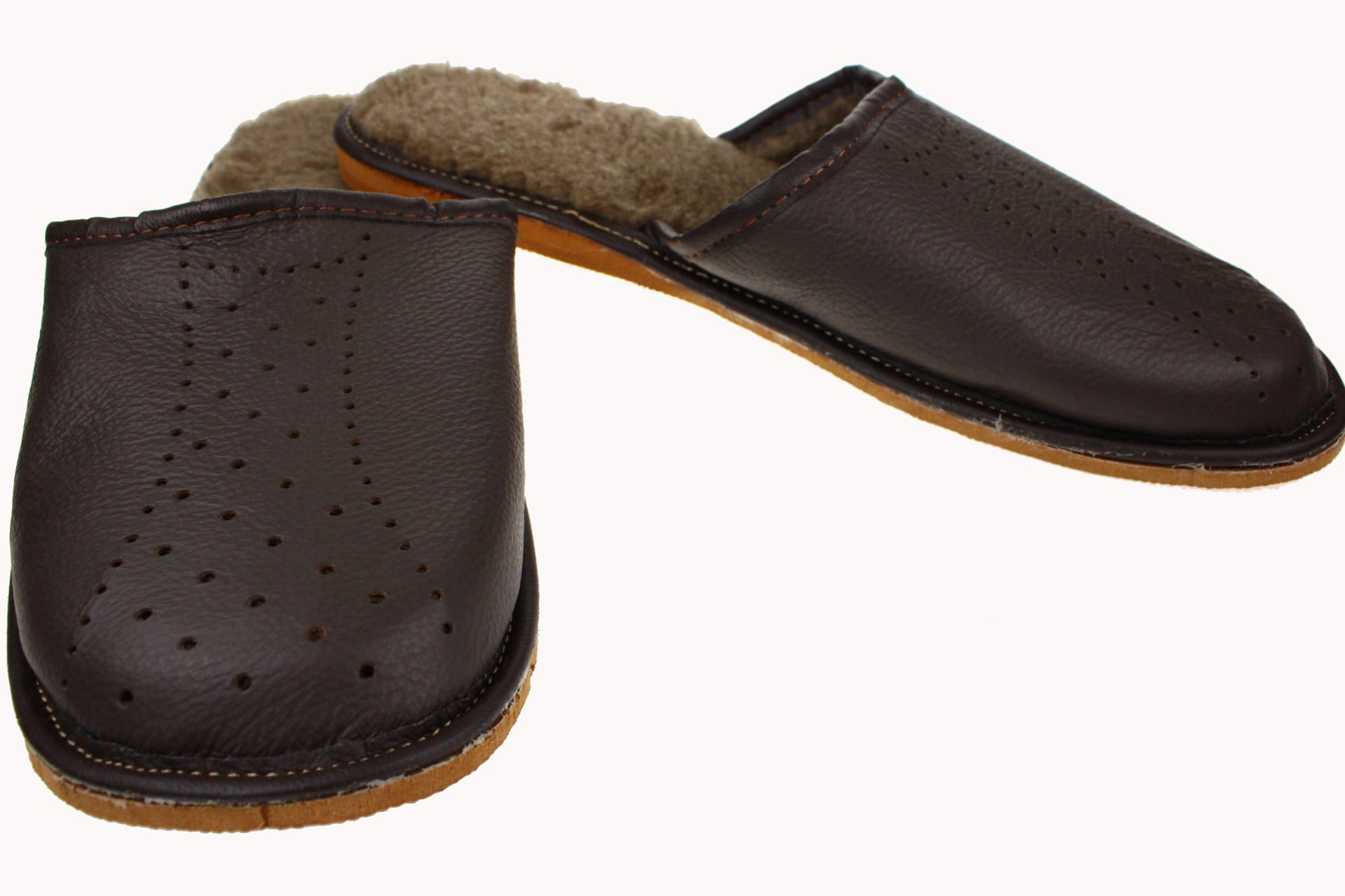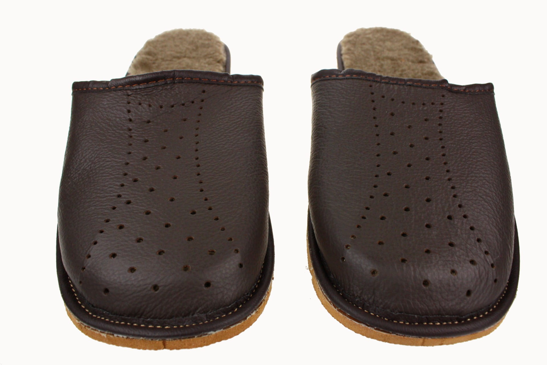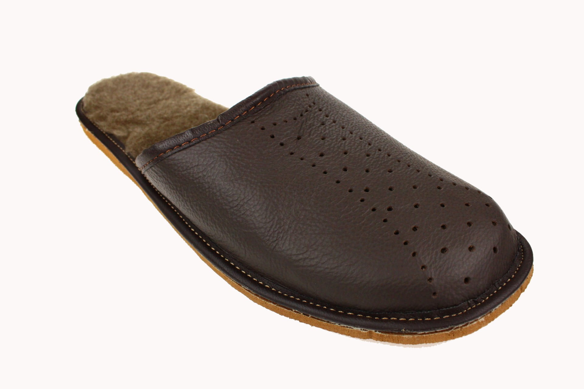 Pantofle męskie ocieplane, wykonane ze skóry licowej, w kolorze brązowym. Cholewka posiada liczne otworki umożliwiające lepszą cyrkulację powietrza. Wnętrze wyściełane jest ciepłą i miłą w dotyku dzianiną z domieszka naturalnej, owczej wełny o ciemnym zabarwieniu. Papcie przyjemnie ogrzewają stopy. Podeszwa gumowa, antypoślizgowa. Pantofle przeznaczone do użytku domowego, są lekkie i wygodne.