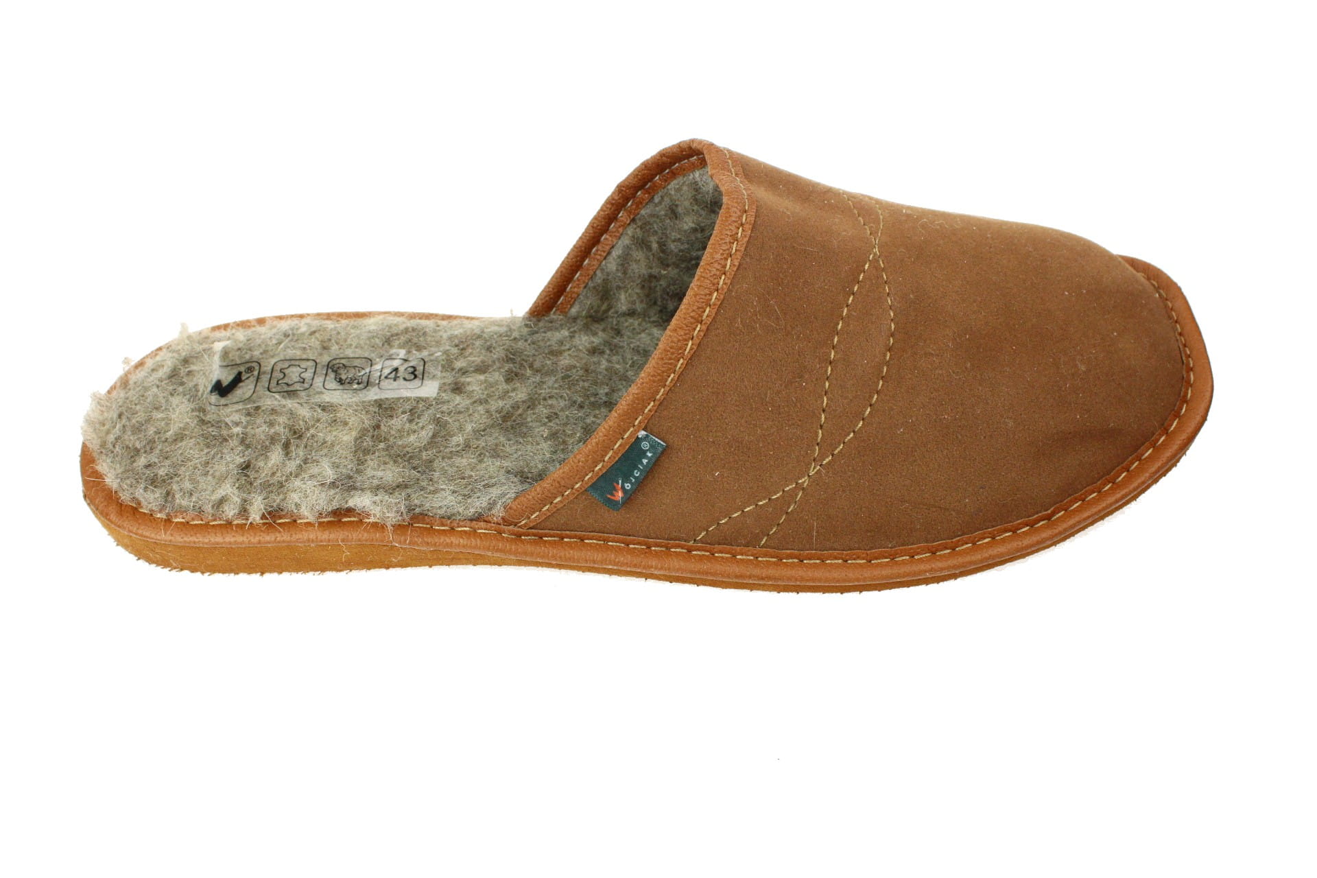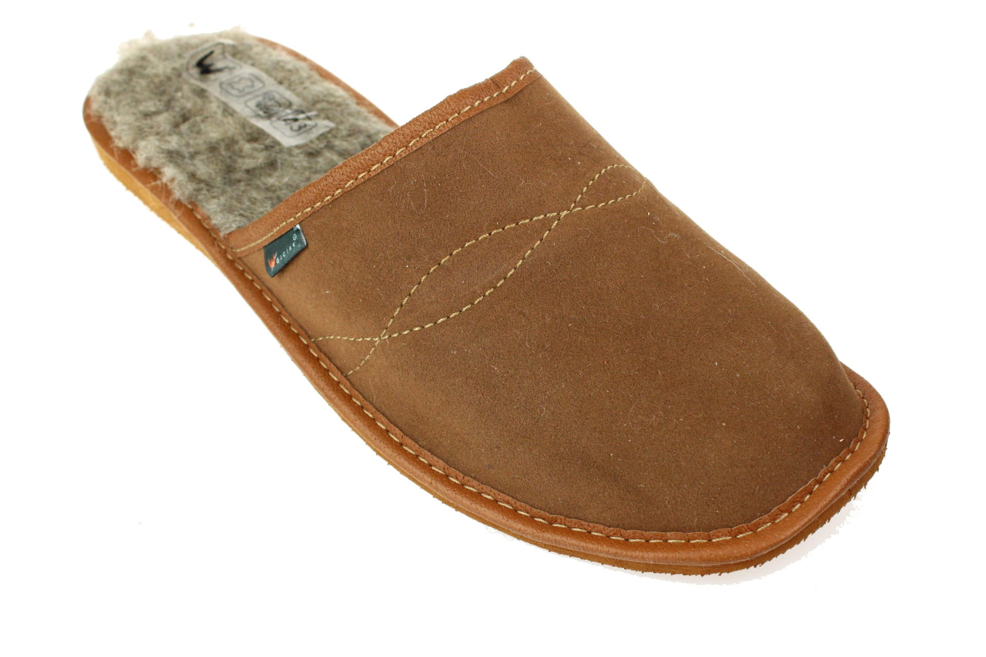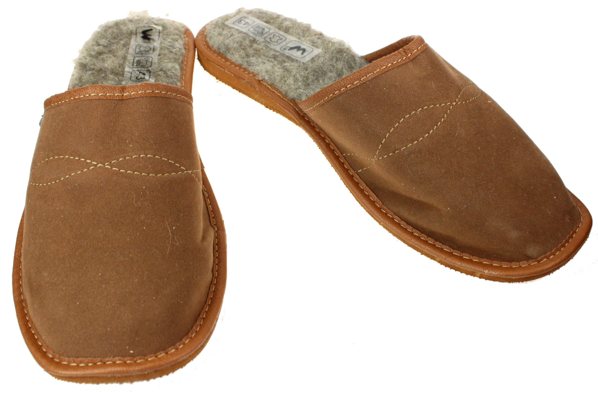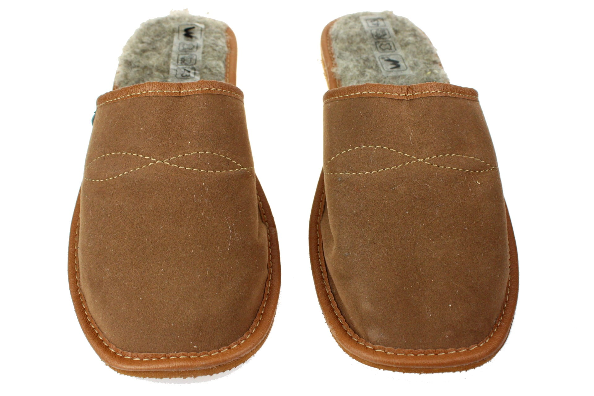 Pantofle męskie wykonane ze skóry zamszowej w kolorze brązowym. Wnętrze wyściełane jest miękką i ciepłą dzianiną z domieszką wełny owczej, zapewniając stopom komfort termiczny. Podeszwa gumowa antypoślizgowa, lekki klin podnosi delikatnie stopy. Przeznaczone do użytku domowego, są lekkie i wygodne.