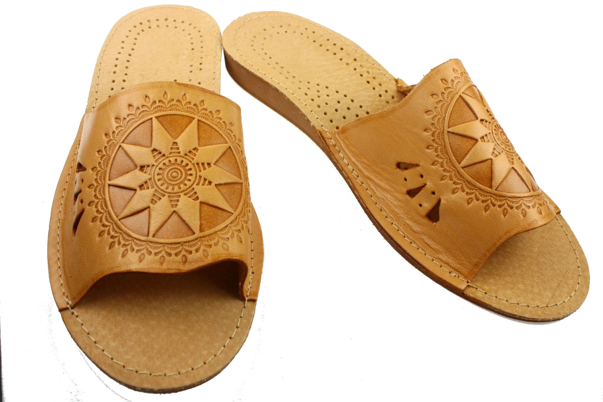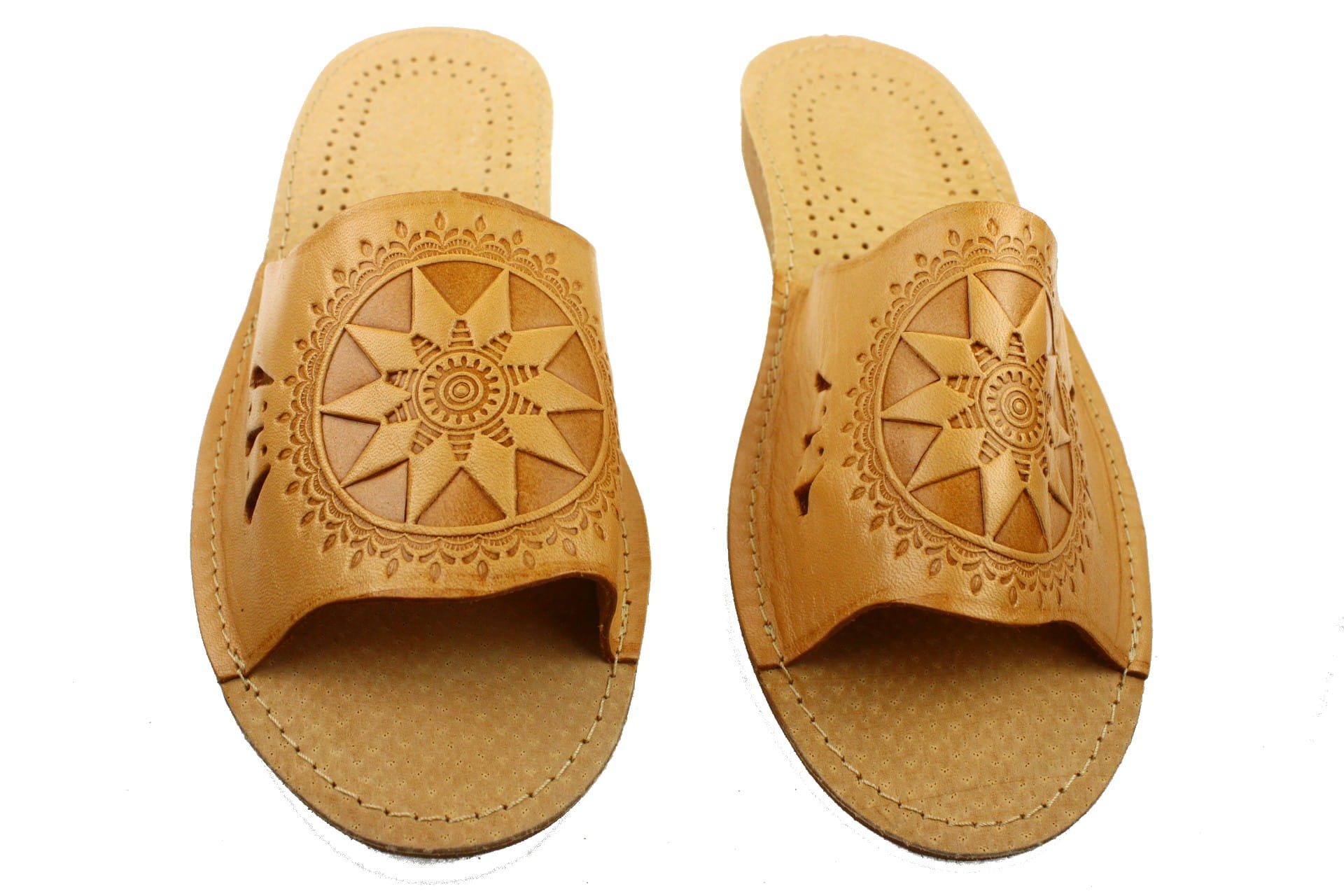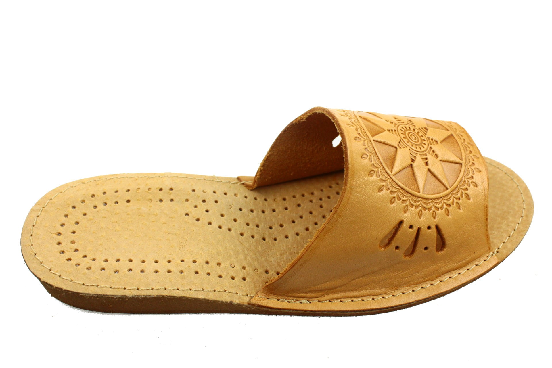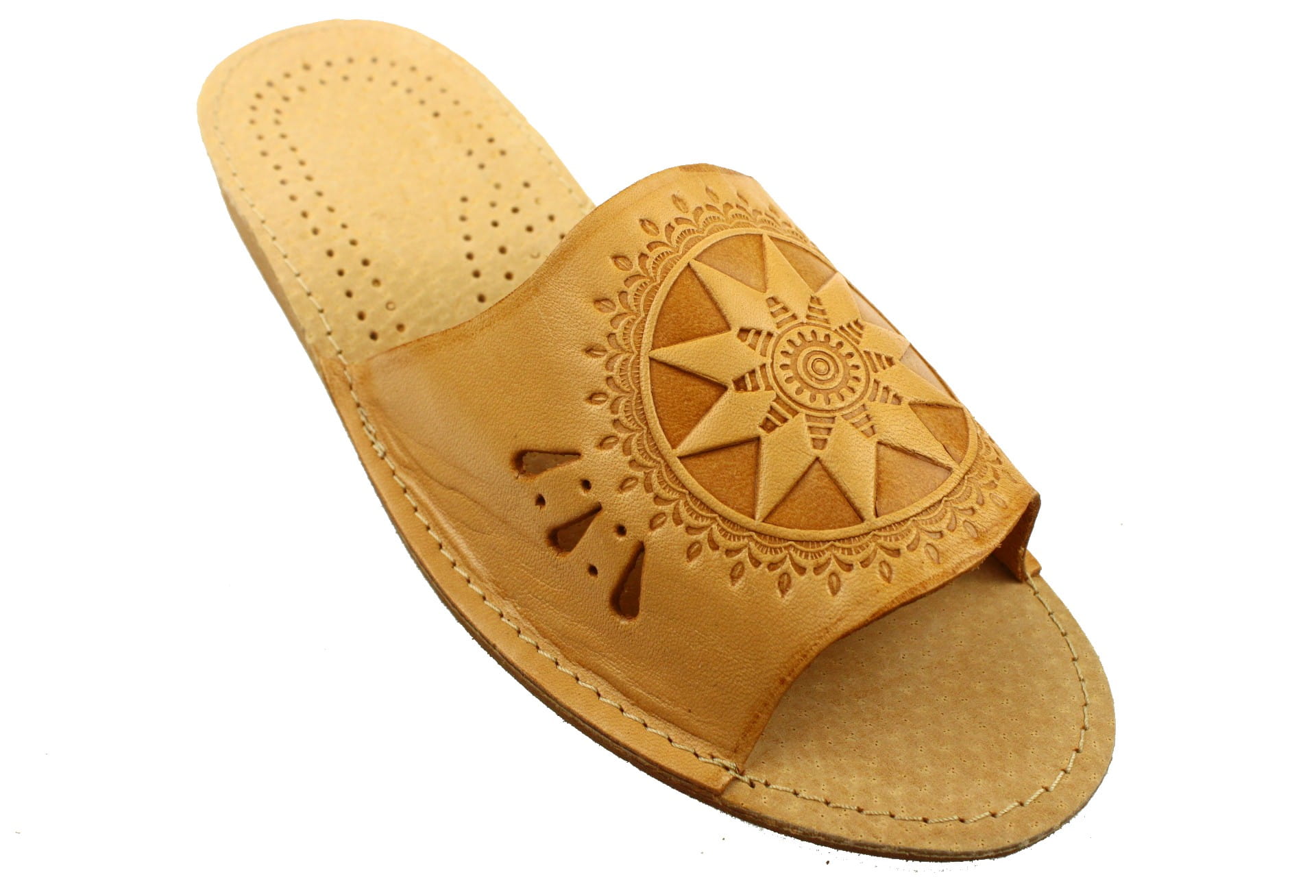 Laczki damskie z otwartym palcem (b/p=bez palcy), wykonane z najwyższej jakości bydlęcej skóry - skóry juchtowej/ Cholewka z wytłaczanym wzorem . Wkładka skórzana, z licznymi otworkami, które odprowadzają wilgoć,co daje poczucie świeżości i higieny. Podeszwa antypoślizgowa , wysokość klina 2,5 cm.