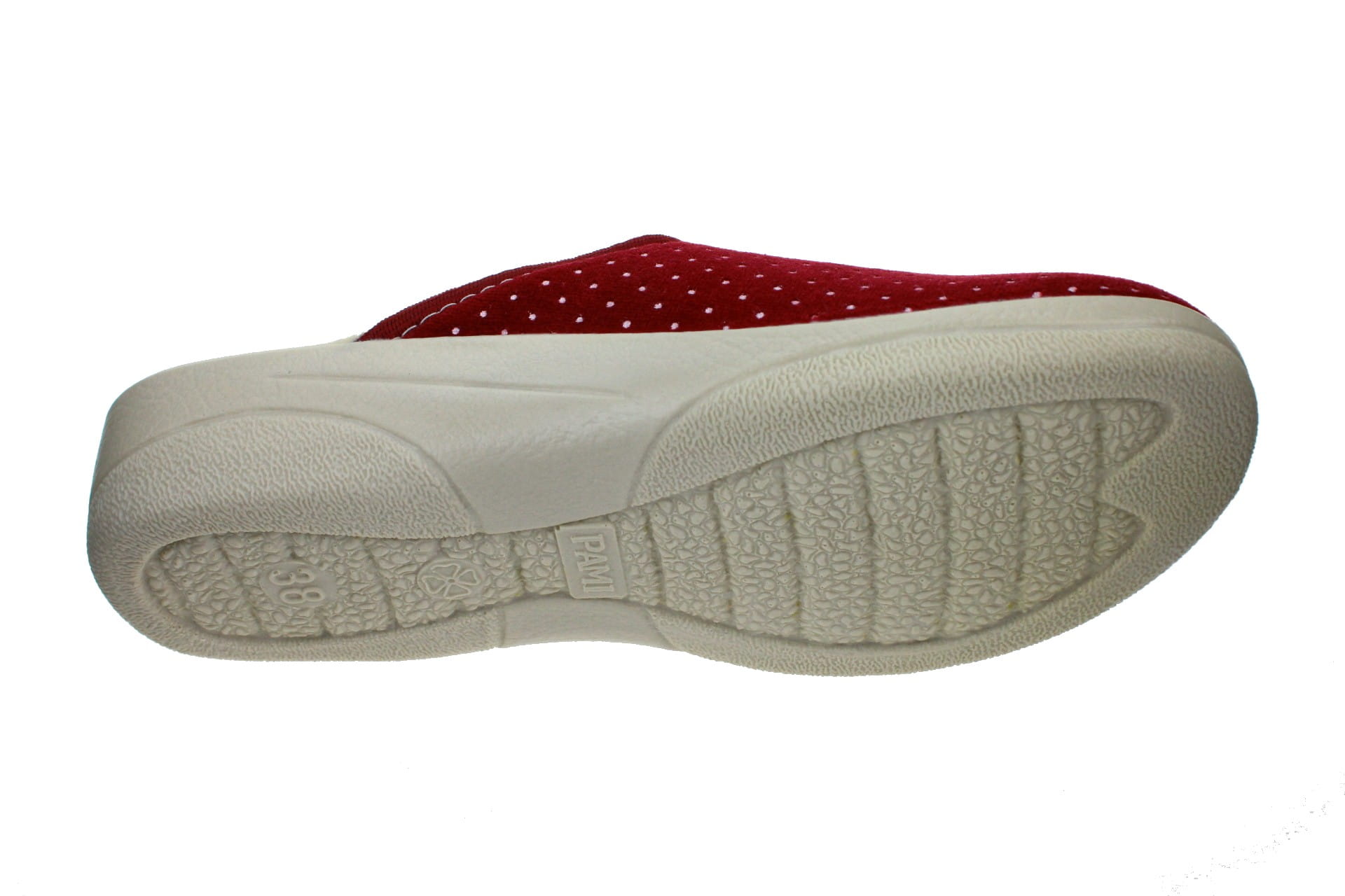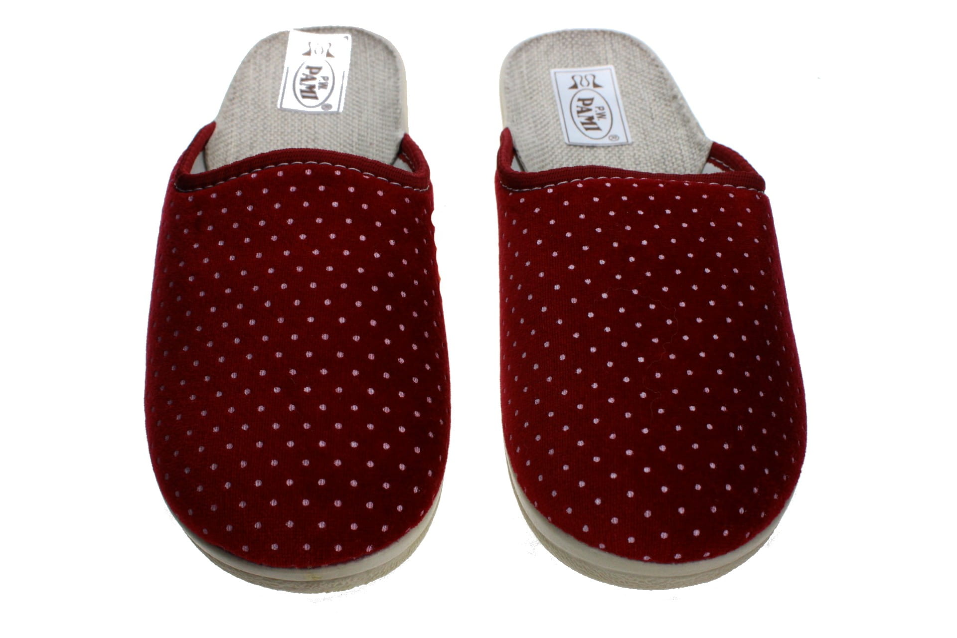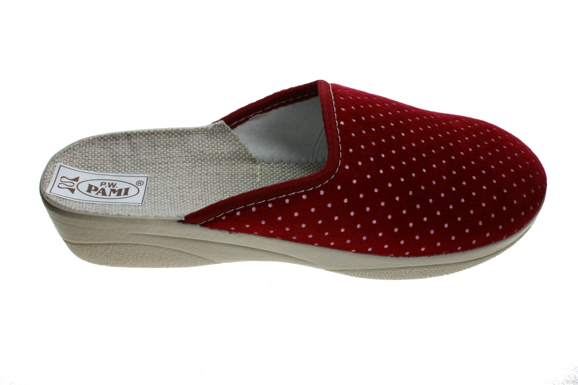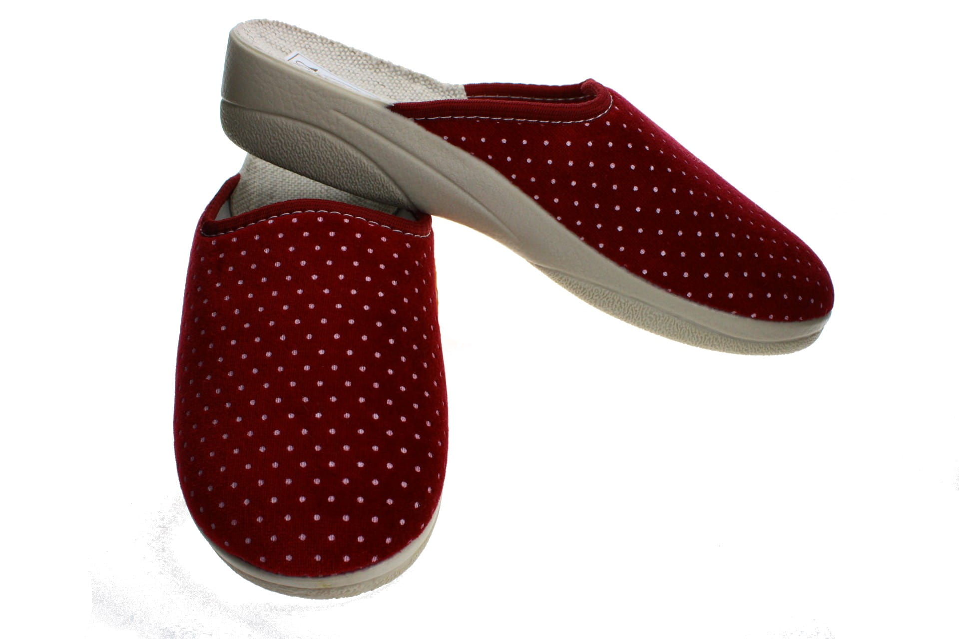 Laczki damskie pełne, cholewka wykonane z tkaniny bawełnianej - weluru, dzięki której stopy oddychają i nie pocą się. Motyw dekoracyjny - fantazyjne kropeczki. Wkładka bawełniana, spód odlewany, bardzo wytrzymały na ścieranie, klin o wys. 3,5 cm, Pantofle przeznaczone dla osób z wyższym przegubiem, do użytku domowego.