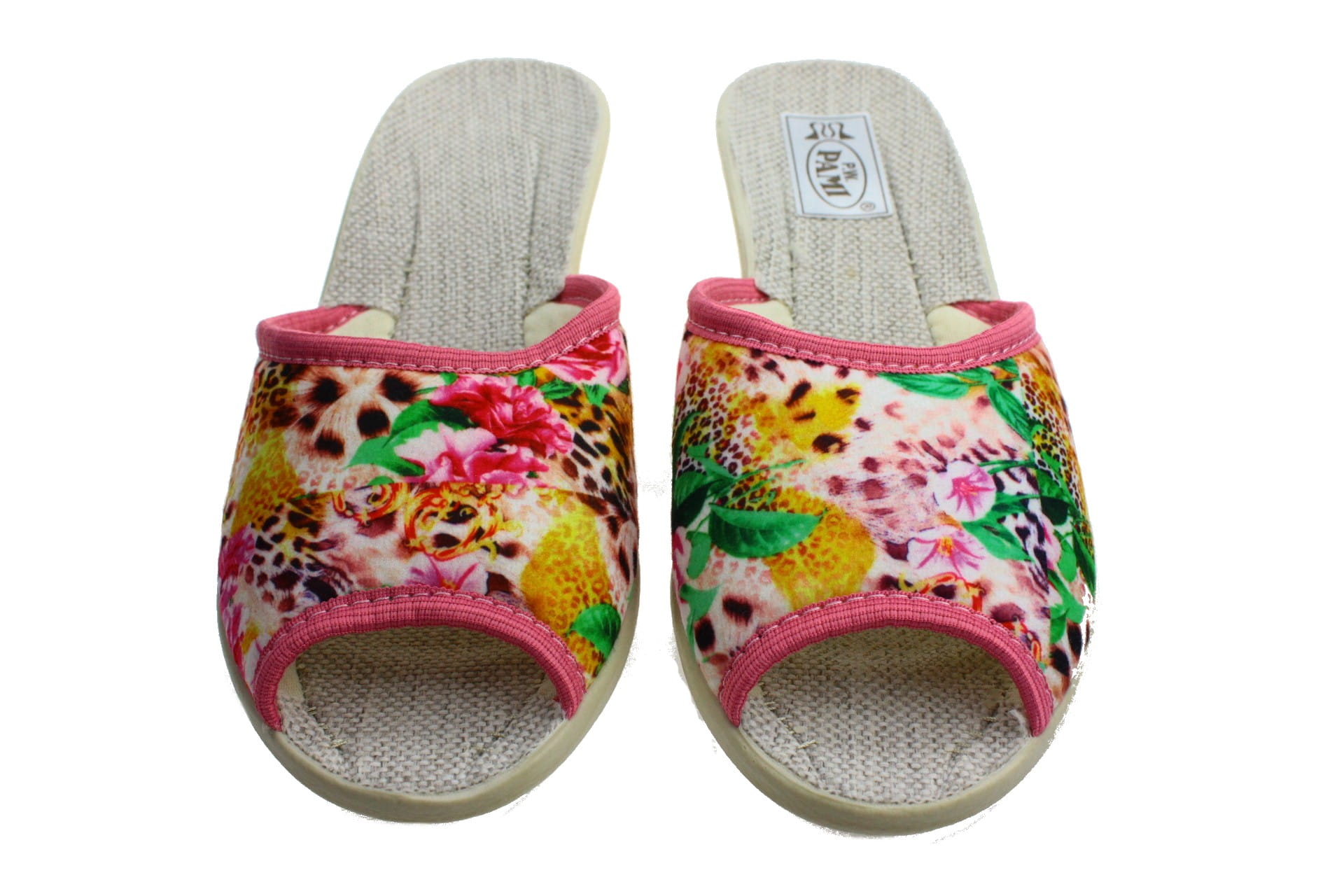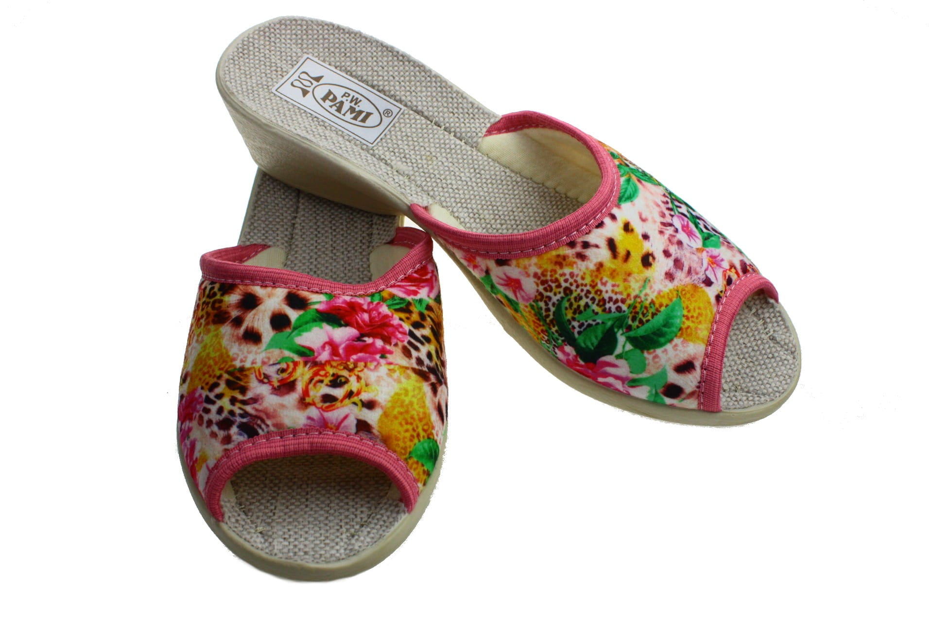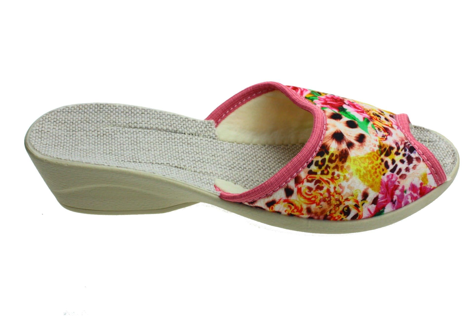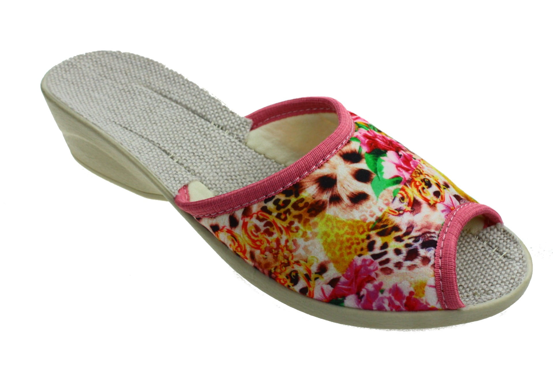 Laczki damskie bez palcy (otwarte), cholewka wykonane z tkaniny bawełnianej - dekoracyjny motyw kwiatowy. Wkładka lniana dzięki której stopy oddychają i nie pocą się. Spód odlewany, bardzo wytrzymały na ścieranie, klin o wys. 4 cm, Pantofle przeznaczone dla osób z wyższym przegubiem, do użytku domowego.