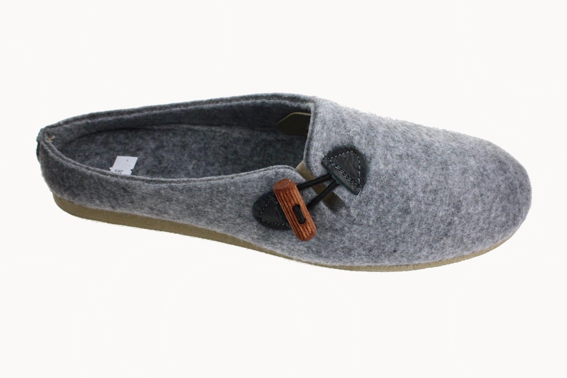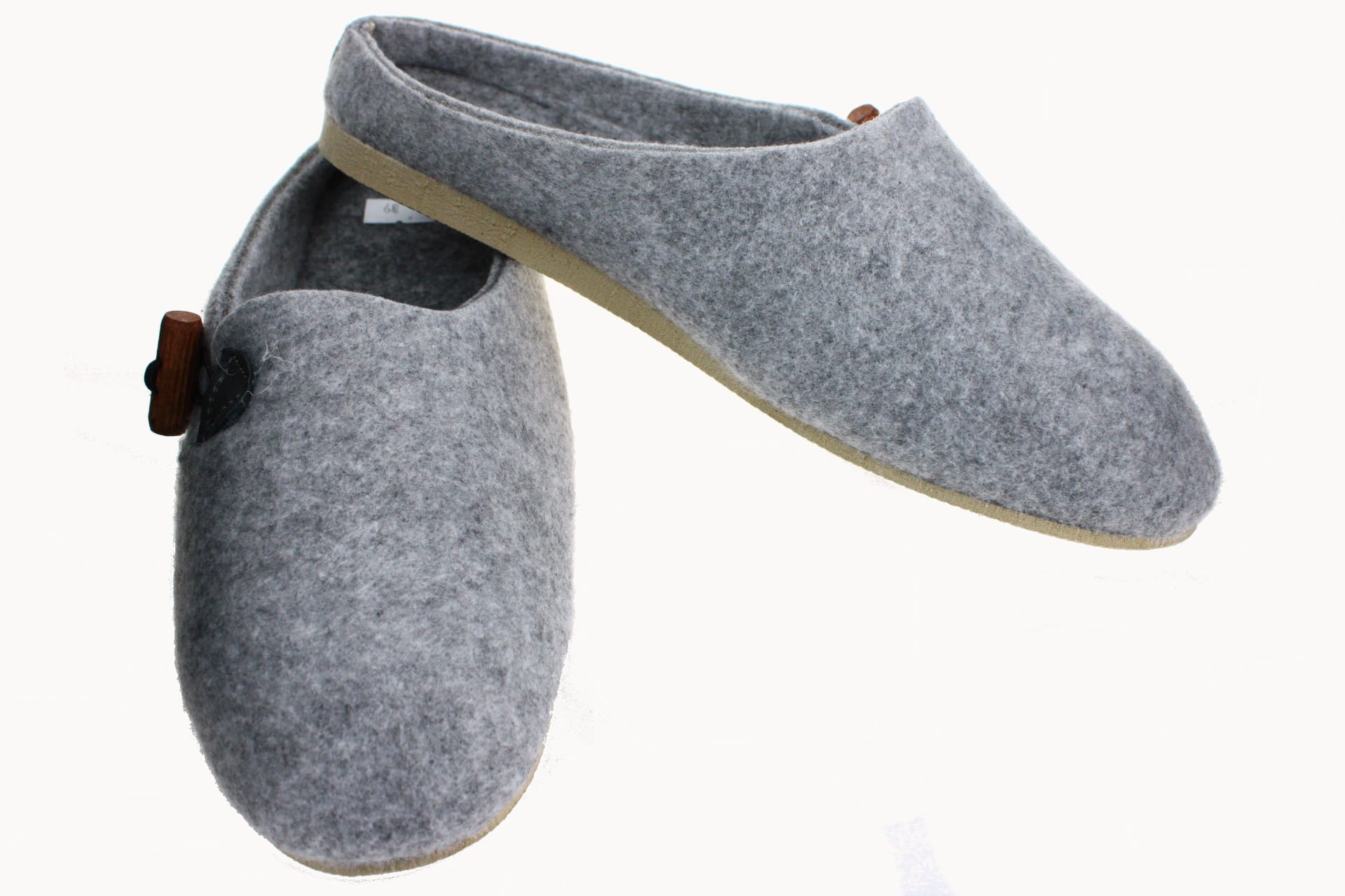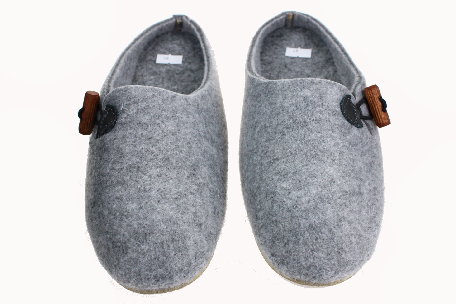 Pantofle wykonane z tkaniny filcowej, zapinane na ozdobny, drewniany kołek.
