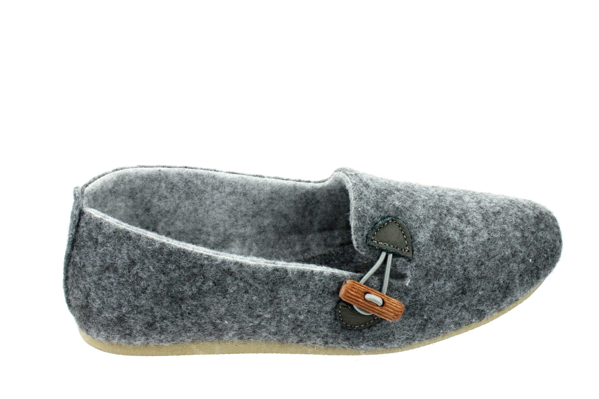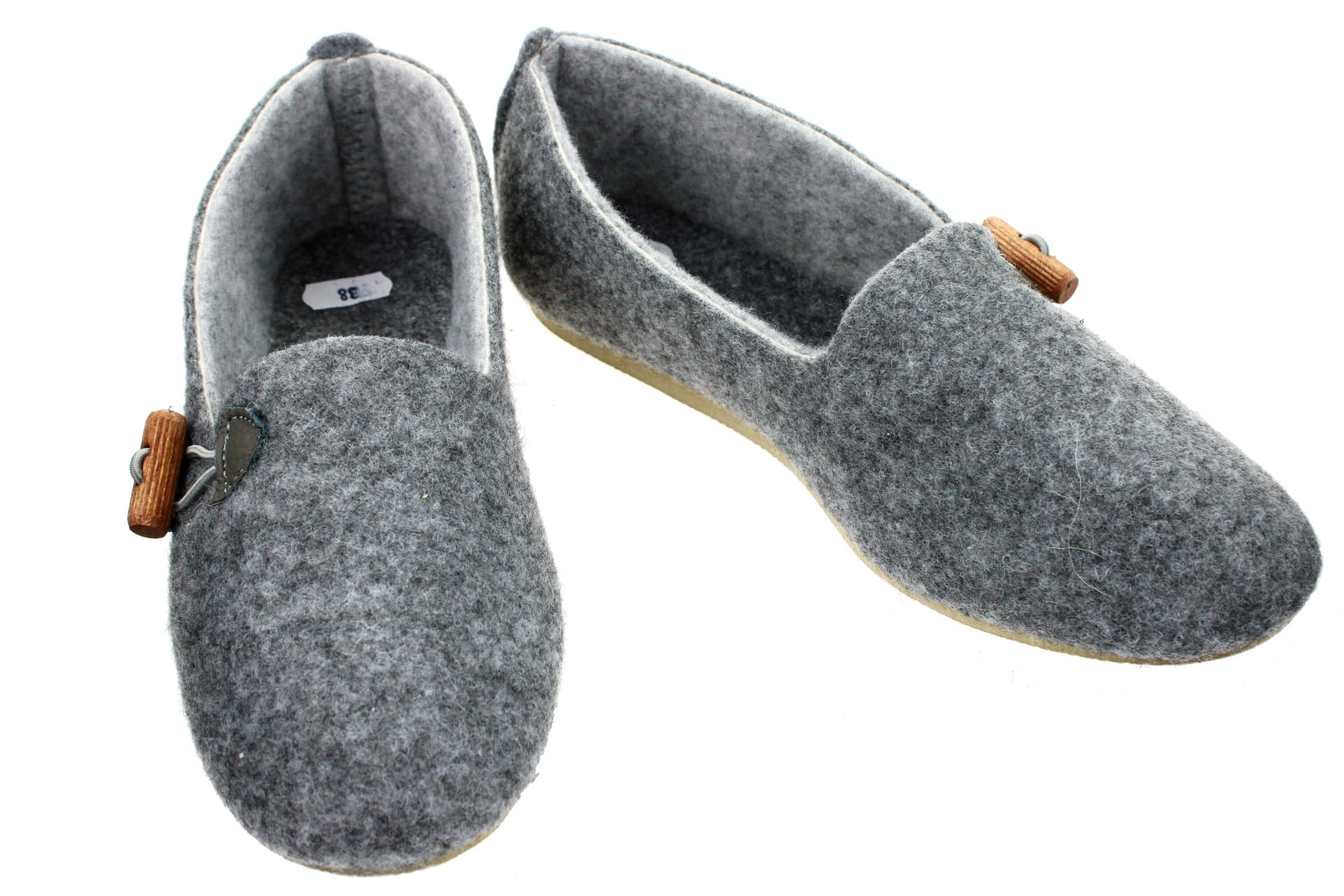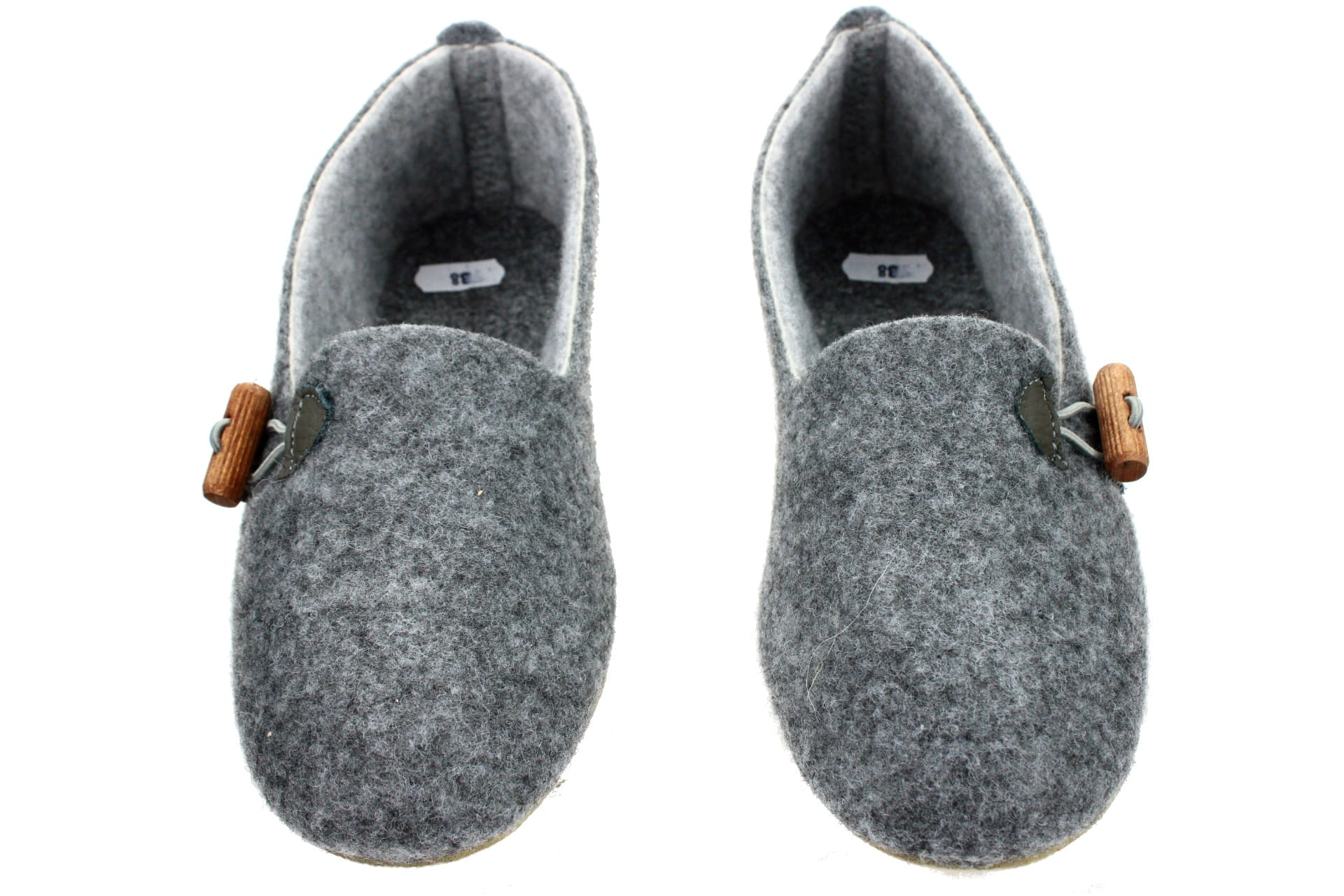 Pantofle wykonane z tkaniny filcowej, zapinane na ozdobny, drewniany kołek.