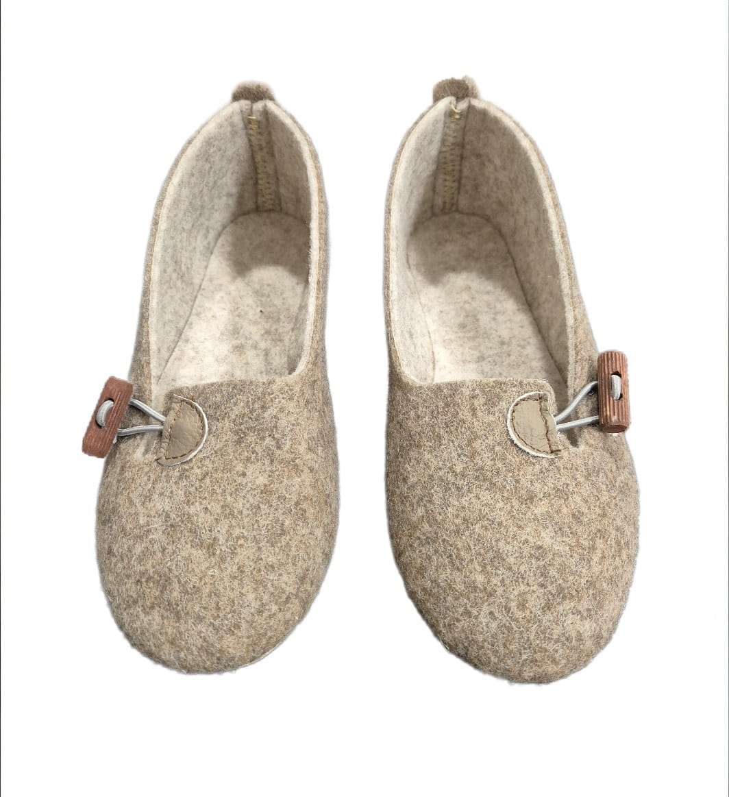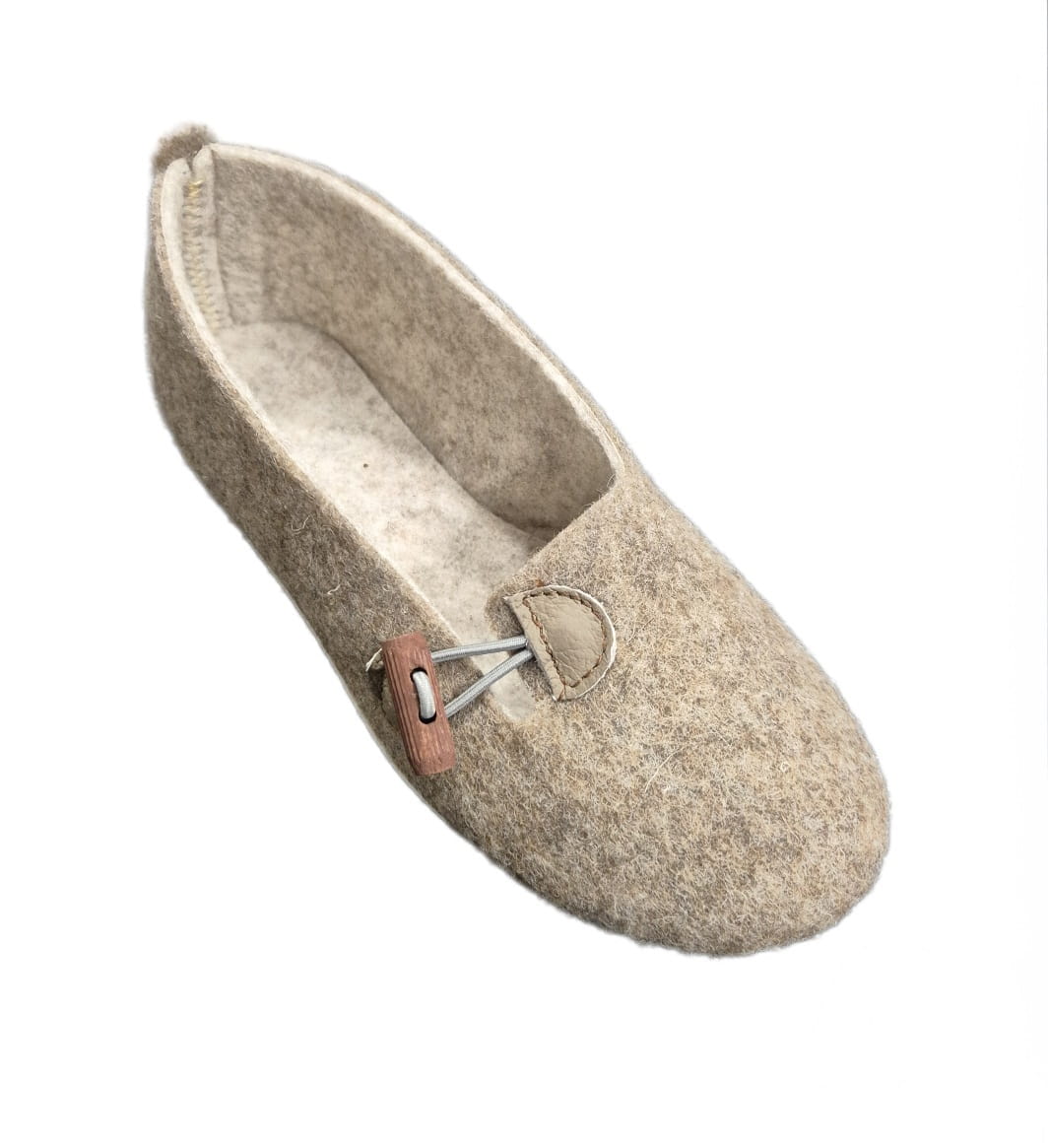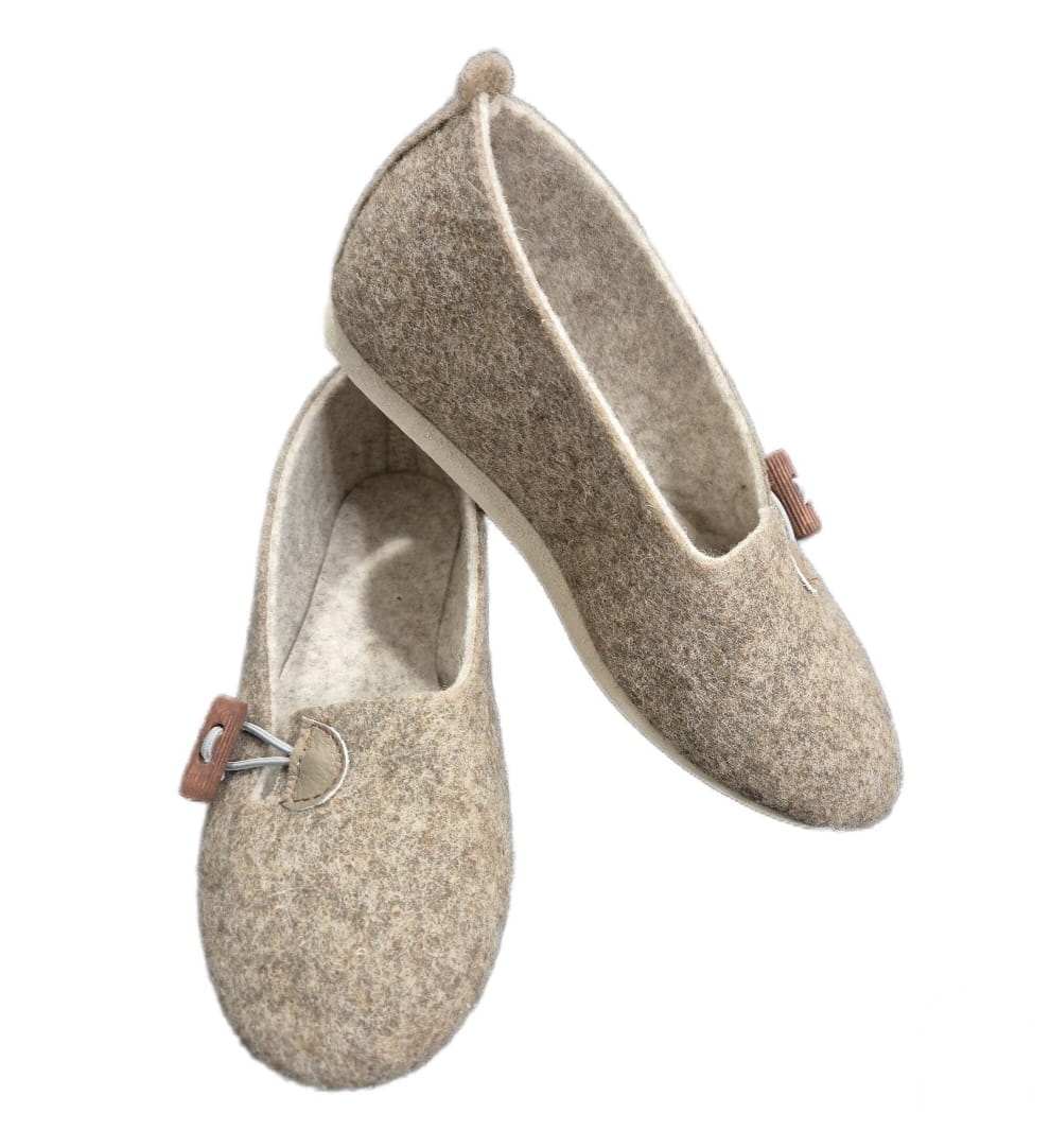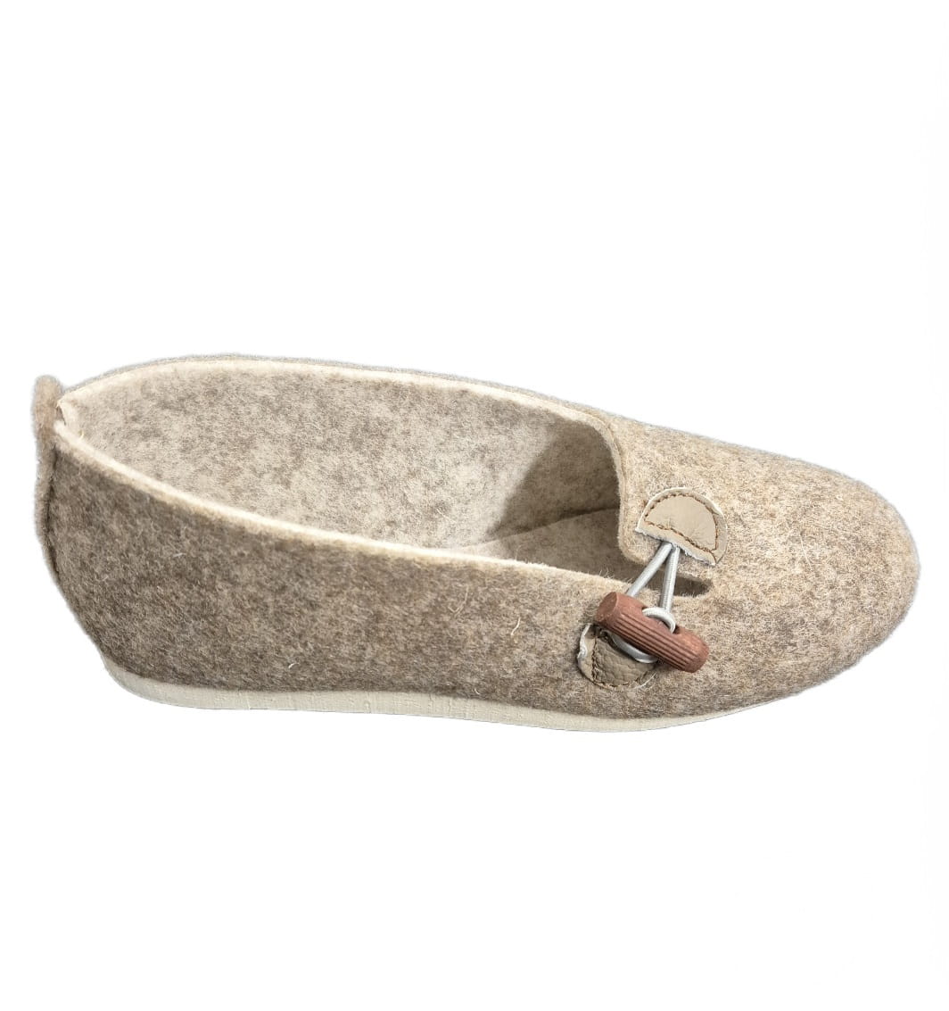 Pantofle wykonane z tkaniny filcowej, zapinane na ozdobny, drewniany kołek.