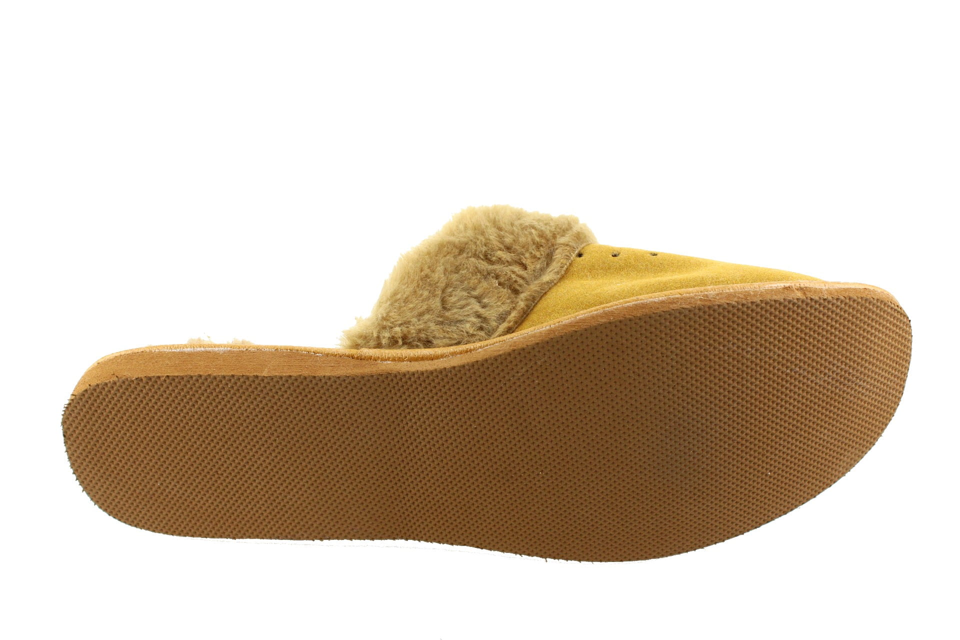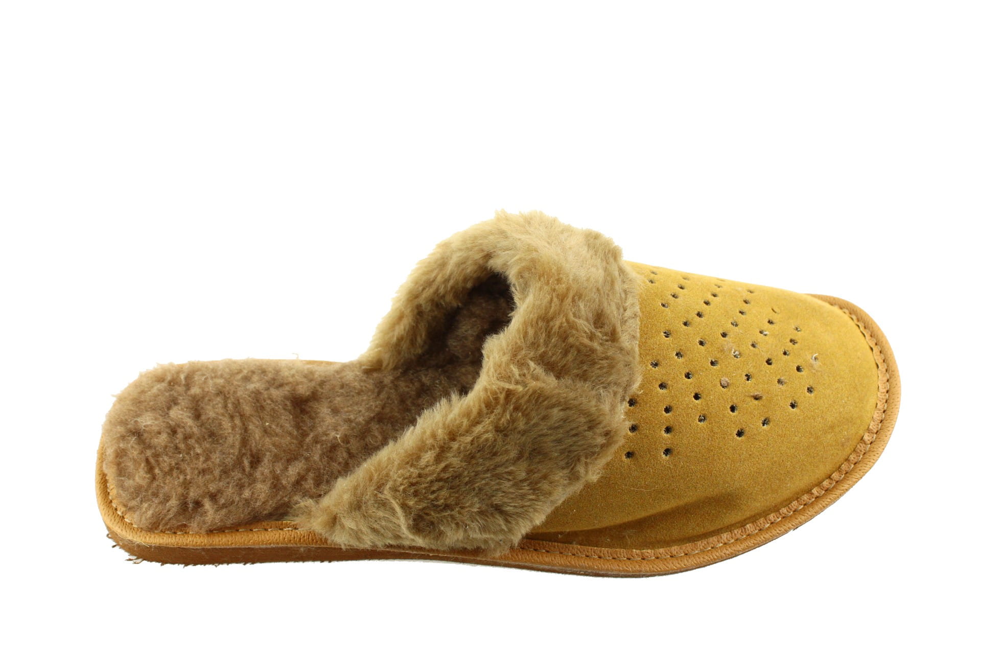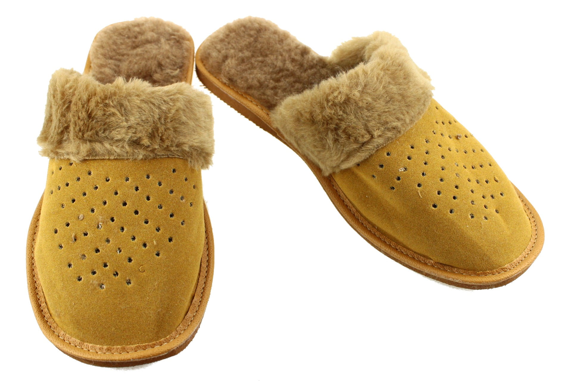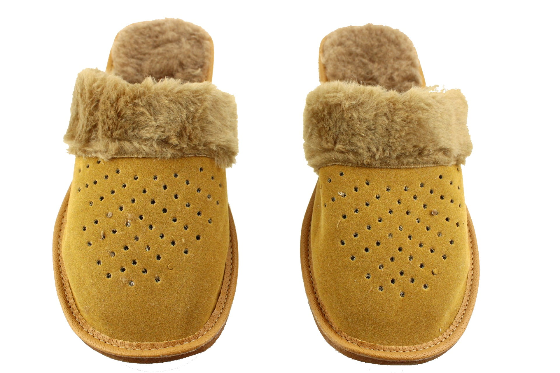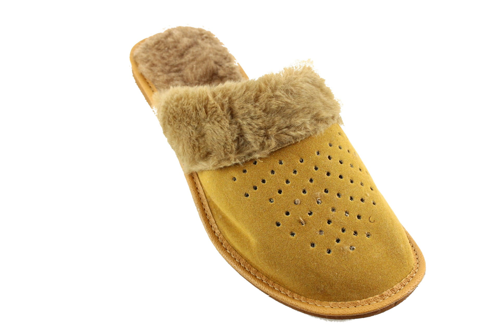 Pantofle damskie wykonane ze skóry zamszowej w kolorze beżowym.