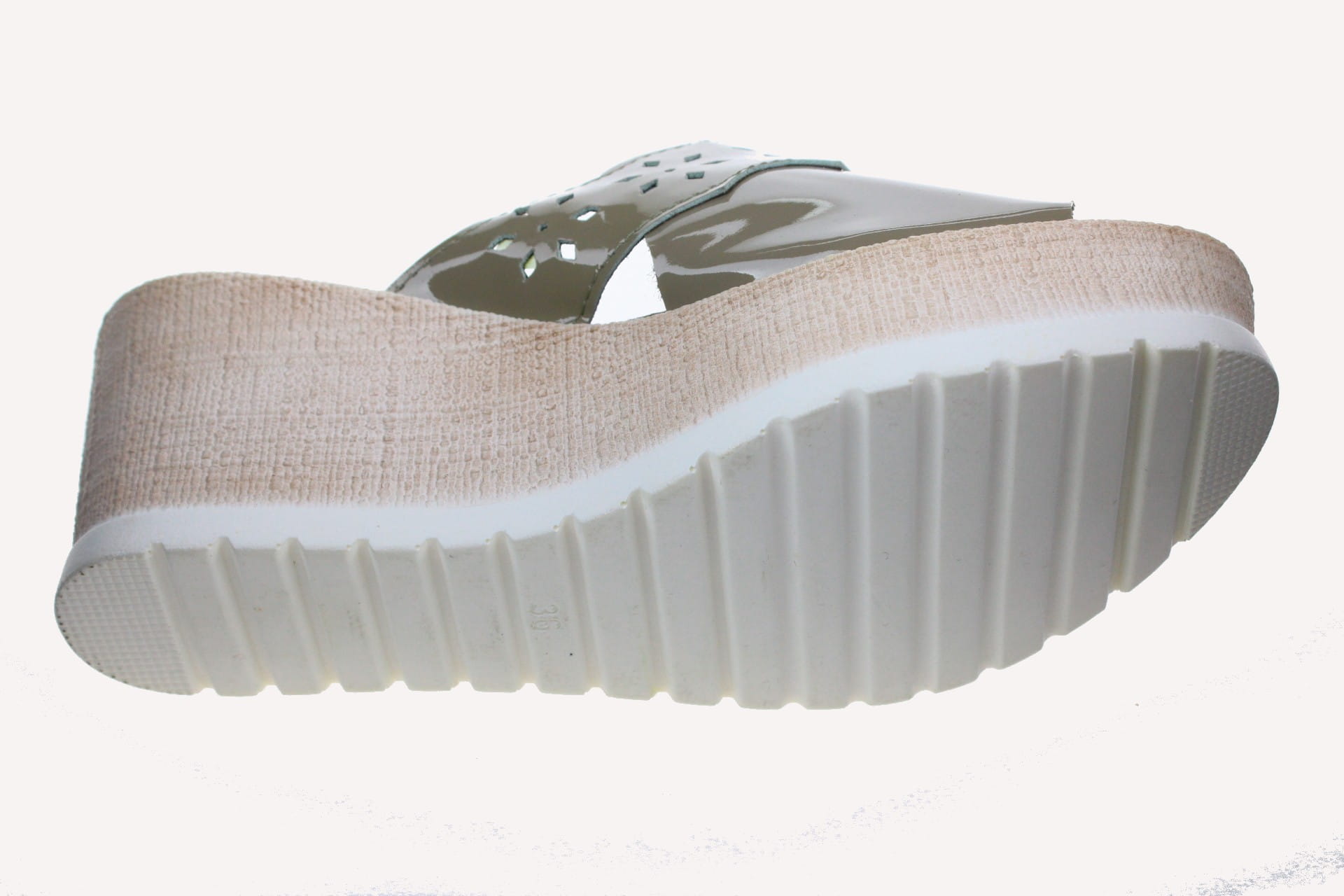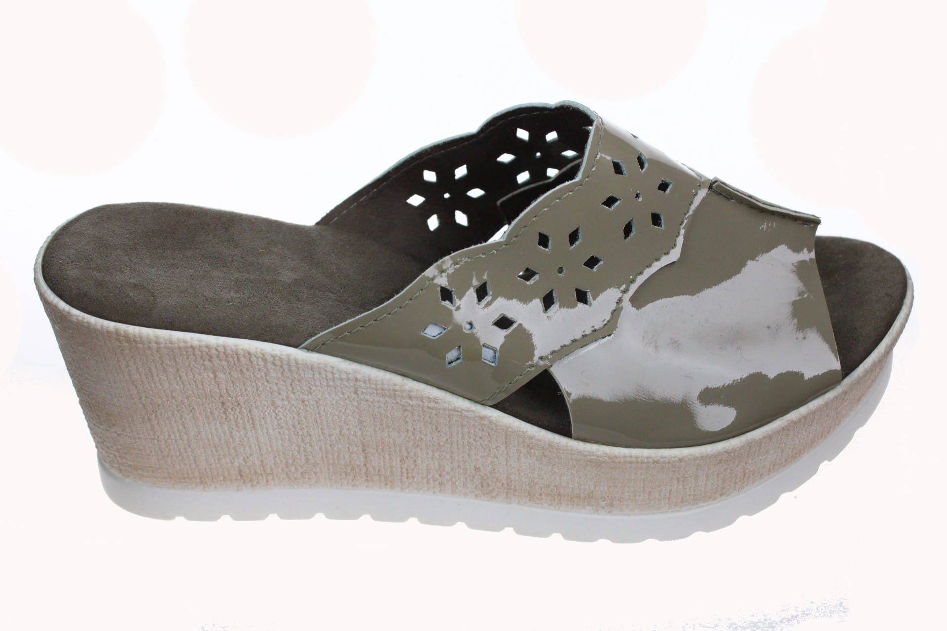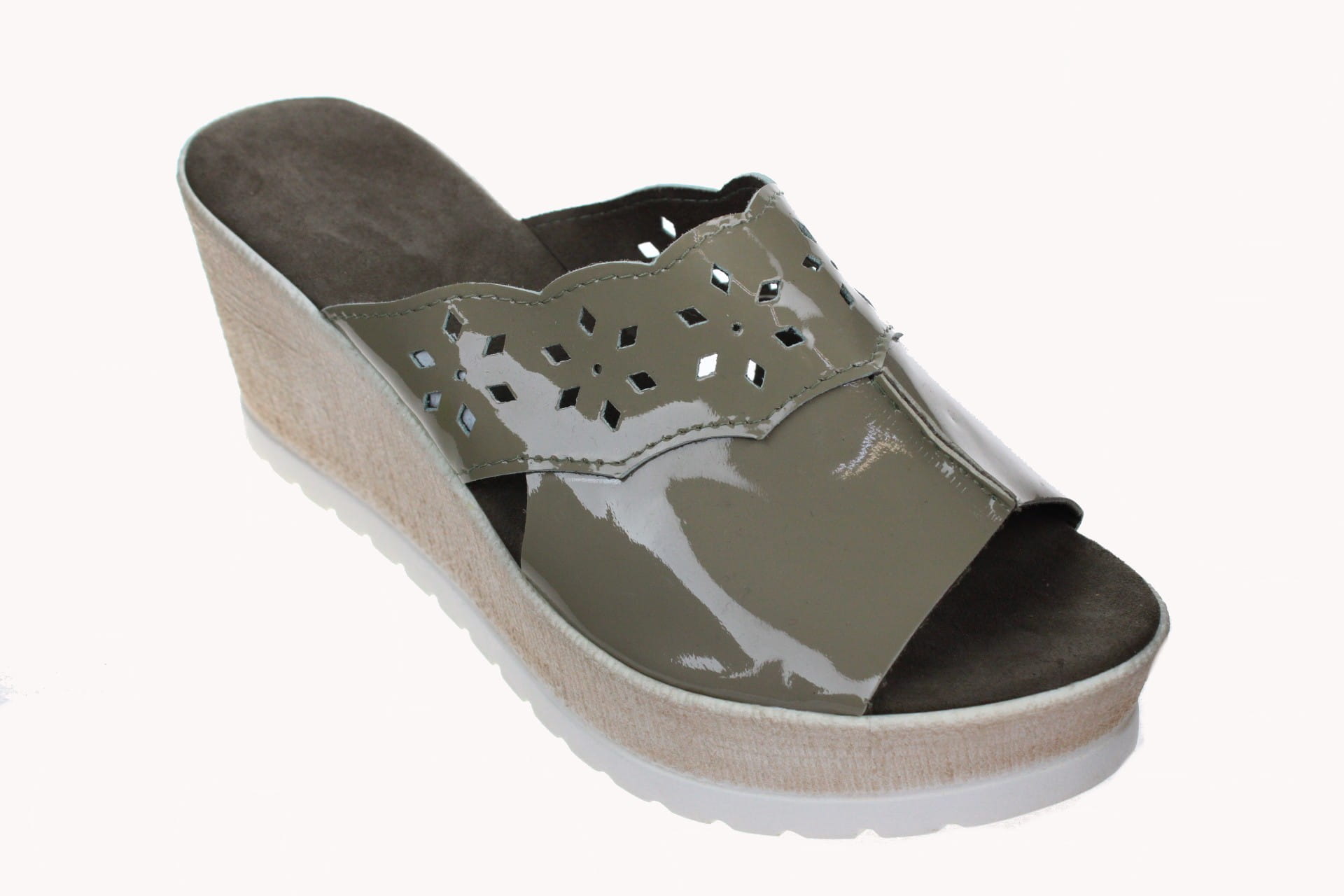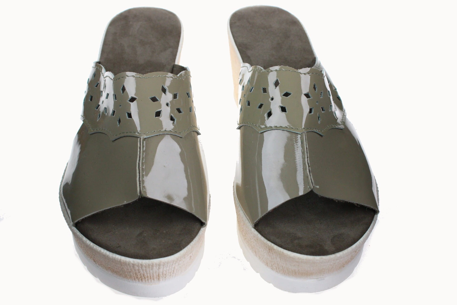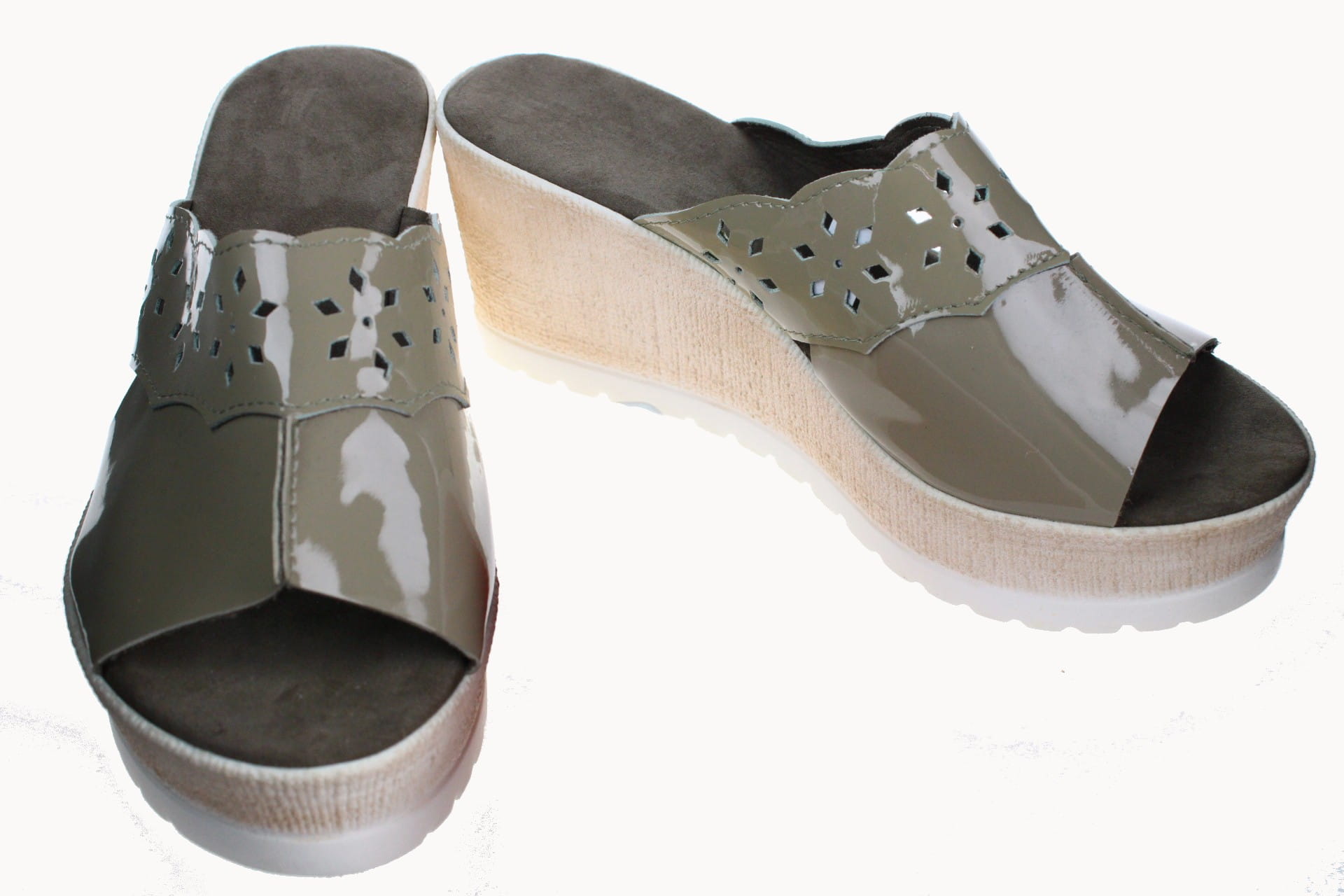 892-A. Obuwie damskie na koturnie wysokie lakierowane oliwka