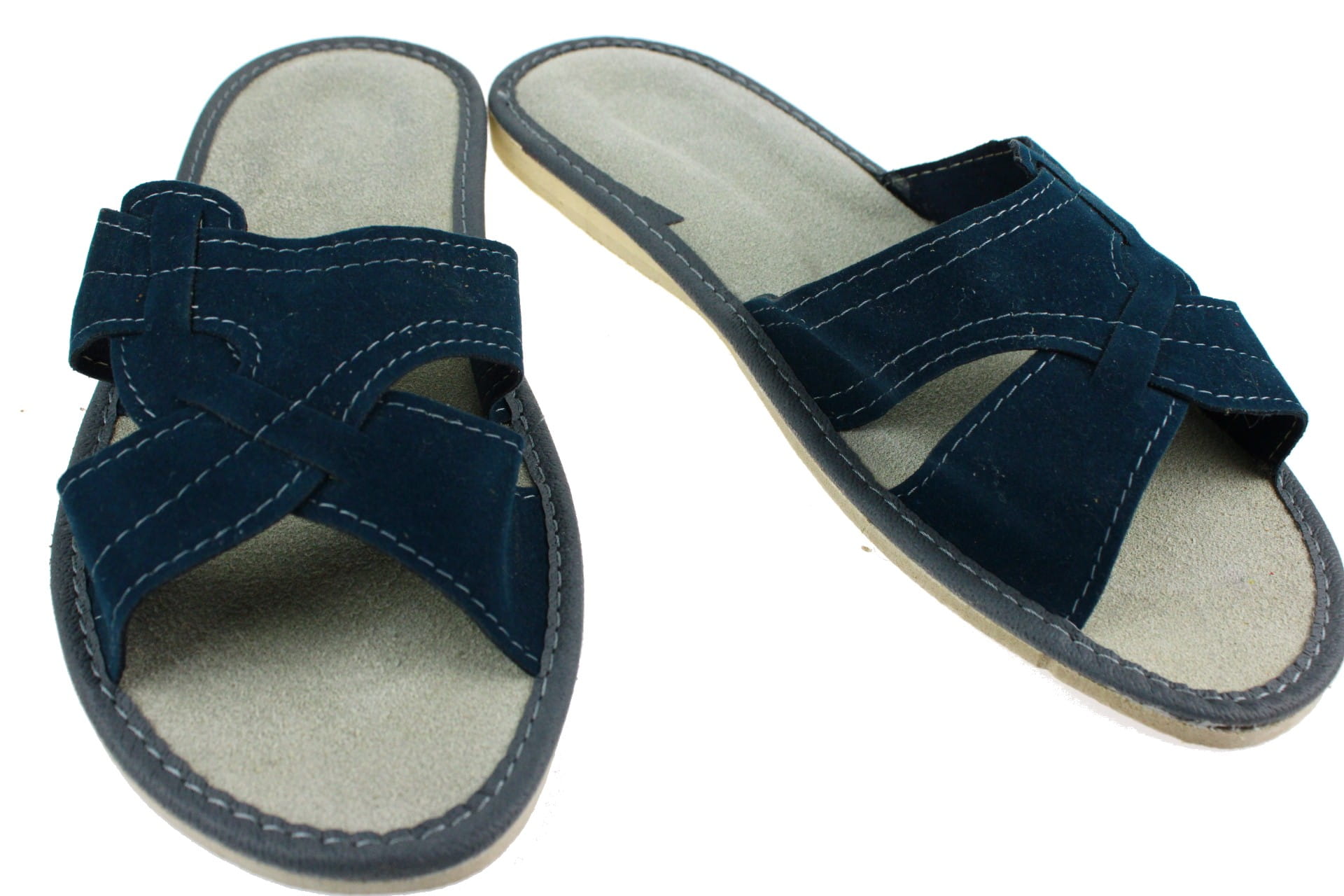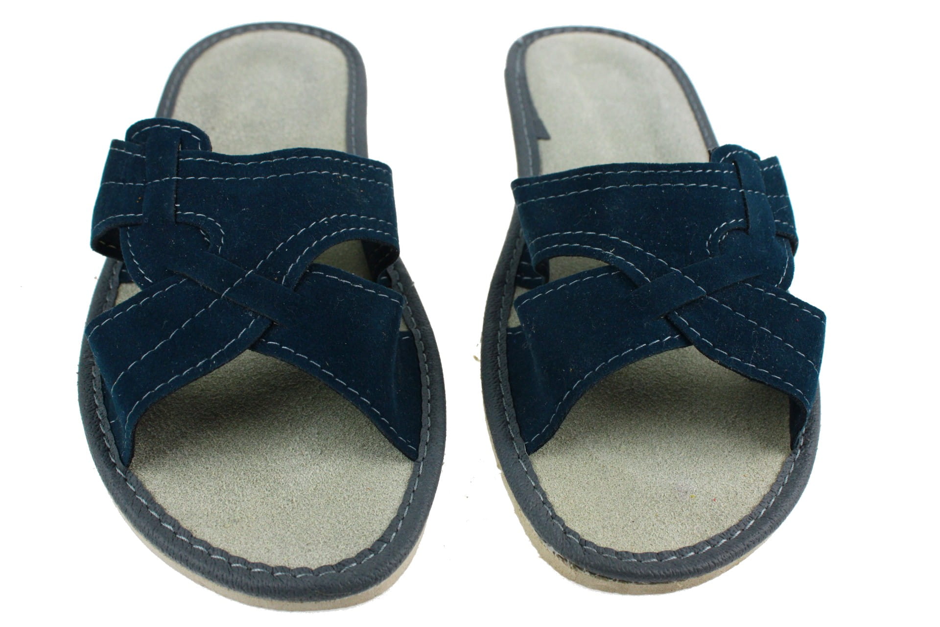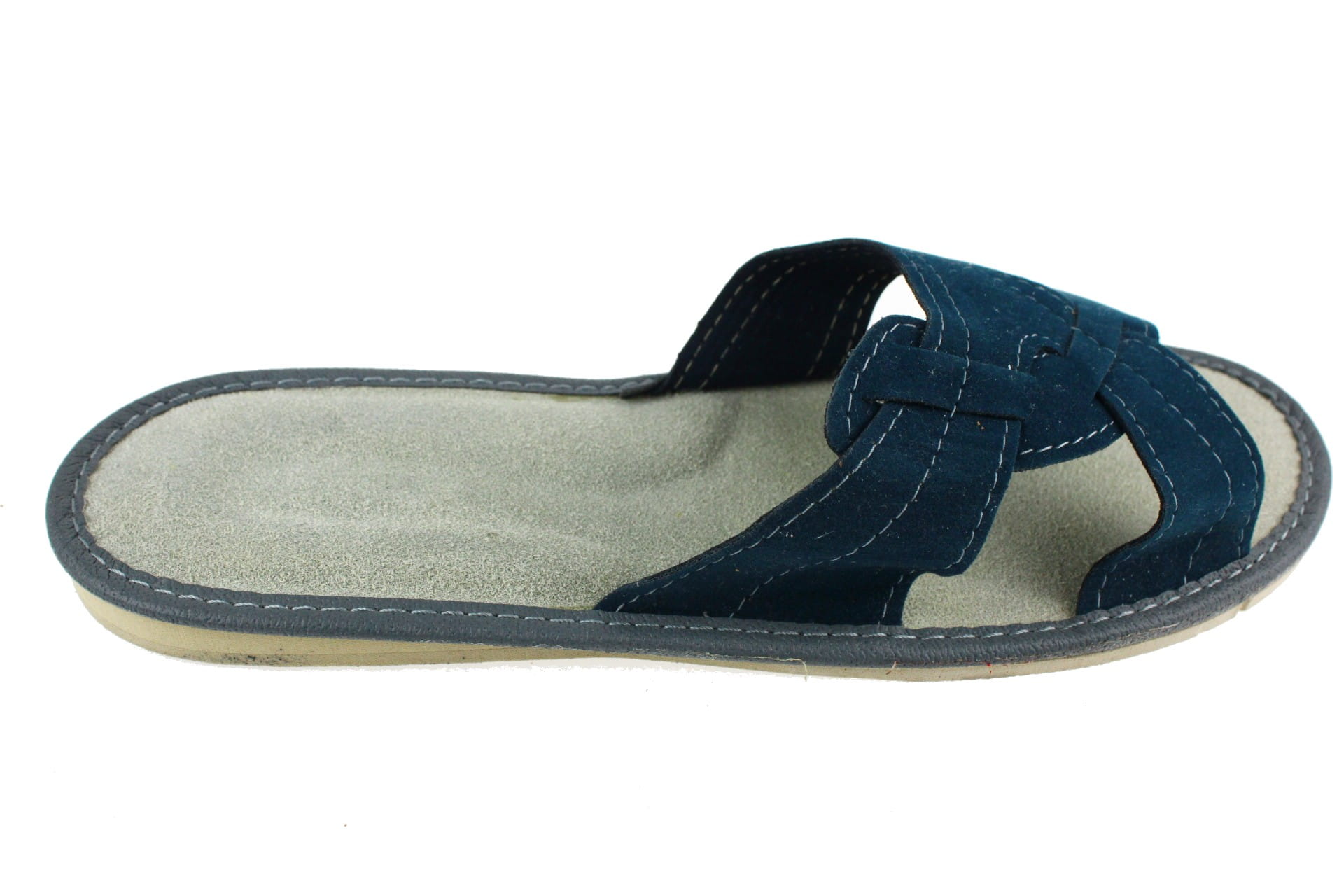 Pantofle damskie z otwartym palcem (b/p=bez palcy), wykonane z naturalnej, zamszowej skóry. Spód gumowy, antypoślizgowy. Klin o wysokości 2 cm. Wkładka skórzana, profilowana, dostosowuje się do kształtu stopy, co daje pewność jej prawidłowego ułożenia i przez to maksymalne poczucie komfortu. Dzięki temu nogi nie męczą się, a stawy nie są narażone na dodatkowe obciążenie. Wierzch posiada otworki, umożliwiające łatwiejszą wentylację. Lekkie i wygodne, przeznaczone do użytku domowego.