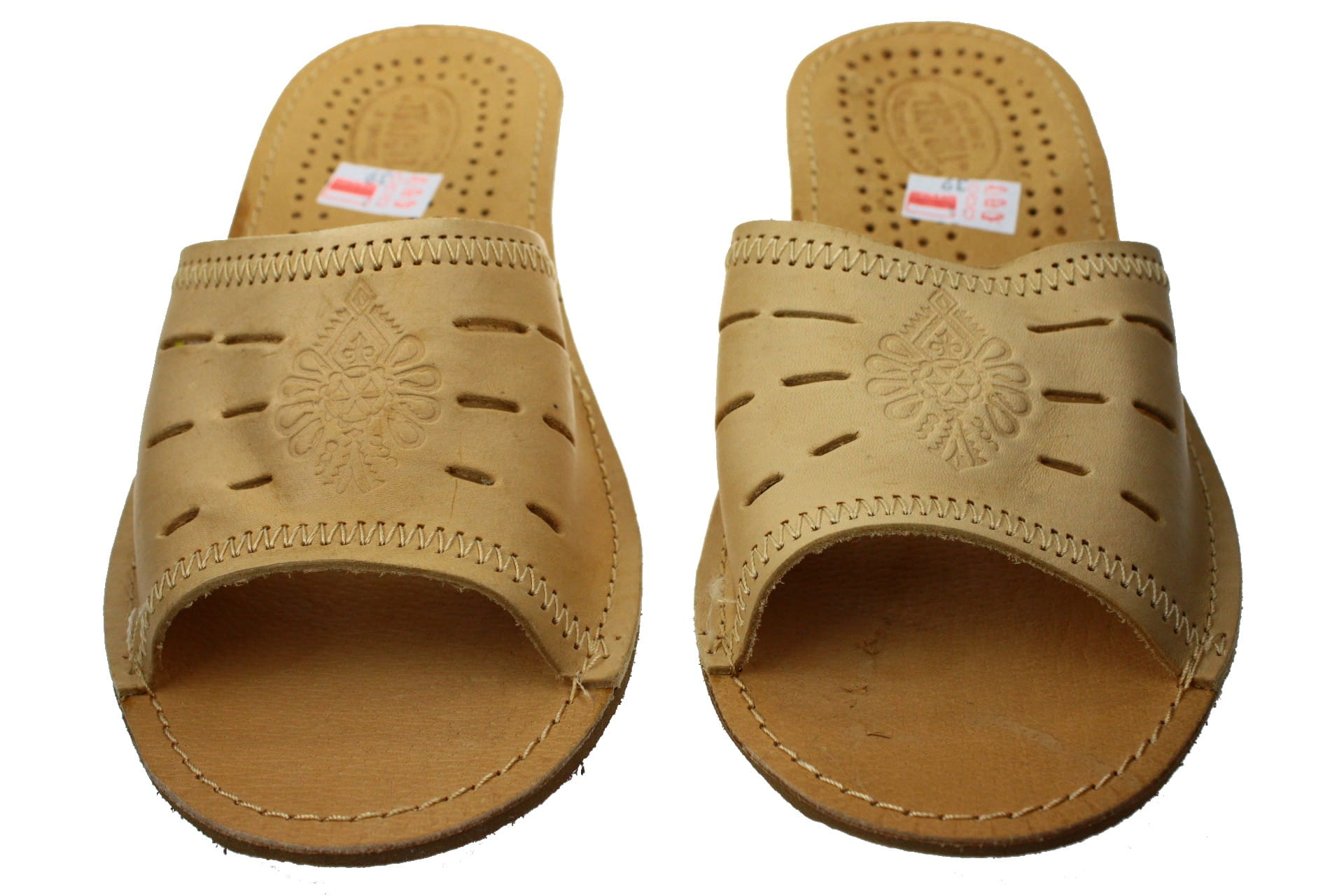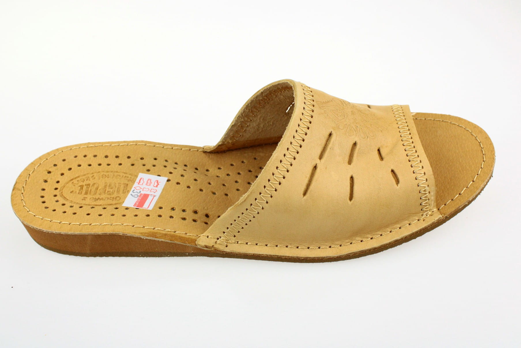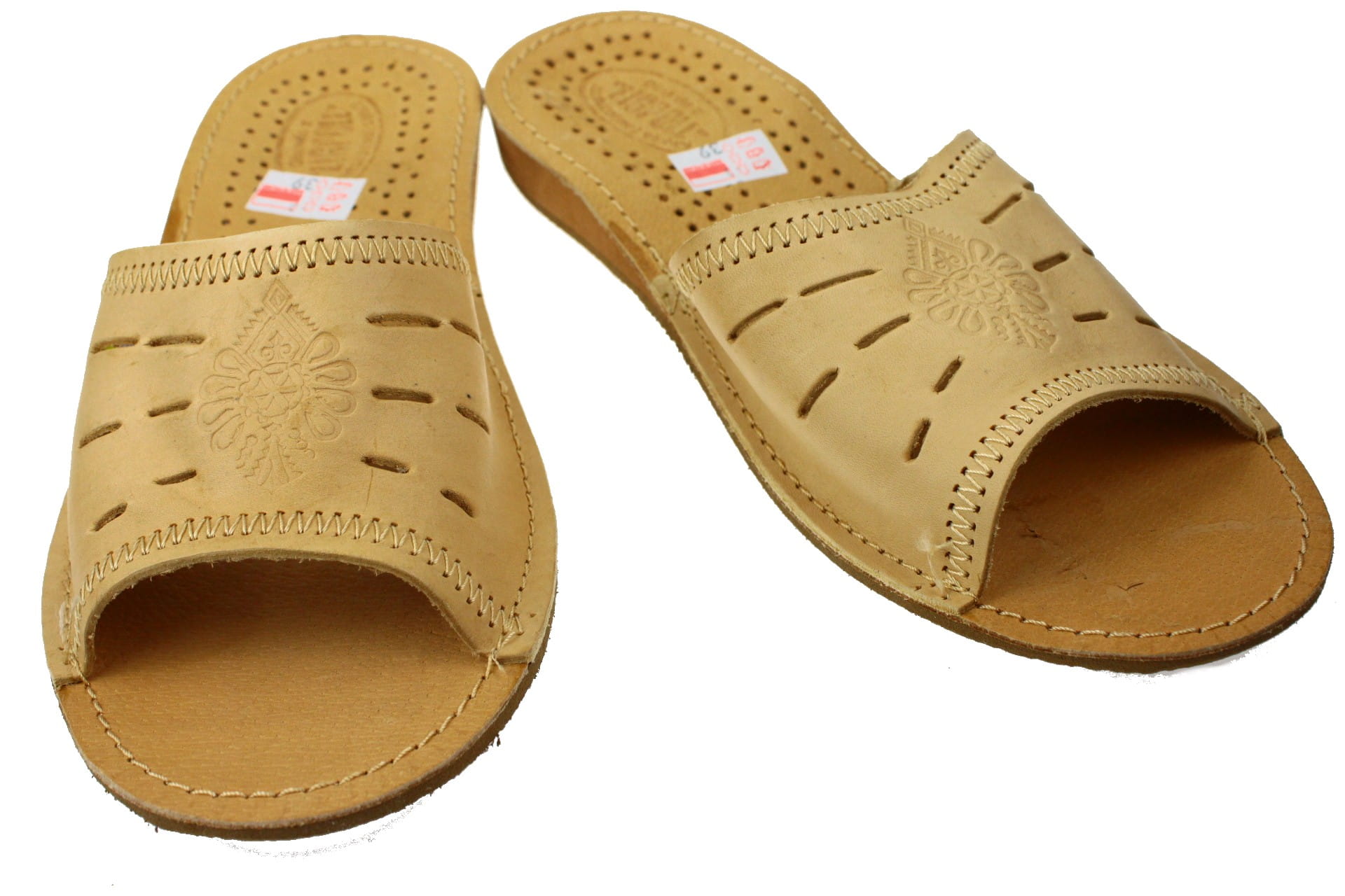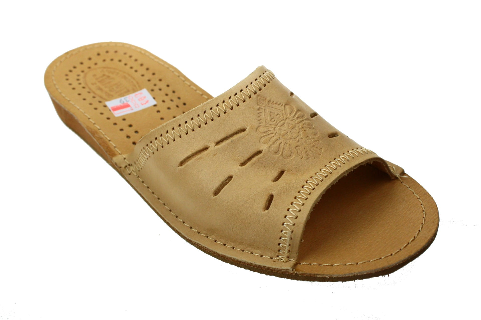 Laczki damskie z otwartym palcem (b/p=bez palcy), wykonane z najważszej jakości bydlęcej skóry. Wkładka skórzana, profilowana, Spód ze styrogumu (guma utwardzana), antypoślizgowy. Klin 2,50 cm