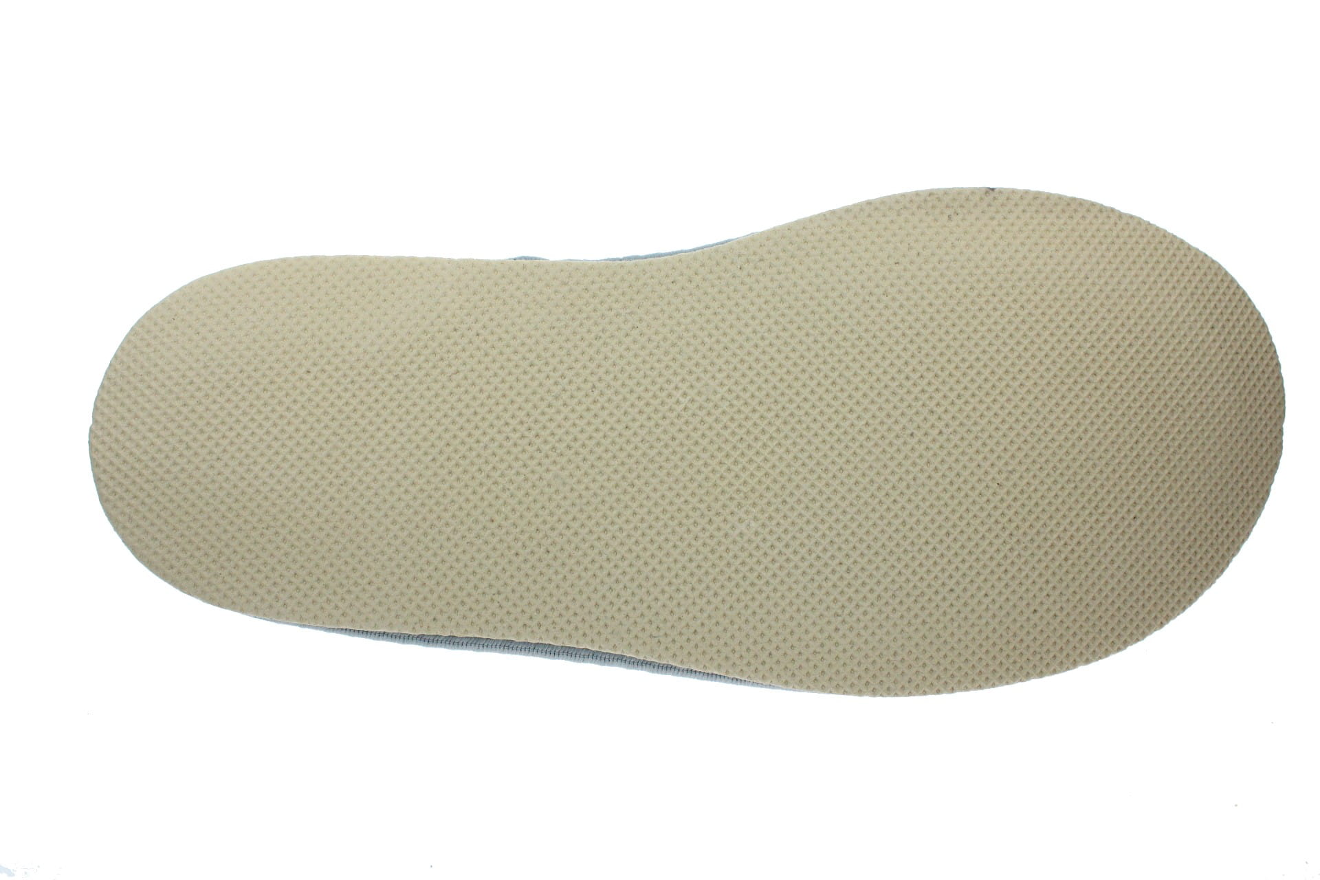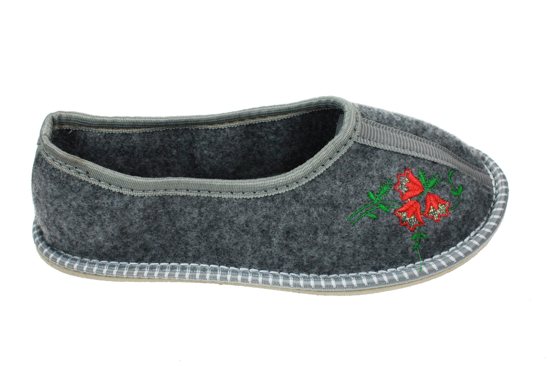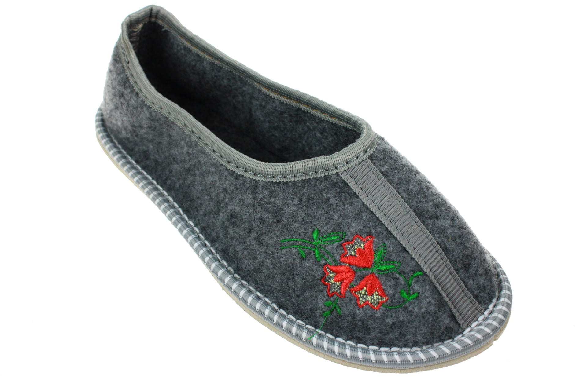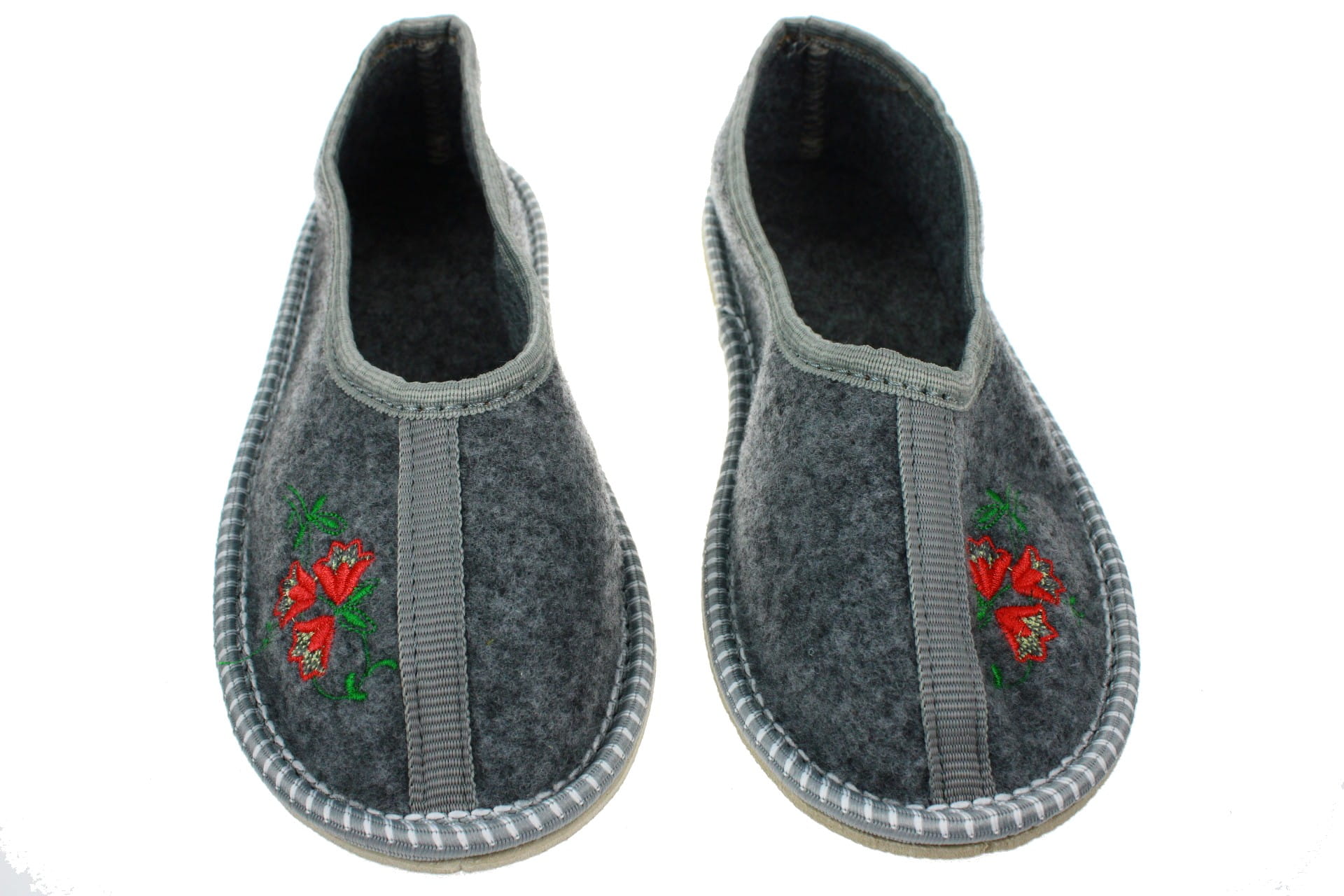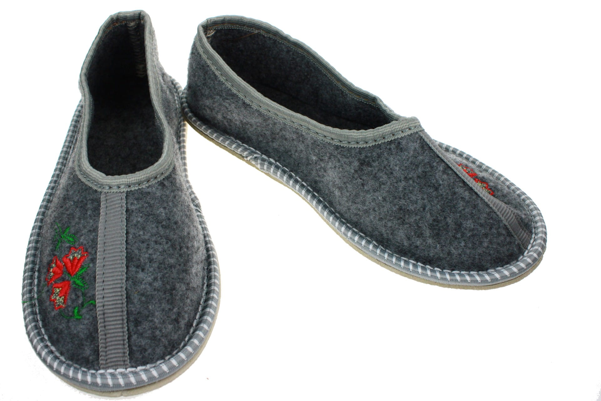 Bambosze wykonane są z filcu, z ozdobnym kwiatkiem. Filc jest to spilśniona wełna,więc spełnia wszystkie funkcje wełny.Bambosze są ciepłe, lekkie i wygodne.Utrzymują stałą temperaturę ciała. Podeszwa jest gumowa, antypoślizgowa.Przeznaczone są do użytku domowego na szerszą stopę.