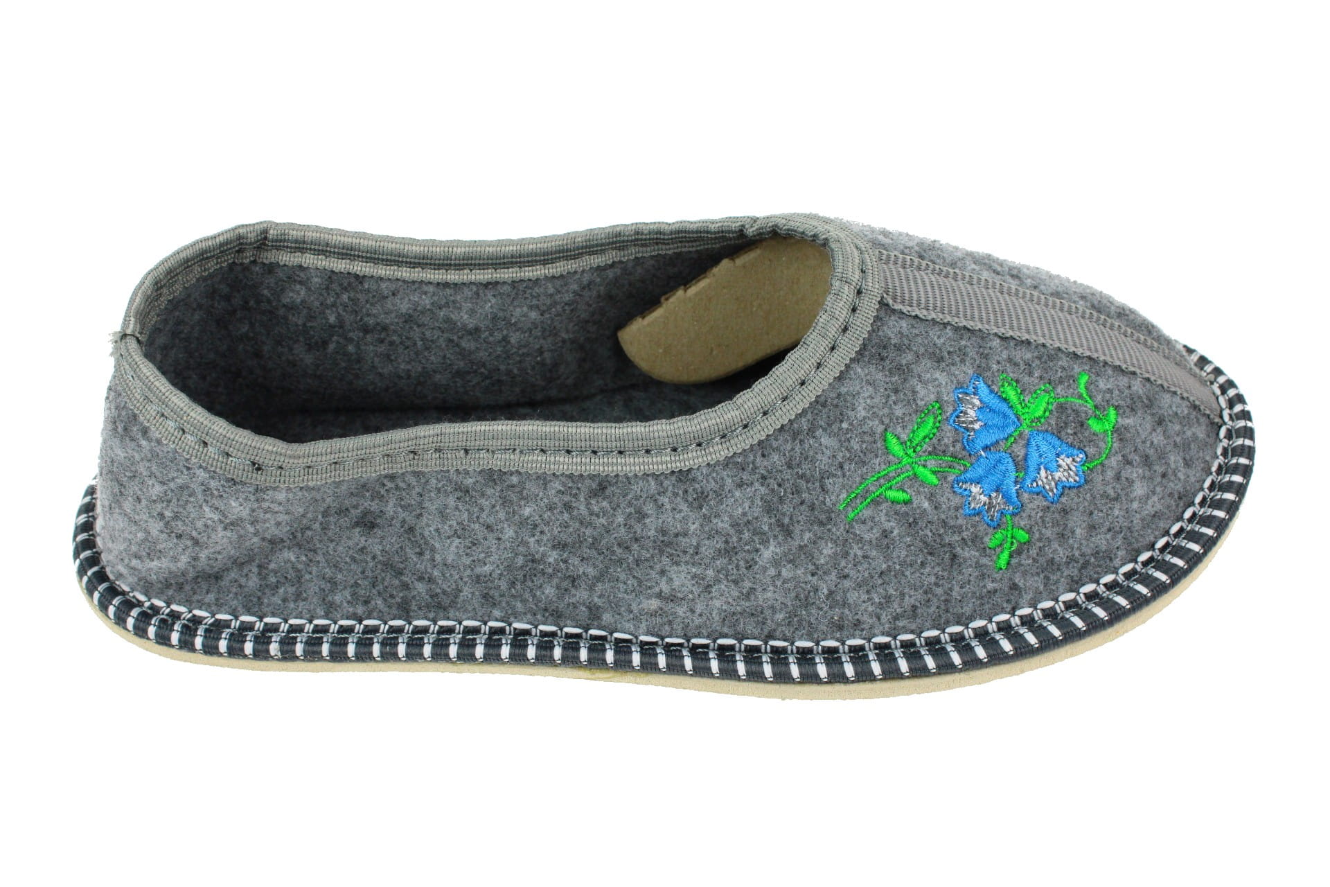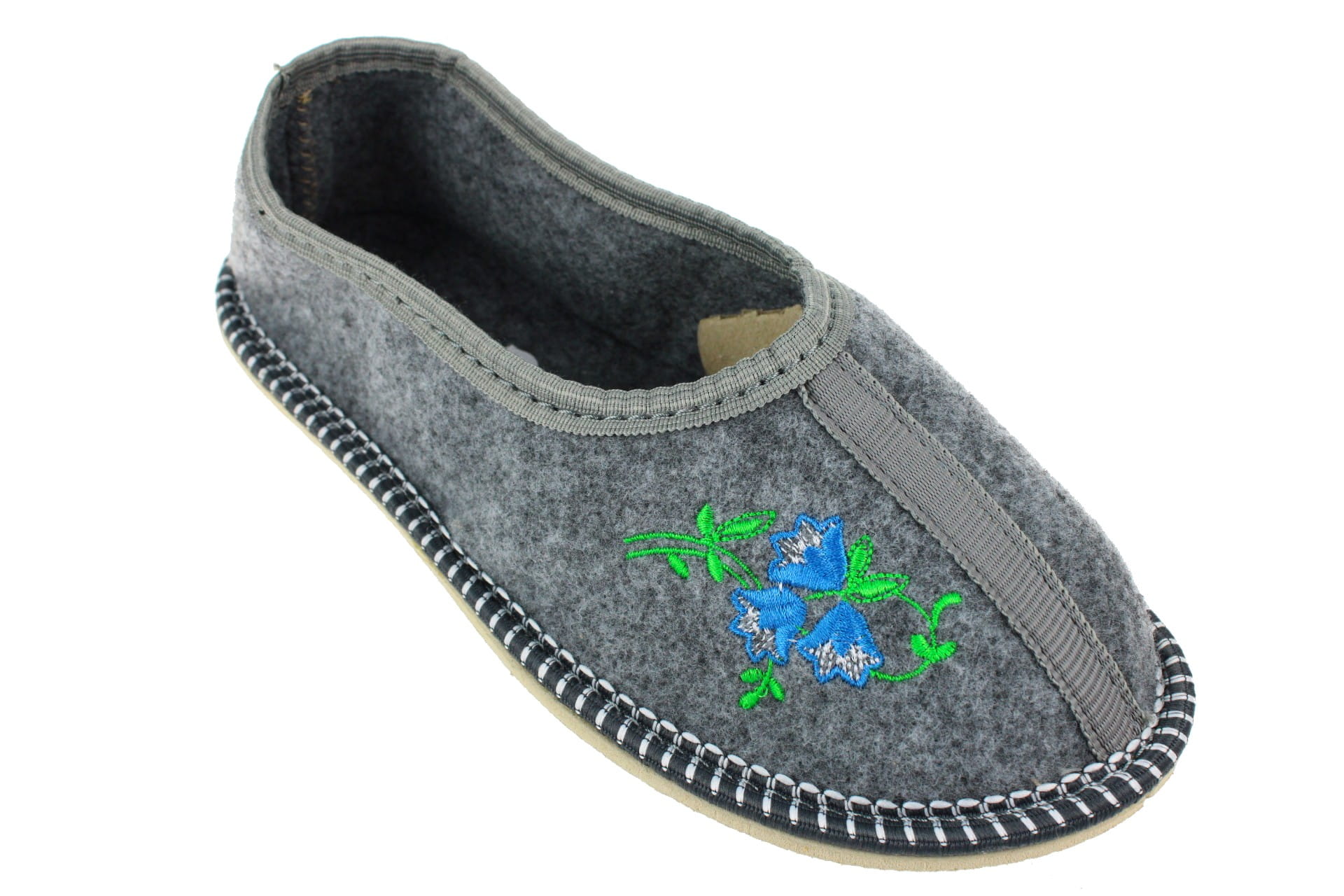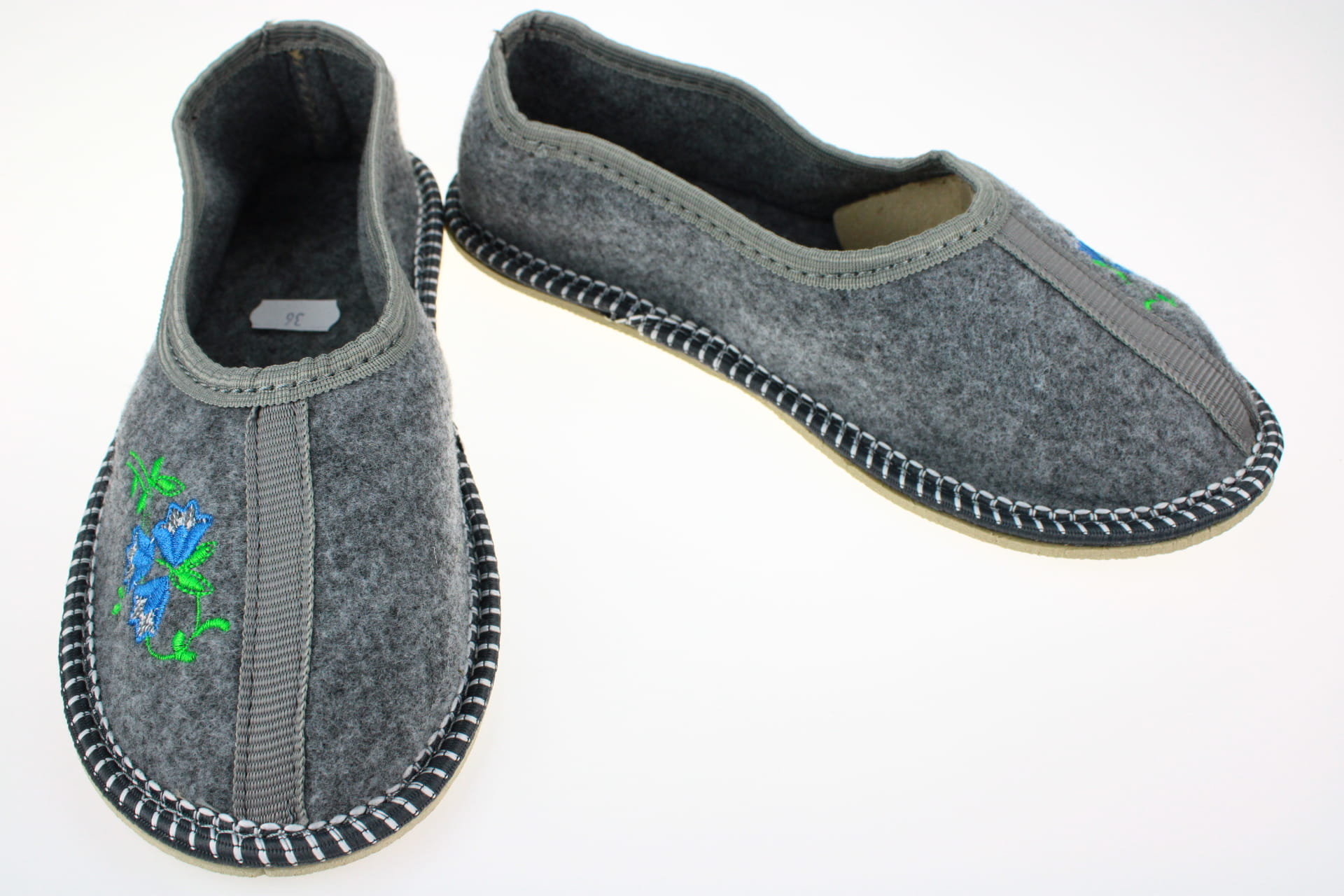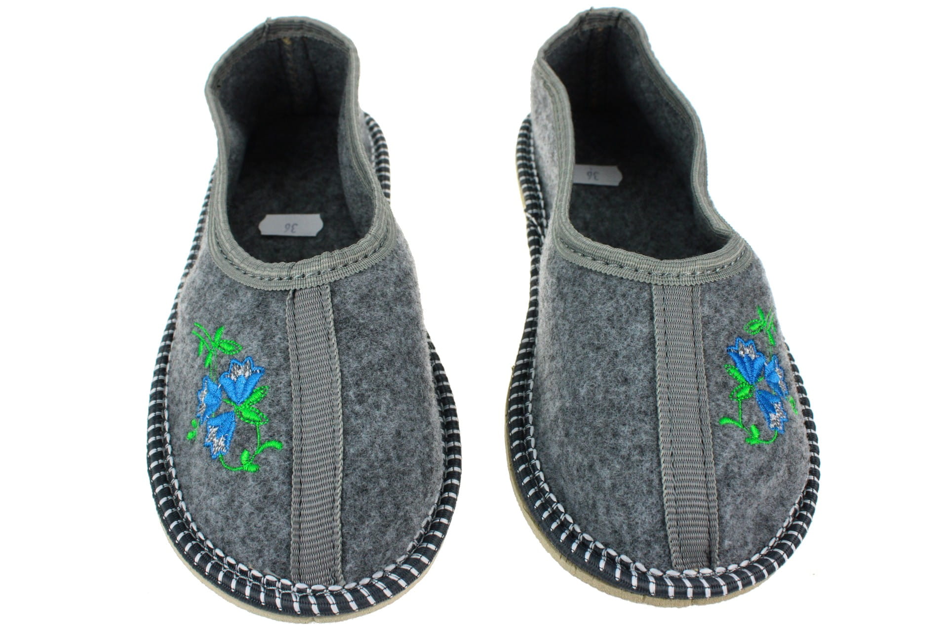 Bambosze  wykonane są z filcu, z ozdobnym kwiatkiem. Filc jest to spilśniona wełna,więc spełnia wszystkie funkcje wełny.Bambosze są ciepłe, lekkie i wygodne.Utrzymują stałą temperaturę ciała. Podeszwa jest gumowa, antypoślizgowa.Przeznaczone są do użytku domowego na szerszą stopę.