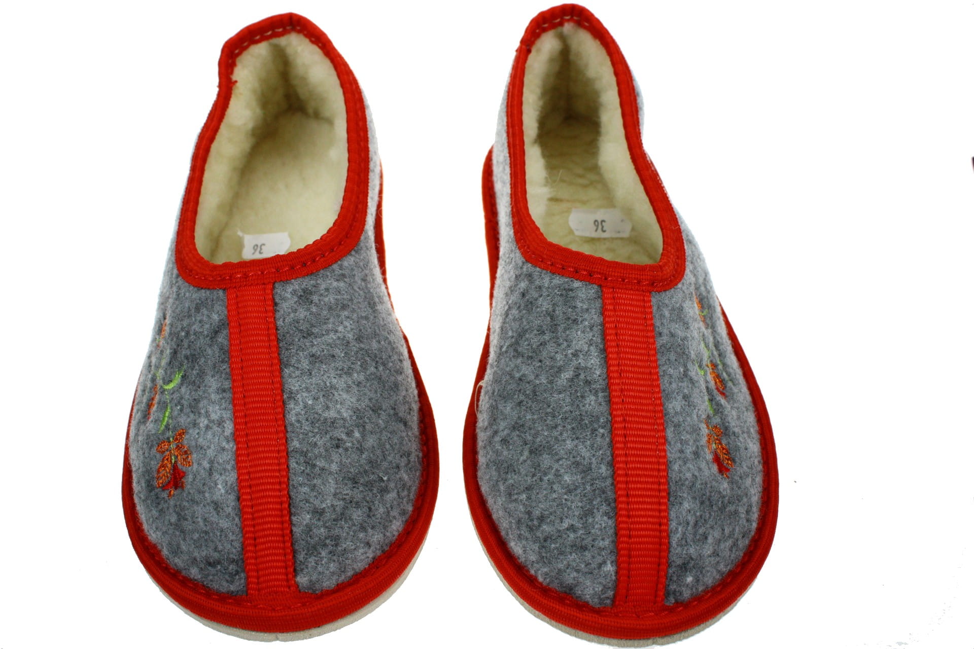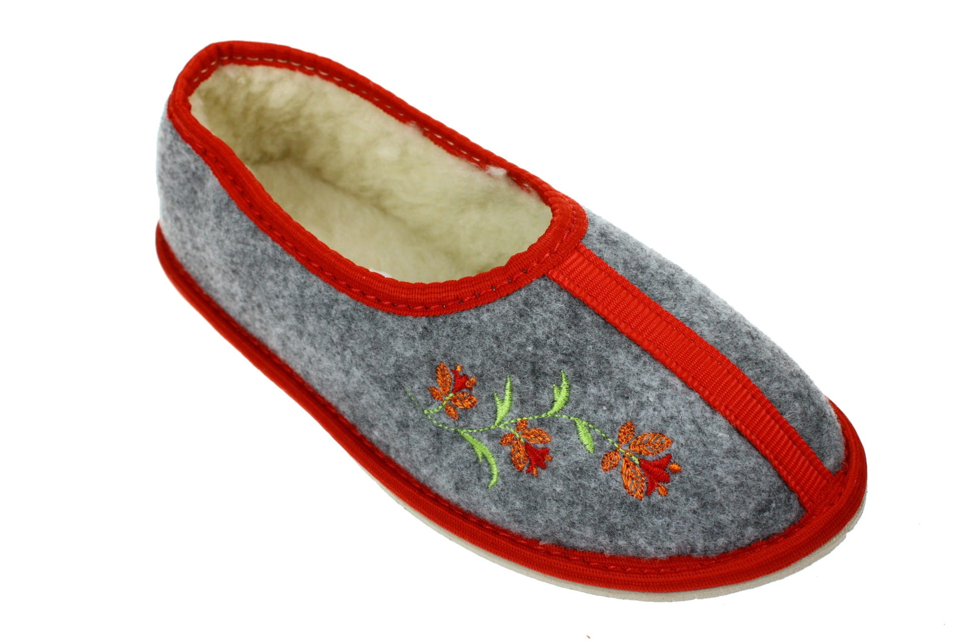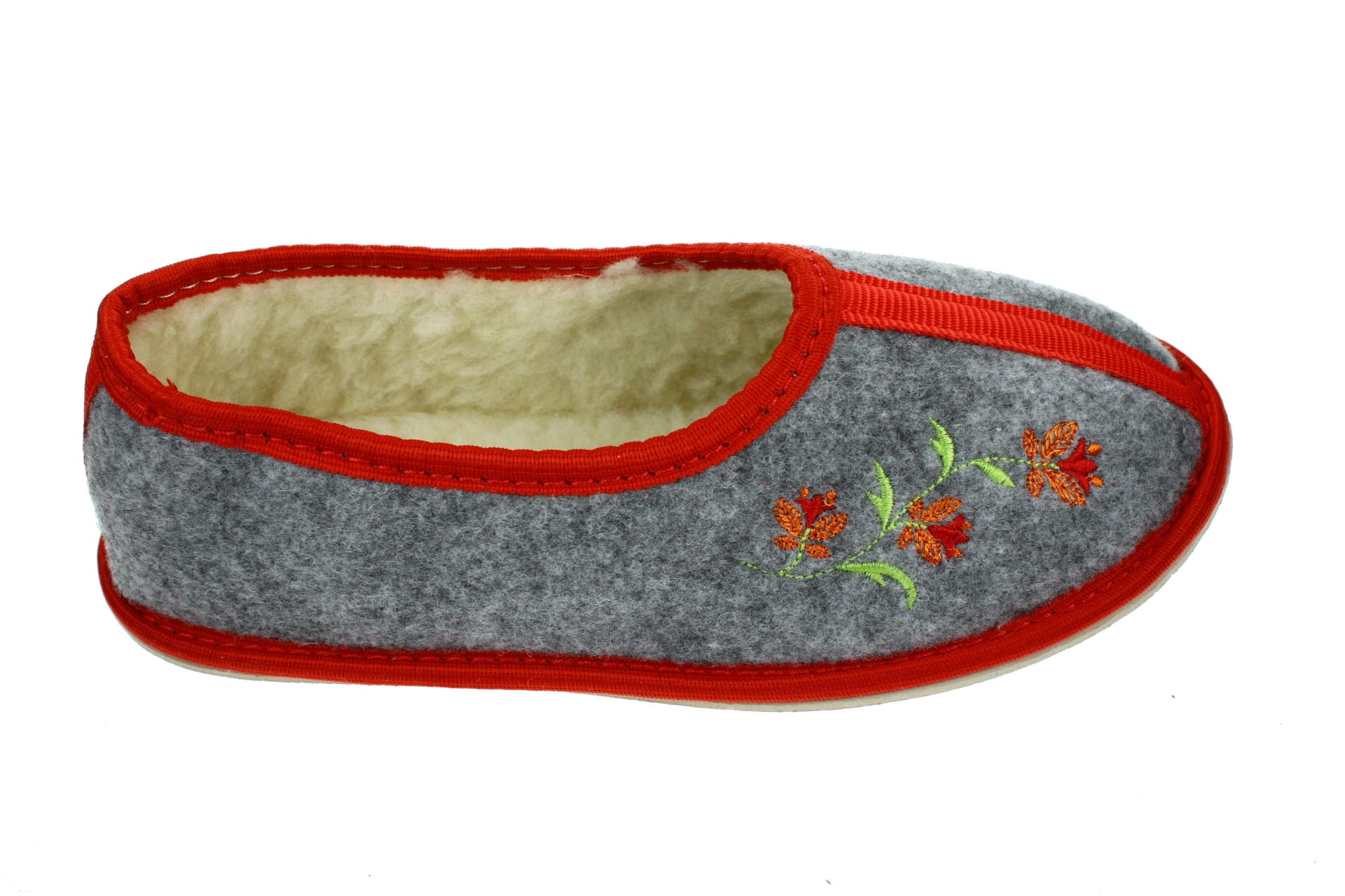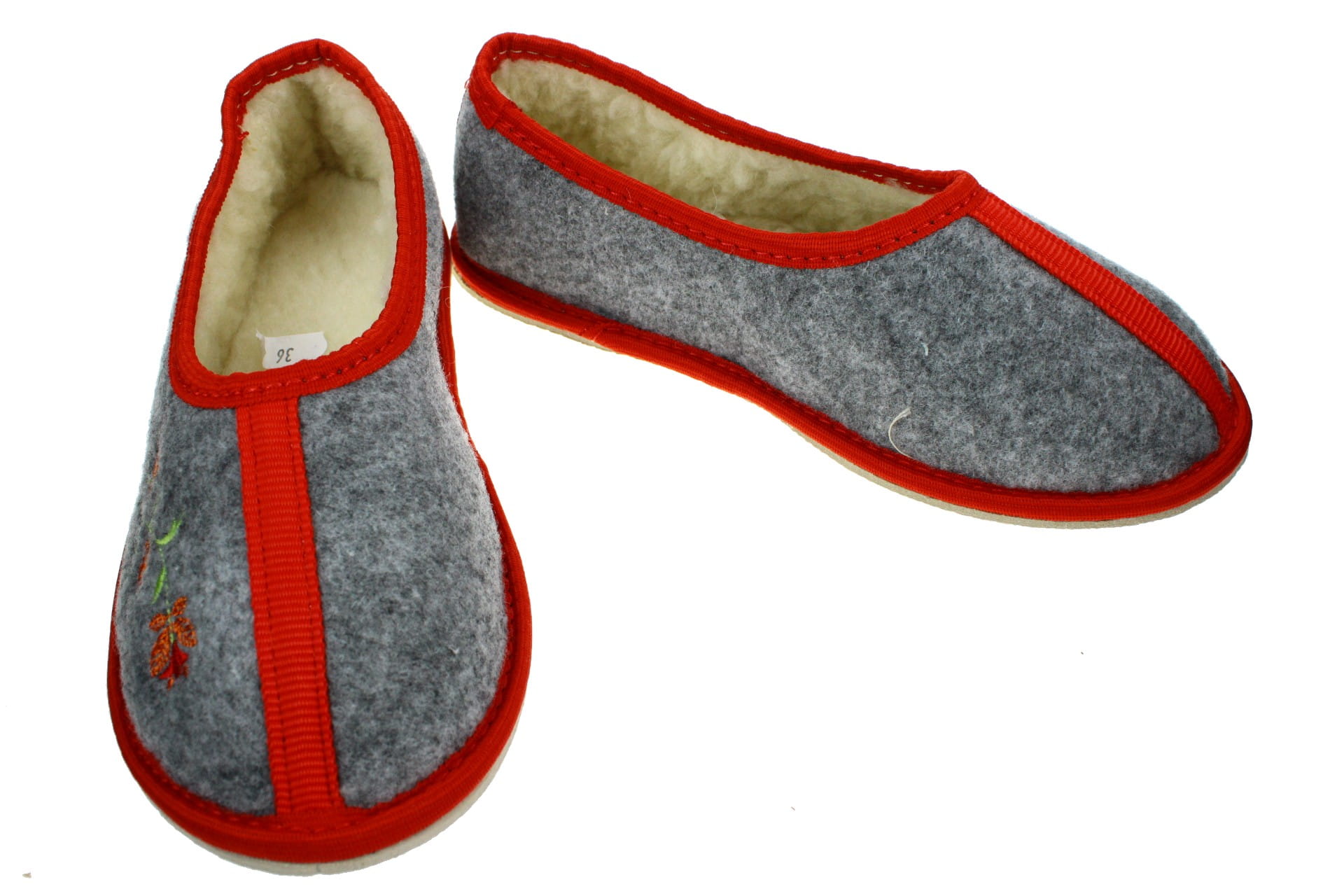 Pantofle wykonane z tkaniny filcowej, z ozdobnym kwiatkiem. Cholewka od wewnątrz i wkładka wyściełane naturalną, owczą wełną, która pozwala utrzymać stałą temperaturę ciała nie powodując przy tym zwiększenia potliwości skóry. Laczki są bardzo lekkie, ciepłe i wygodne. Przeznaczone do użytku domowego.