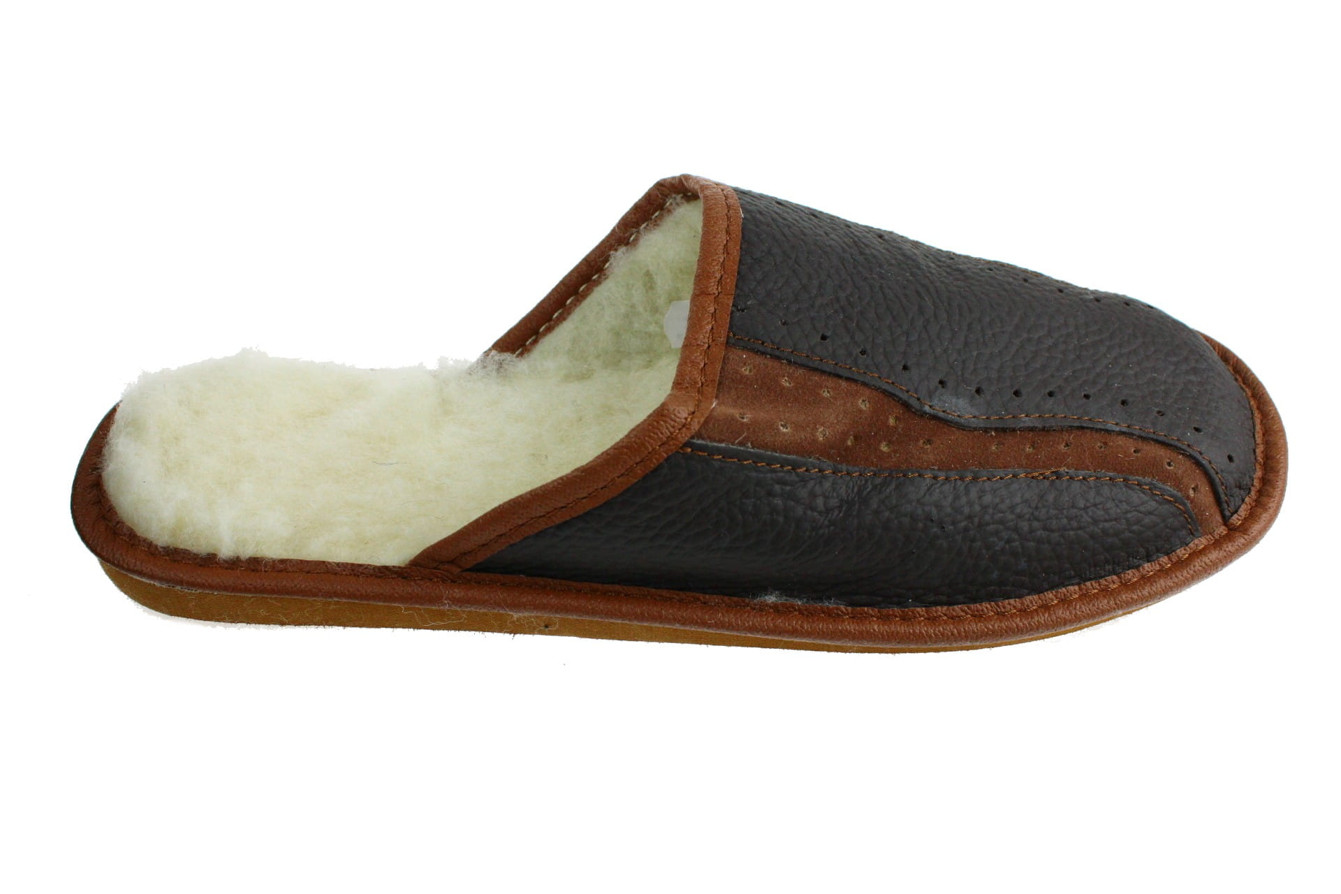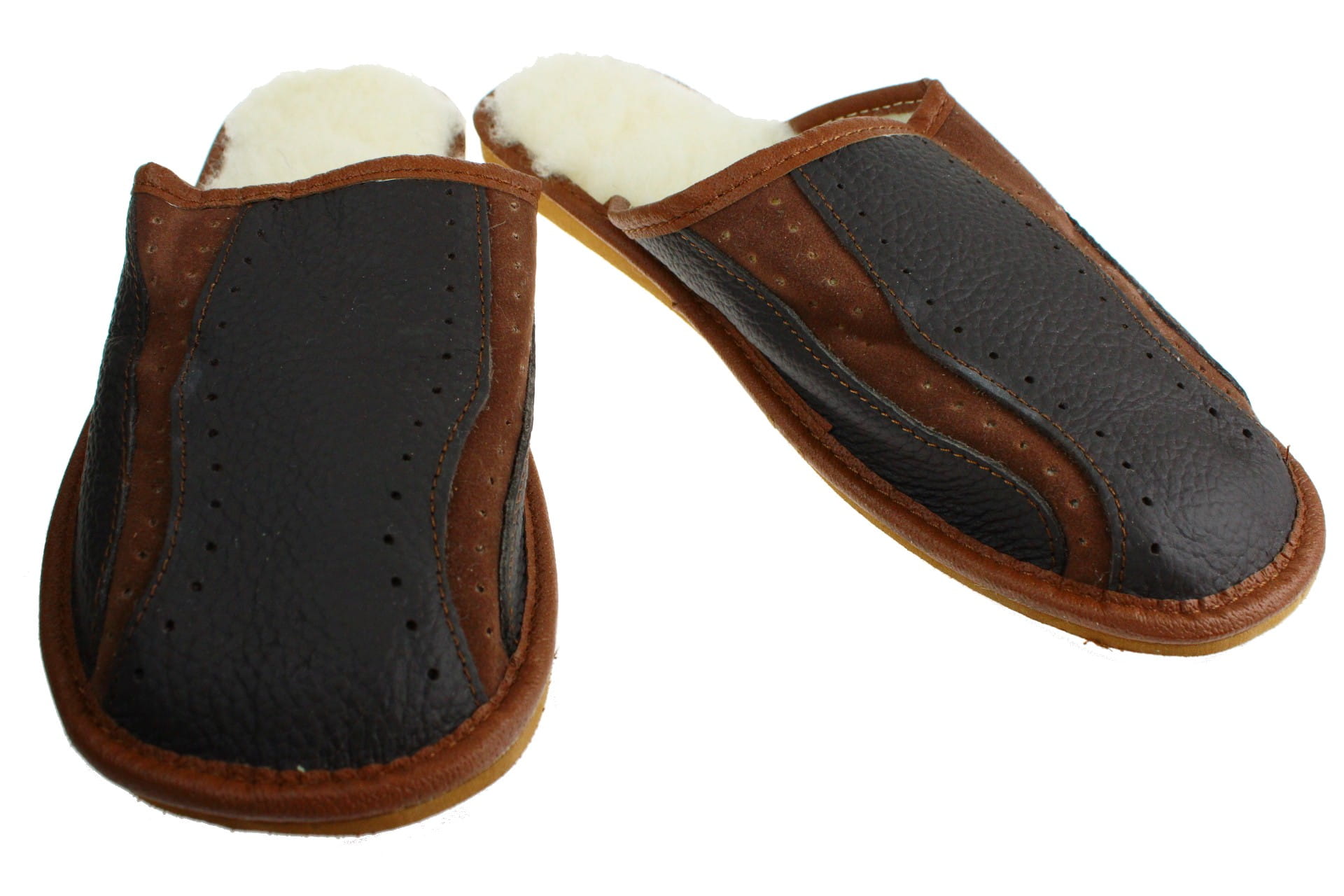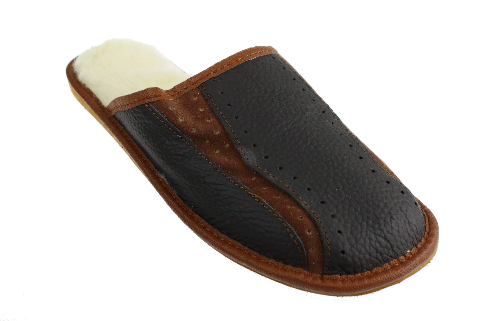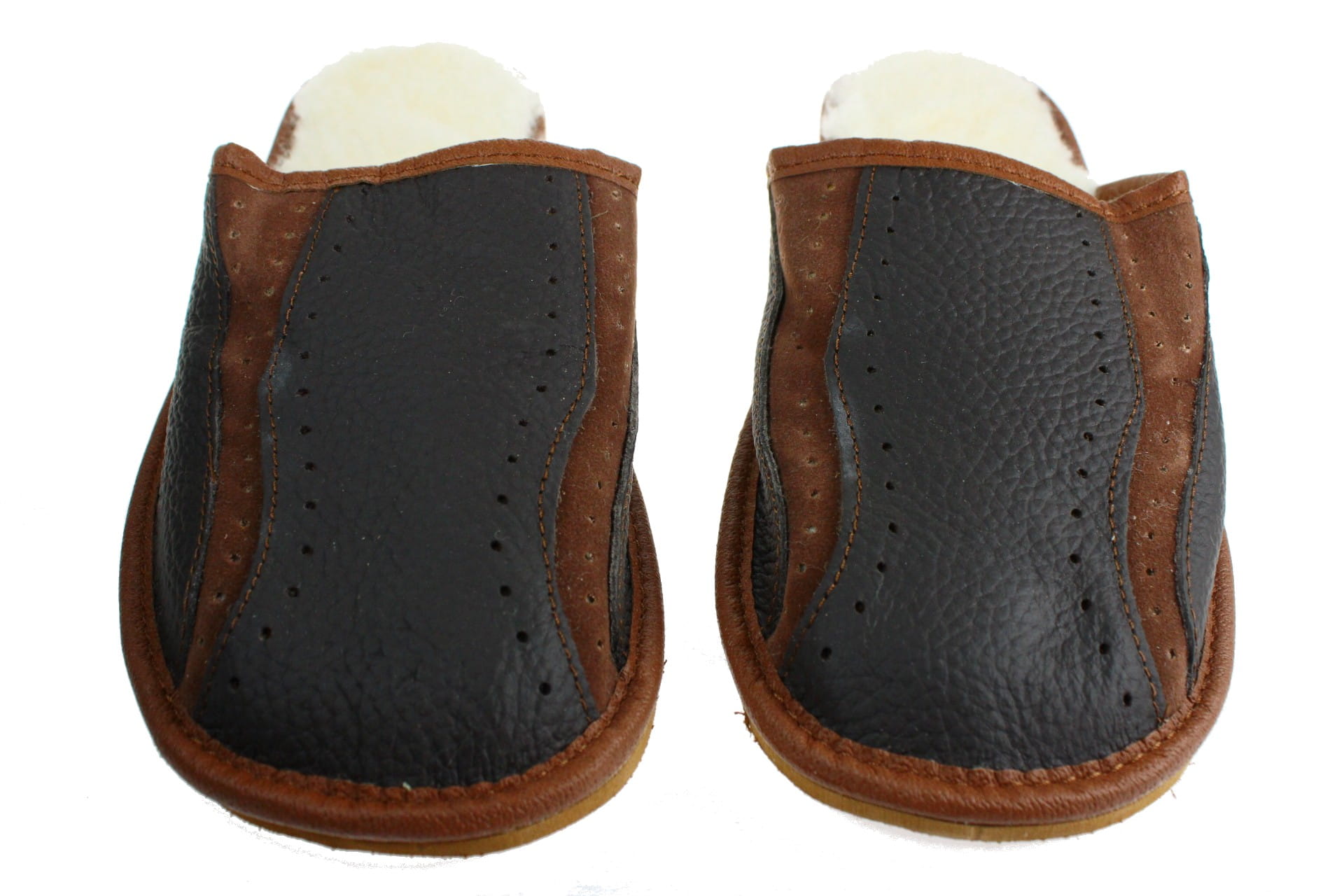 Pantofle męskie ocieplane, wykonane ze skóry licowej, w kolorze brązowym. Cholewka posiada liczne otworki umożliwiające lepszą cyrkulację powietrza. Wnętrze wyściełane jest ciepłą i miłą w dotyku dzianiną z domieszka naturalnej, owczej wełny o ciemnym zabarwieniu. Papcie przyjemnie ogrzewają stopy. Podeszwa gumowa, antypoślizgowa. Pantofle przeznaczone do użytku domowego, są lekkie i wygodne.