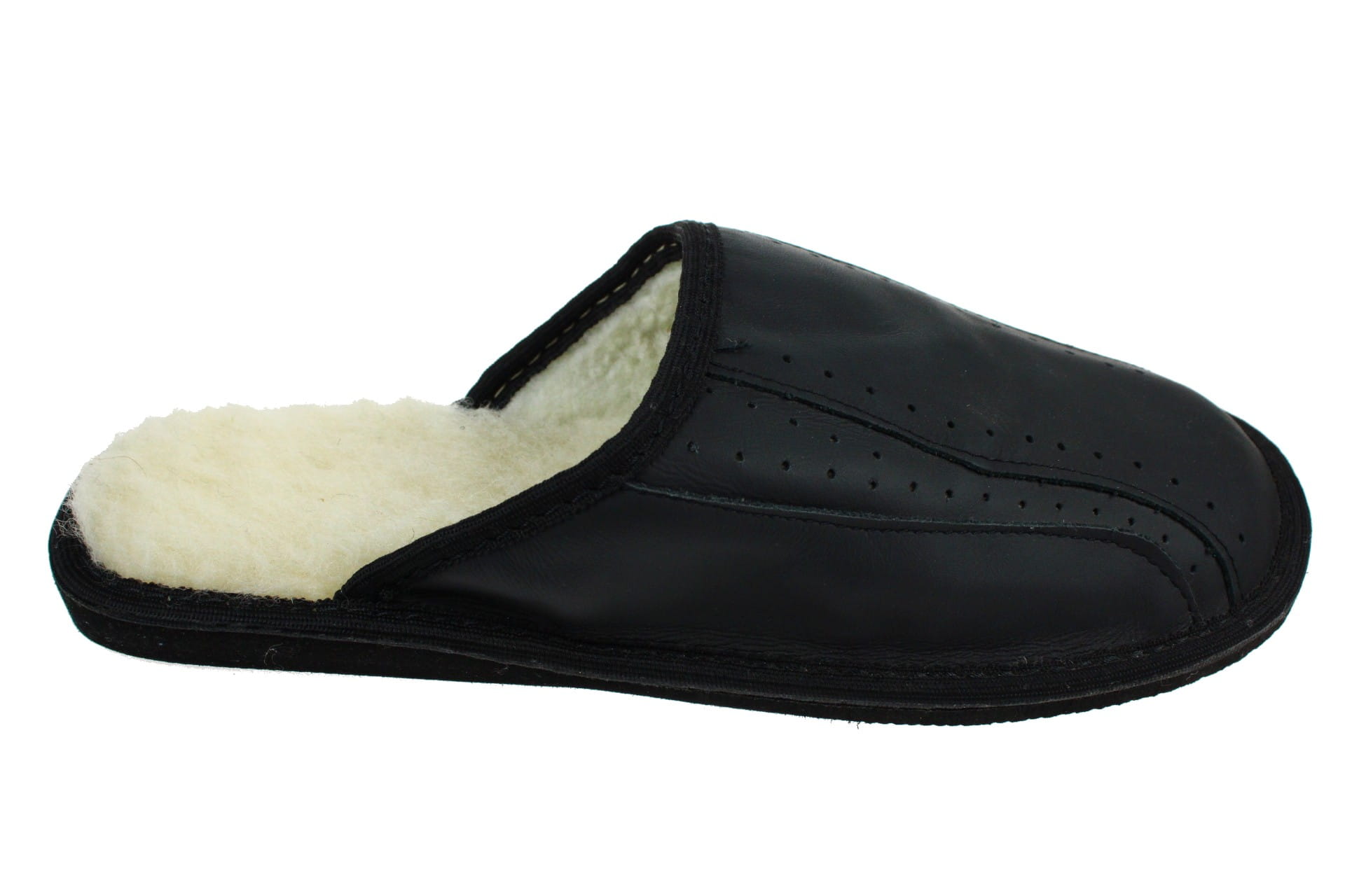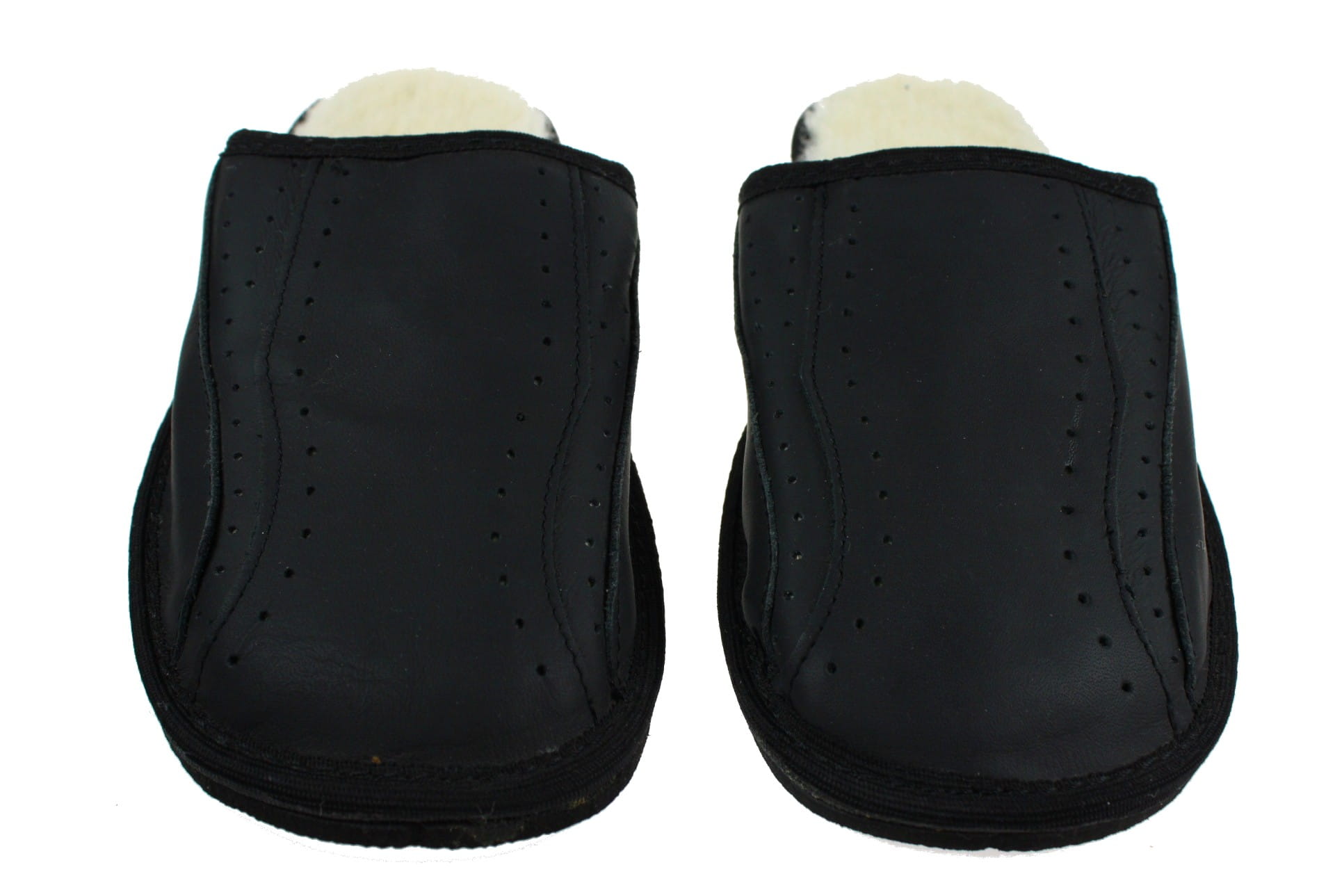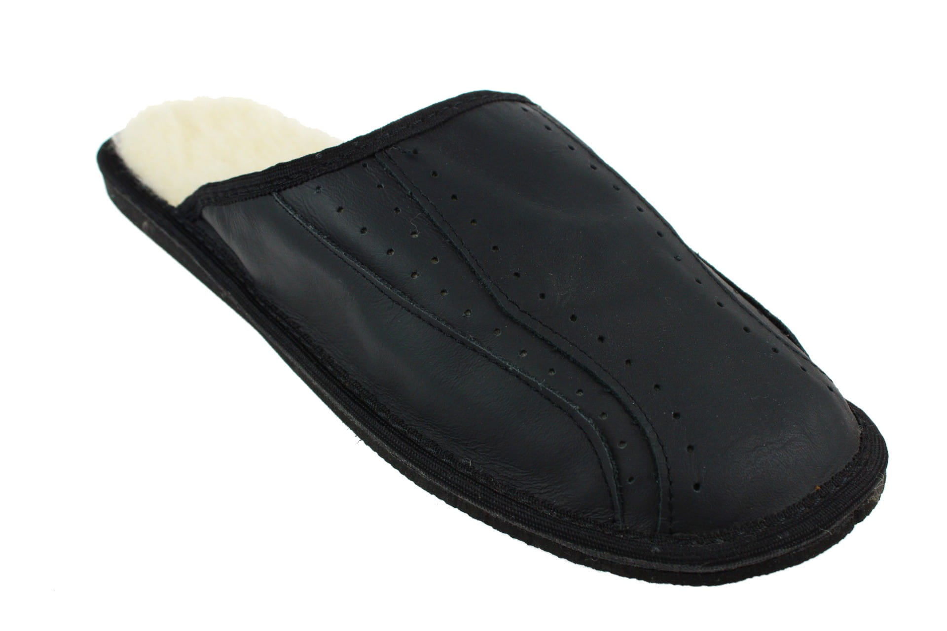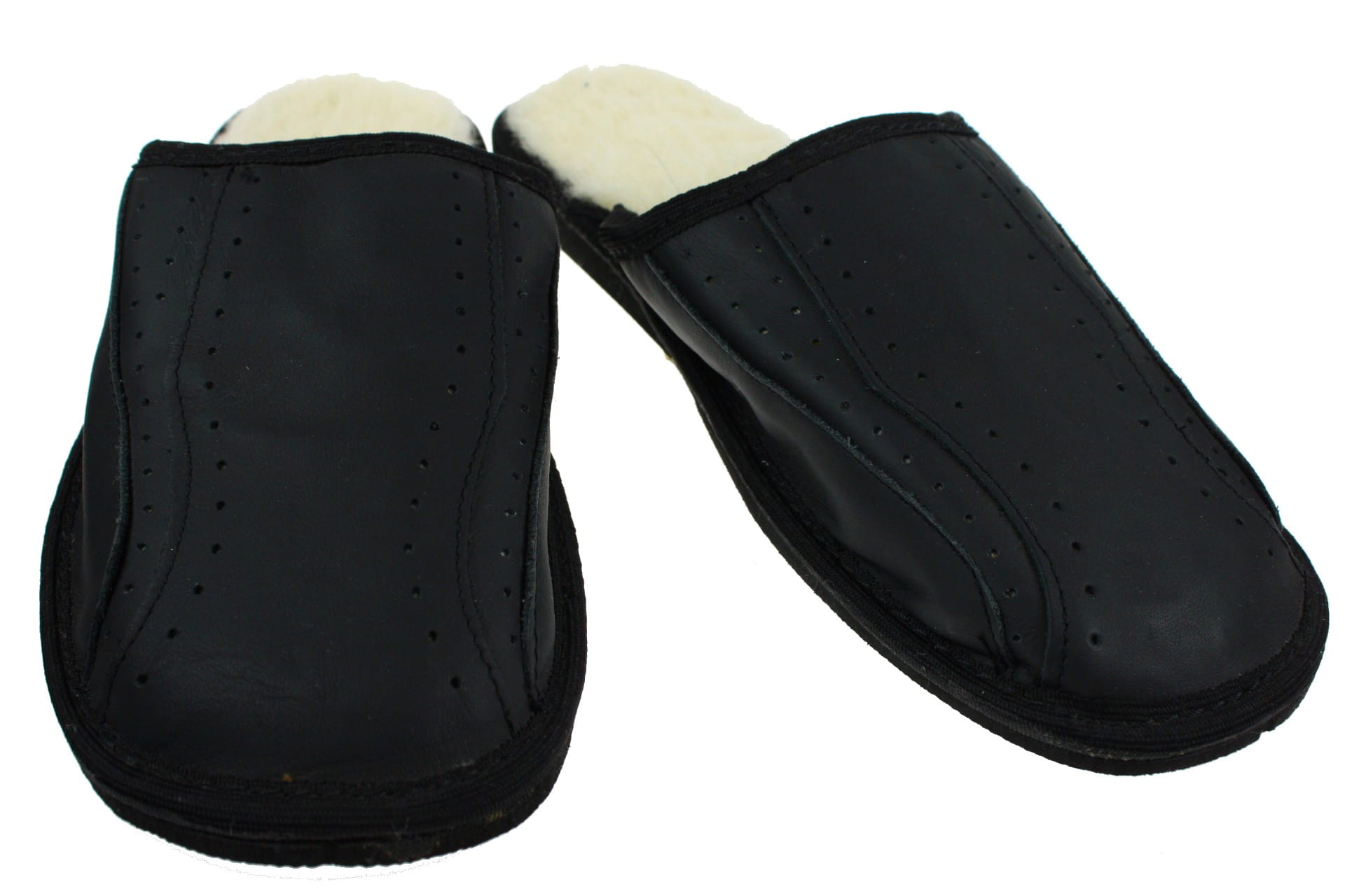 Pantofle męskie ocieplane, wykonane ze skóry licowej, w kolorze brązowym. Cholewka posiada liczne otworki umożliwiające lepszą cyrkulację powietrza. Wnętrze wyściełane jest ciepłą i miłą w dotyku dzianiną z domieszka naturalnej, owczej wełny o ciemnym zabarwieniu. Papcie przyjemnie ogrzewają stopy. Podeszwa gumowa, antypoślizgowa. Pantofle przeznaczone do użytku domowego, są lekkie i wygodne.